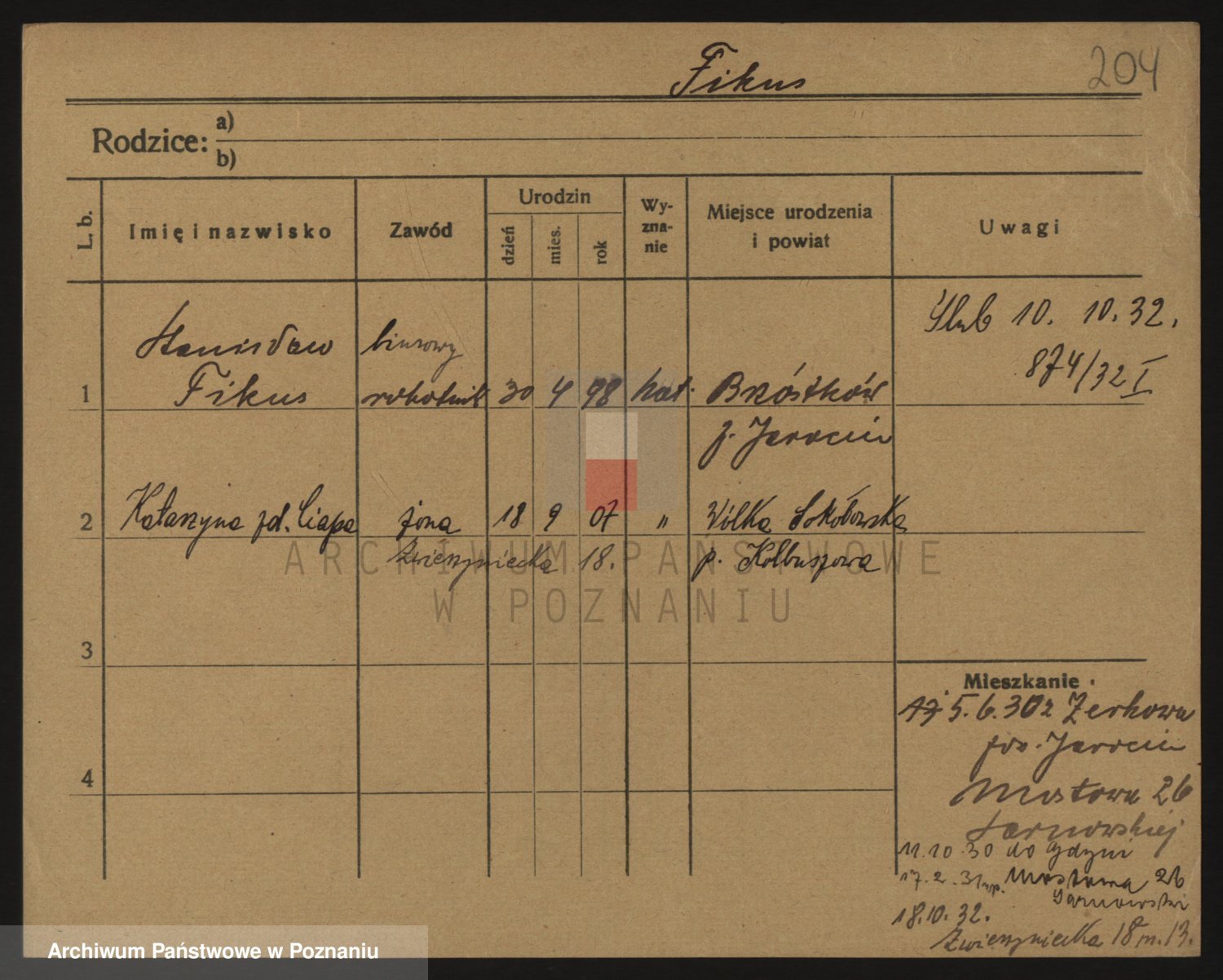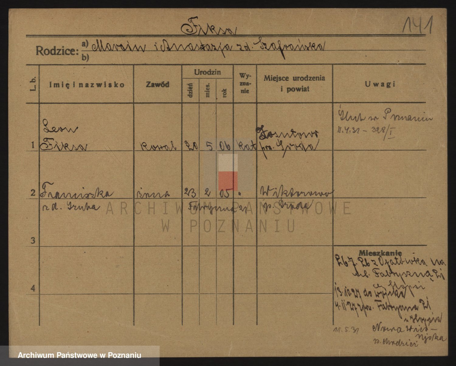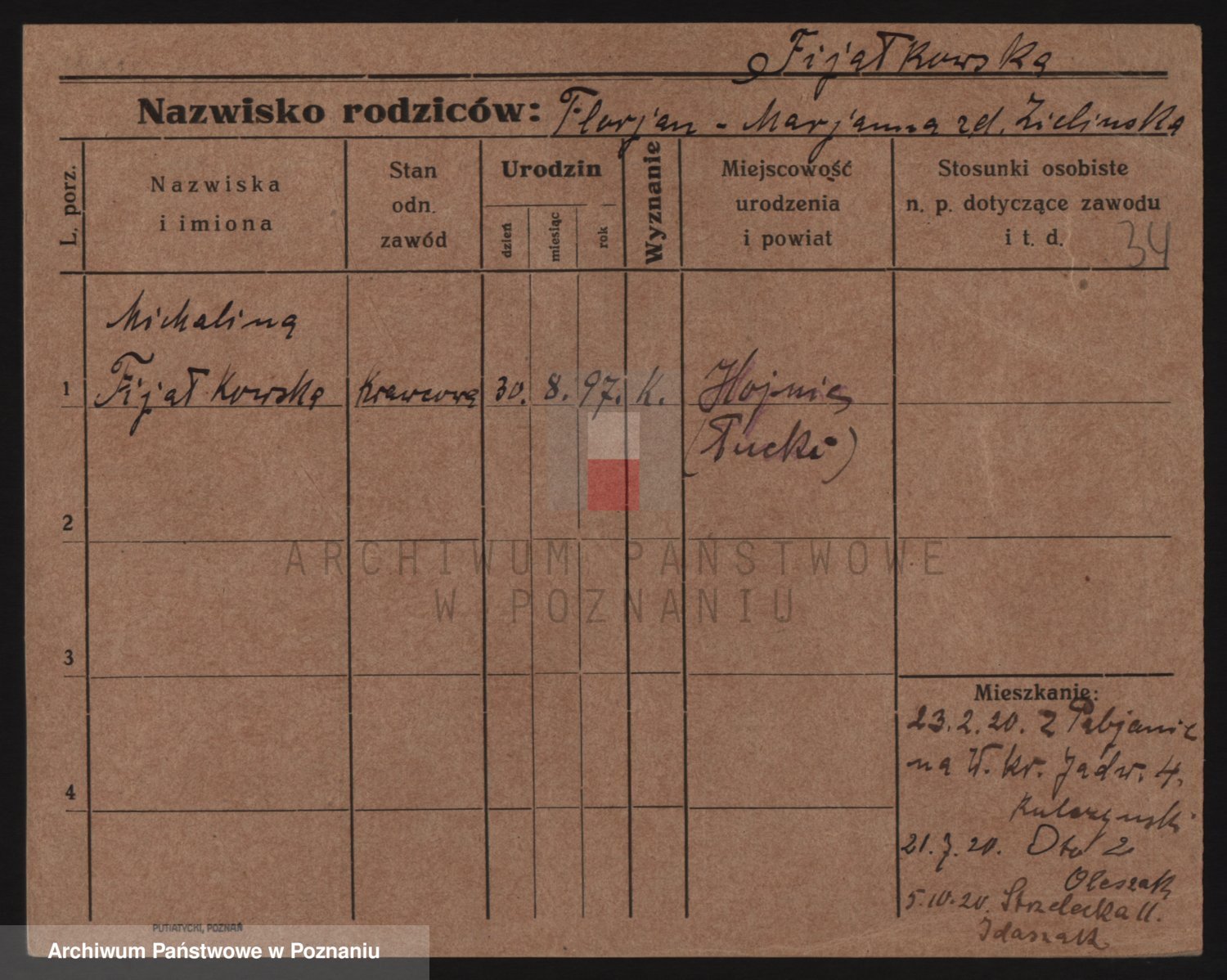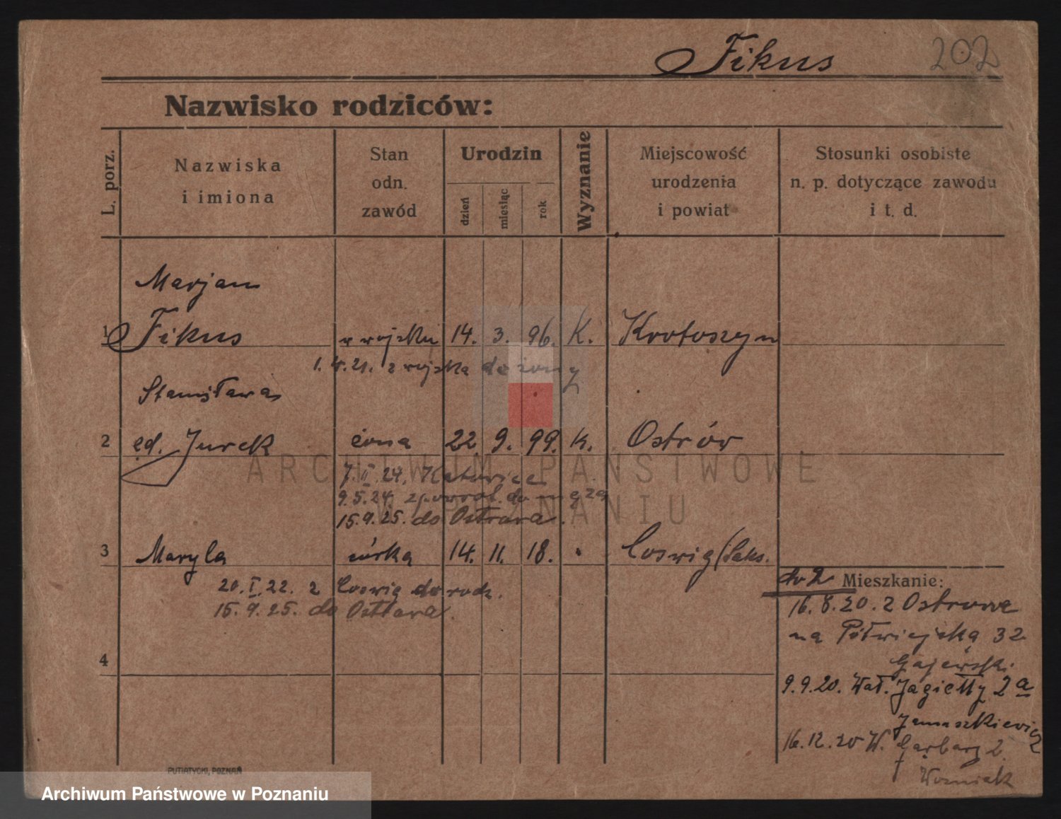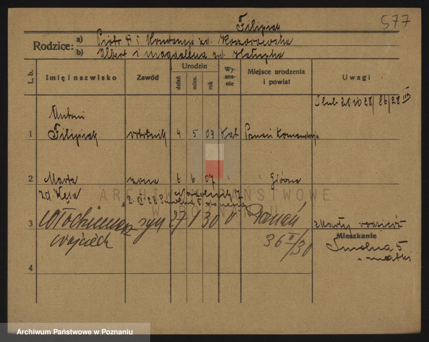 Podgląd karty osobowej dostępny jest po kliknięciu na nazwisko lub ikonkę karty. Można dokonywać powiększenia (ikony na górze) lub przechodzić między kolejnymi skanami (strzałki po bokach).