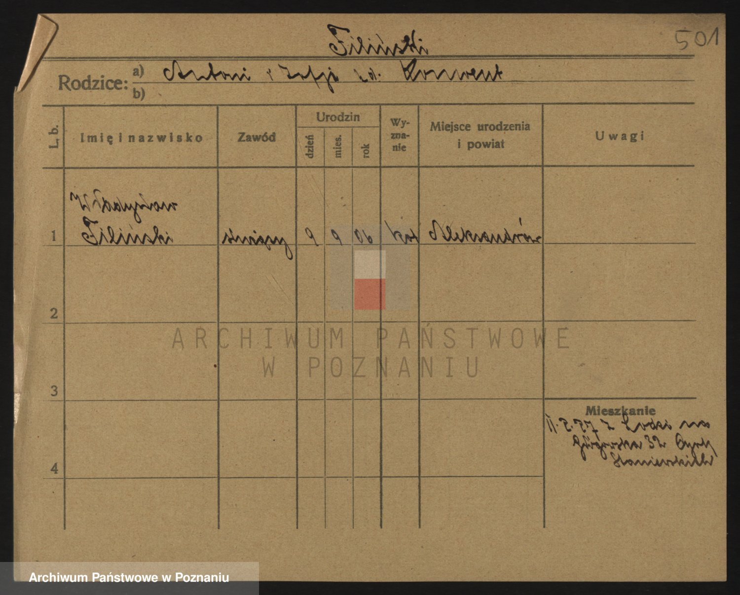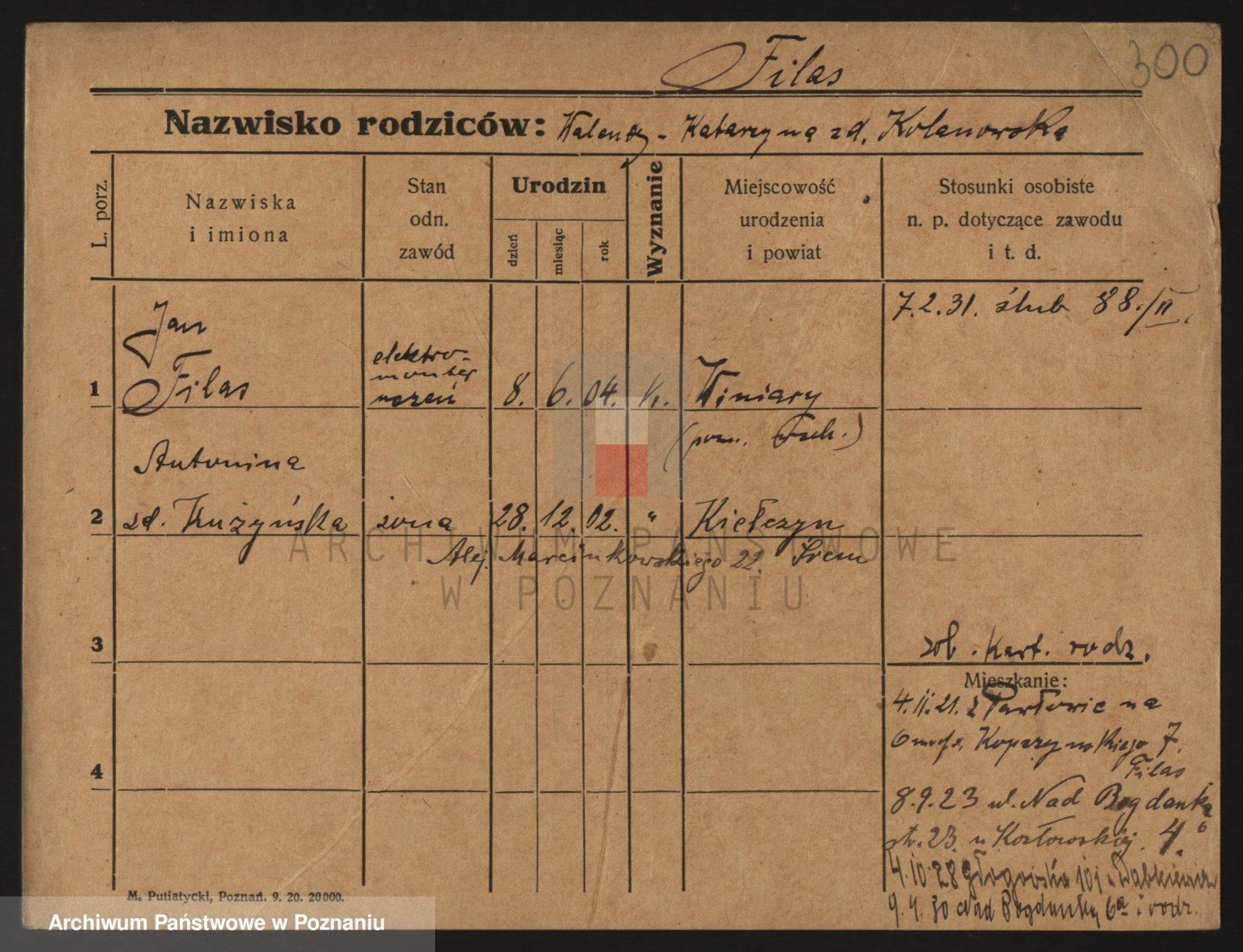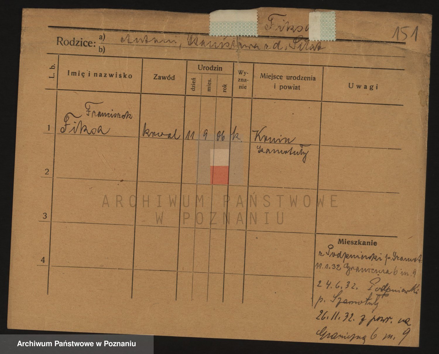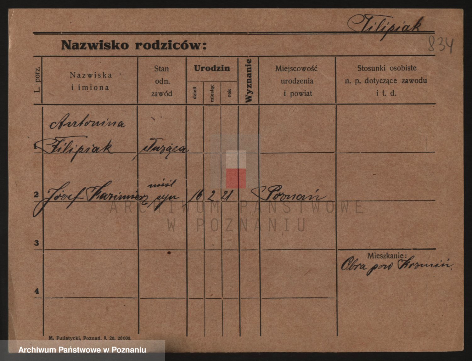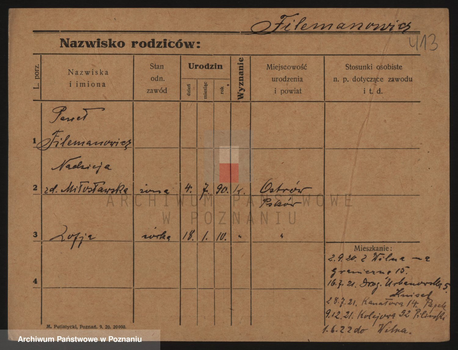 Podgląd karty osobowej dostępny jest po kliknięciu na nazwisko lub ikonkę karty. Można dokonywać powiększenia (ikony na górze) lub przechodzić między kolejnymi skanami (strzałki po bokach).