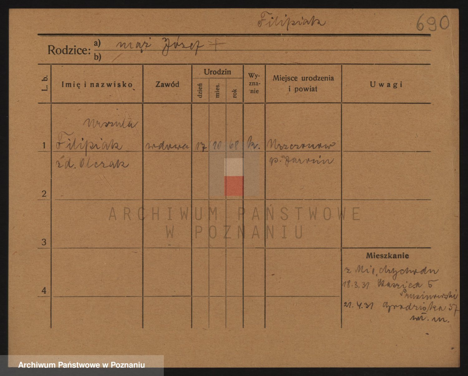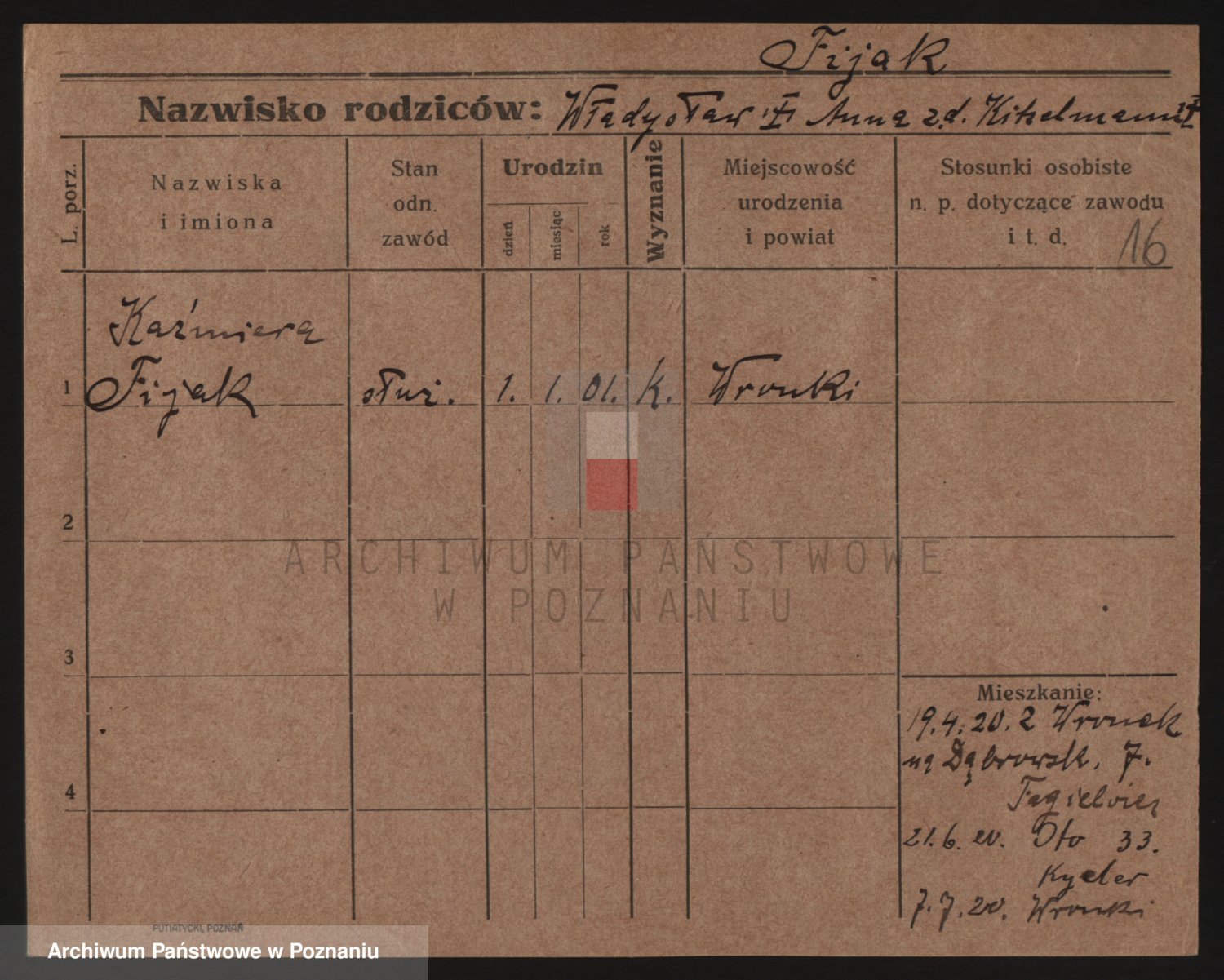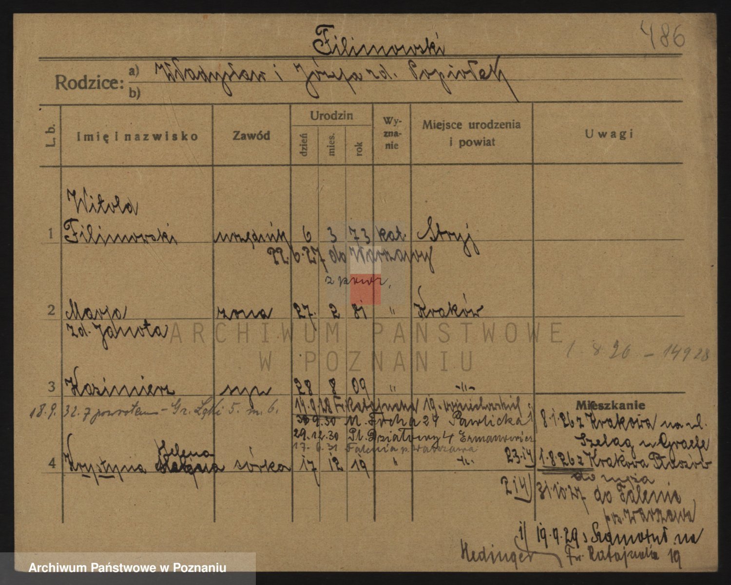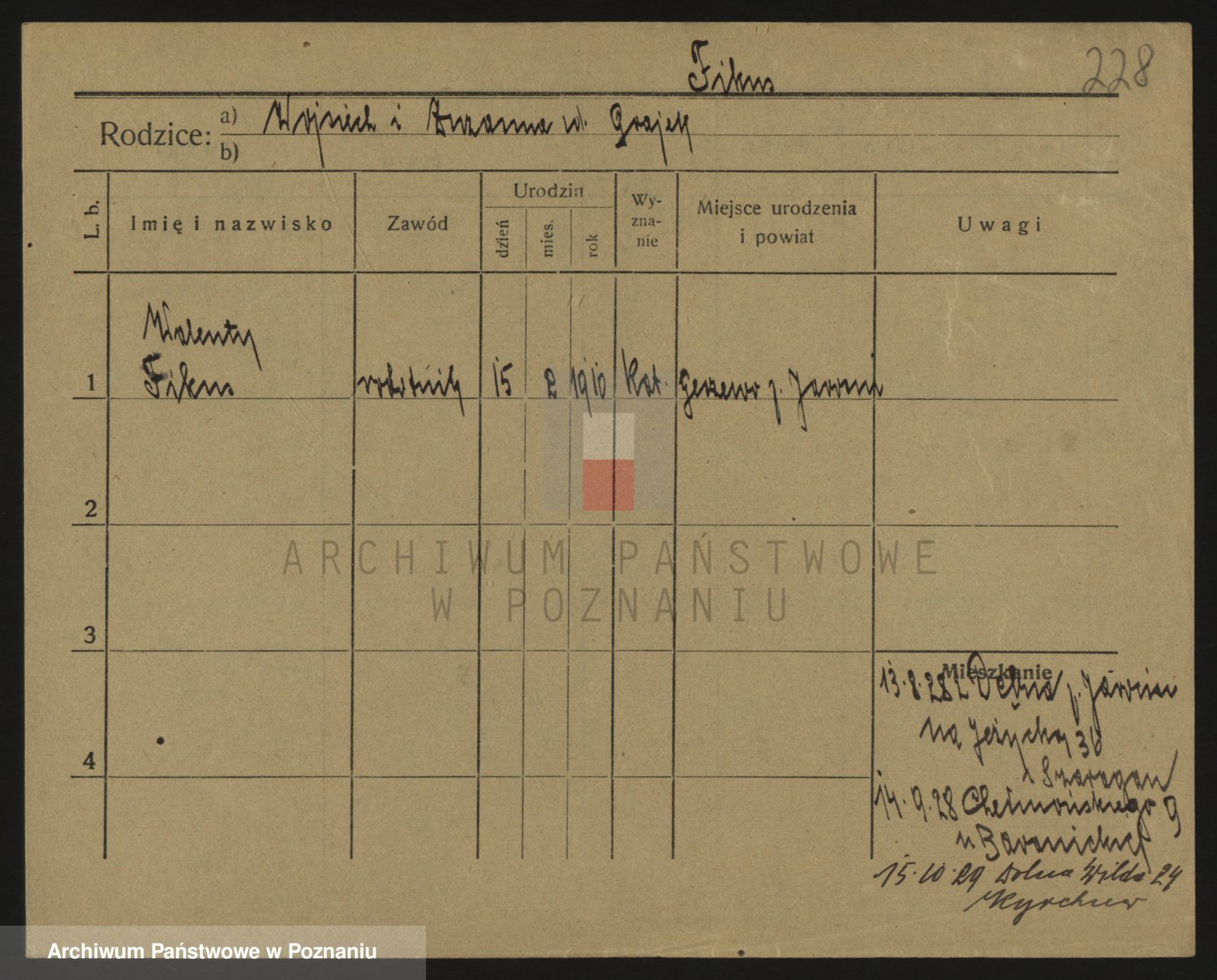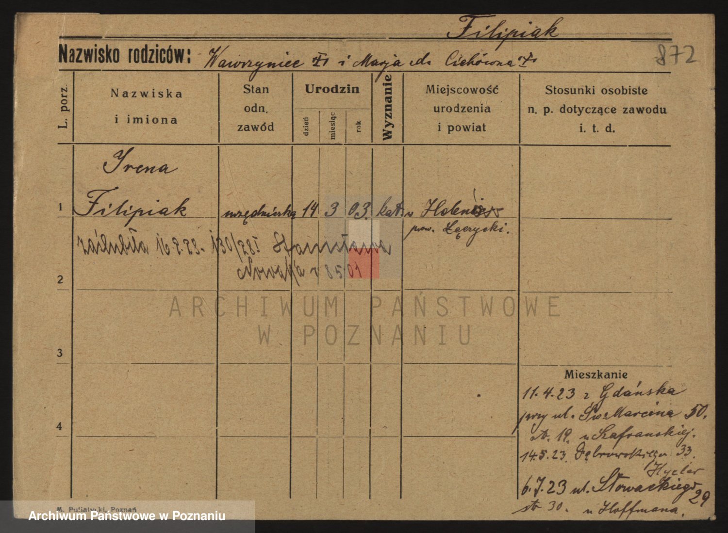 Podgląd karty osobowej dostępny jest po kliknięciu na nazwisko lub ikonkę karty. Można dokonywać powiększenia (ikony na górze) lub przechodzić między kolejnymi skanami (strzałki po bokach).