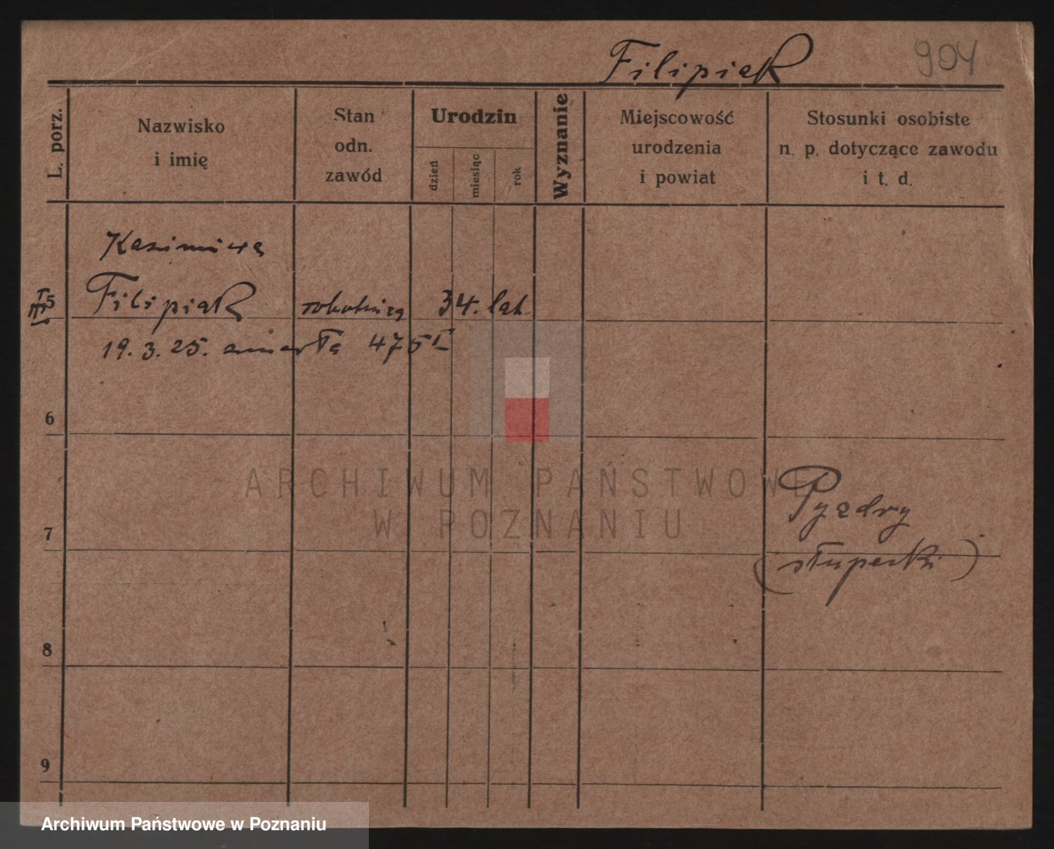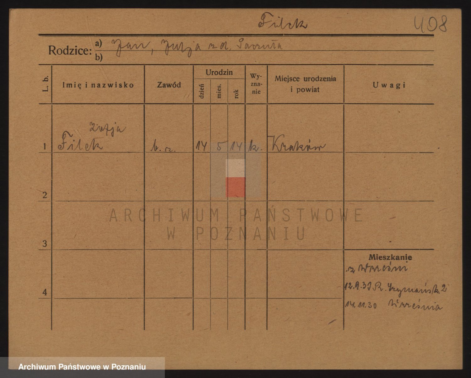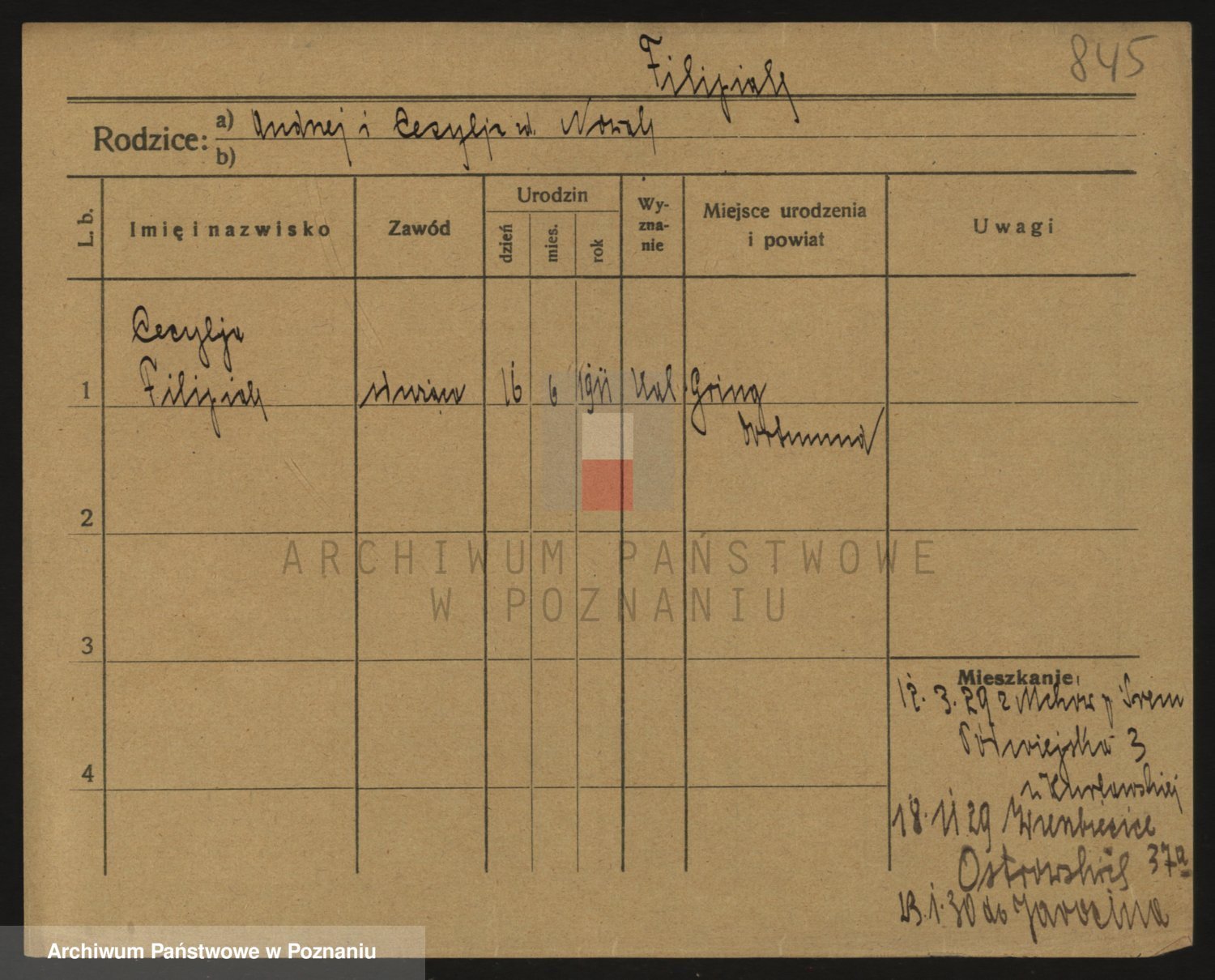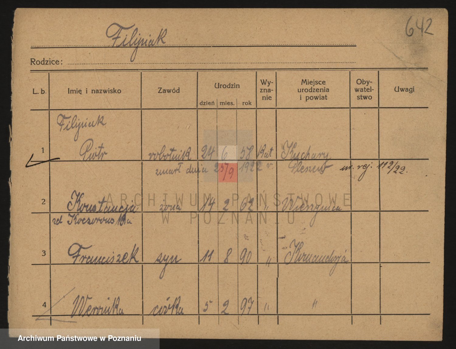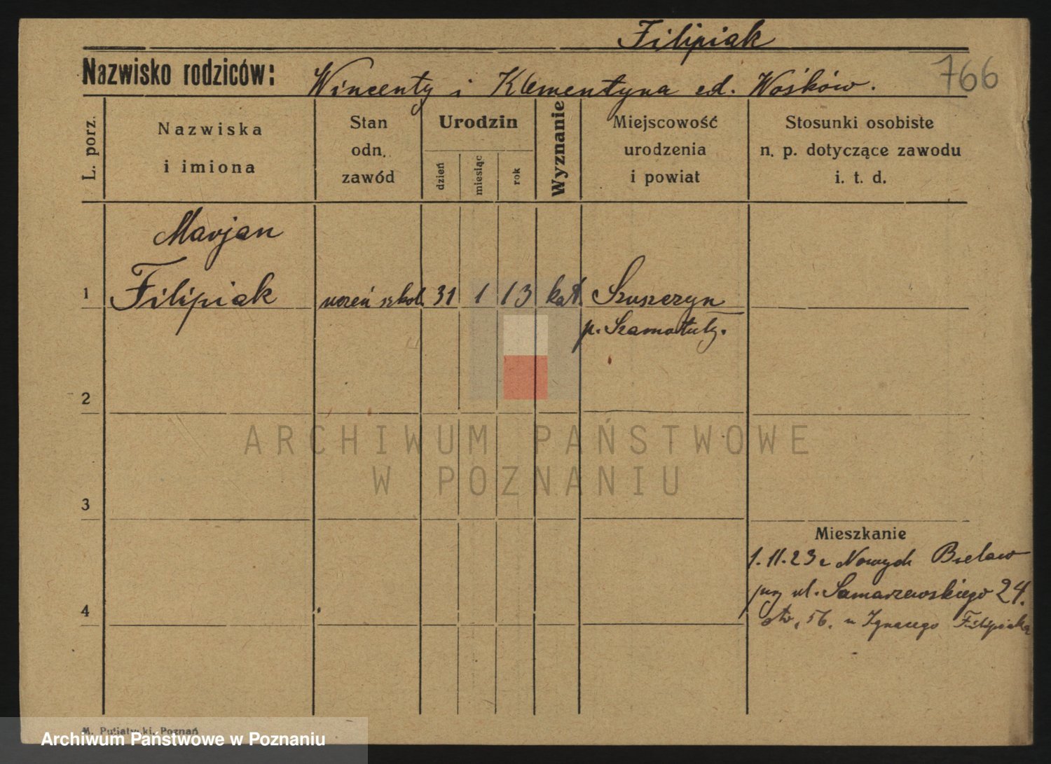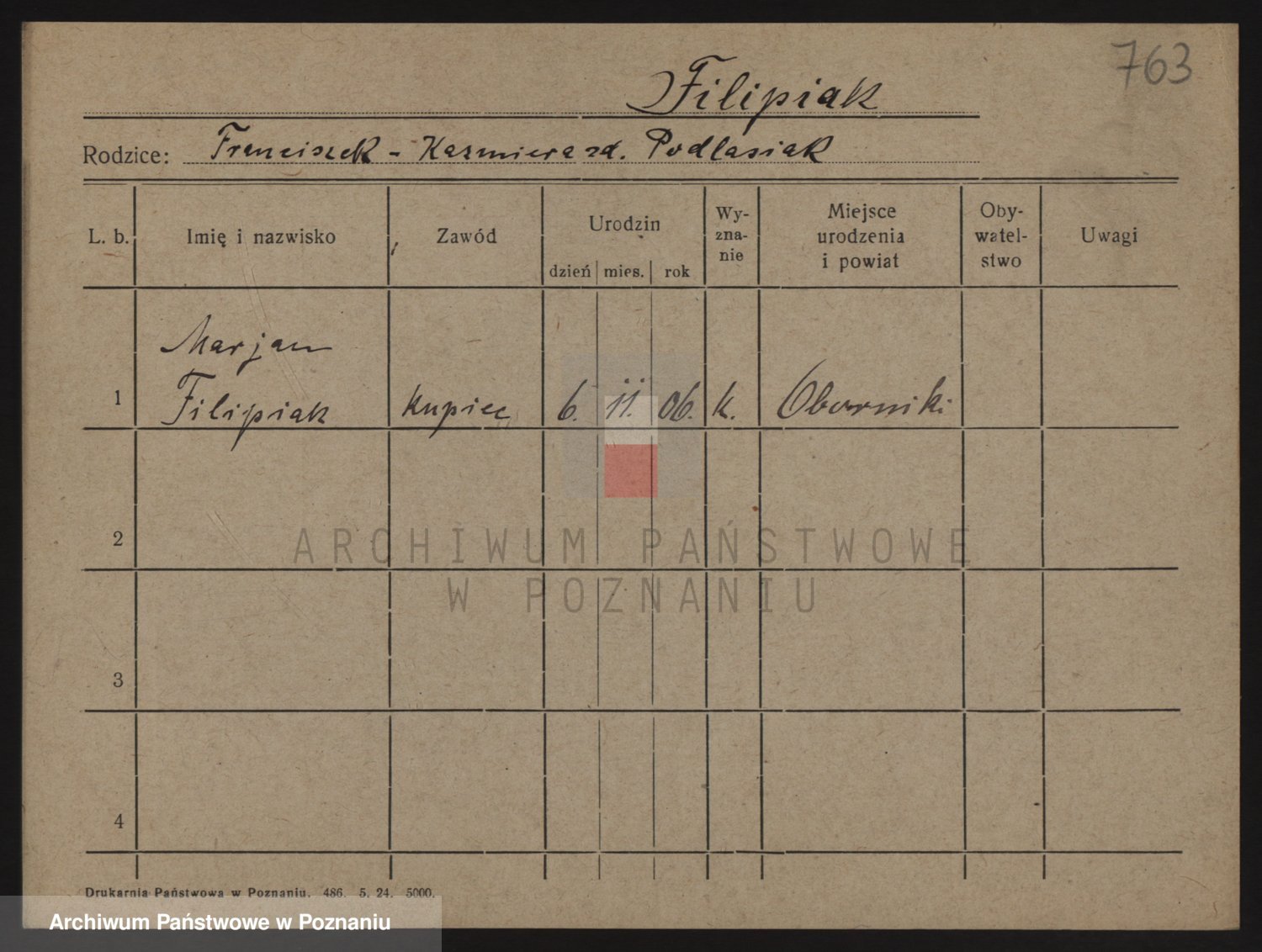 Podgląd karty osobowej dostępny jest po kliknięciu na nazwisko lub ikonkę karty. Można dokonywać powiększenia (ikony na górze) lub przechodzić między kolejnymi skanami (strzałki po bokach).