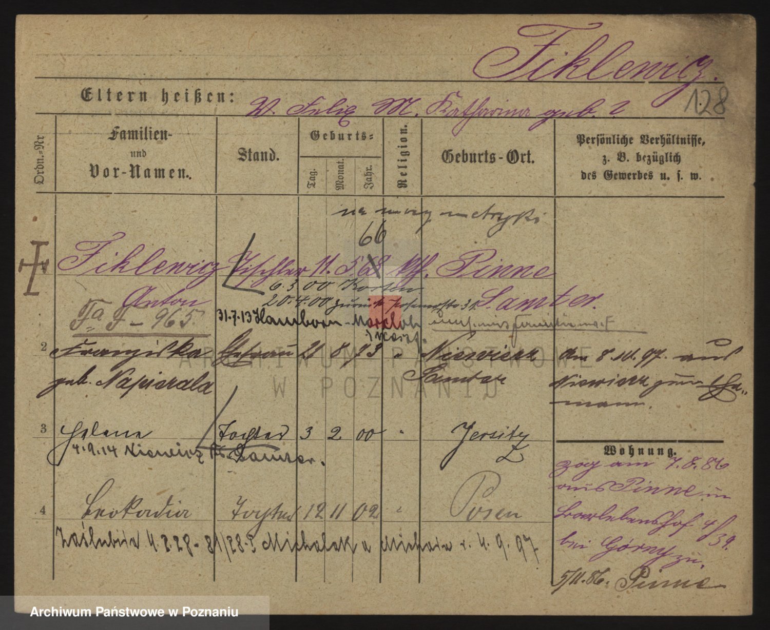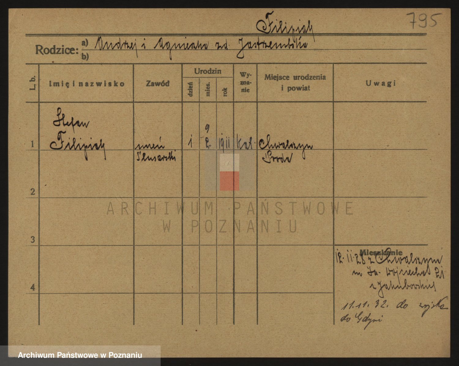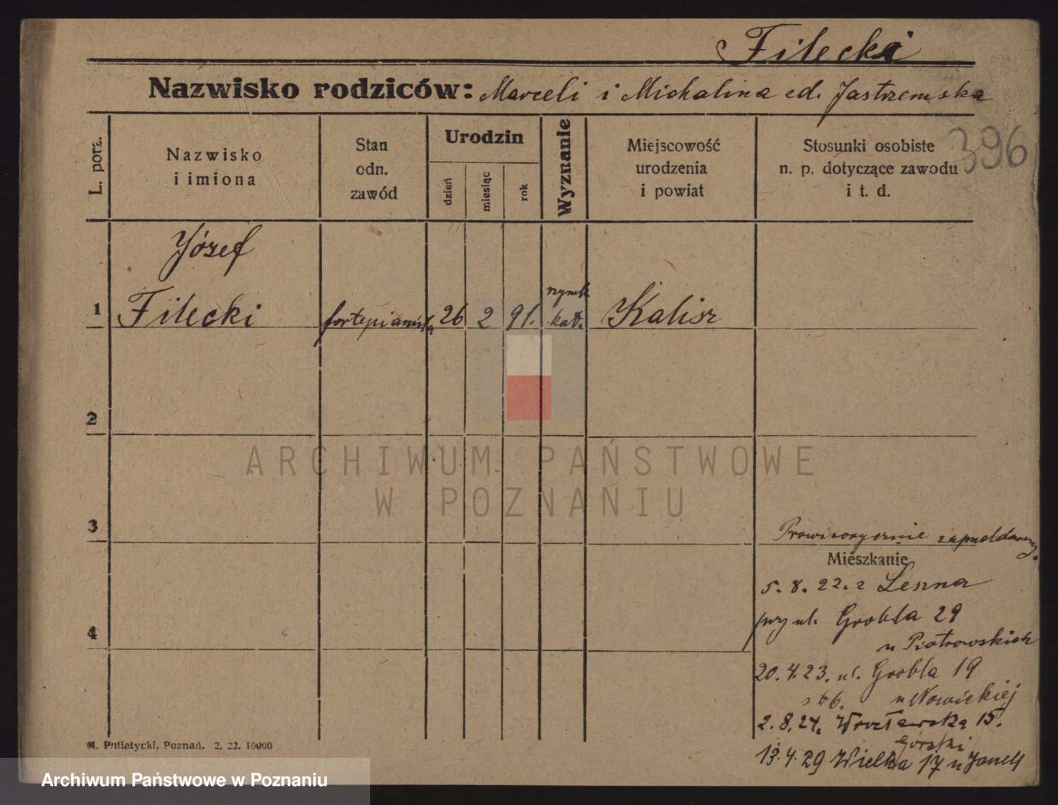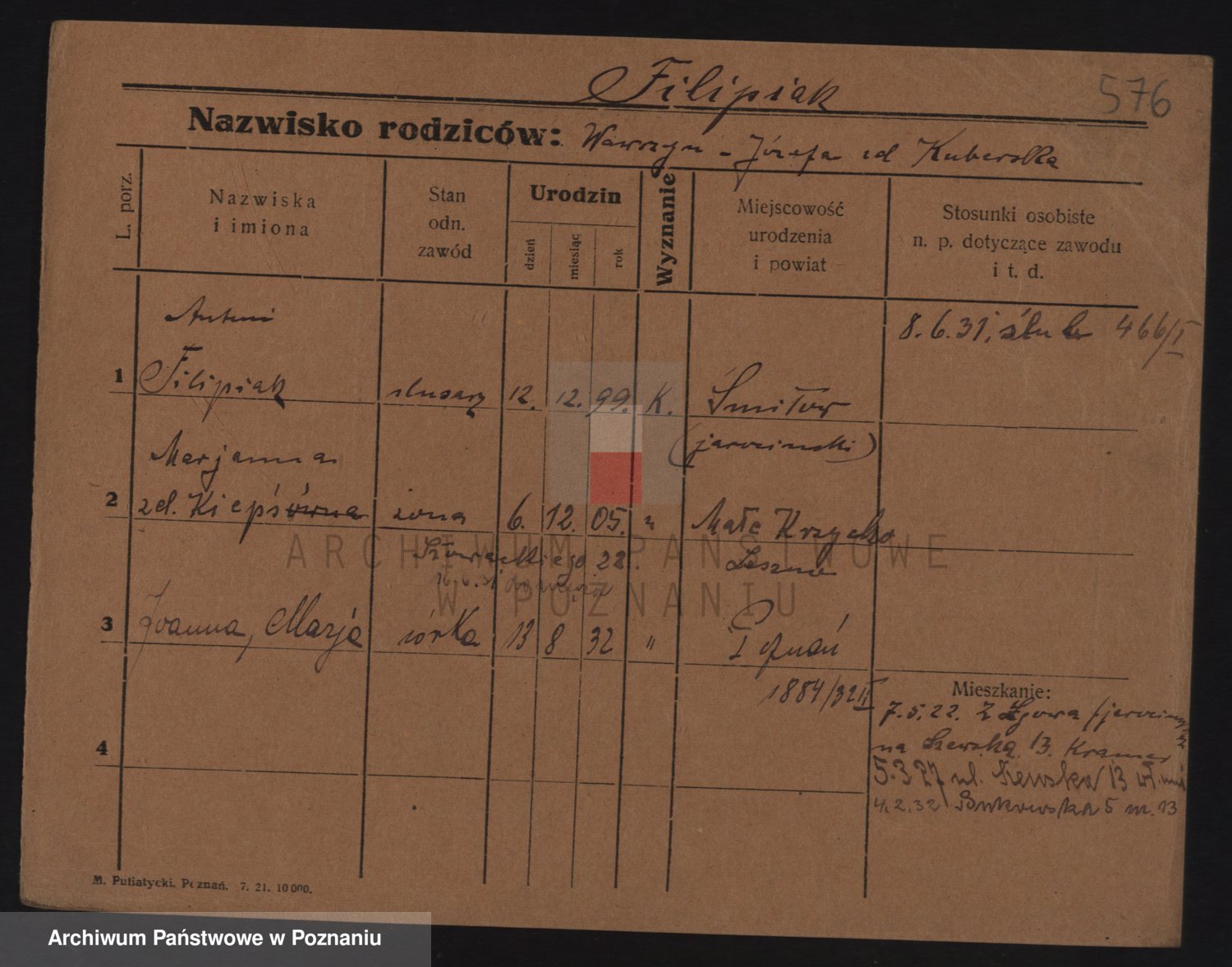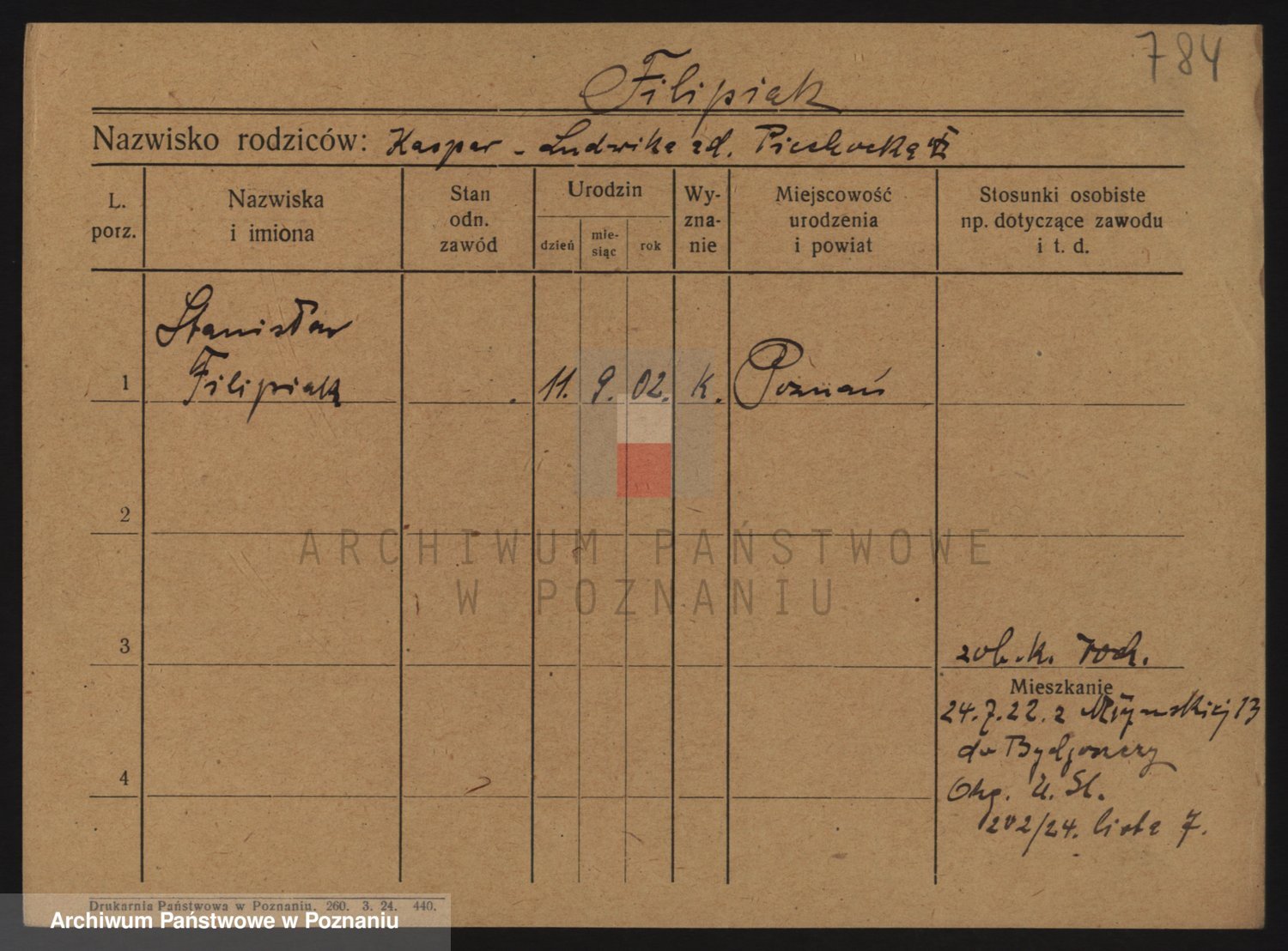Podgląd karty osobowej dostępny jest po kliknięciu na nazwisko lub ikonkę karty. Można dokonywać powiększenia (ikony na górze) lub przechodzić między kolejnymi skanami (strzałki po bokach).