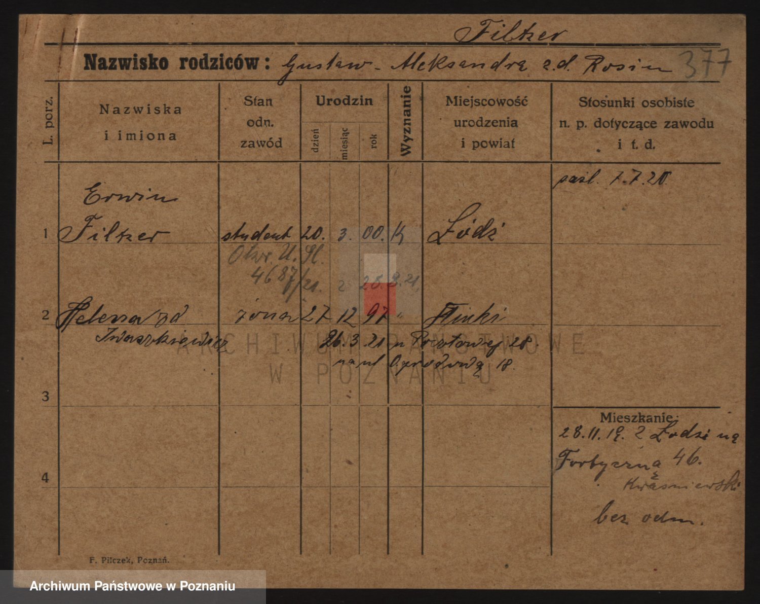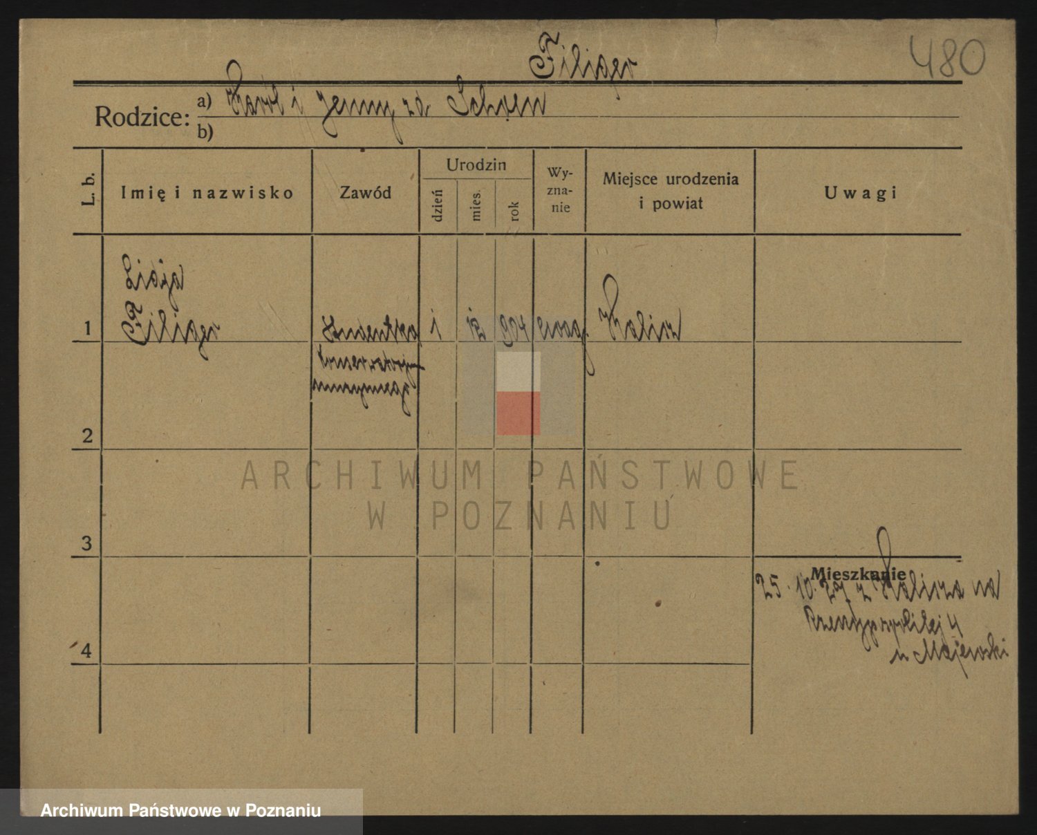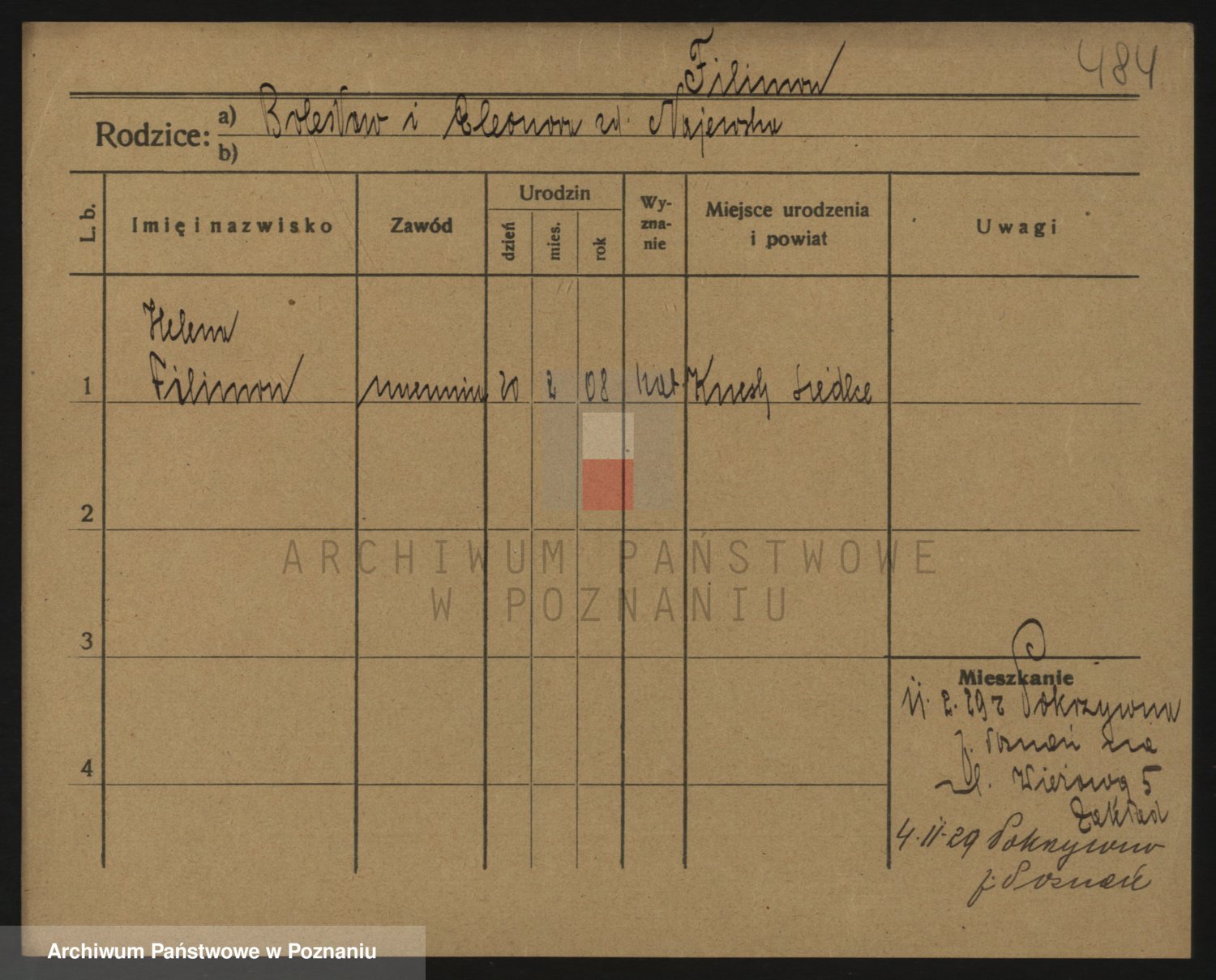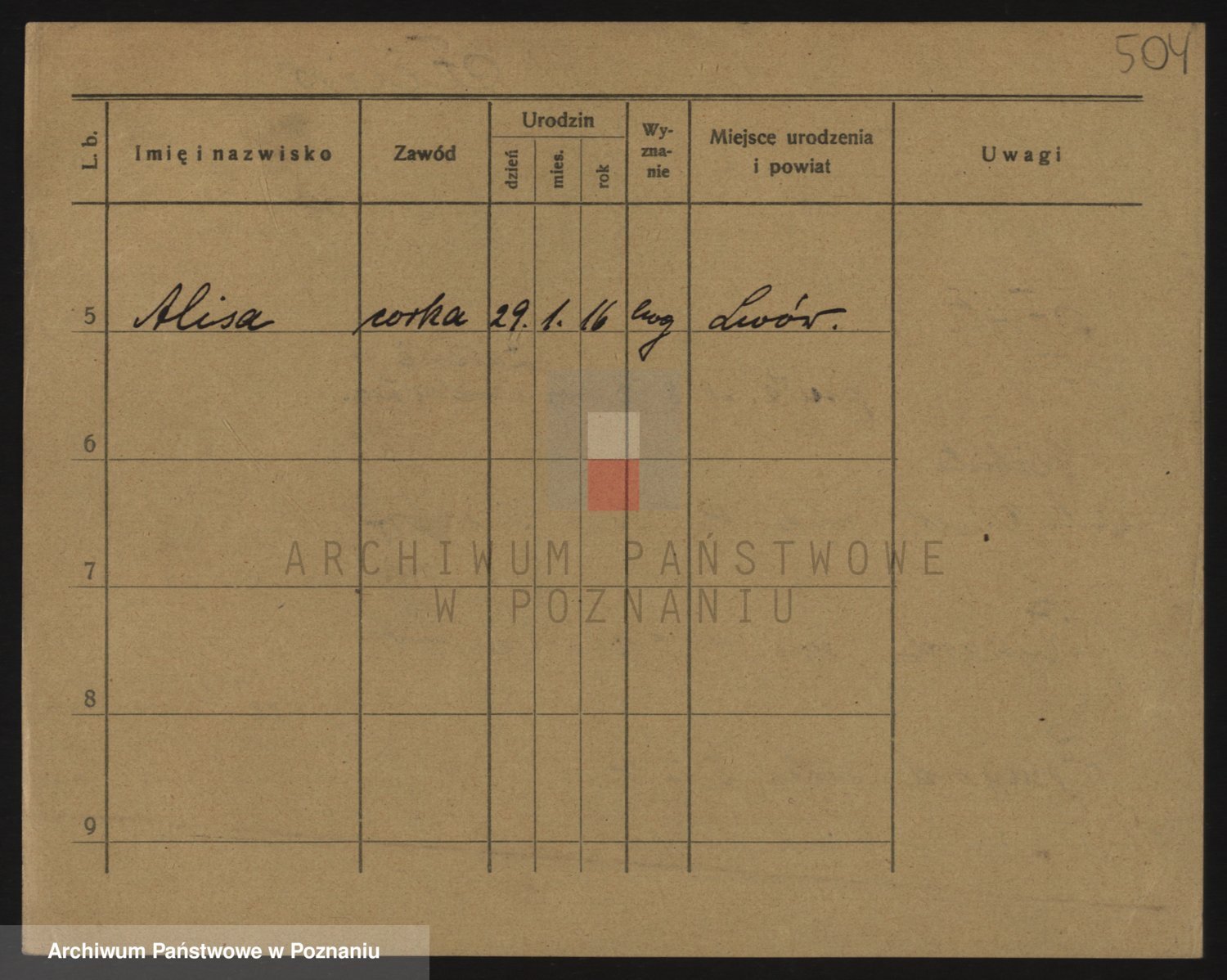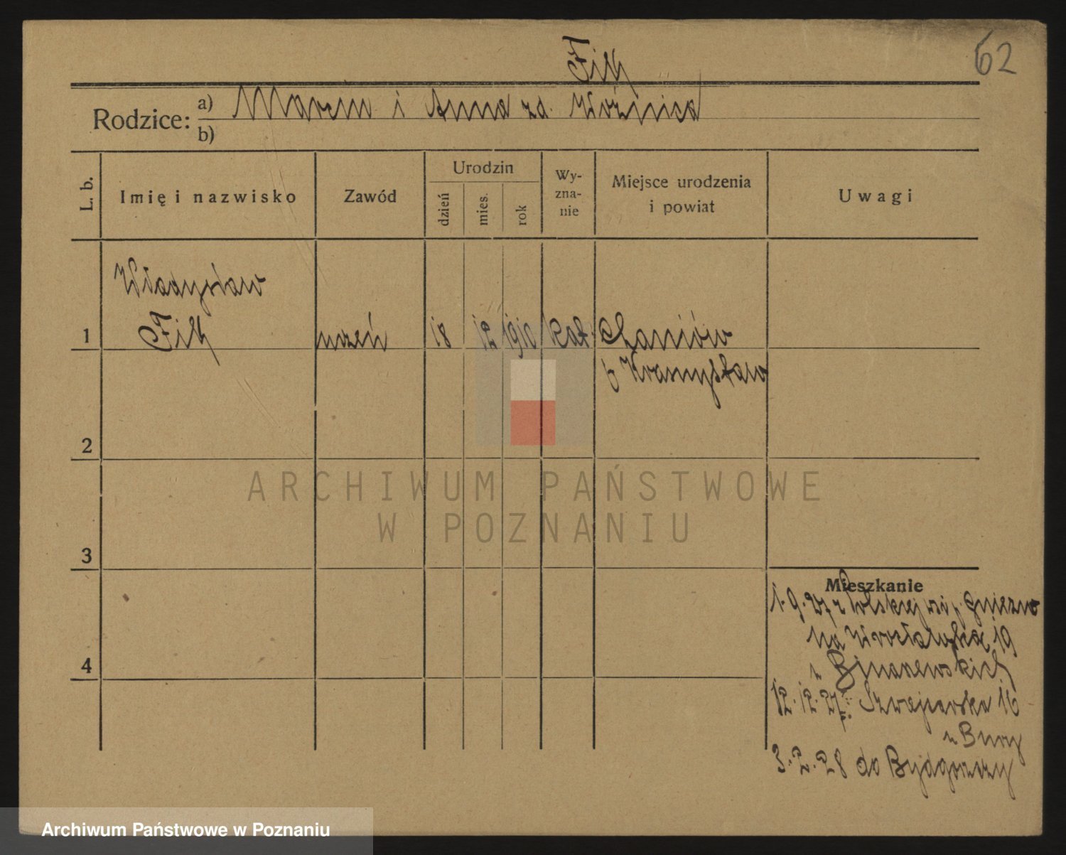 Podgląd karty osobowej dostępny jest po kliknięciu na nazwisko lub ikonkę karty. Można dokonywać powiększenia (ikony na górze) lub przechodzić między kolejnymi skanami (strzałki po bokach).