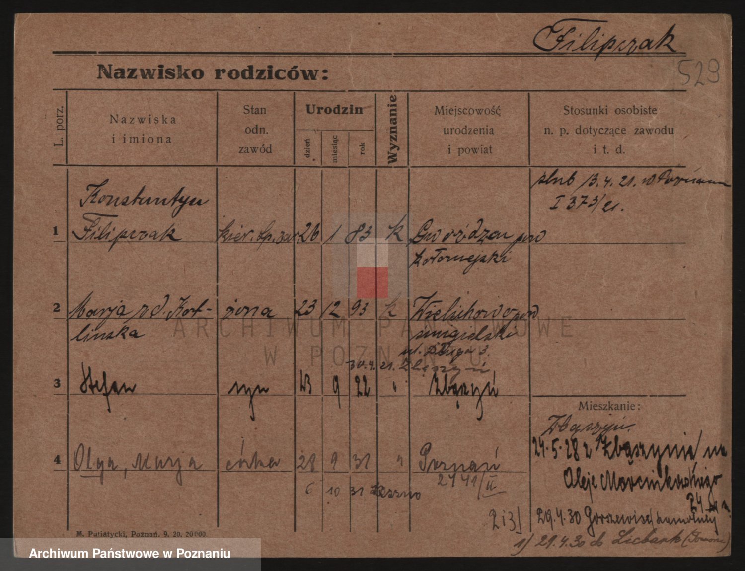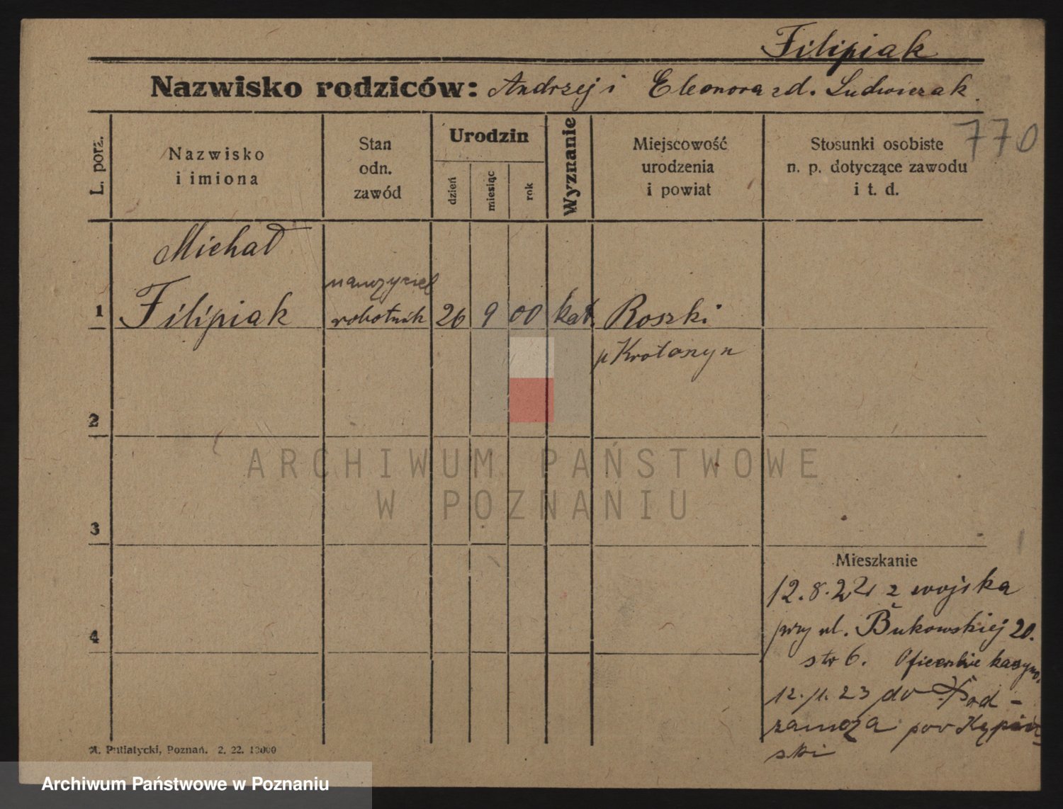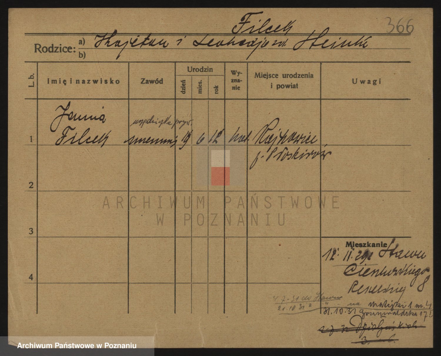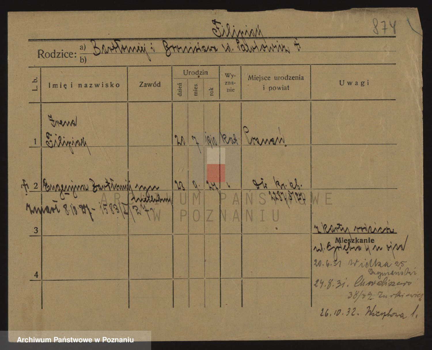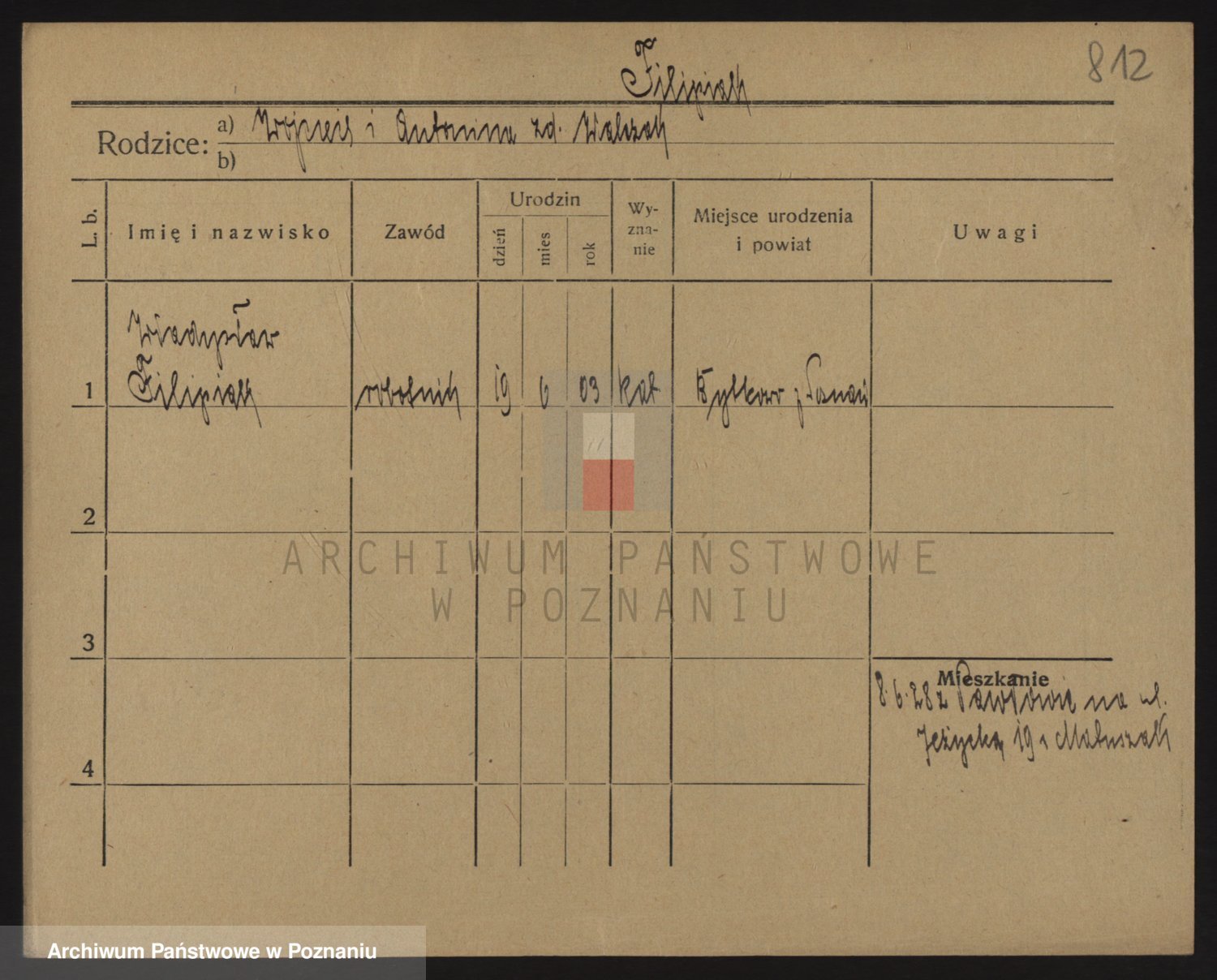 Podgląd karty osobowej dostępny jest po kliknięciu na nazwisko lub ikonkę karty. Można dokonywać powiększenia (ikony na górze) lub przechodzić między kolejnymi skanami (strzałki po bokach).