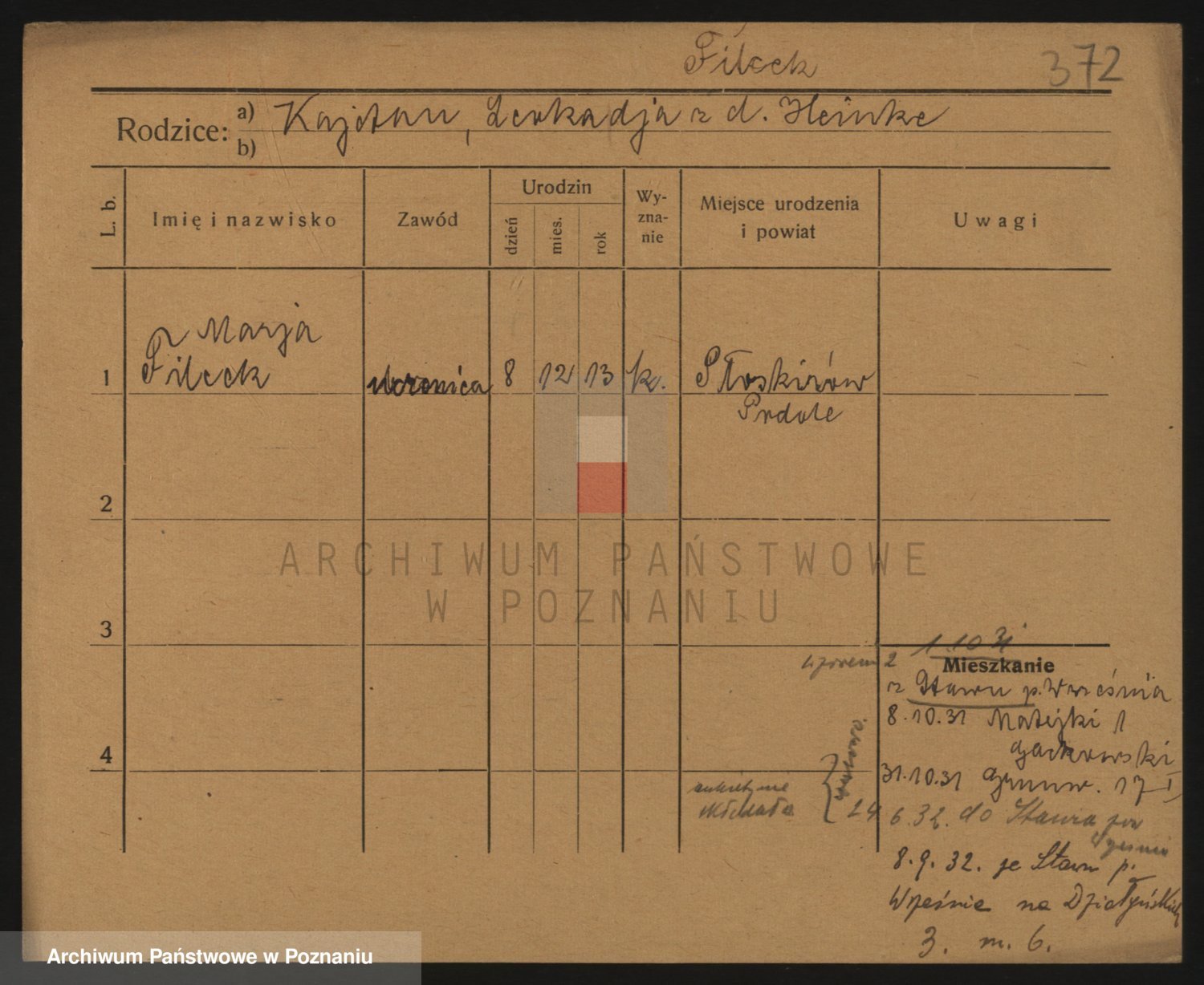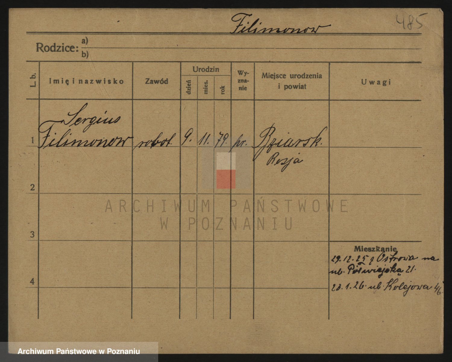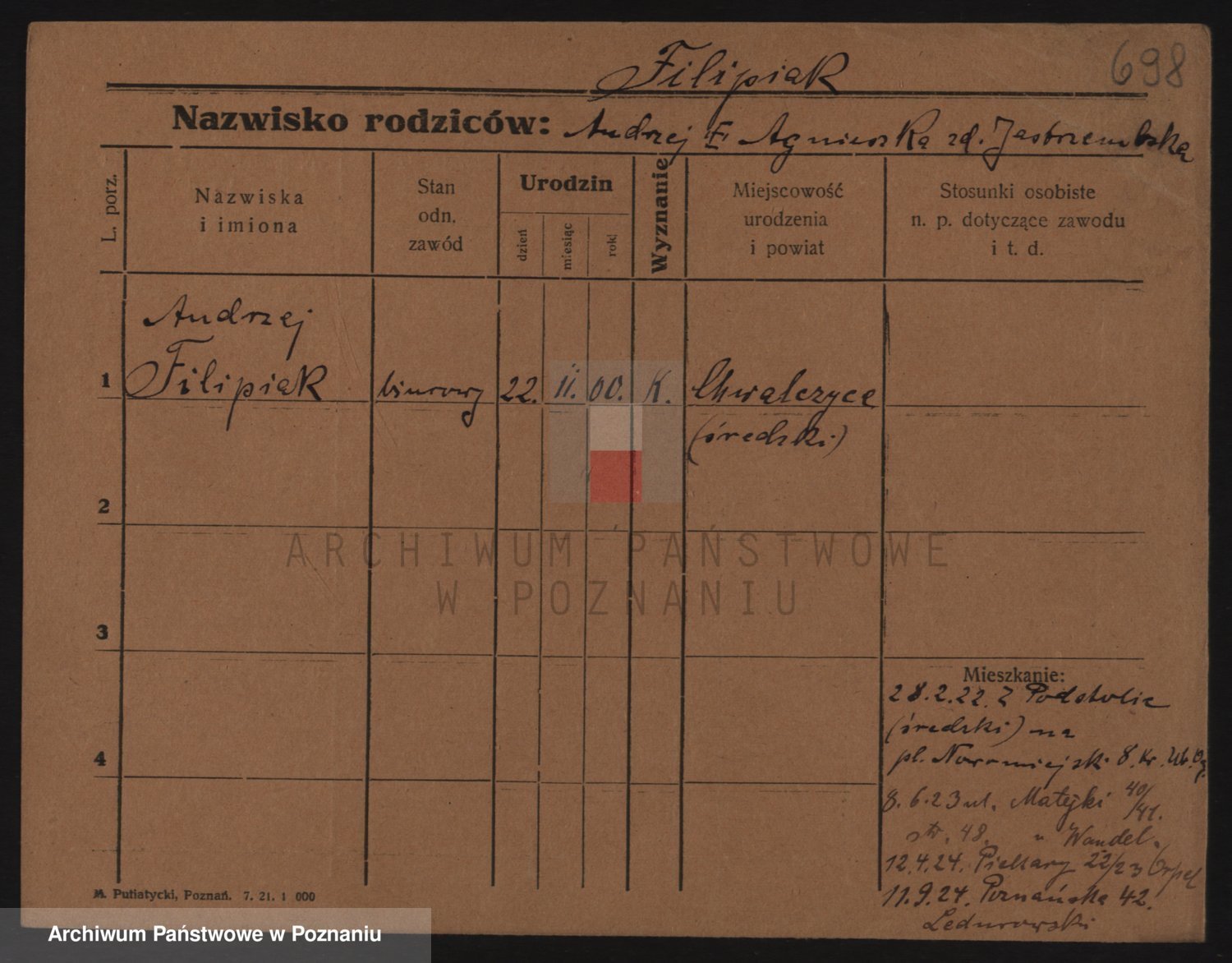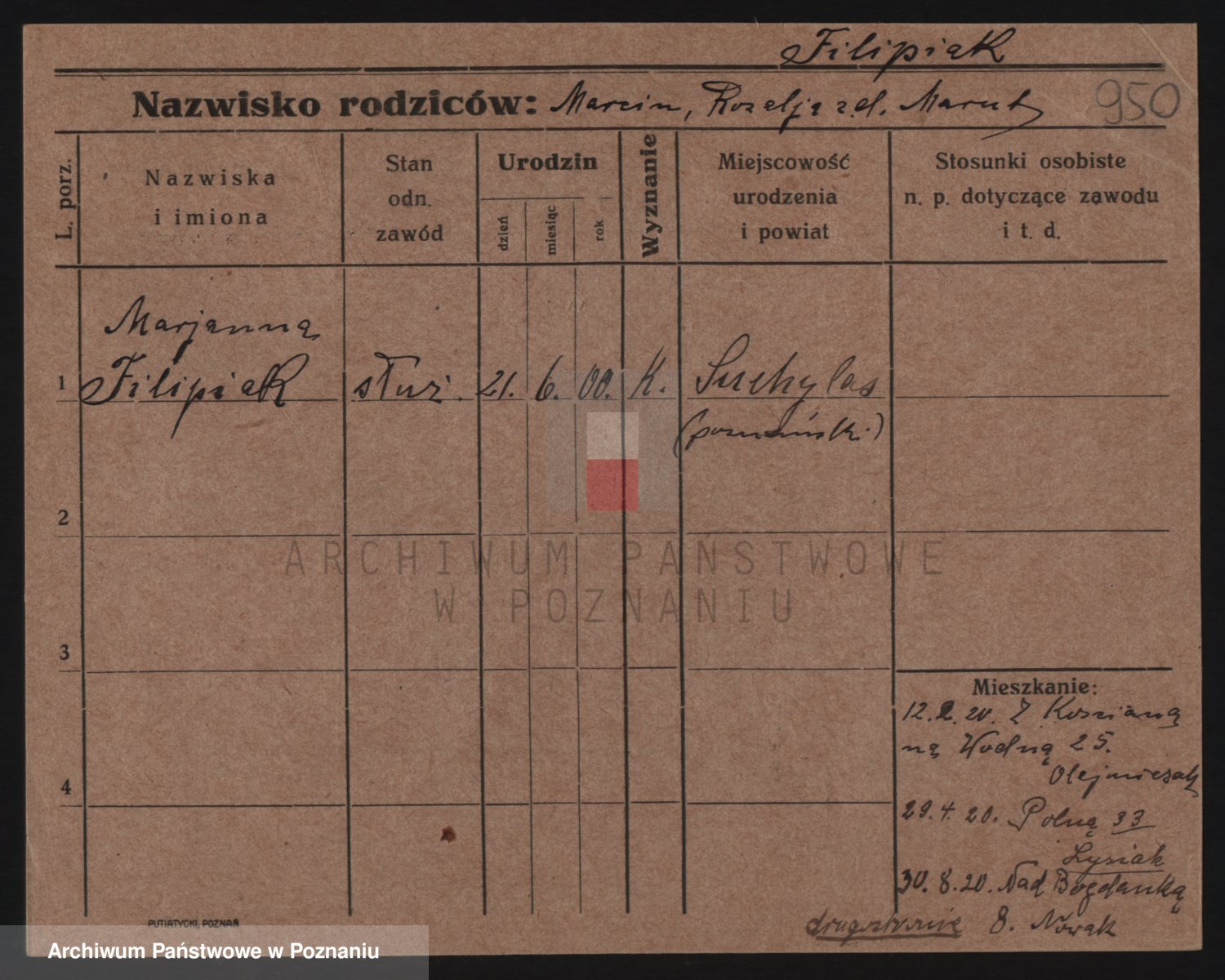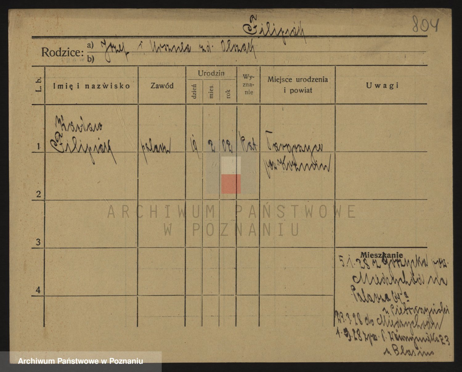 Podgląd karty osobowej dostępny jest po kliknięciu na nazwisko lub ikonkę karty. Można dokonywać powiększenia (ikony na górze) lub przechodzić między kolejnymi skanami (strzałki po bokach).
