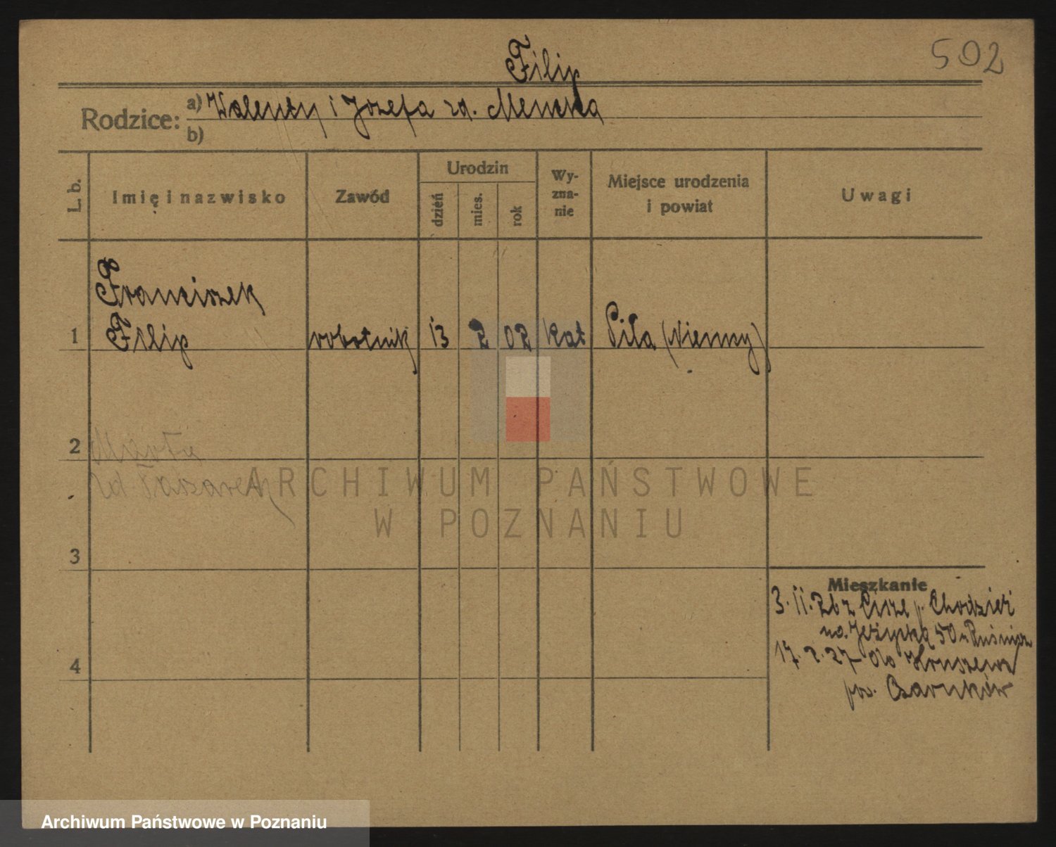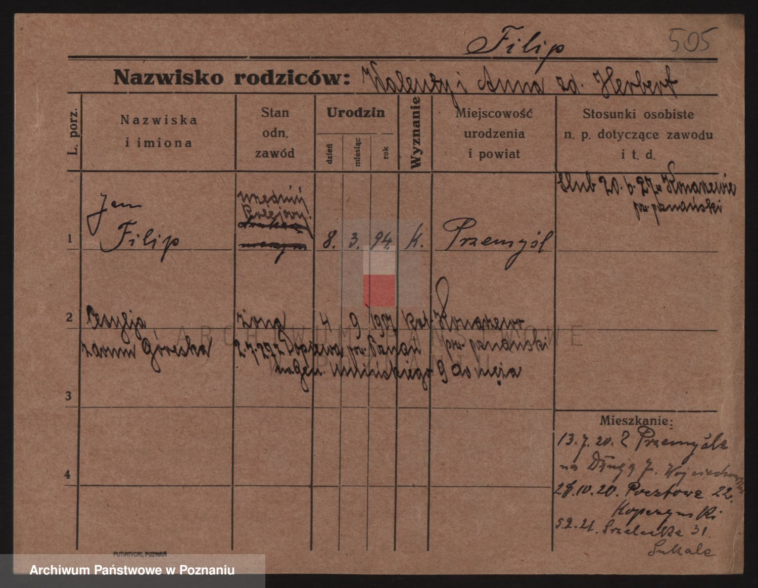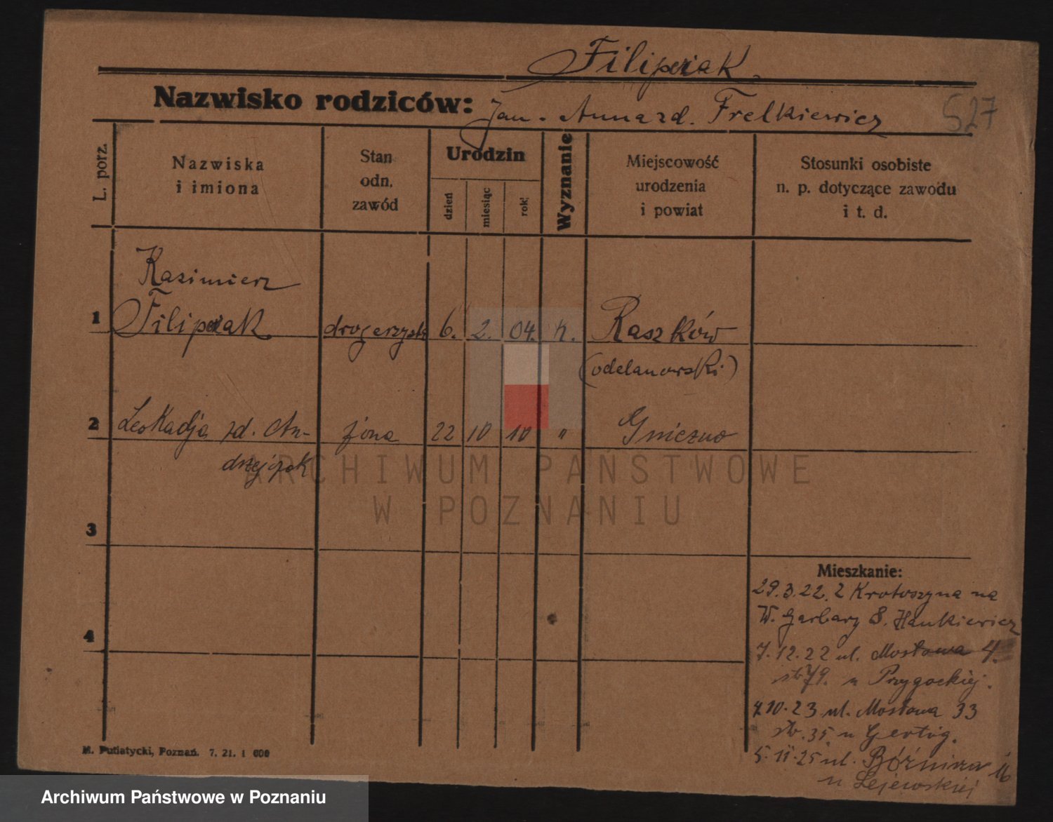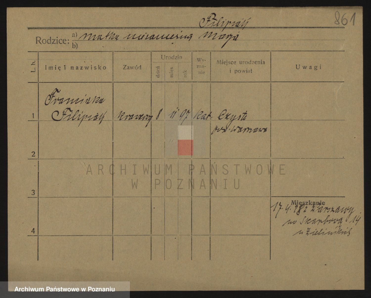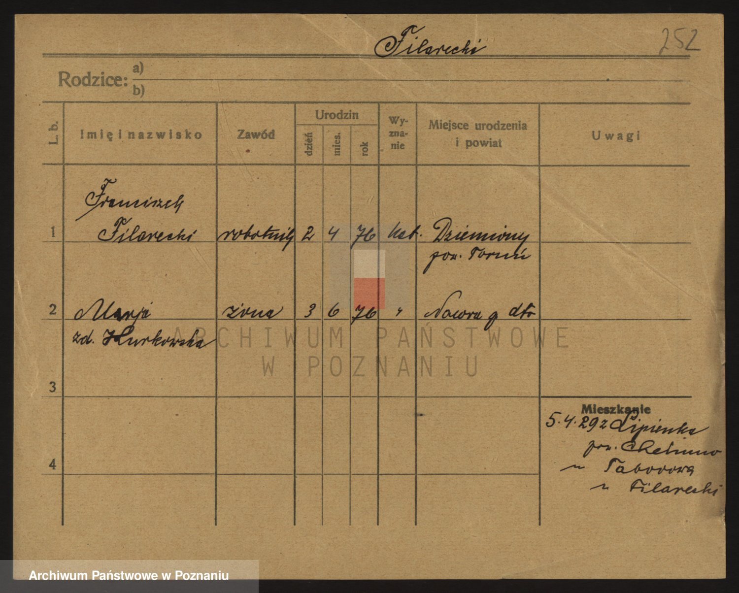 Podgląd karty osobowej dostępny jest po kliknięciu na nazwisko lub ikonkę karty. Można dokonywać powiększenia (ikony na górze) lub przechodzić między kolejnymi skanami (strzałki po bokach).