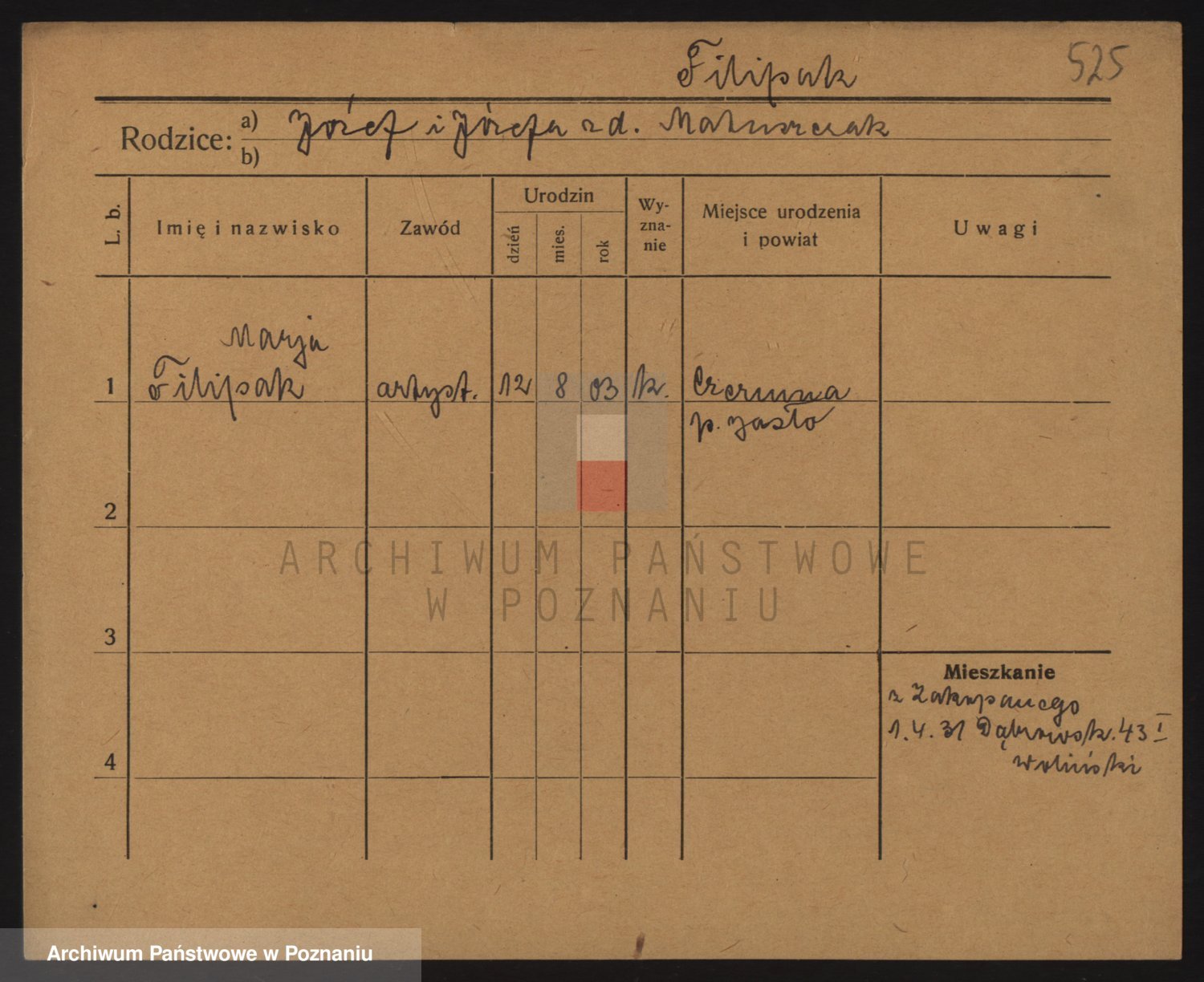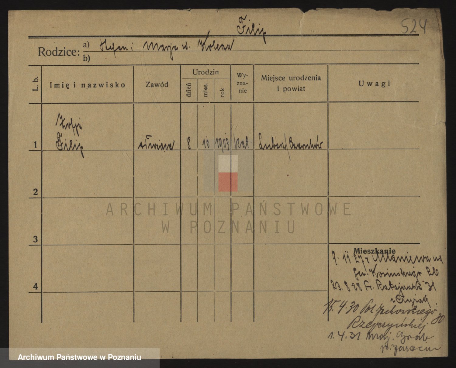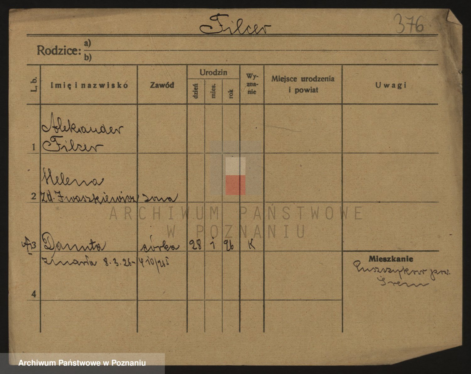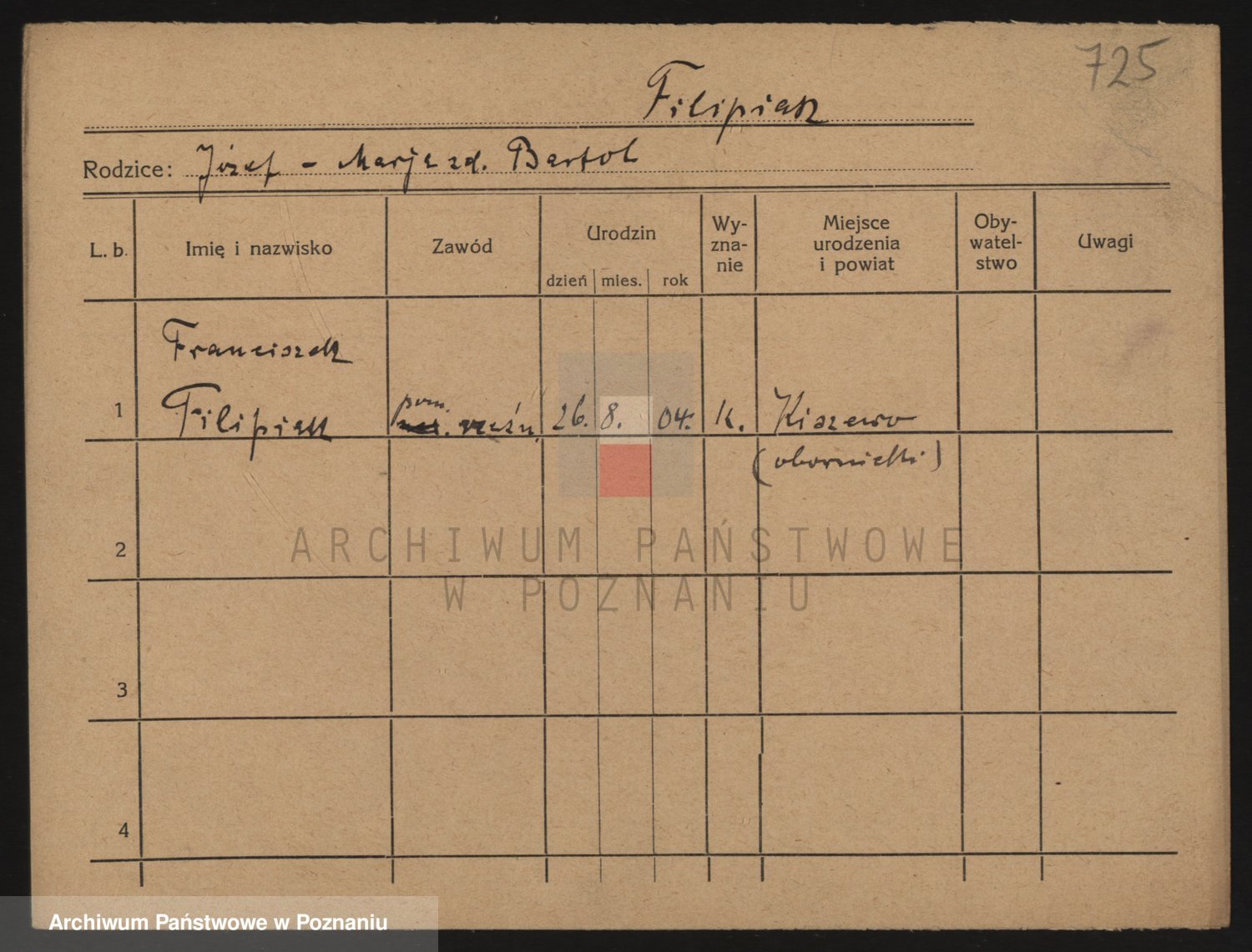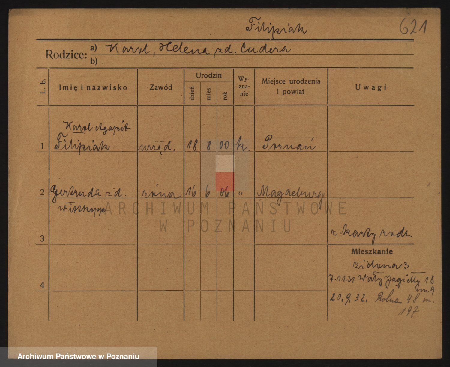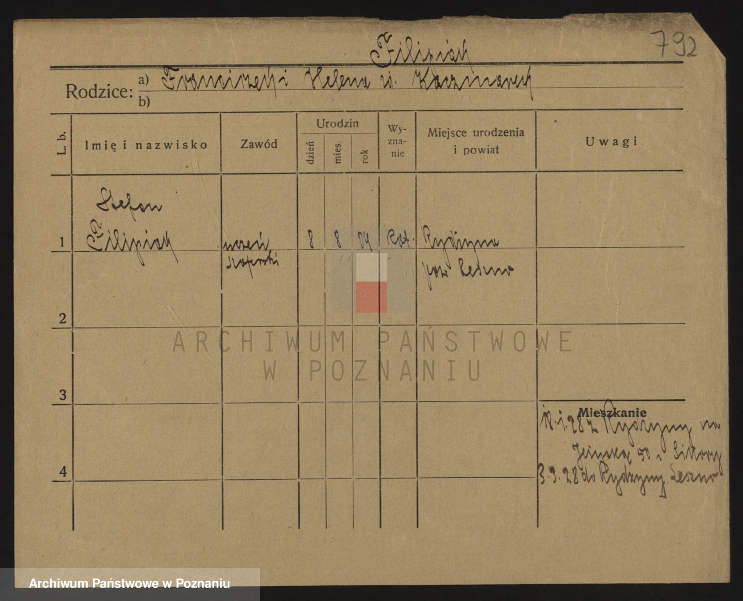 Podgląd karty osobowej dostępny jest po kliknięciu na nazwisko lub ikonkę karty. Można dokonywać powiększenia (ikony na górze) lub przechodzić między kolejnymi skanami (strzałki po bokach).