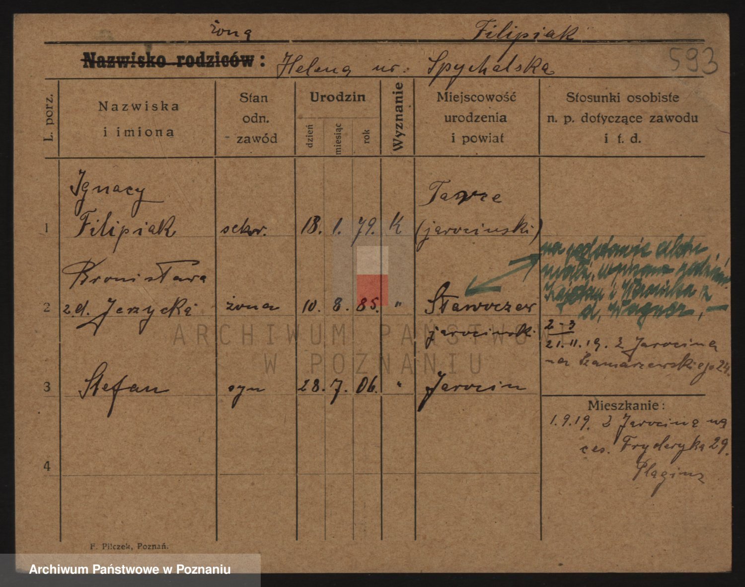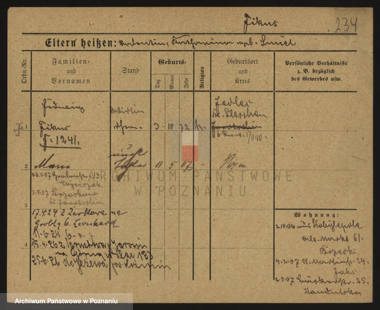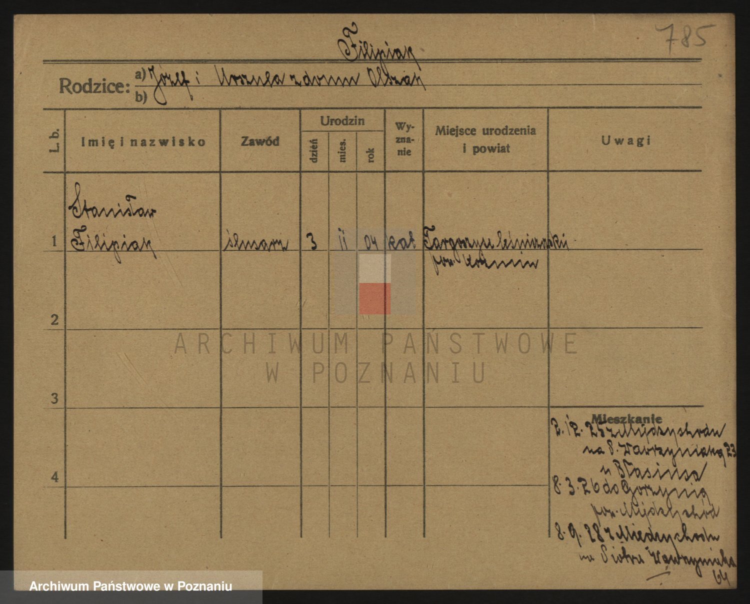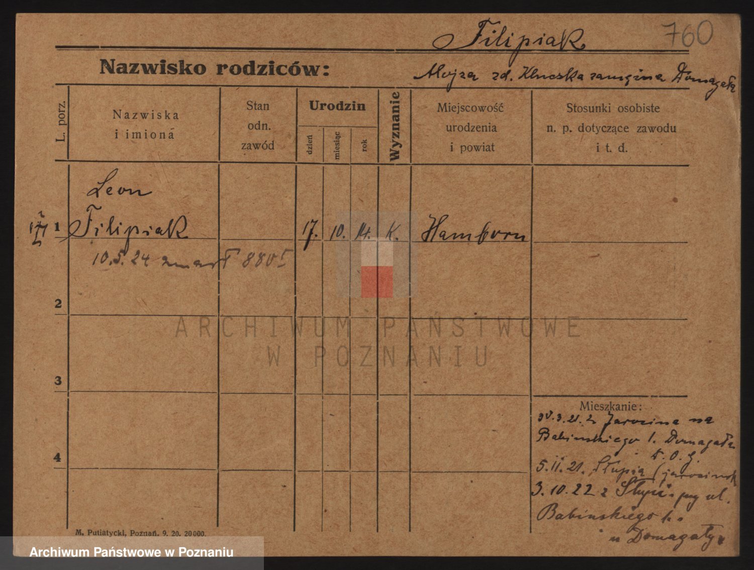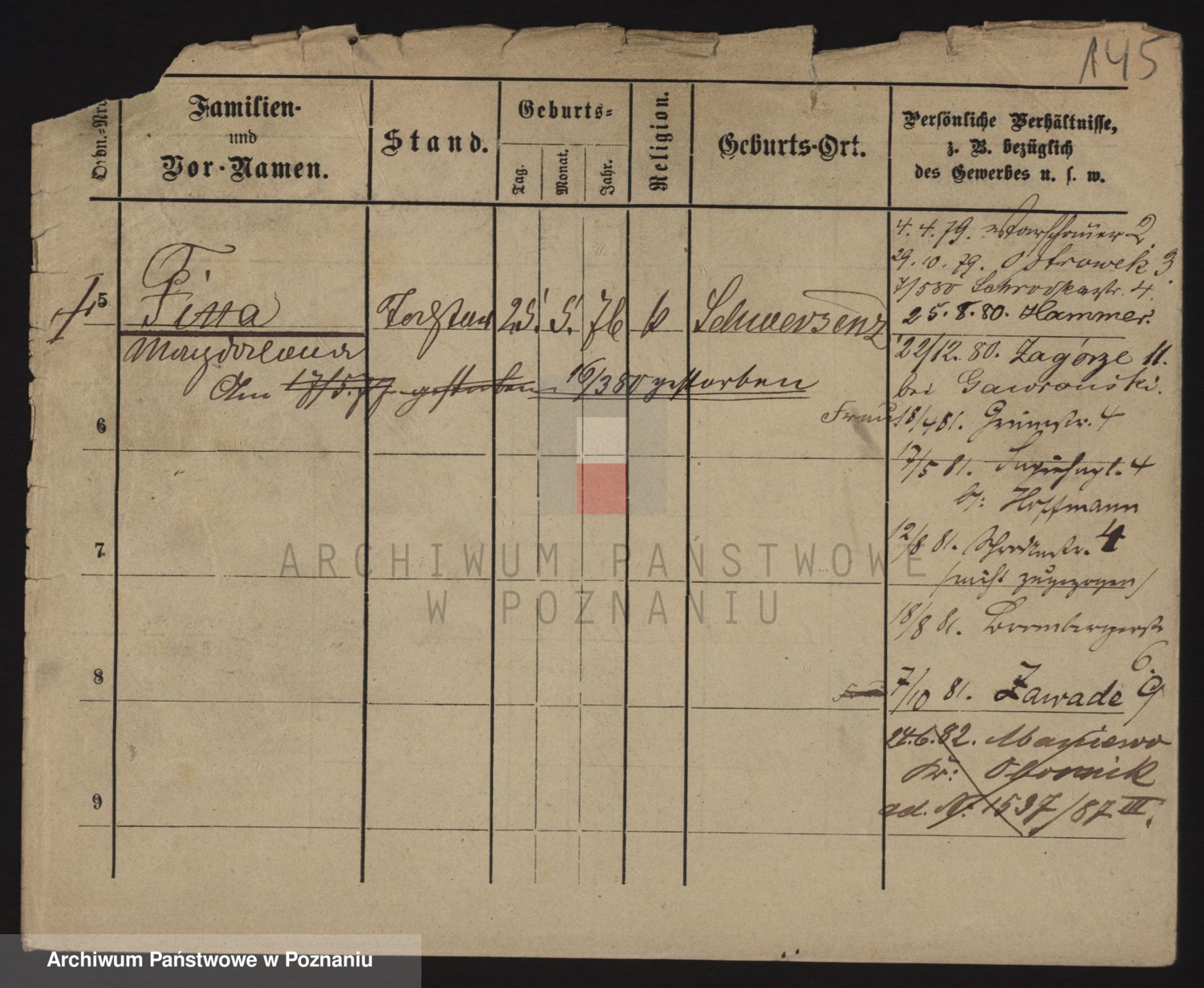 Podgląd karty osobowej dostępny jest po kliknięciu na nazwisko lub ikonkę karty. Można dokonywać powiększenia (ikony na górze) lub przechodzić między kolejnymi skanami (strzałki po bokach).