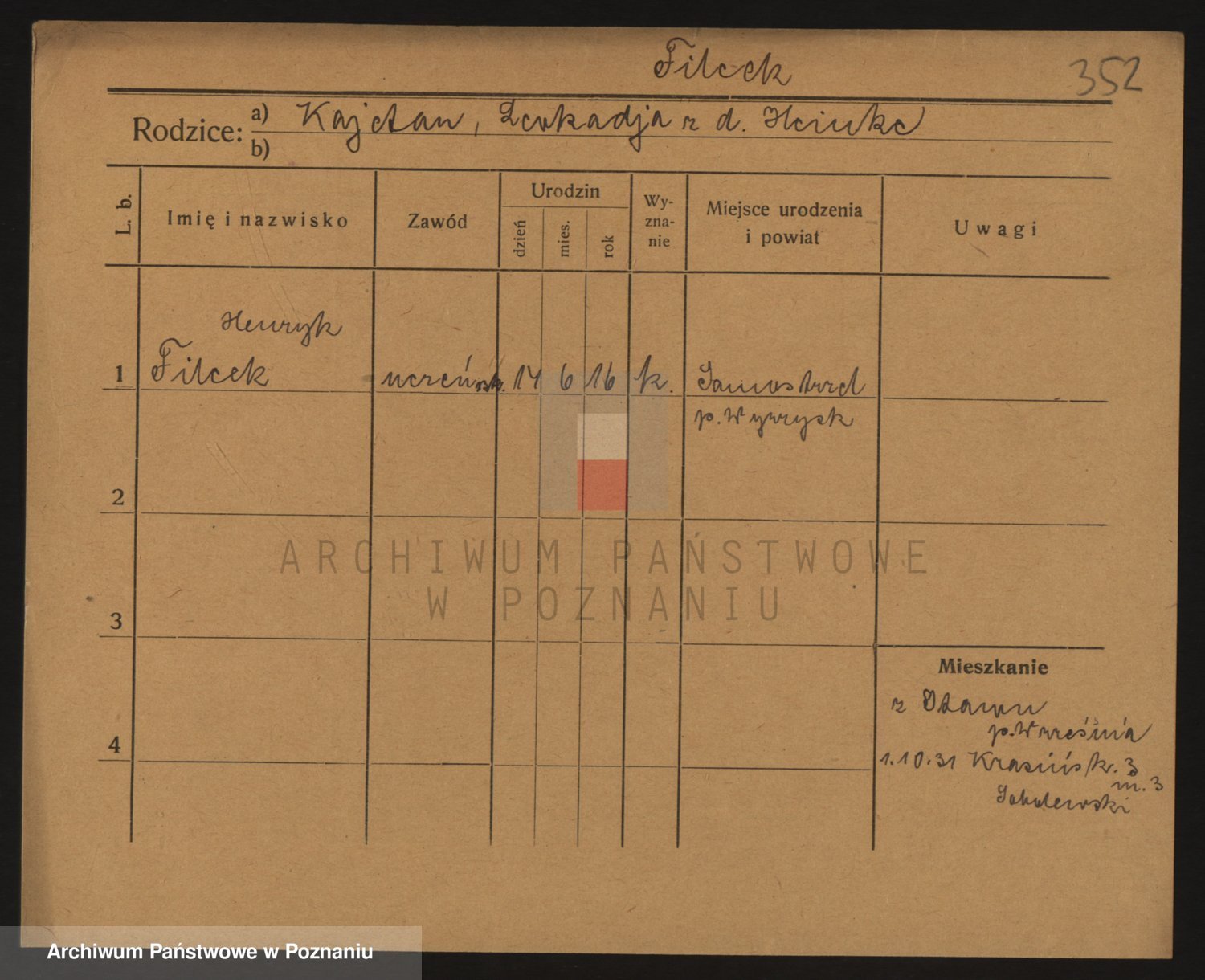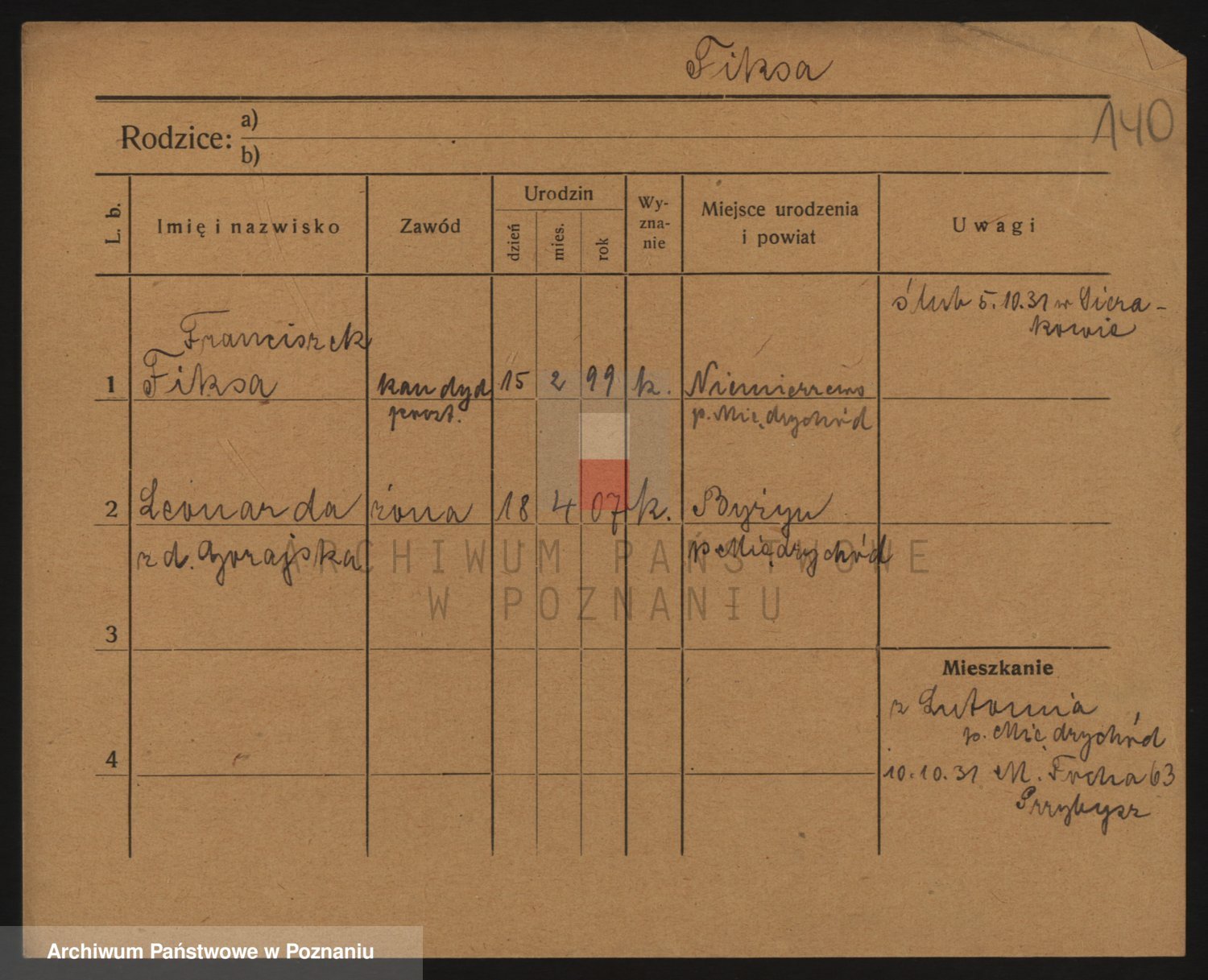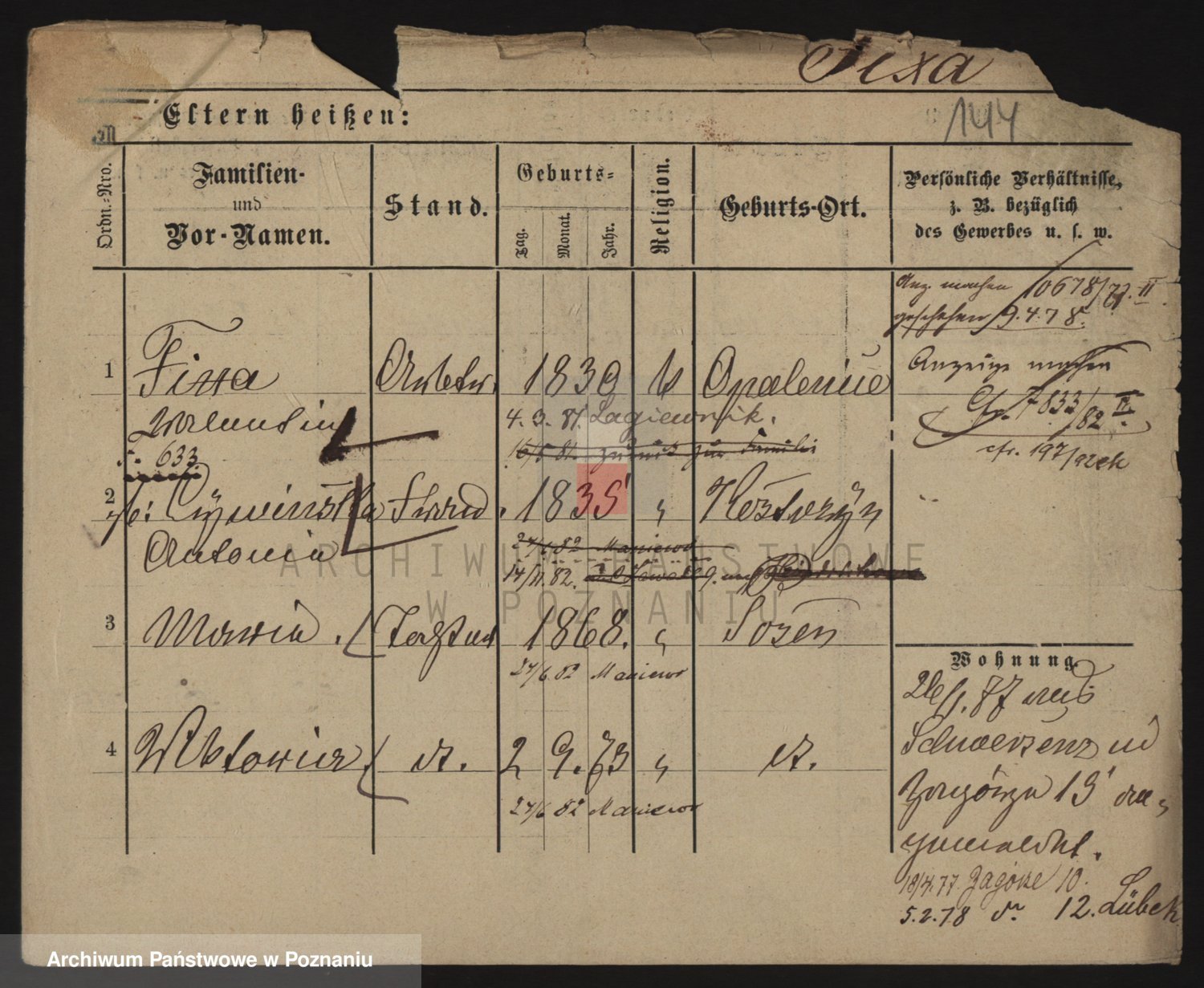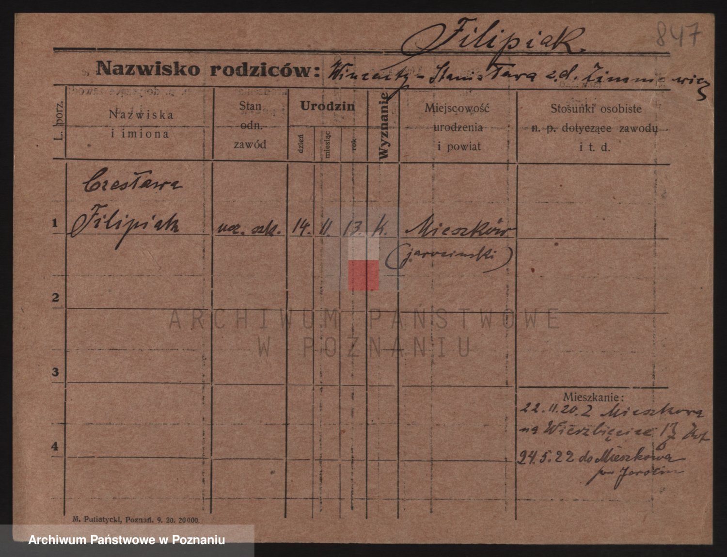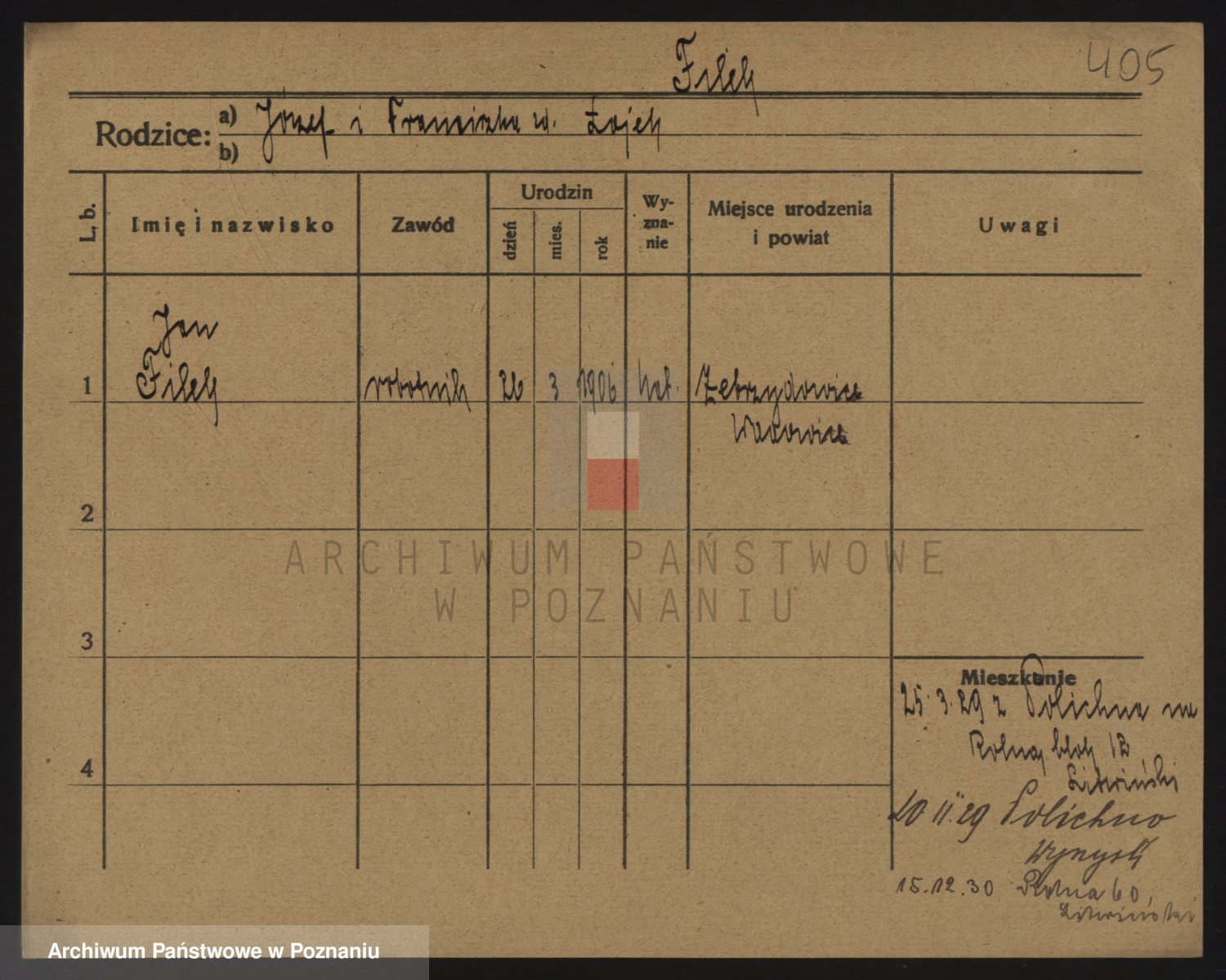 Podgląd karty osobowej dostępny jest po kliknięciu na nazwisko lub ikonkę karty. Można dokonywać powiększenia (ikony na górze) lub przechodzić między kolejnymi skanami (strzałki po bokach).