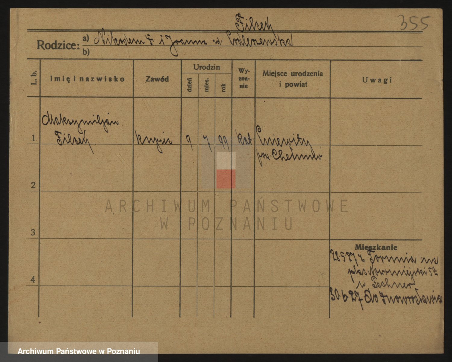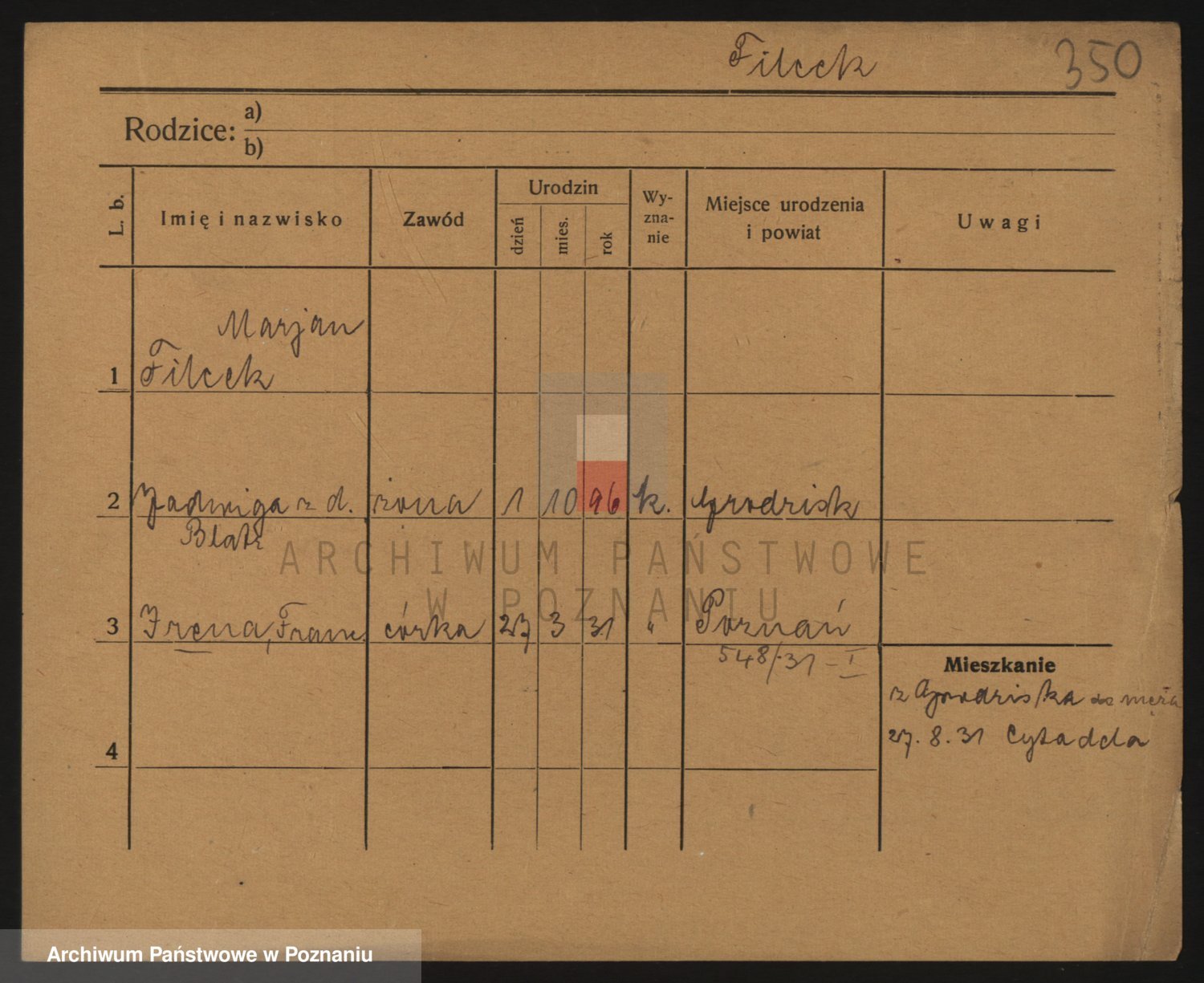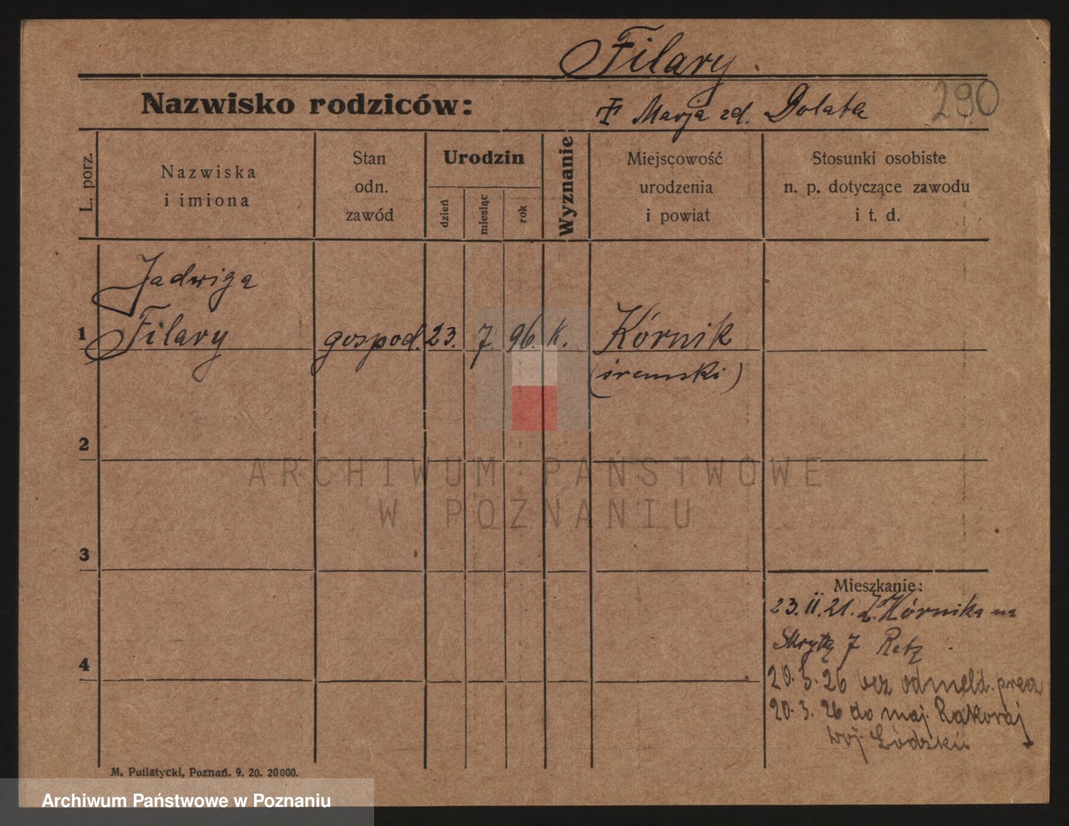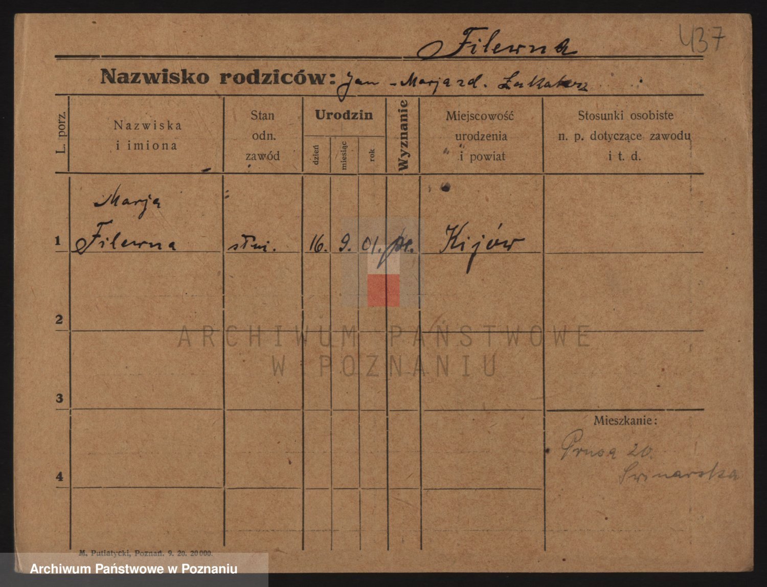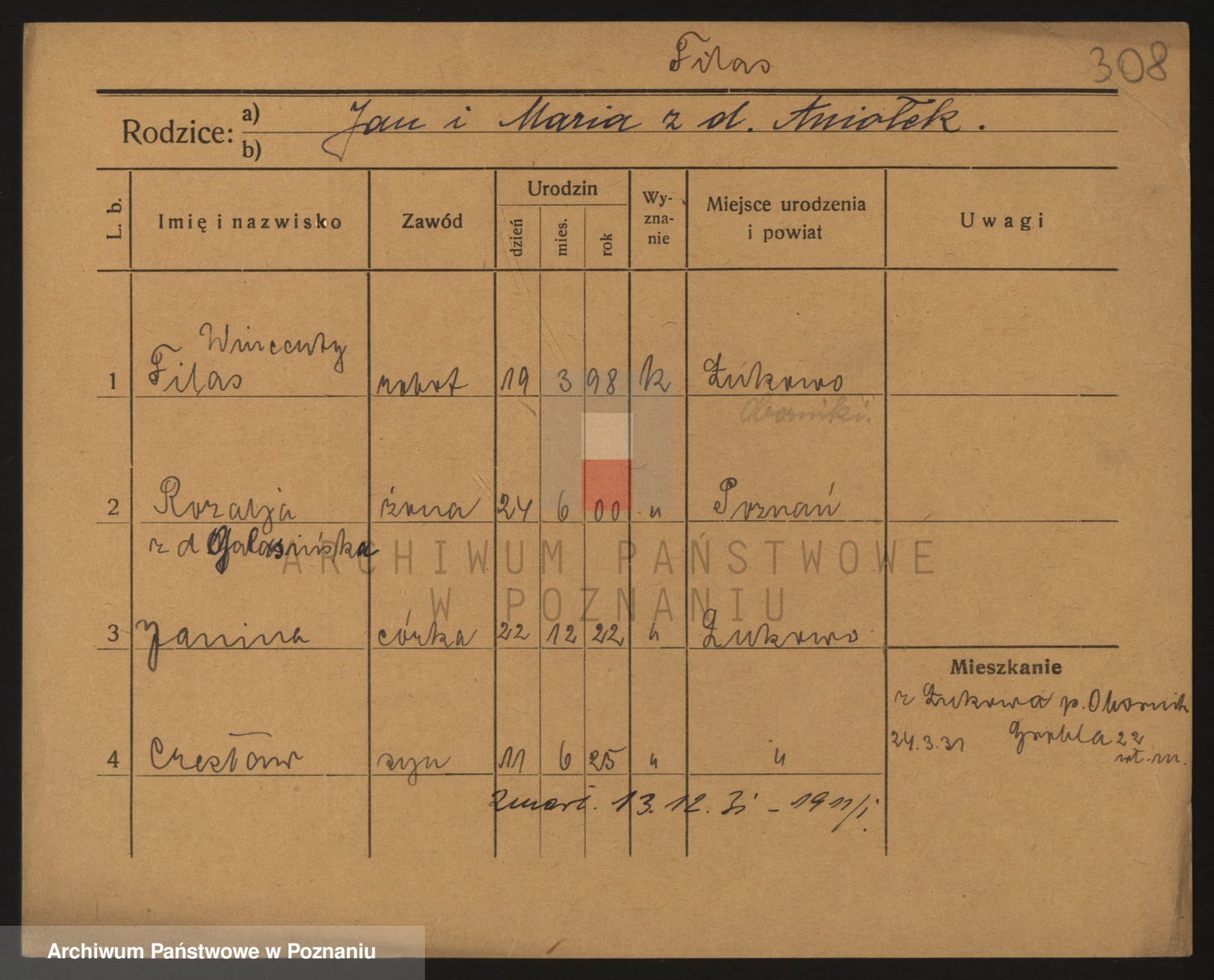 Podgląd karty osobowej dostępny jest po kliknięciu na nazwisko lub ikonkę karty. Można dokonywać powiększenia (ikony na górze) lub przechodzić między kolejnymi skanami (strzałki po bokach).