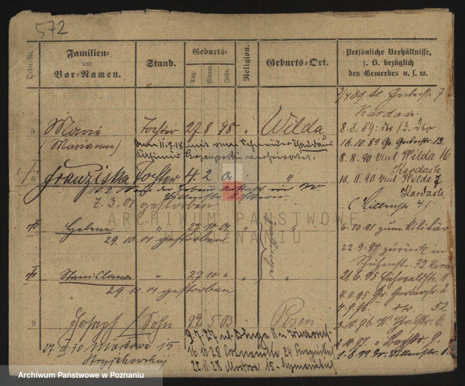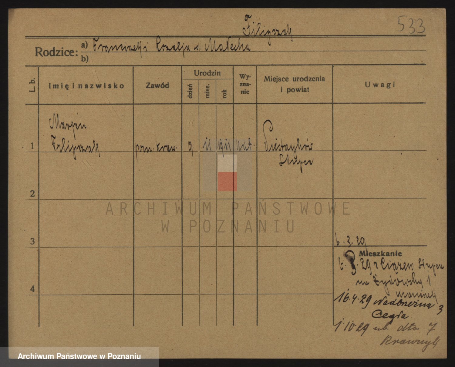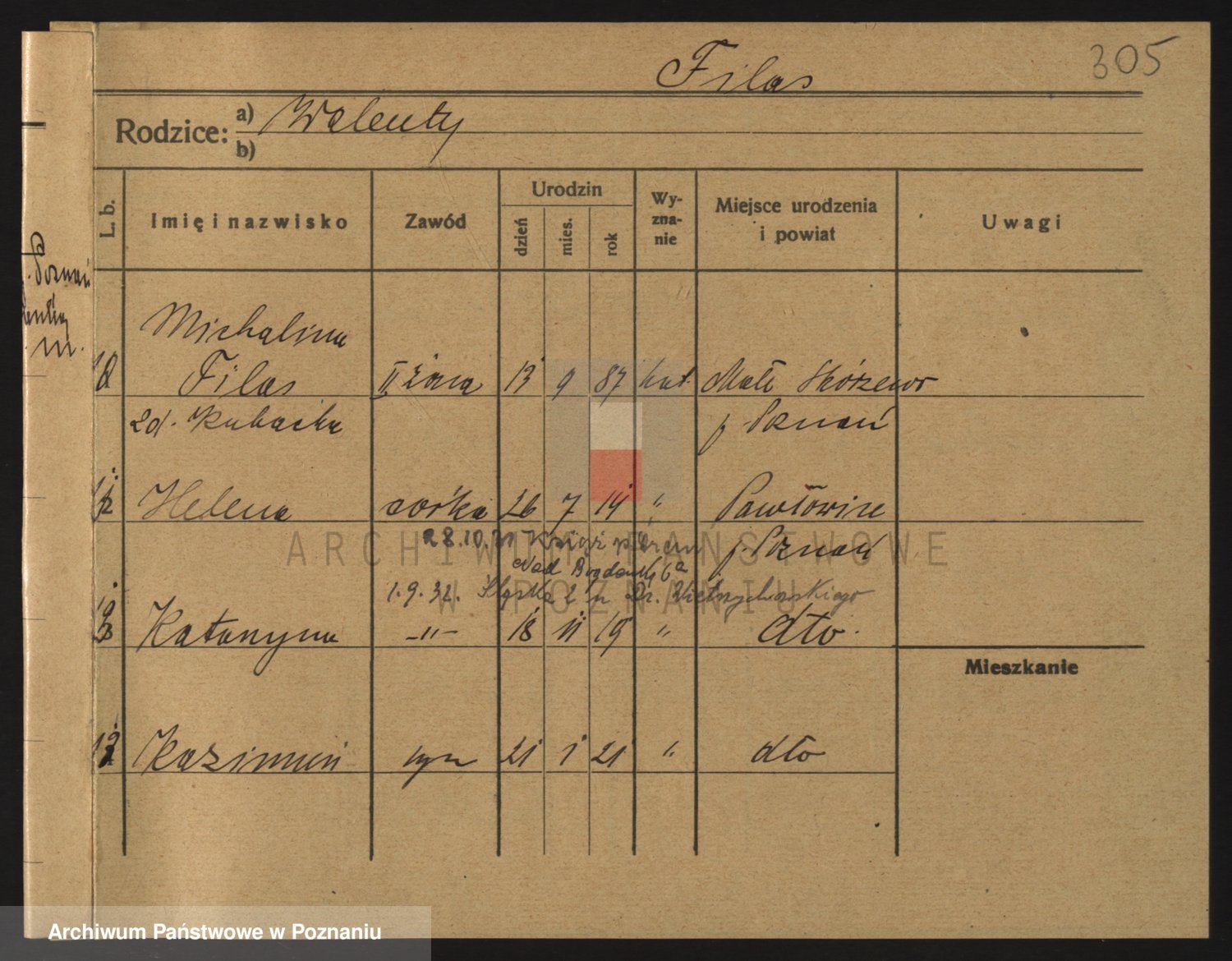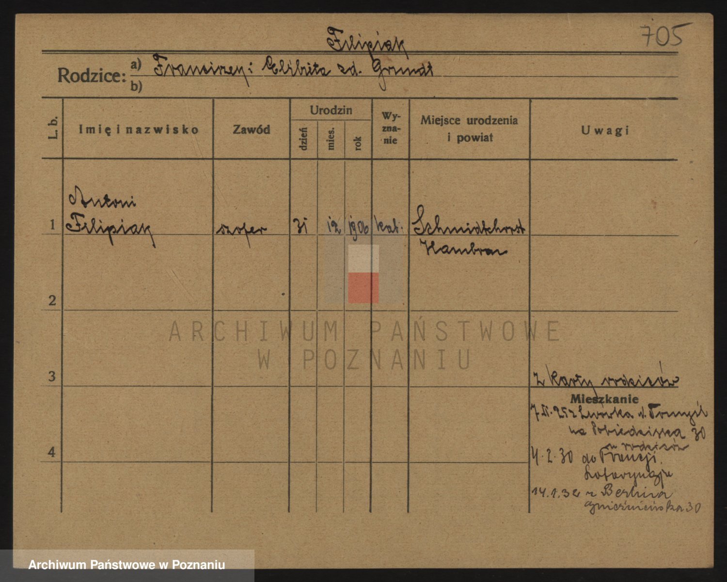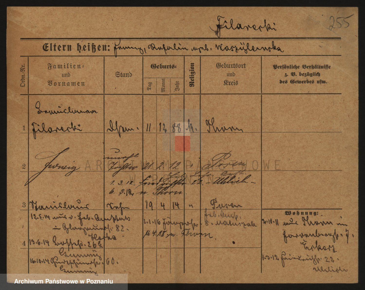 Podgląd karty osobowej dostępny jest po kliknięciu na nazwisko lub ikonkę karty. Można dokonywać powiększenia (ikony na górze) lub przechodzić między kolejnymi skanami (strzałki po bokach).