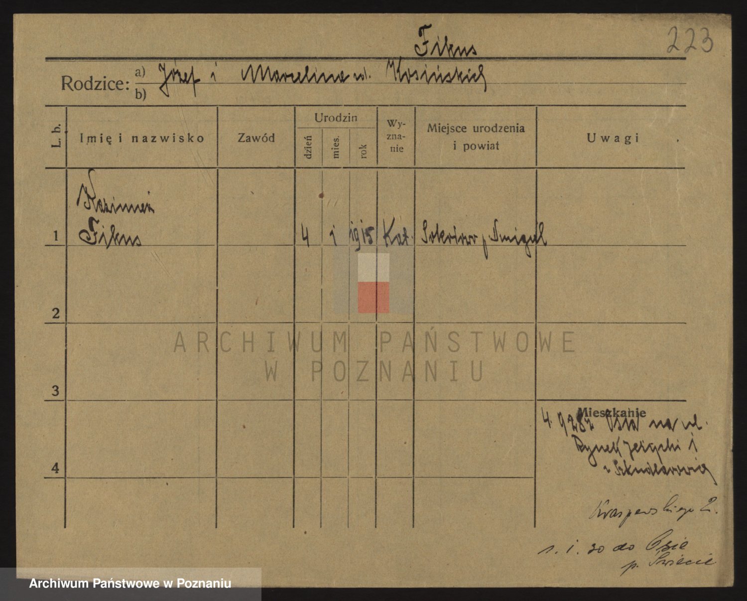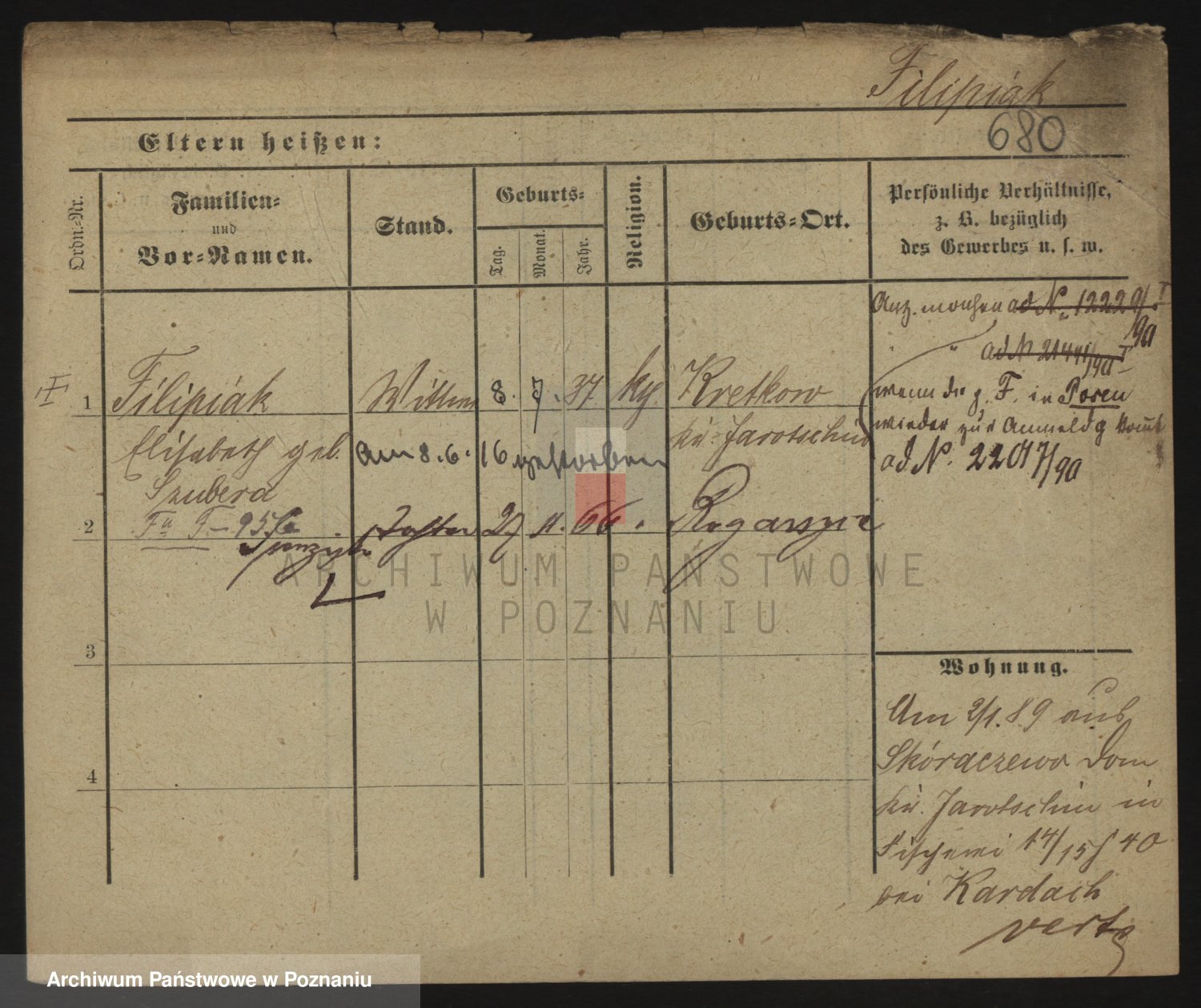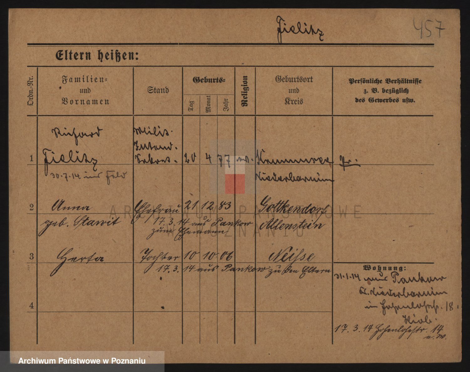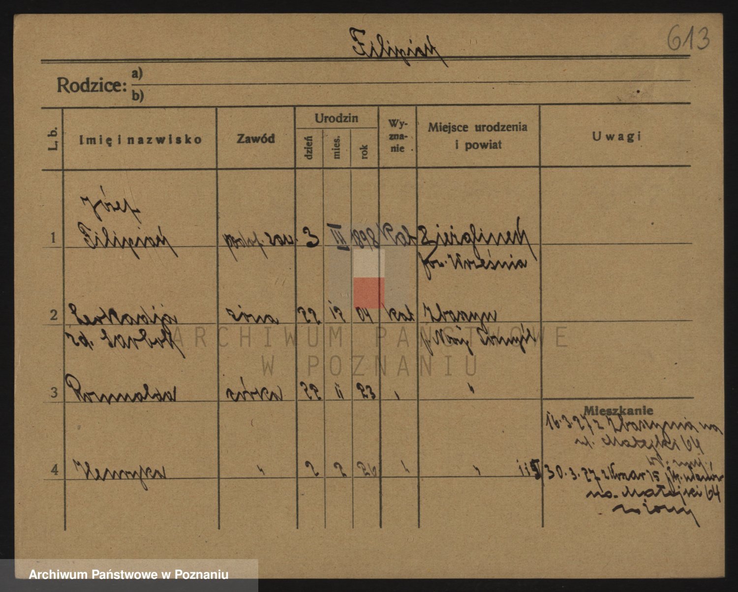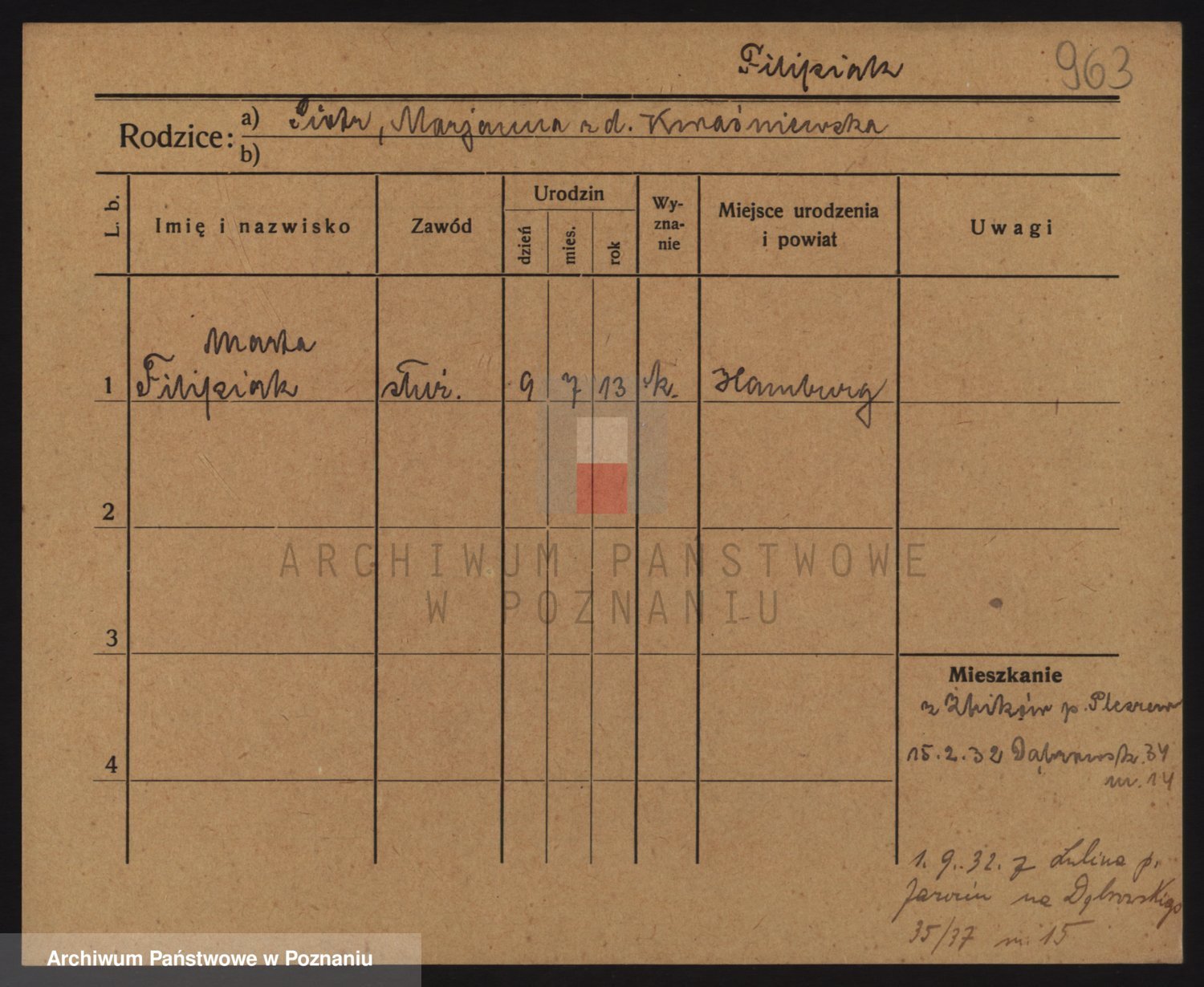 Podgląd karty osobowej dostępny jest po kliknięciu na nazwisko lub ikonkę karty. Można dokonywać powiększenia (ikony na górze) lub przechodzić między kolejnymi skanami (strzałki po bokach).