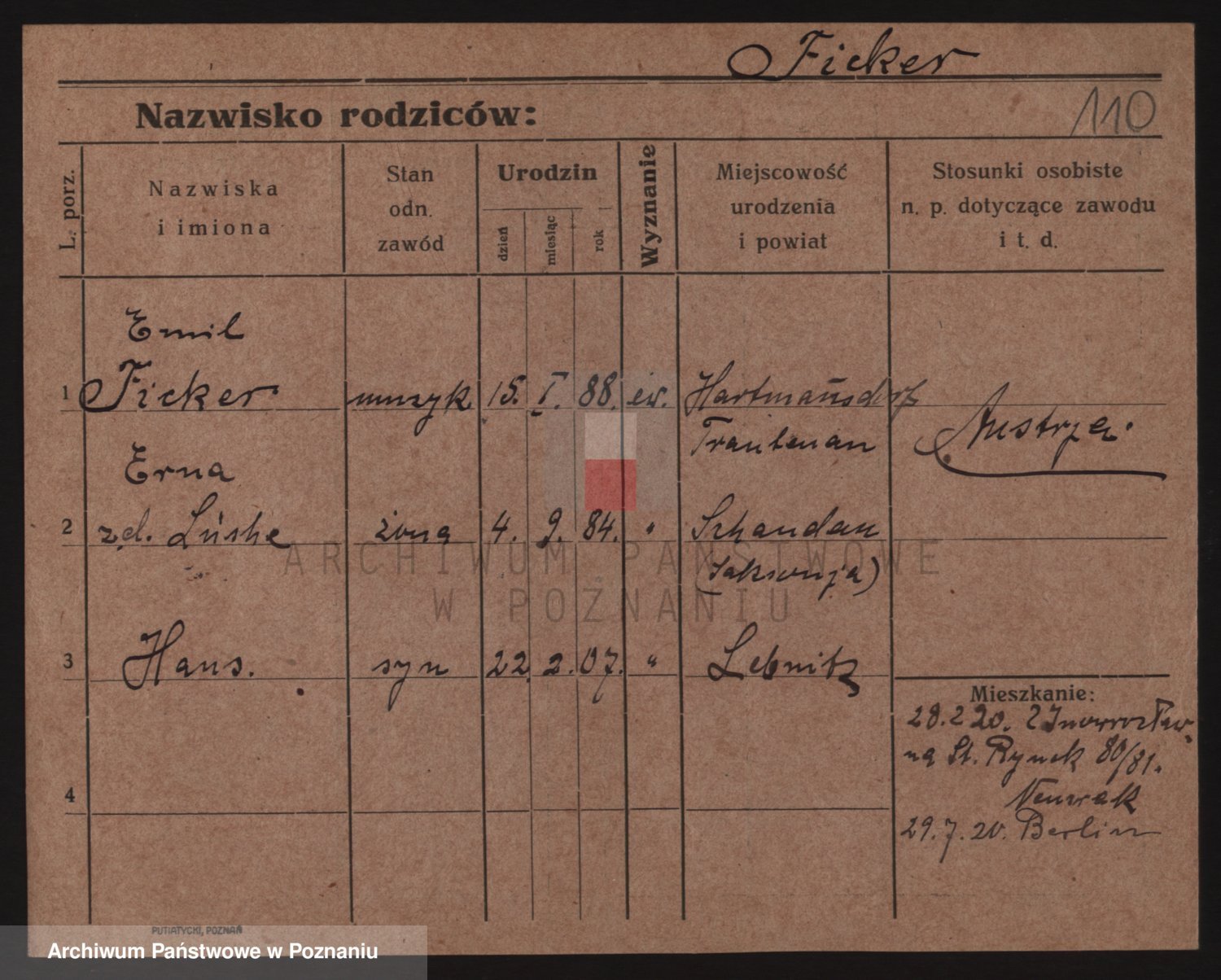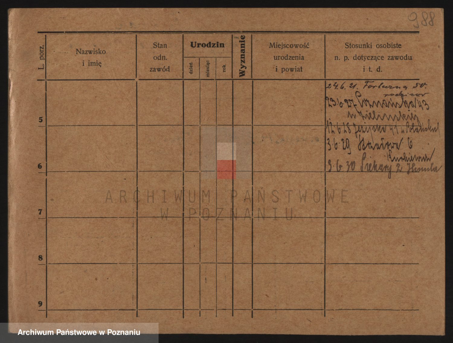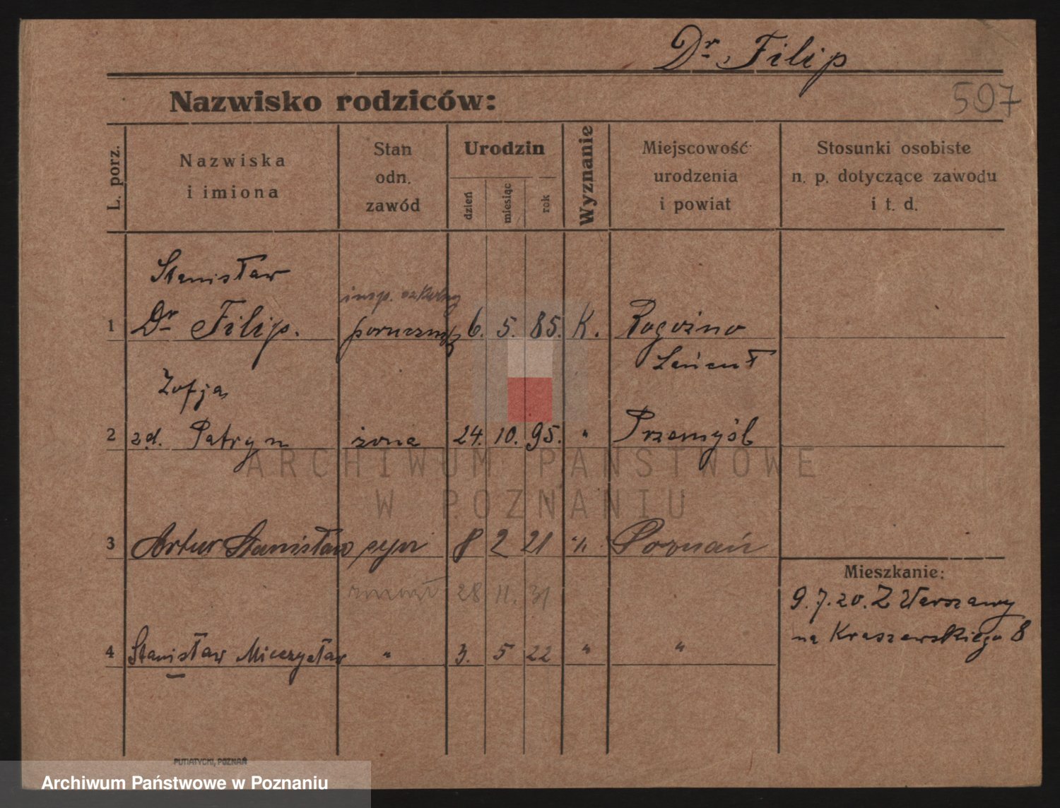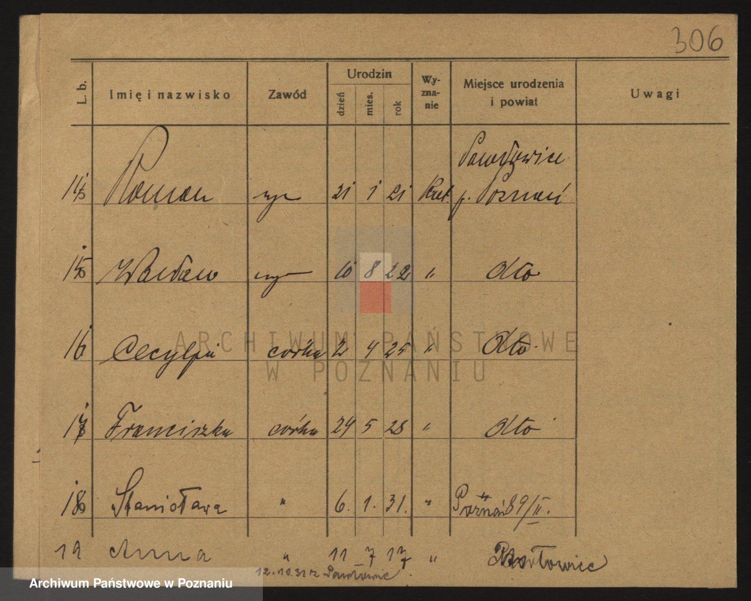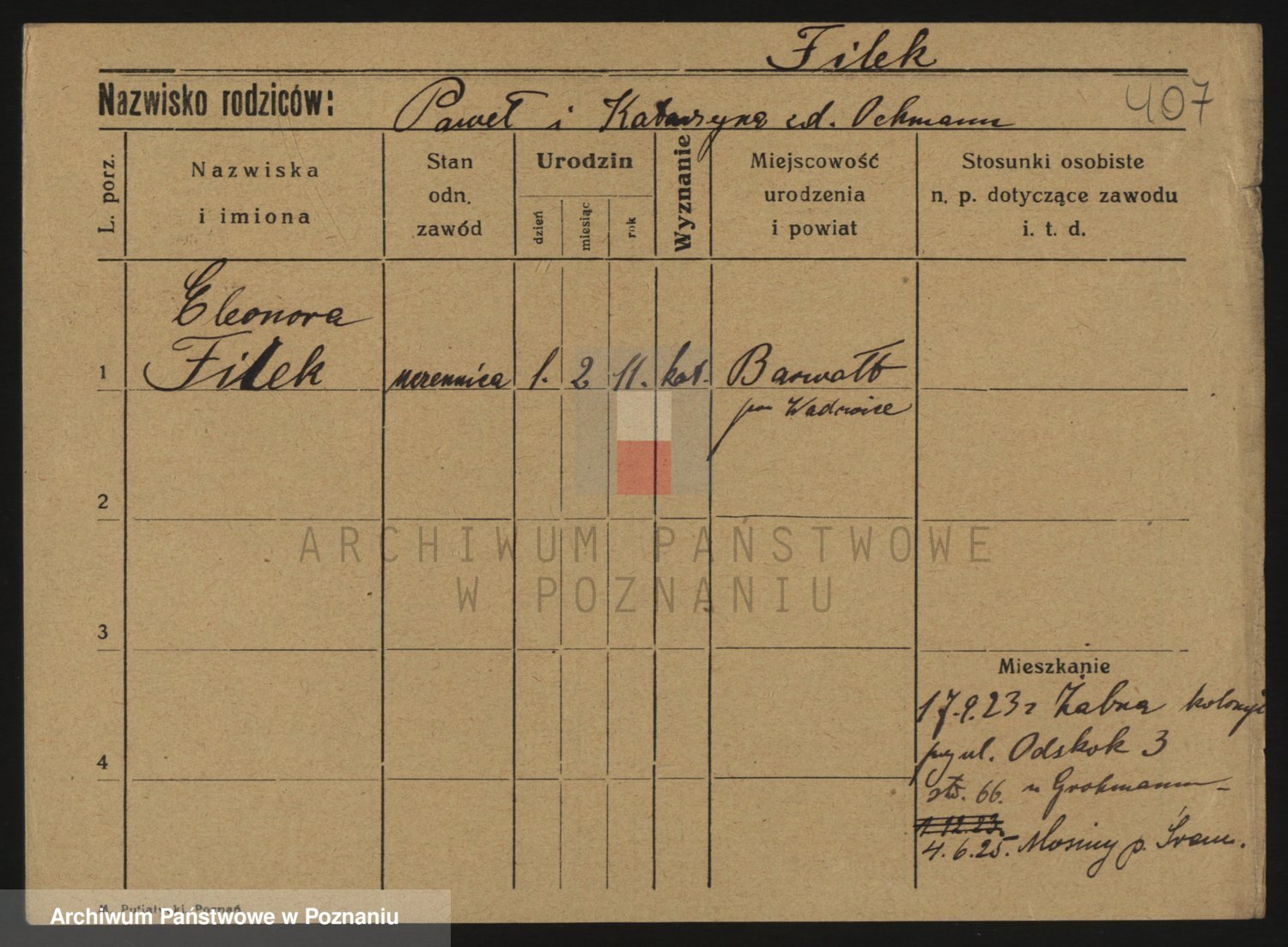 Podgląd karty osobowej dostępny jest po kliknięciu na nazwisko lub ikonkę karty. Można dokonywać powiększenia (ikony na górze) lub przechodzić między kolejnymi skanami (strzałki po bokach).