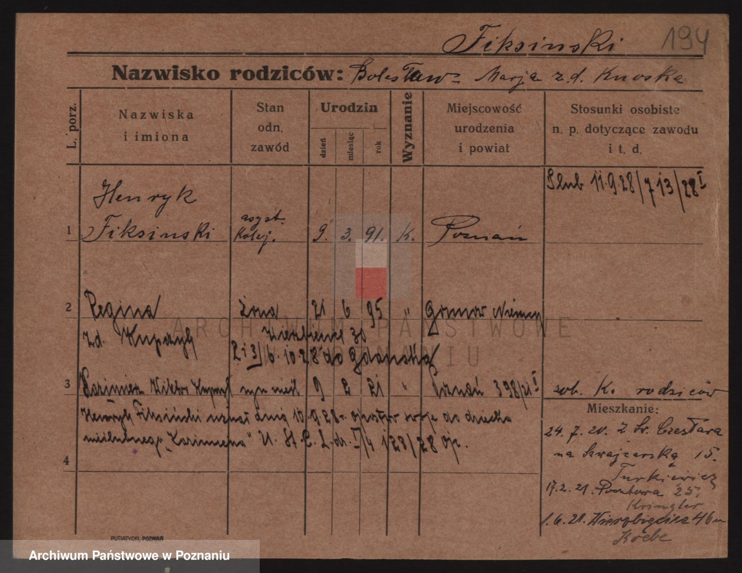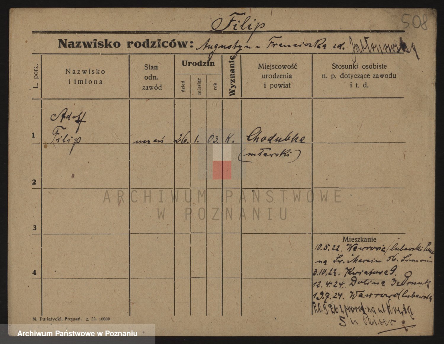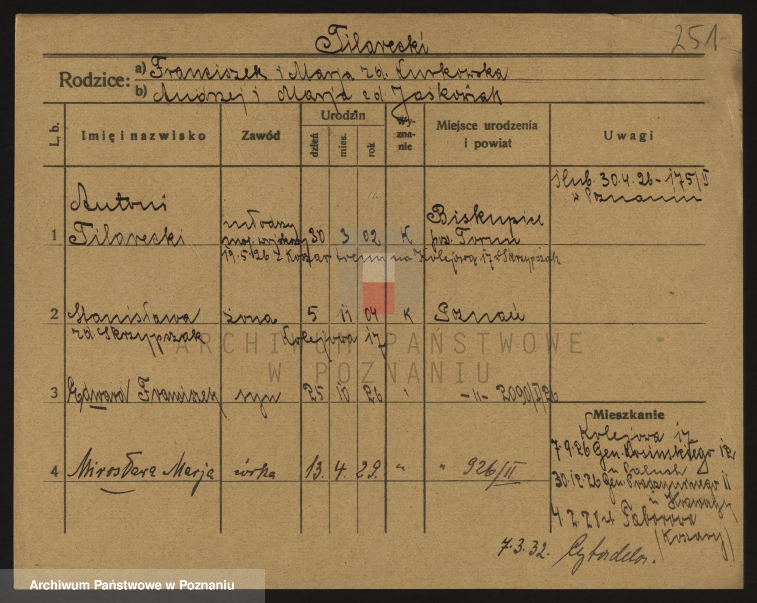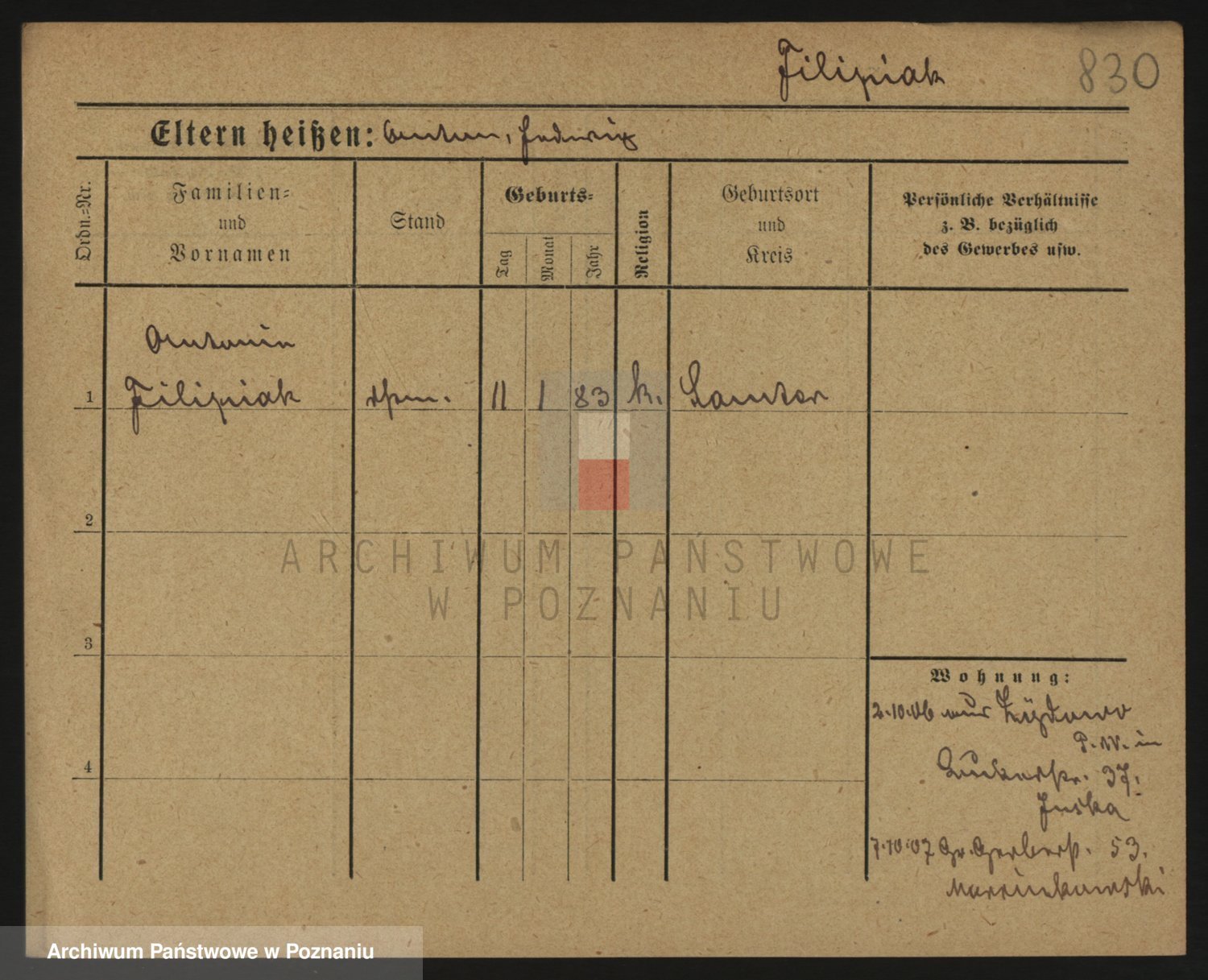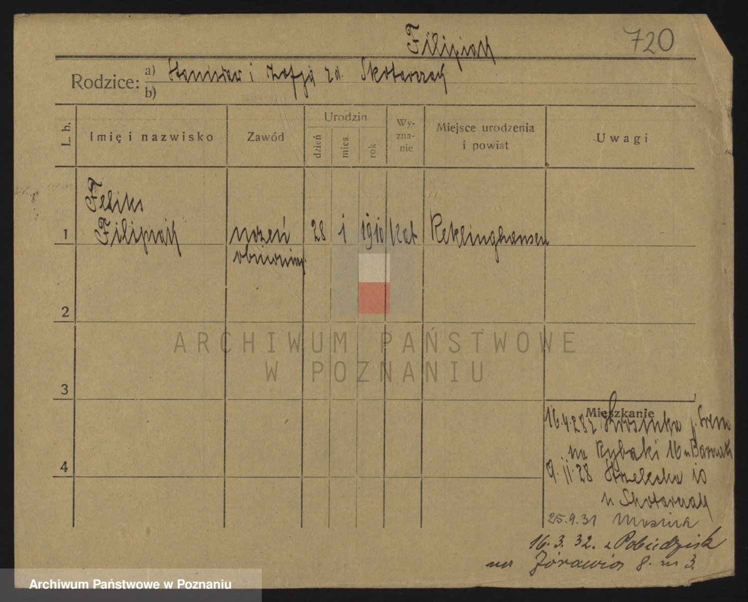 Podgląd karty osobowej dostępny jest po kliknięciu na nazwisko lub ikonkę karty. Można dokonywać powiększenia (ikony na górze) lub przechodzić między kolejnymi skanami (strzałki po bokach).