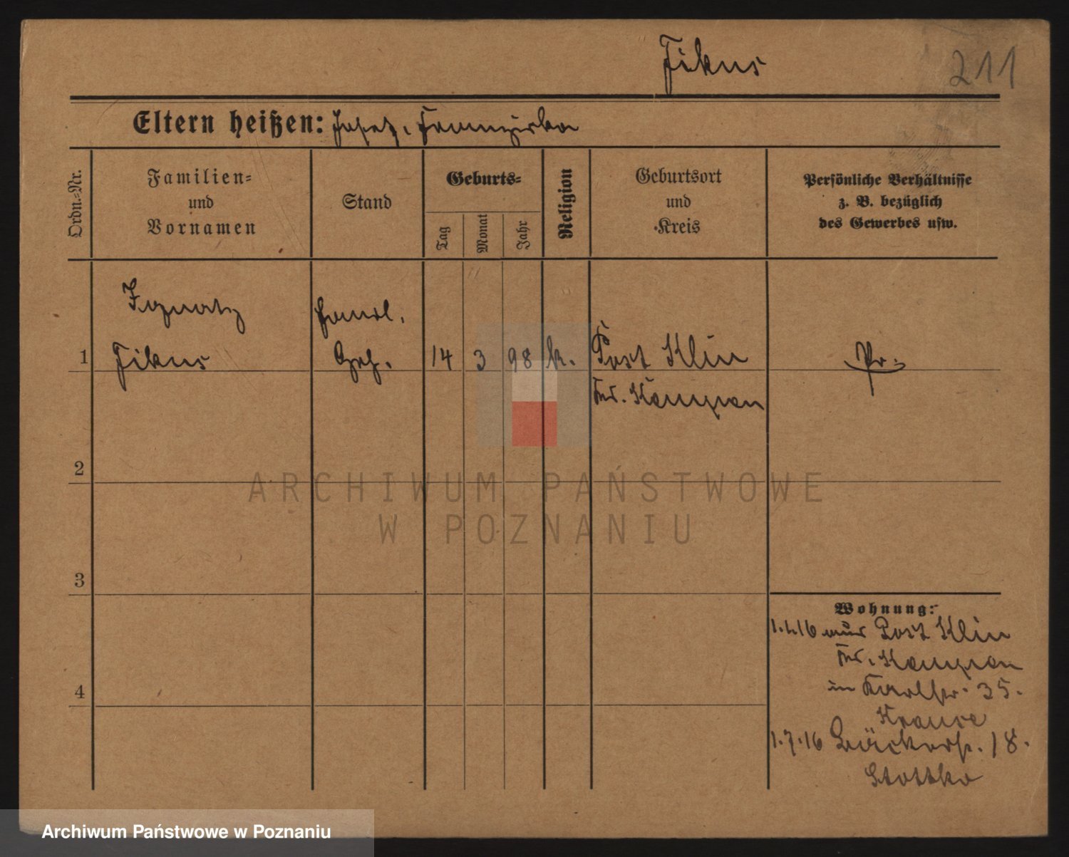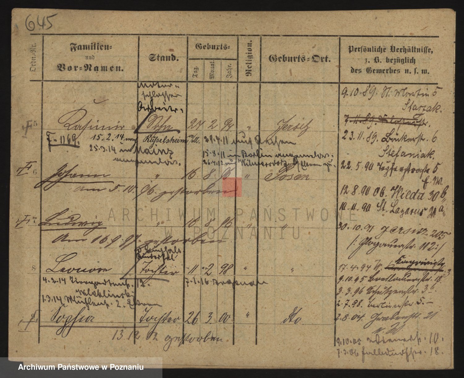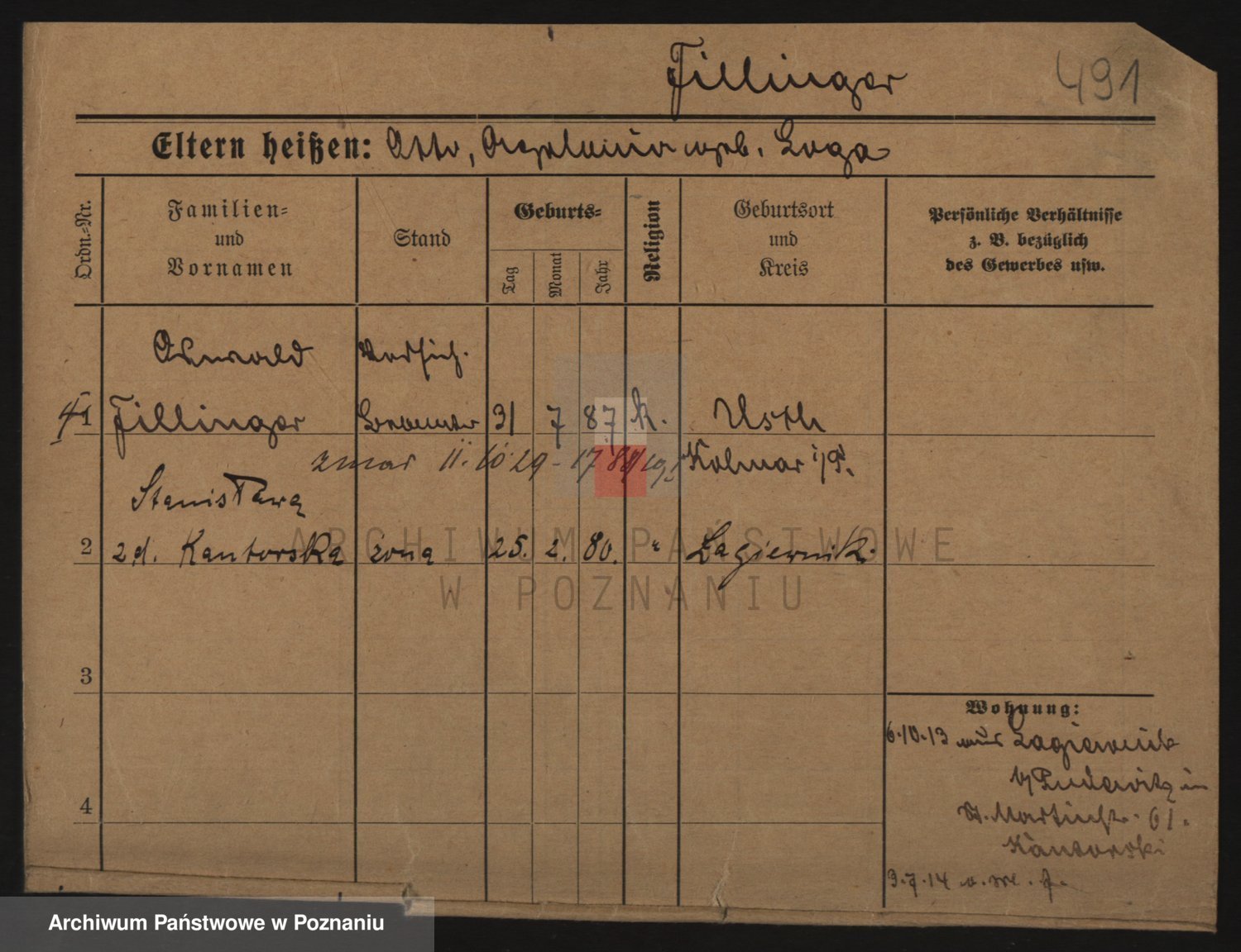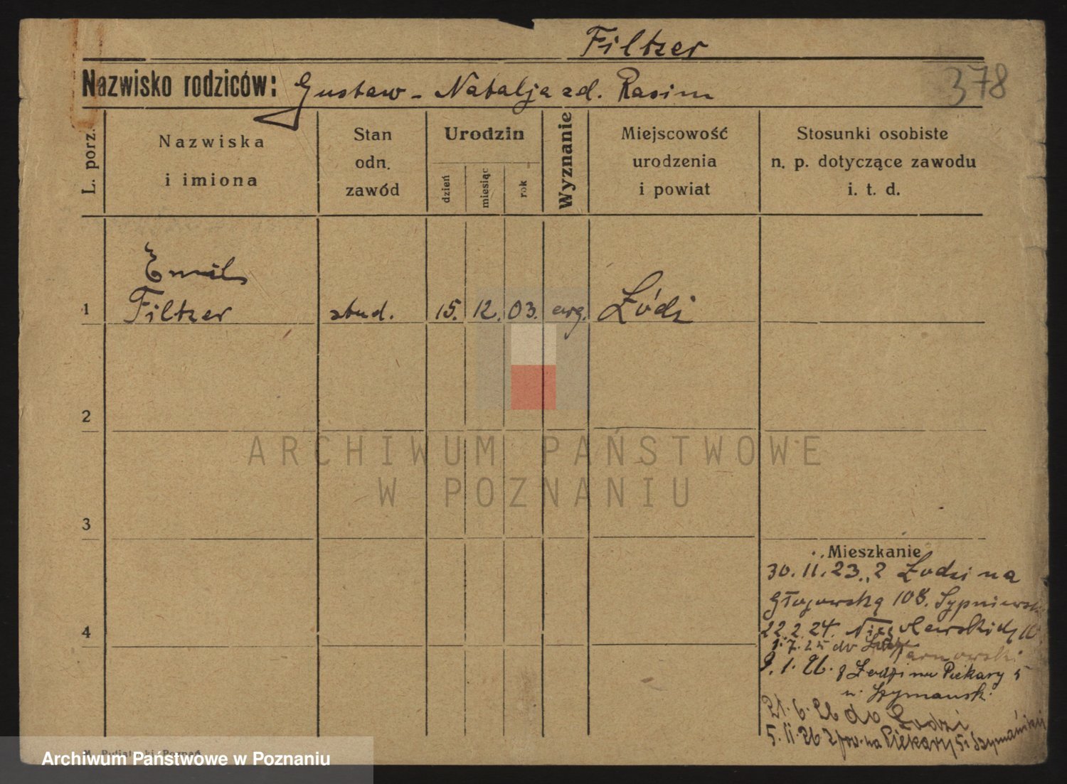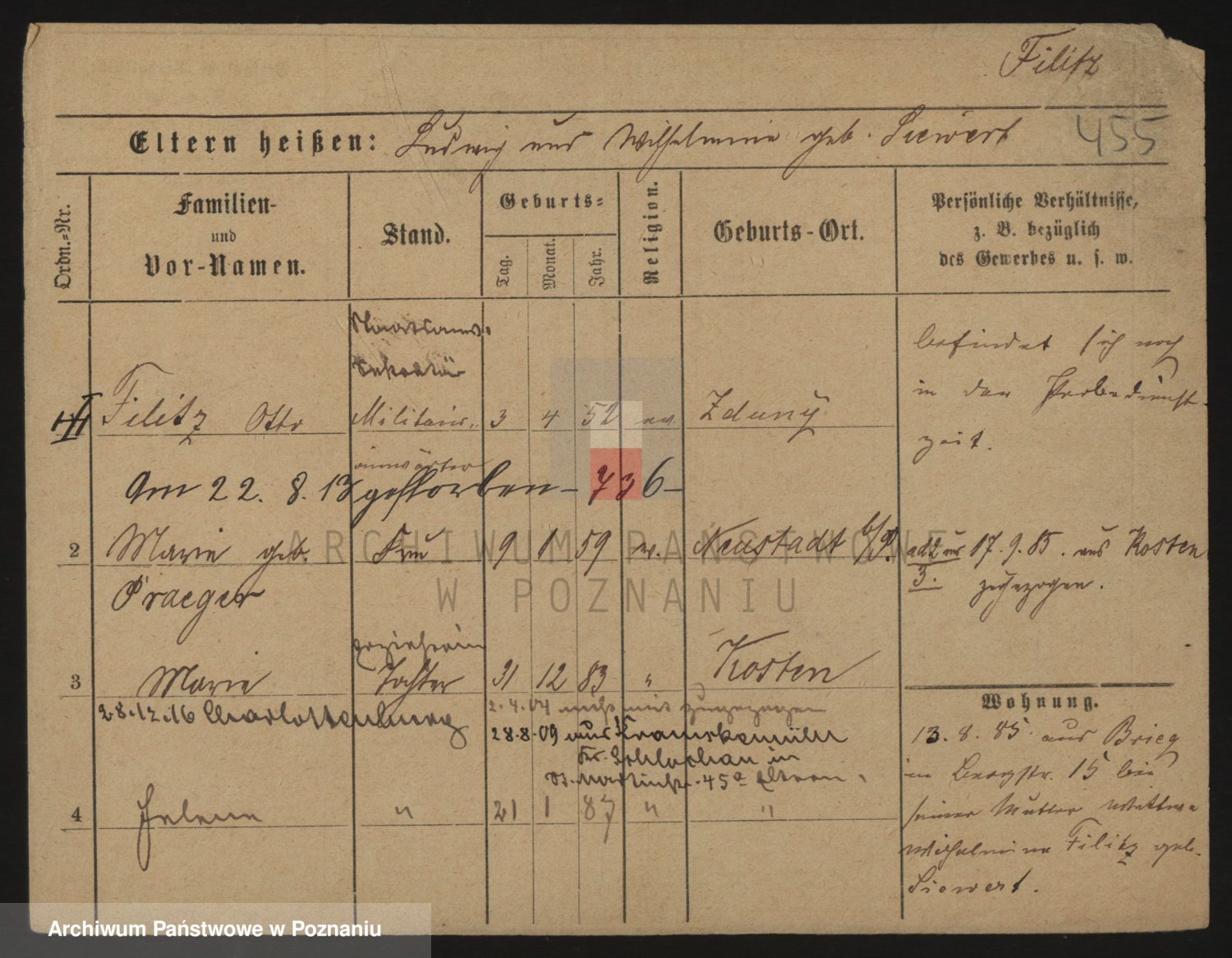Podgląd karty osobowej dostępny jest po kliknięciu na nazwisko lub ikonkę karty. Można dokonywać powiększenia (ikony na górze) lub przechodzić między kolejnymi skanami (strzałki po bokach).
