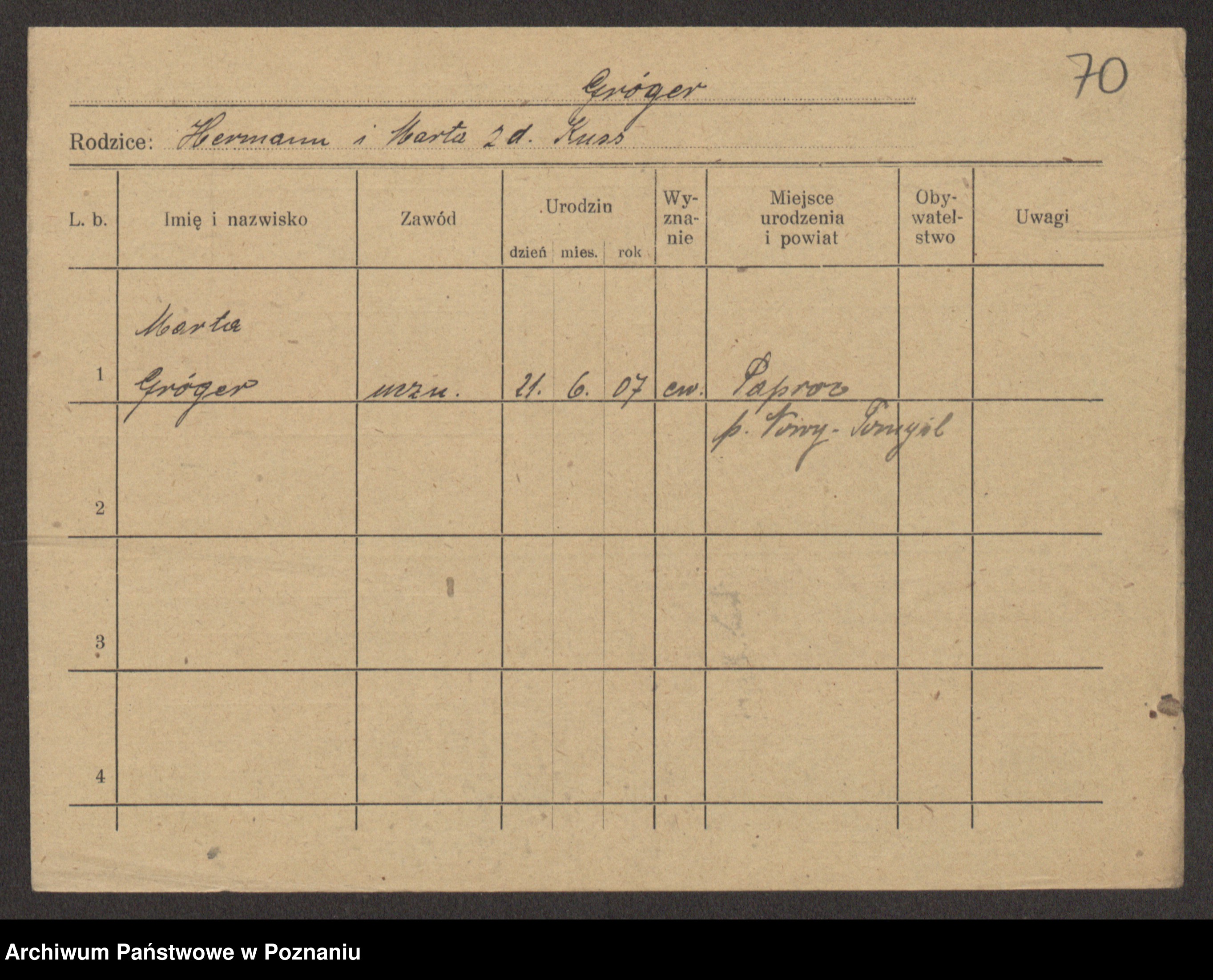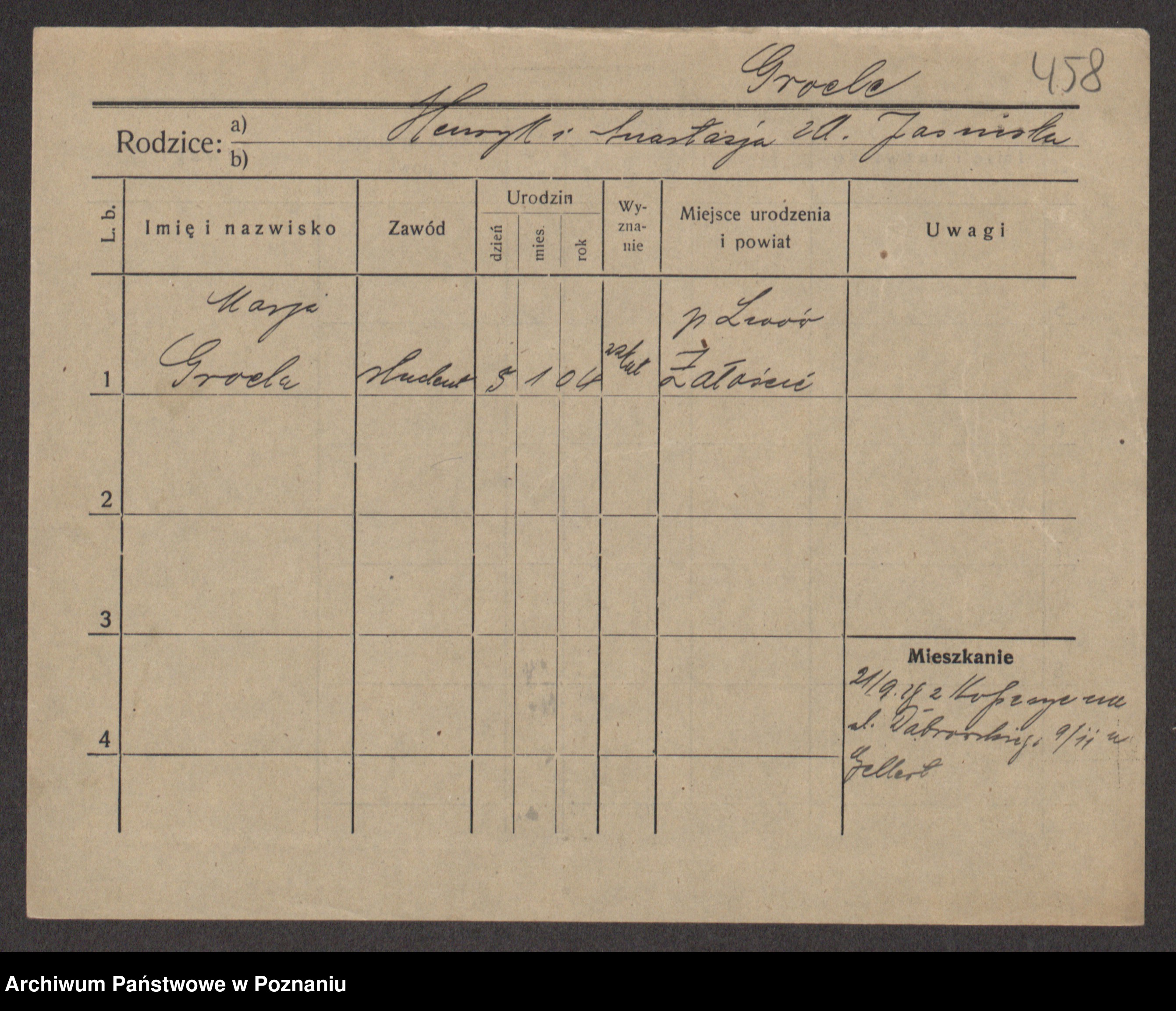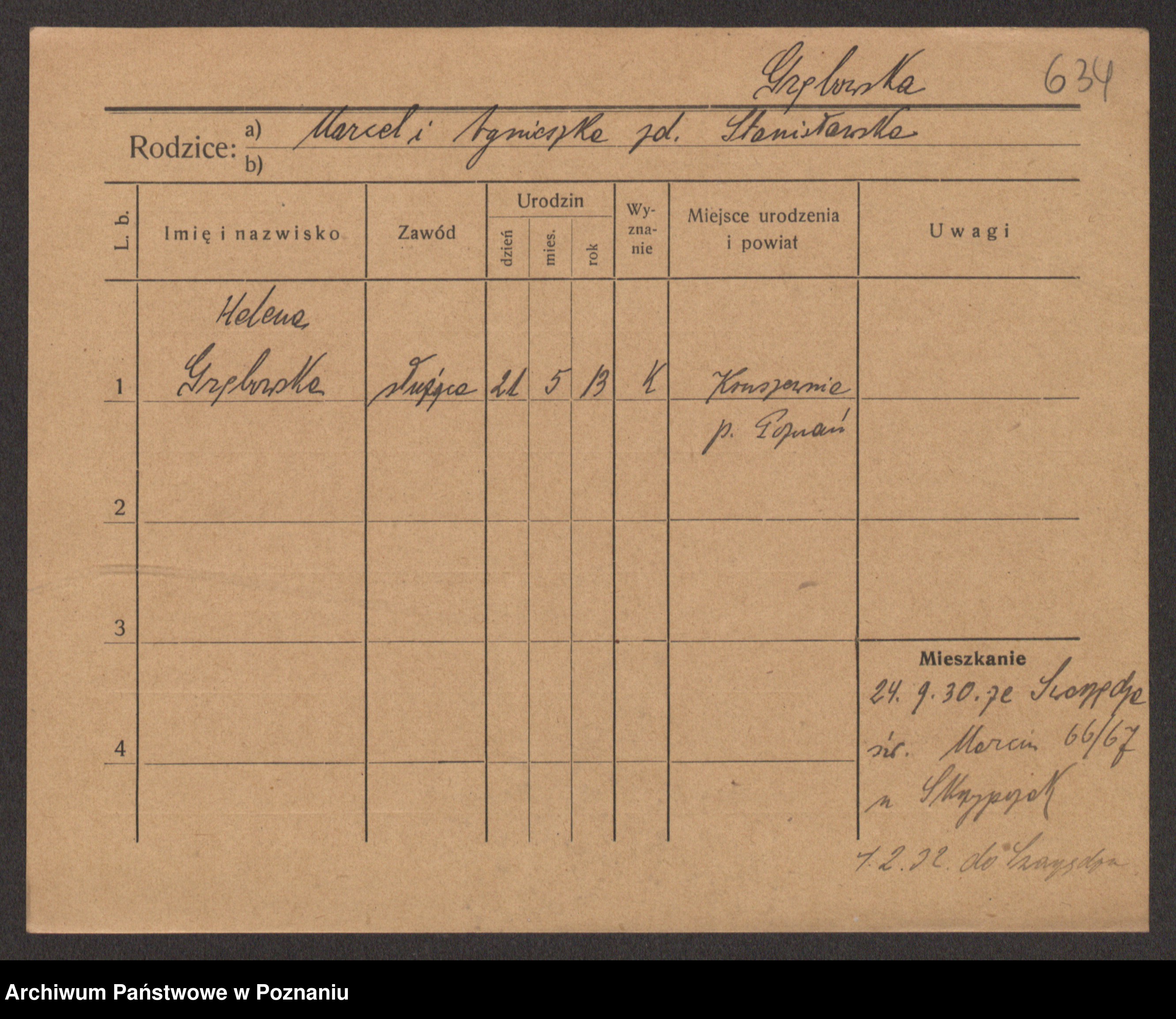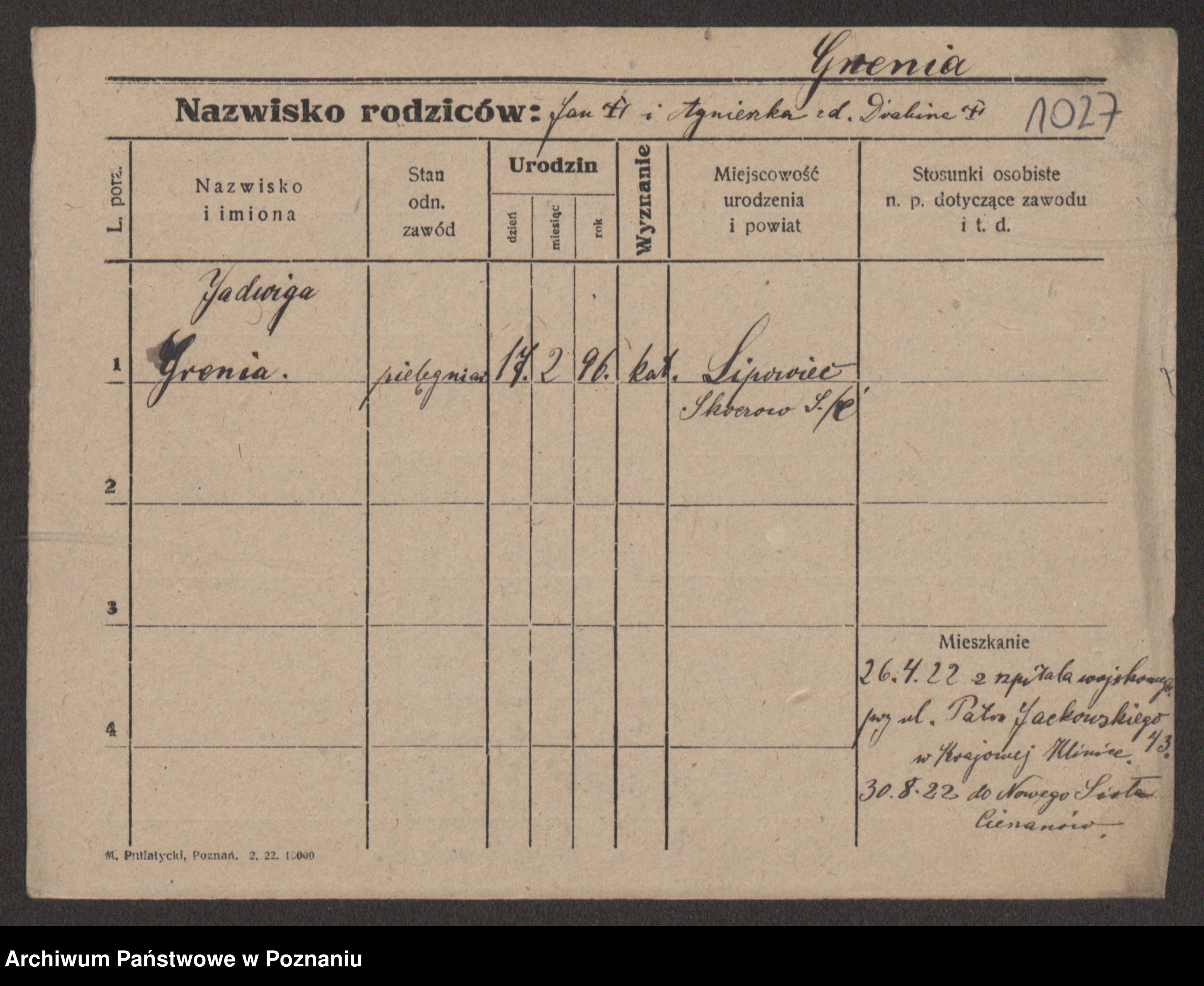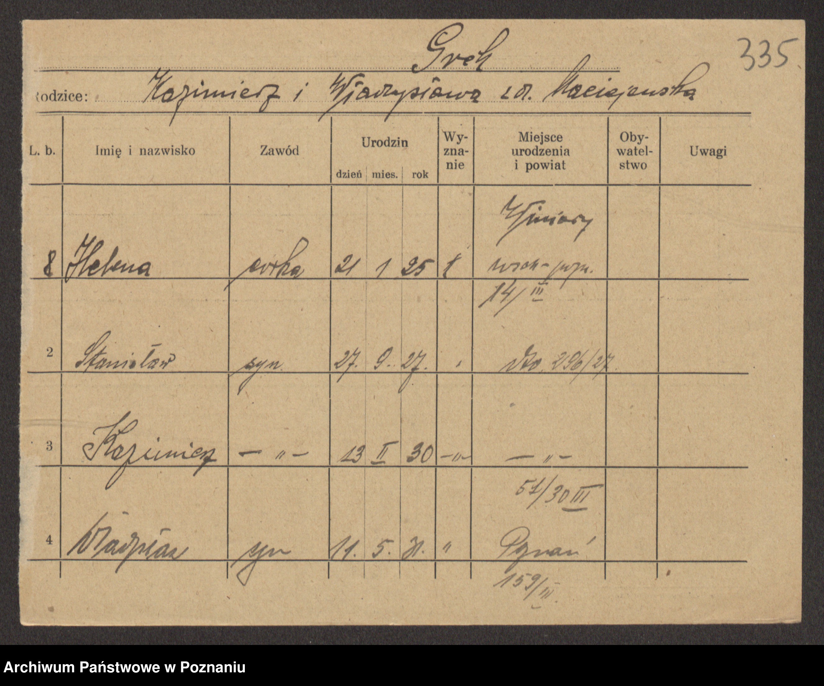 Podgląd karty osobowej dostępny jest po kliknięciu na nazwisko lub ikonkę karty. Można dokonywać powiększenia (ikony na górze) lub przechodzić między kolejnymi skanami (strzałki po bokach).