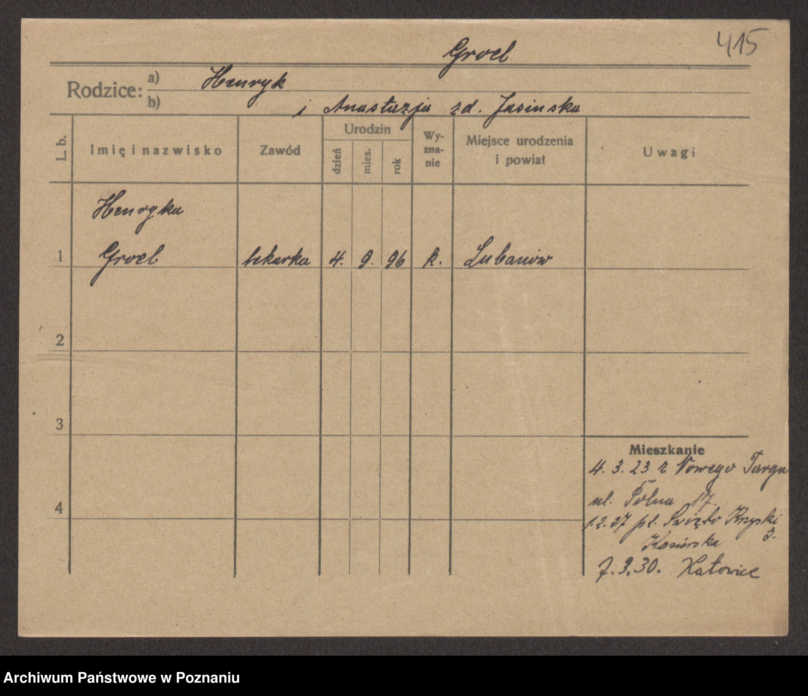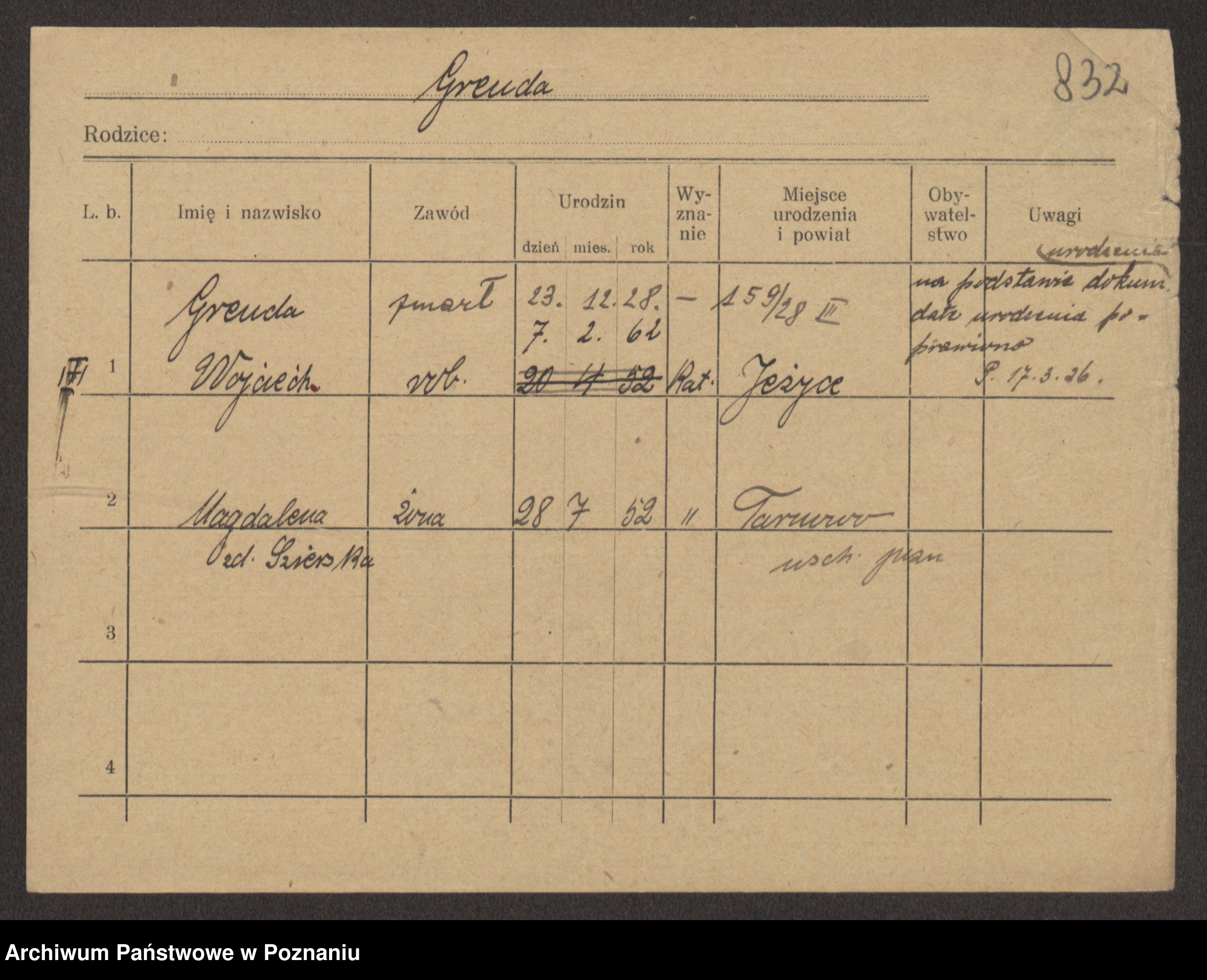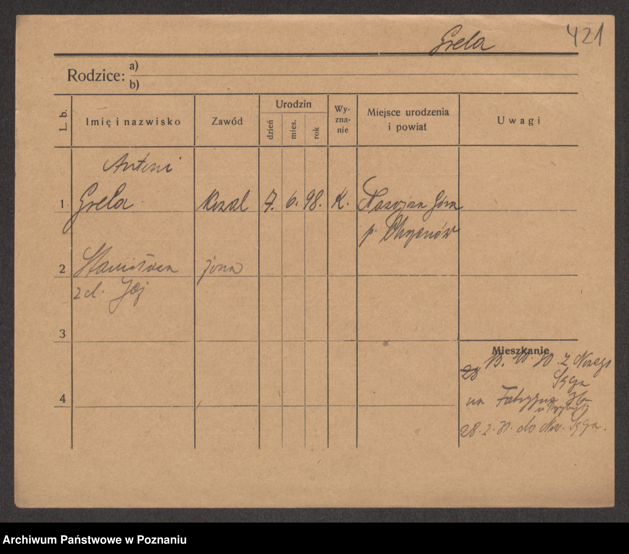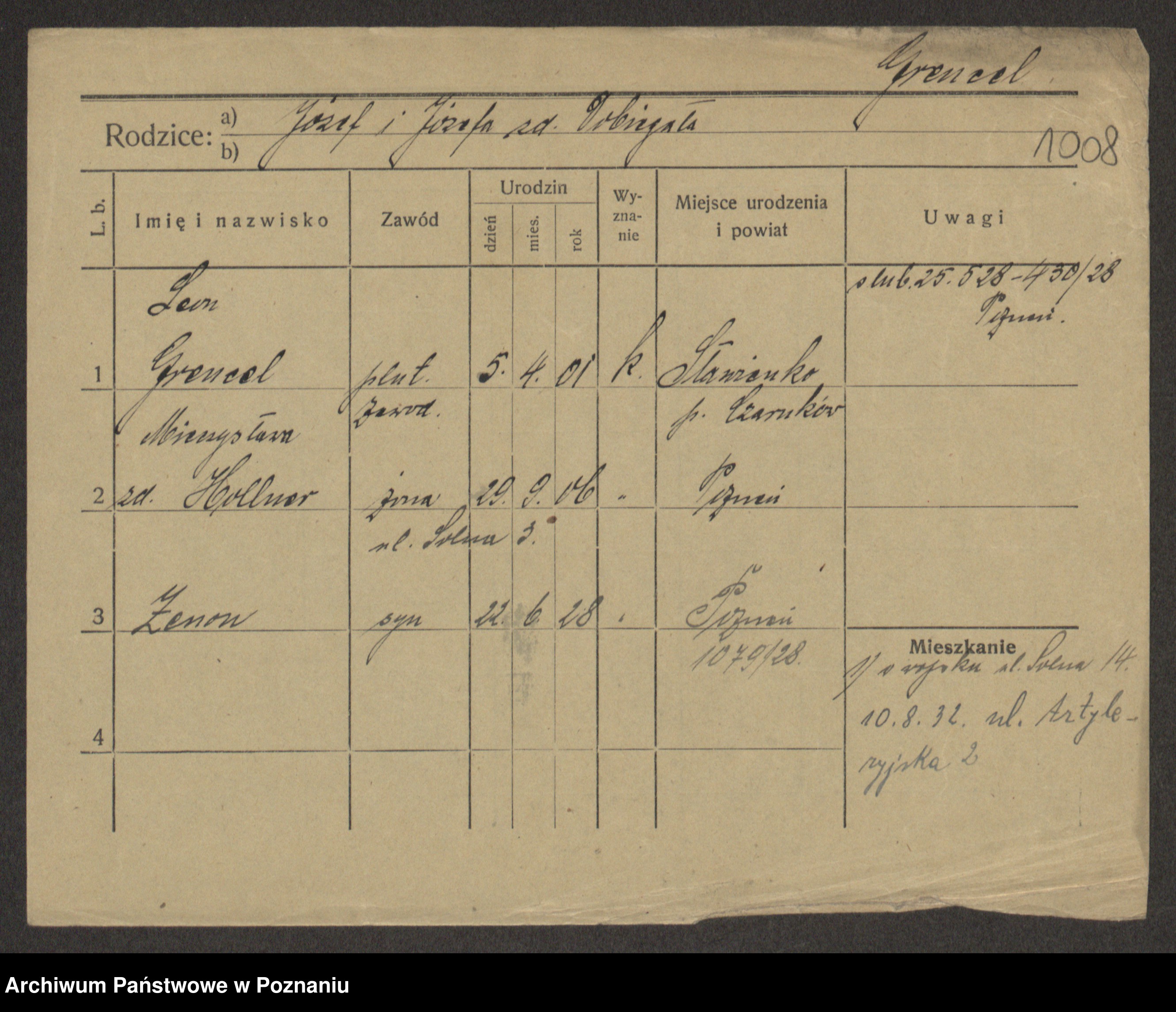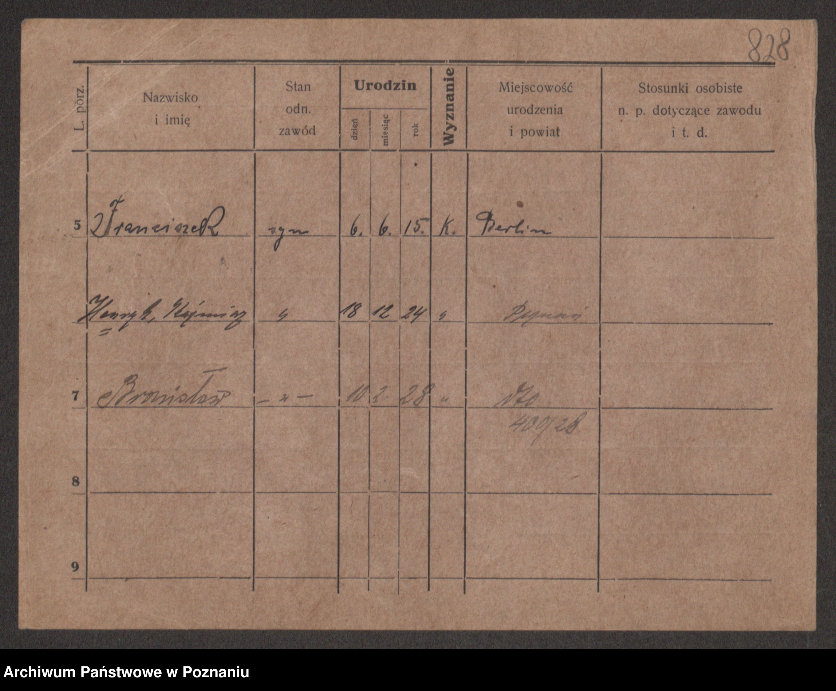 Podgląd karty osobowej dostępny jest po kliknięciu na nazwisko lub ikonkę karty. Można dokonywać powiększenia (ikony na górze) lub przechodzić między kolejnymi skanami (strzałki po bokach).