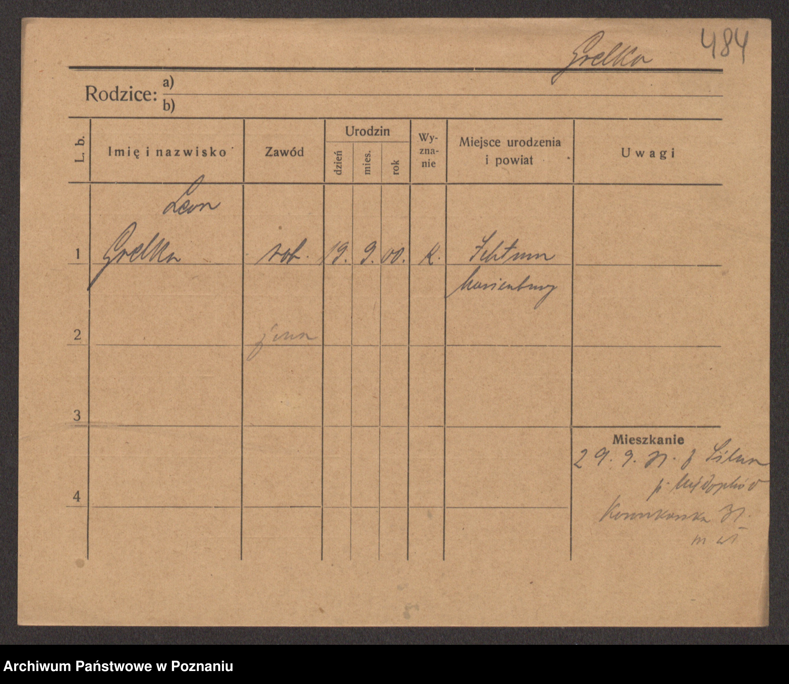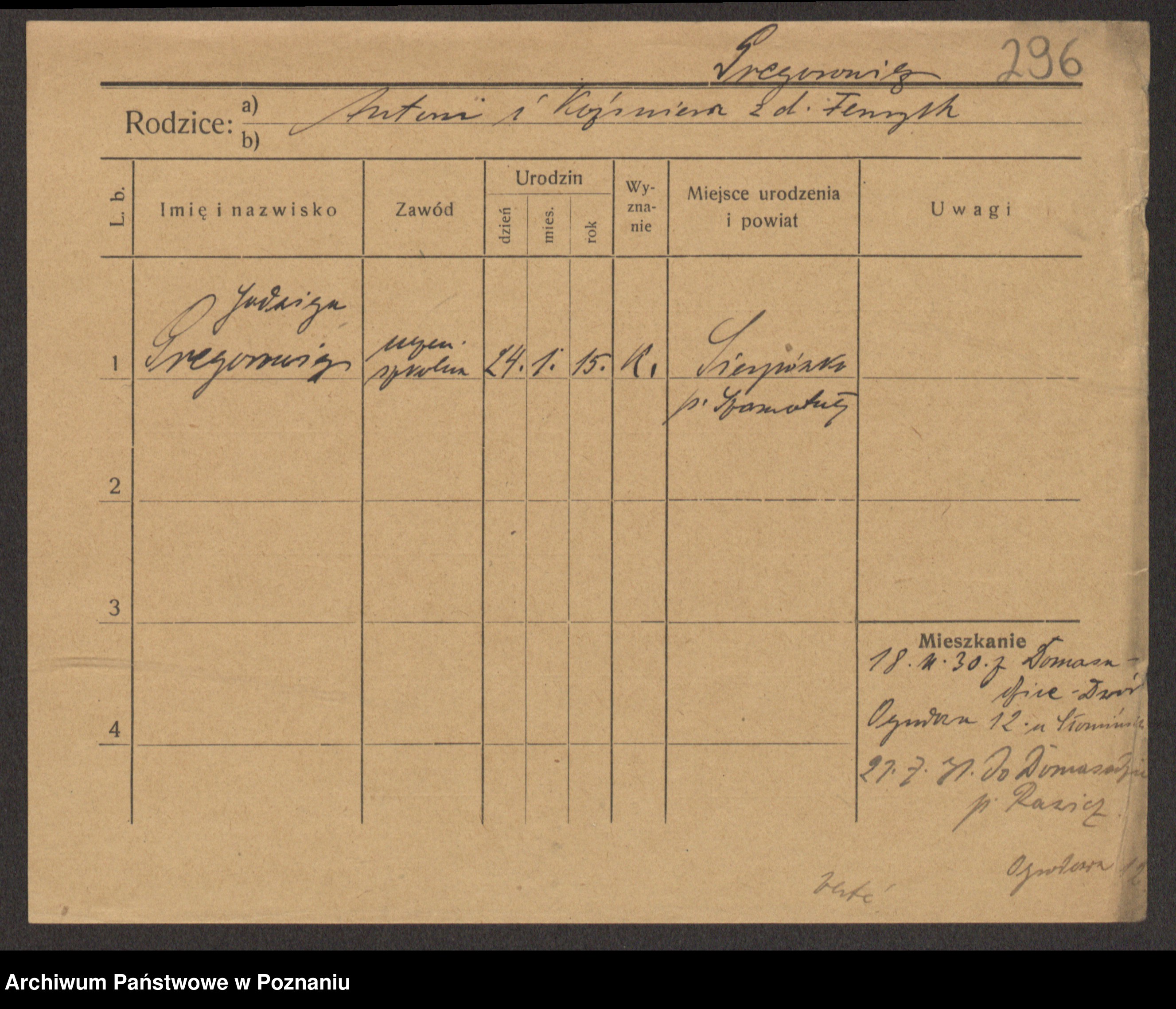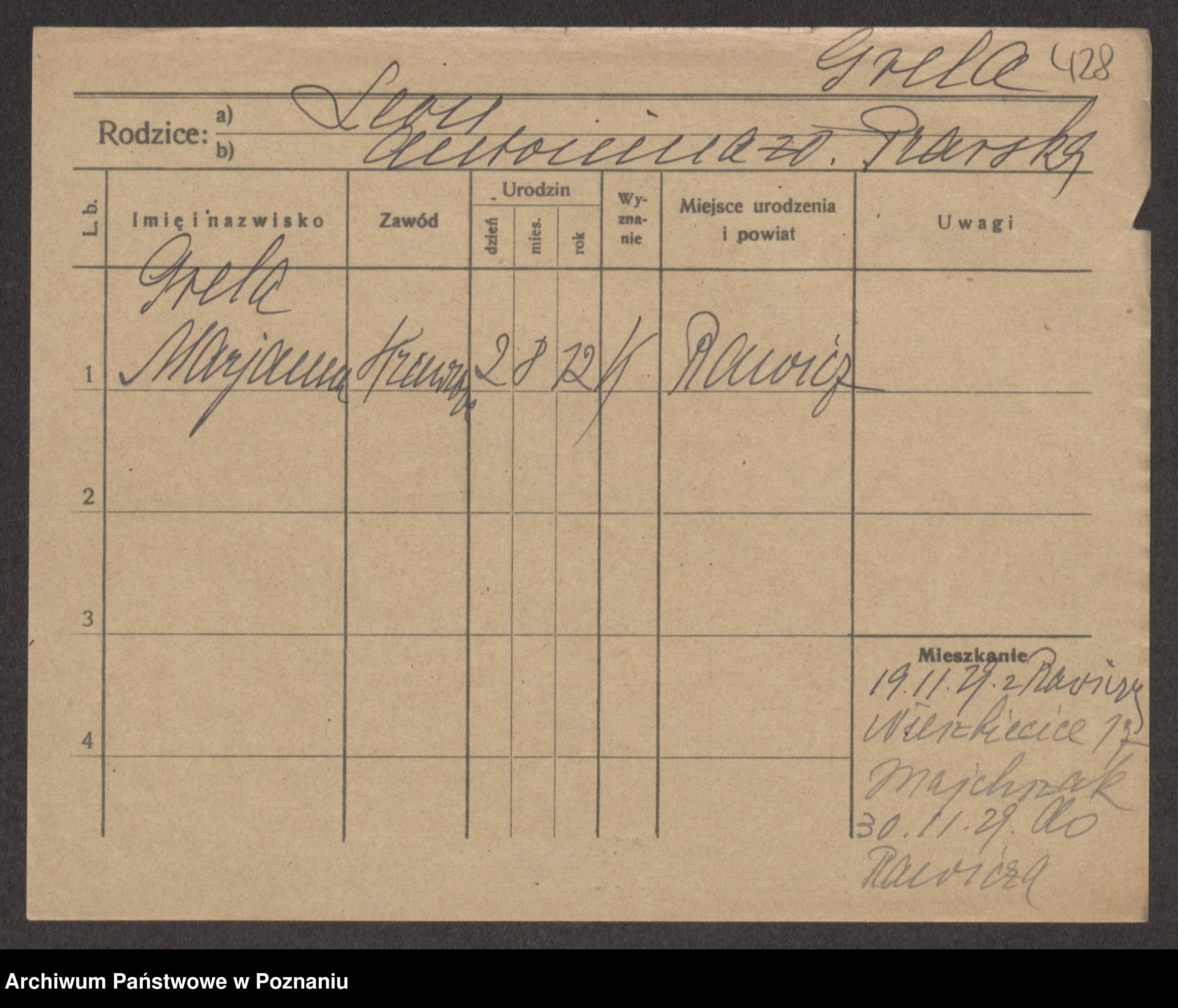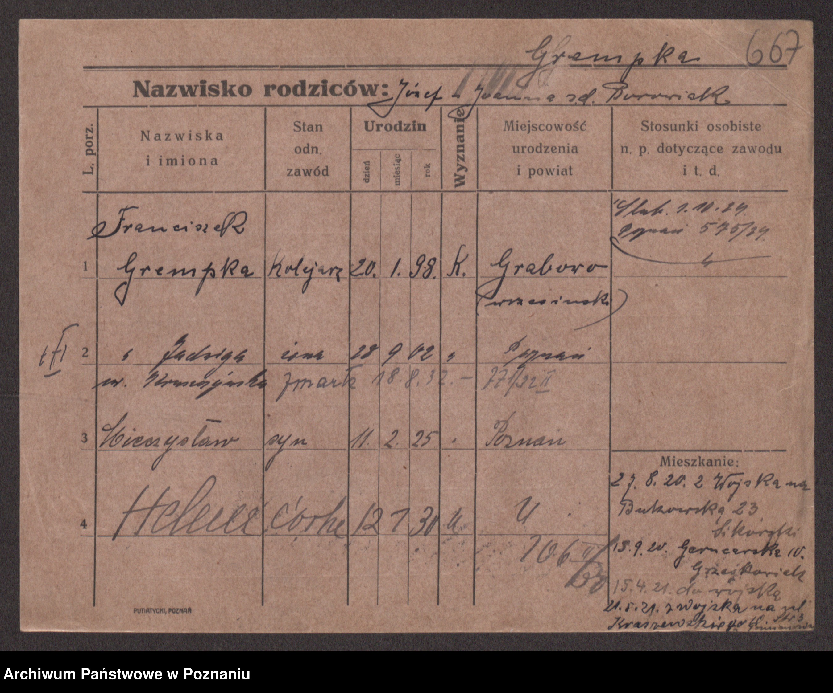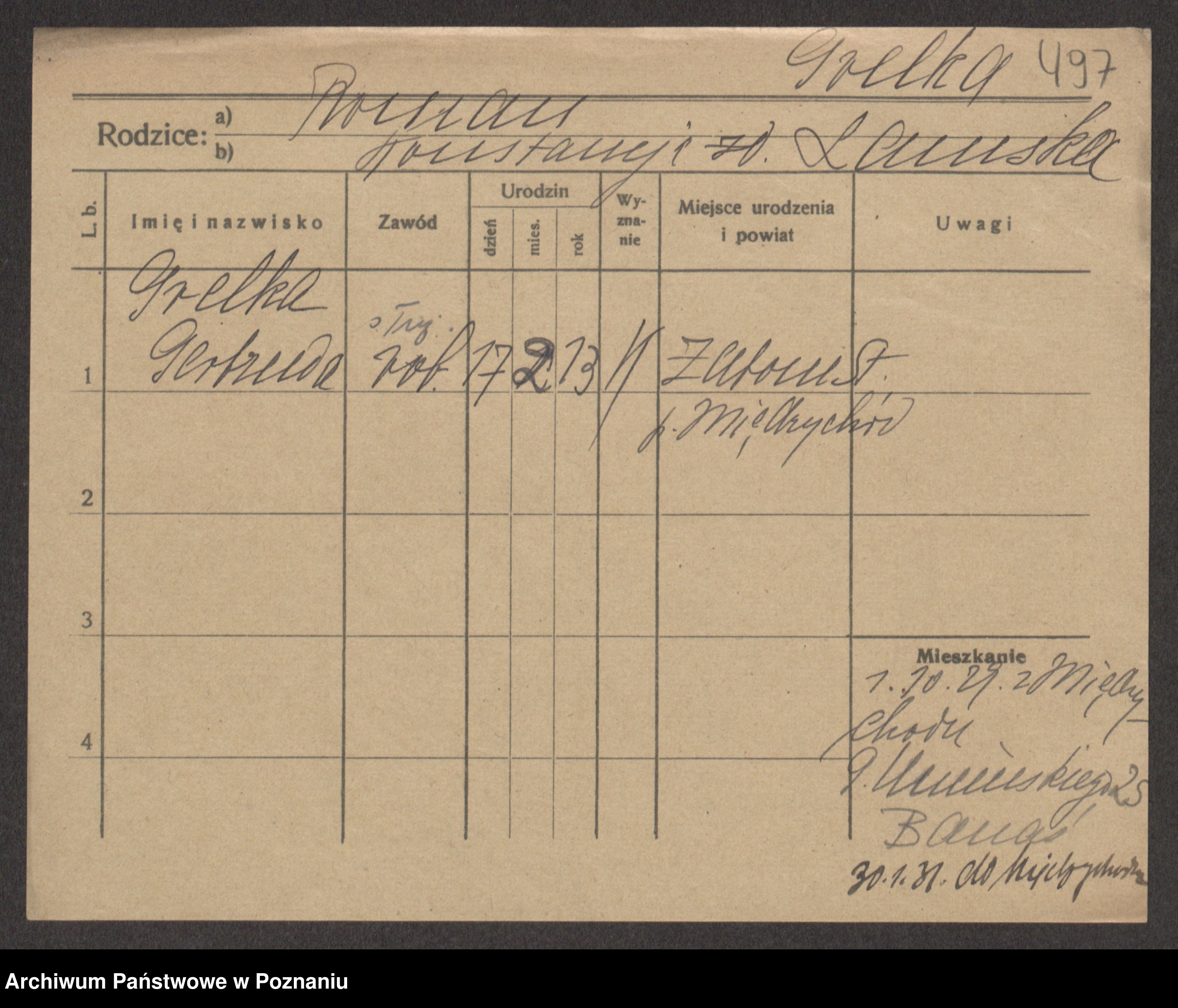 Podgląd karty osobowej dostępny jest po kliknięciu na nazwisko lub ikonkę karty. Można dokonywać powiększenia (ikony na górze) lub przechodzić między kolejnymi skanami (strzałki po bokach).