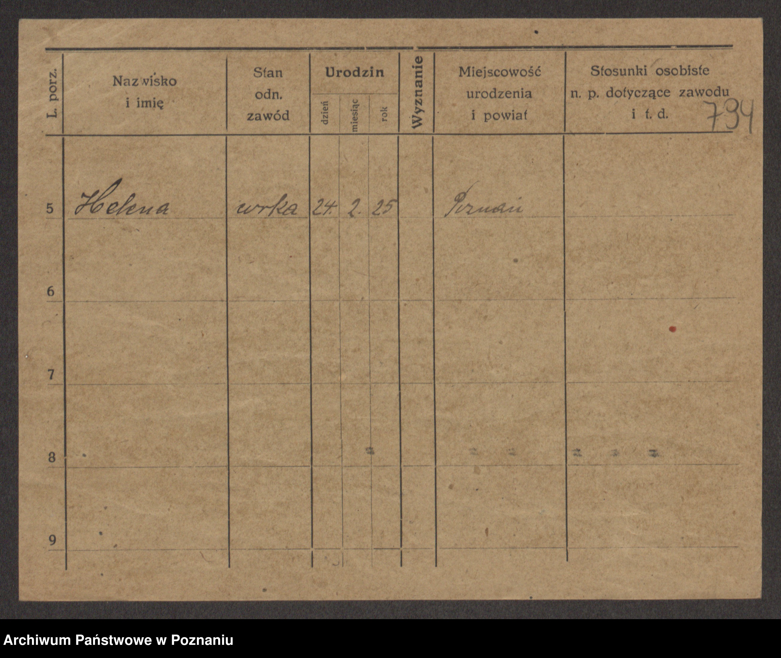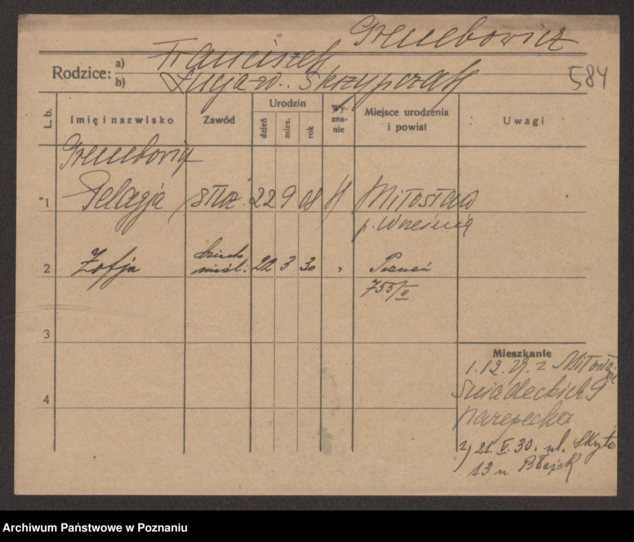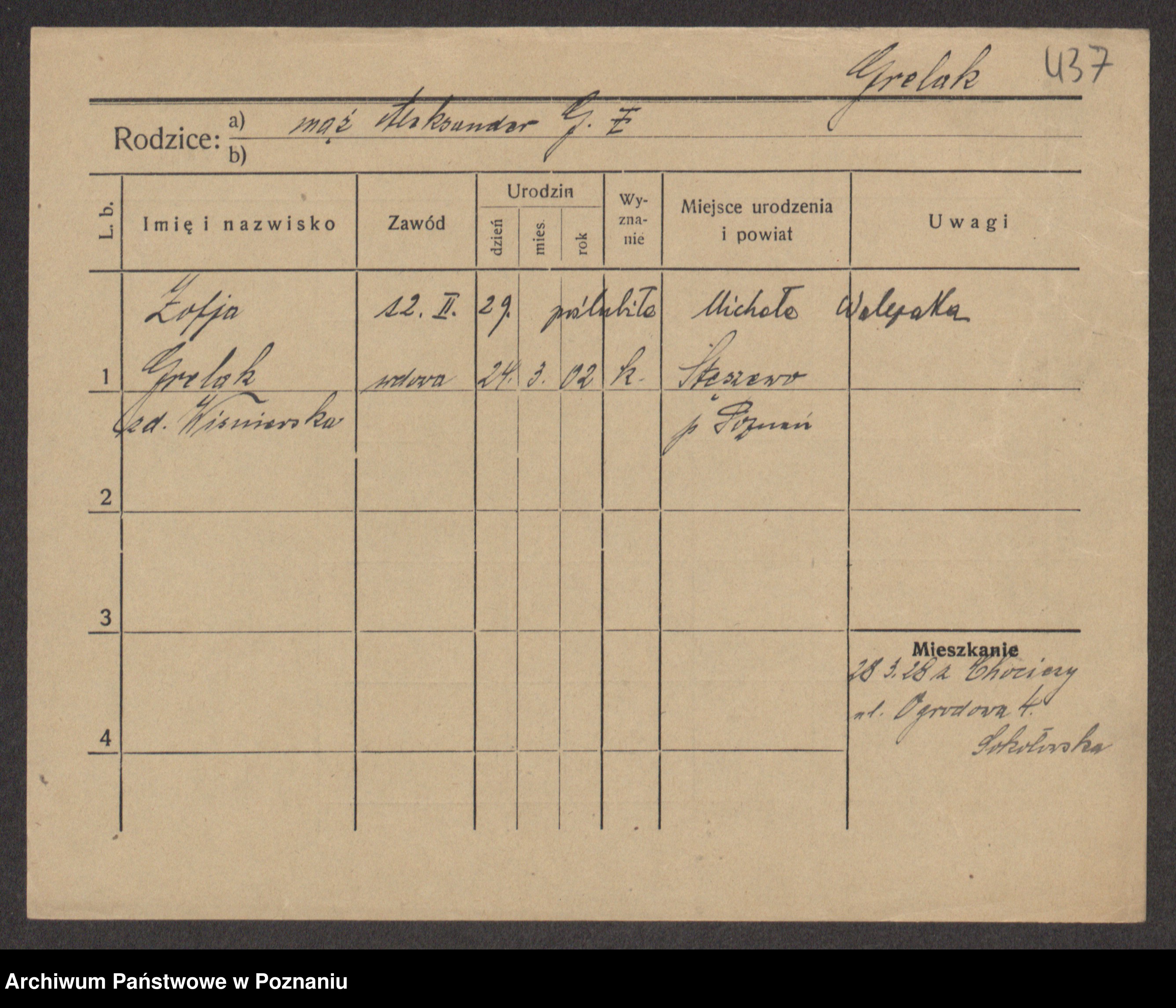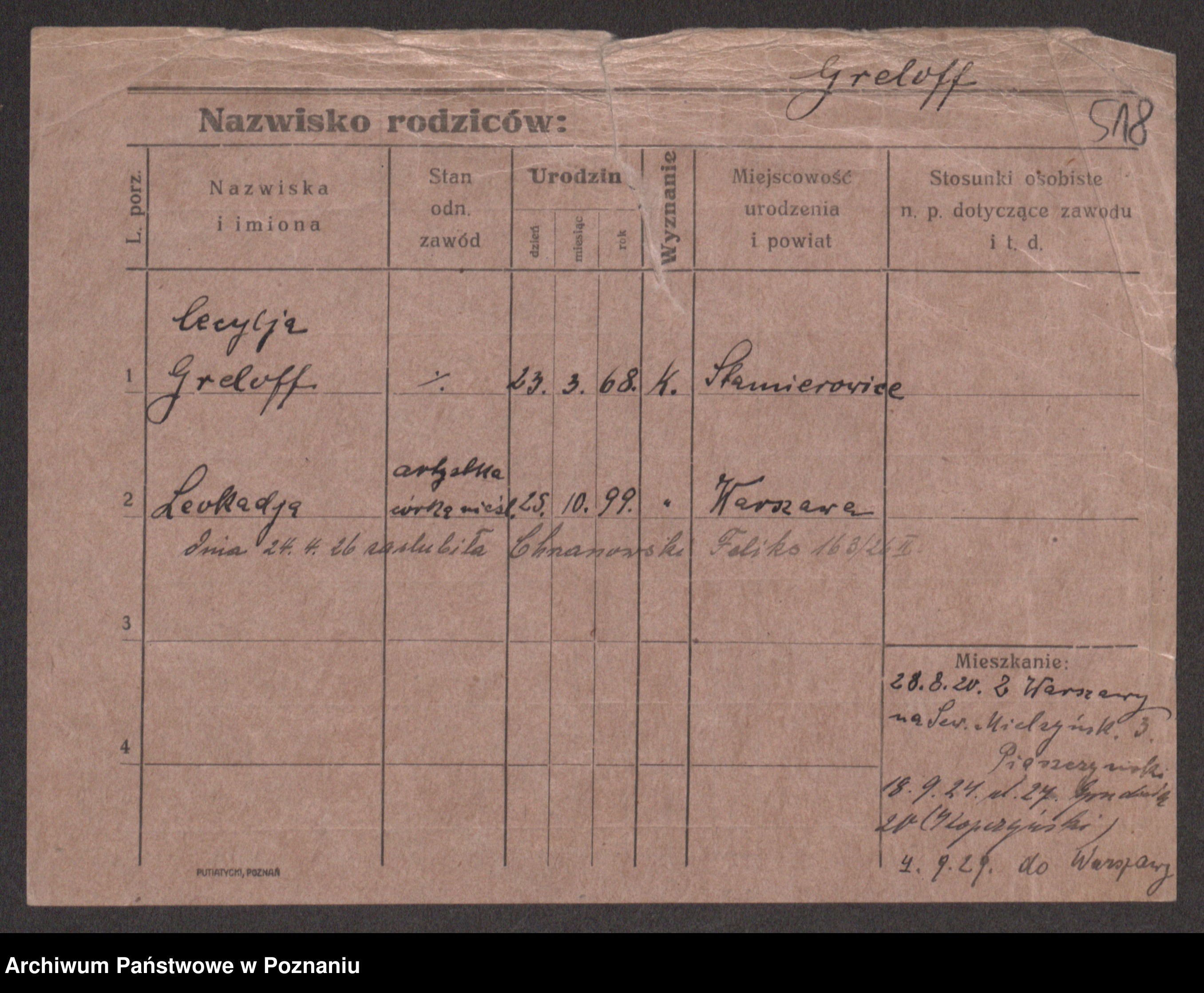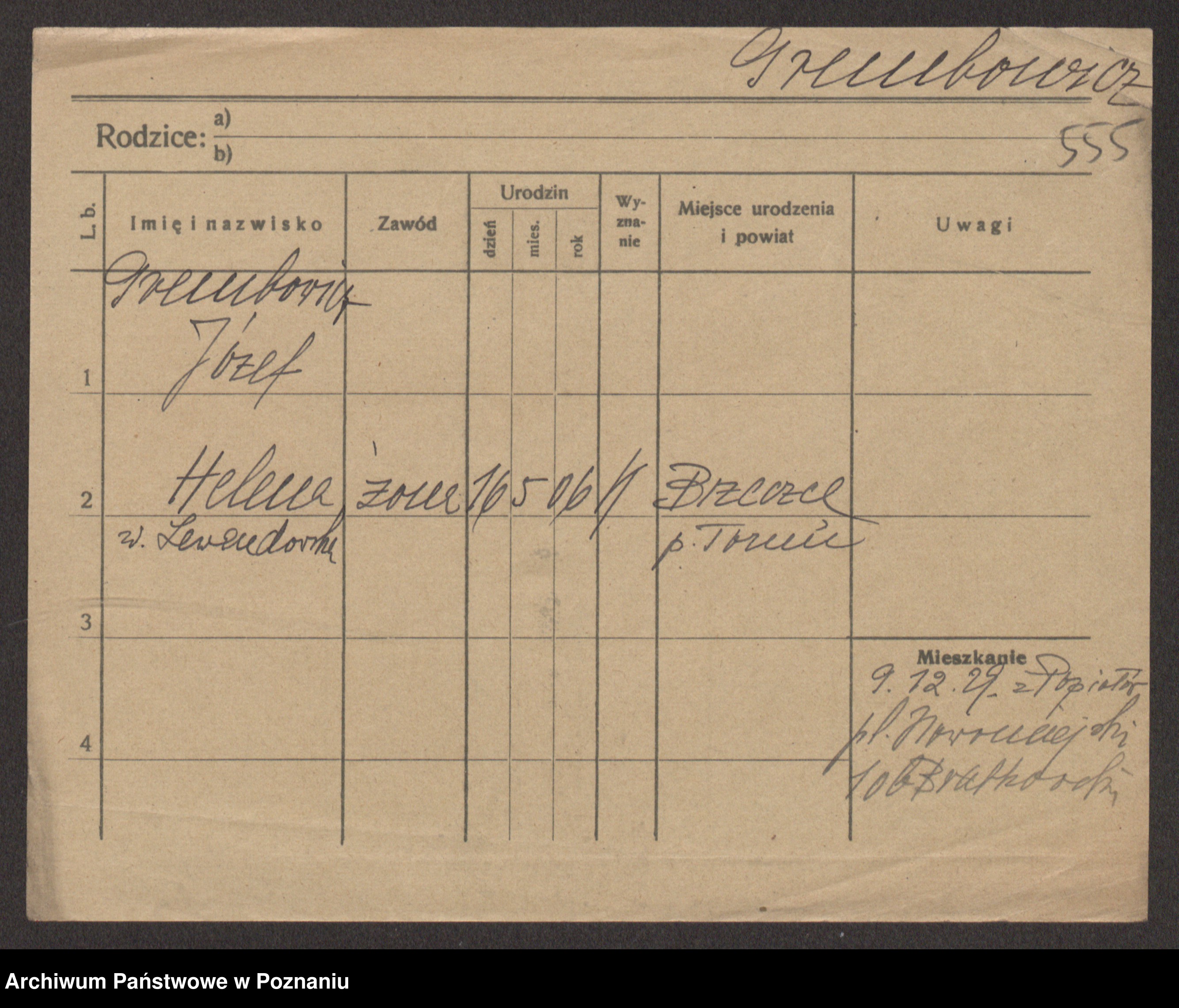 Podgląd karty osobowej dostępny jest po kliknięciu na nazwisko lub ikonkę karty. Można dokonywać powiększenia (ikony na górze) lub przechodzić między kolejnymi skanami (strzałki po bokach).