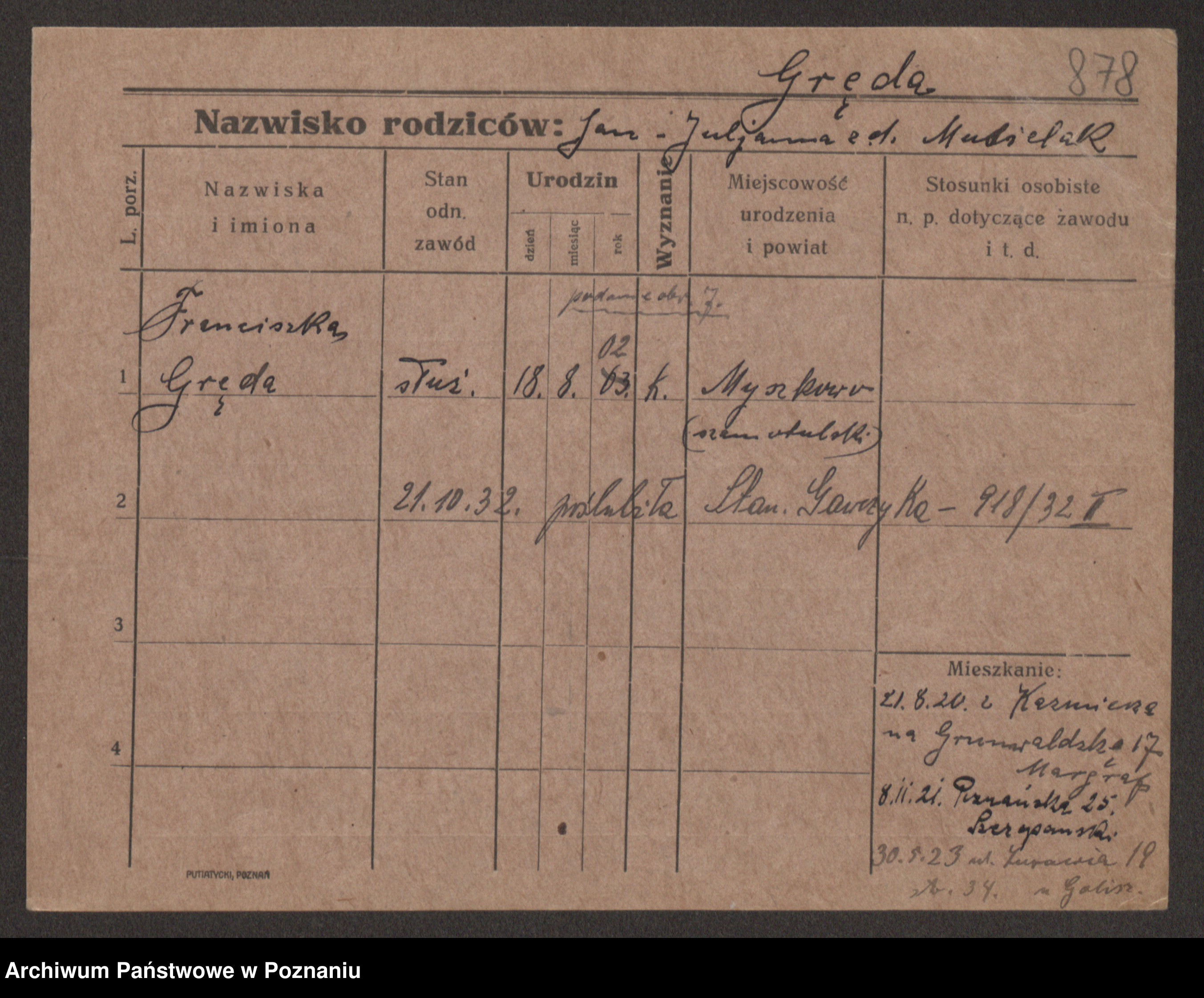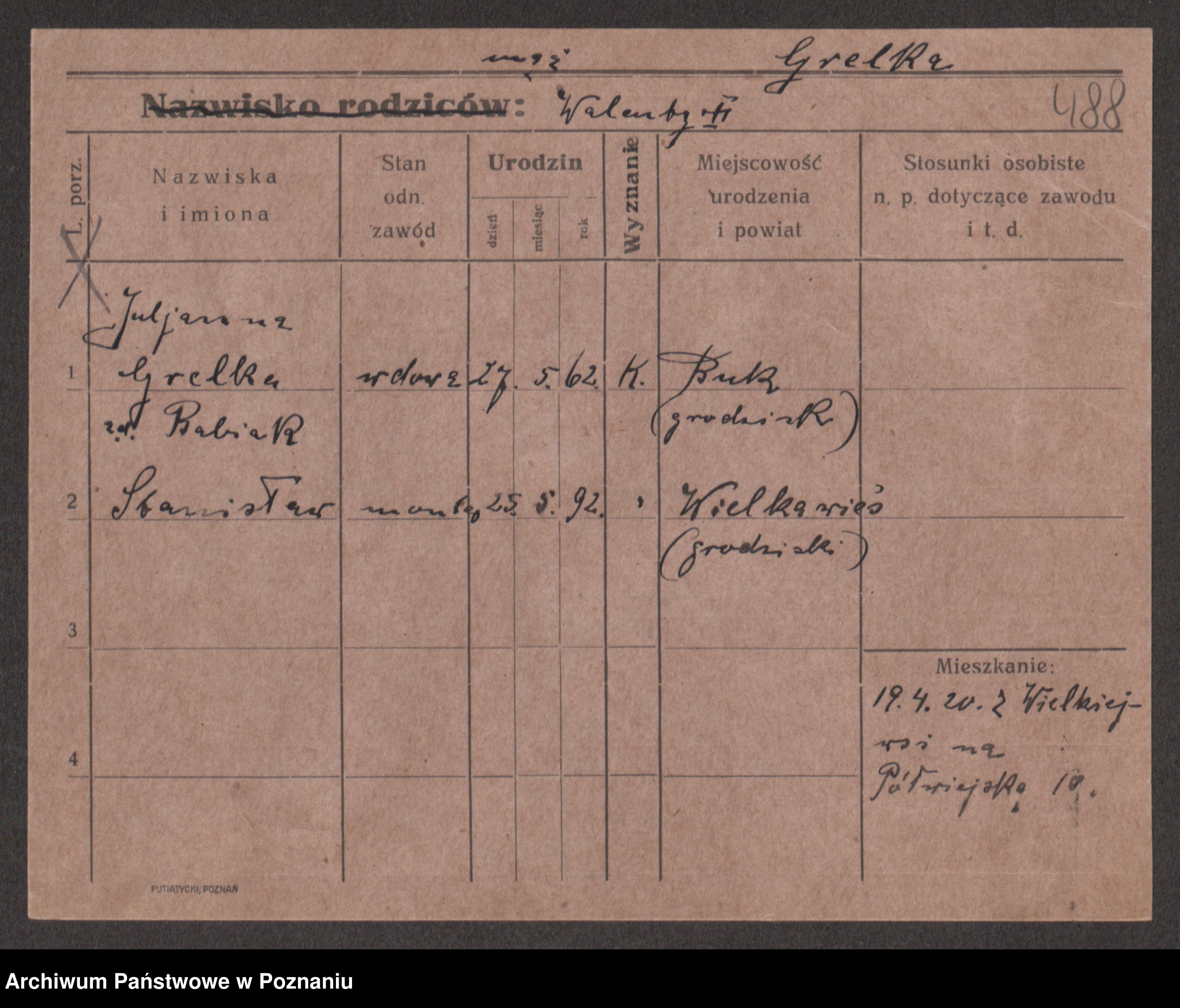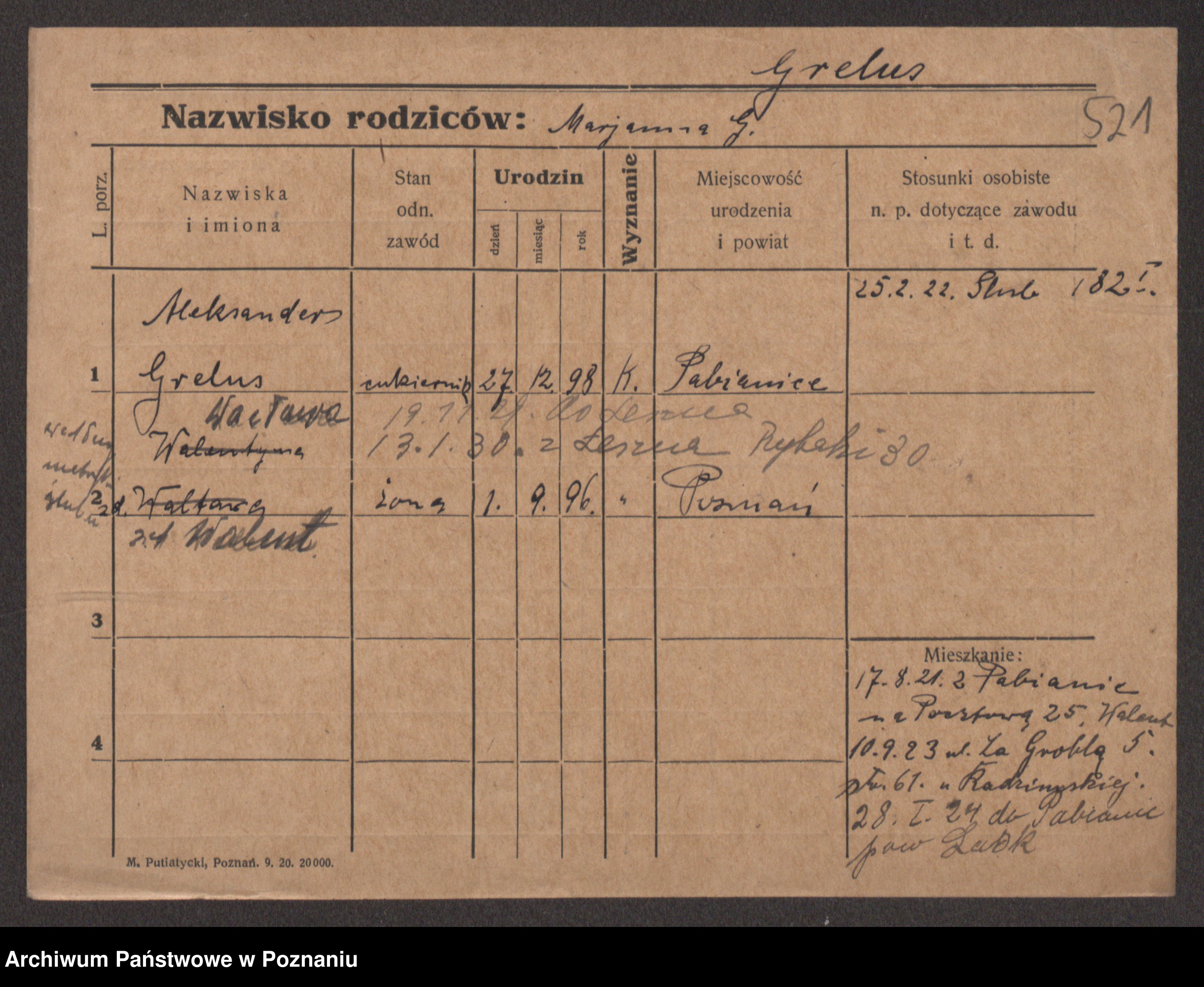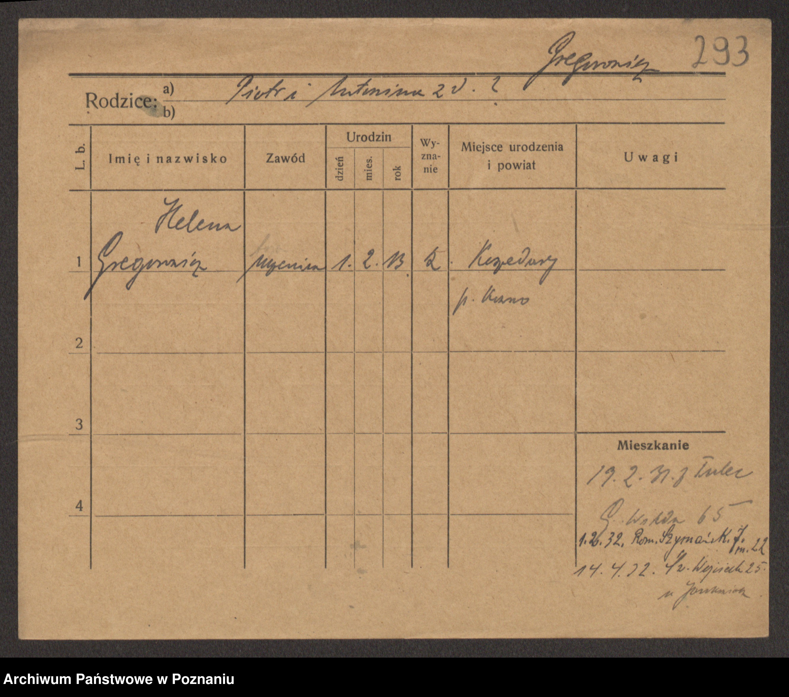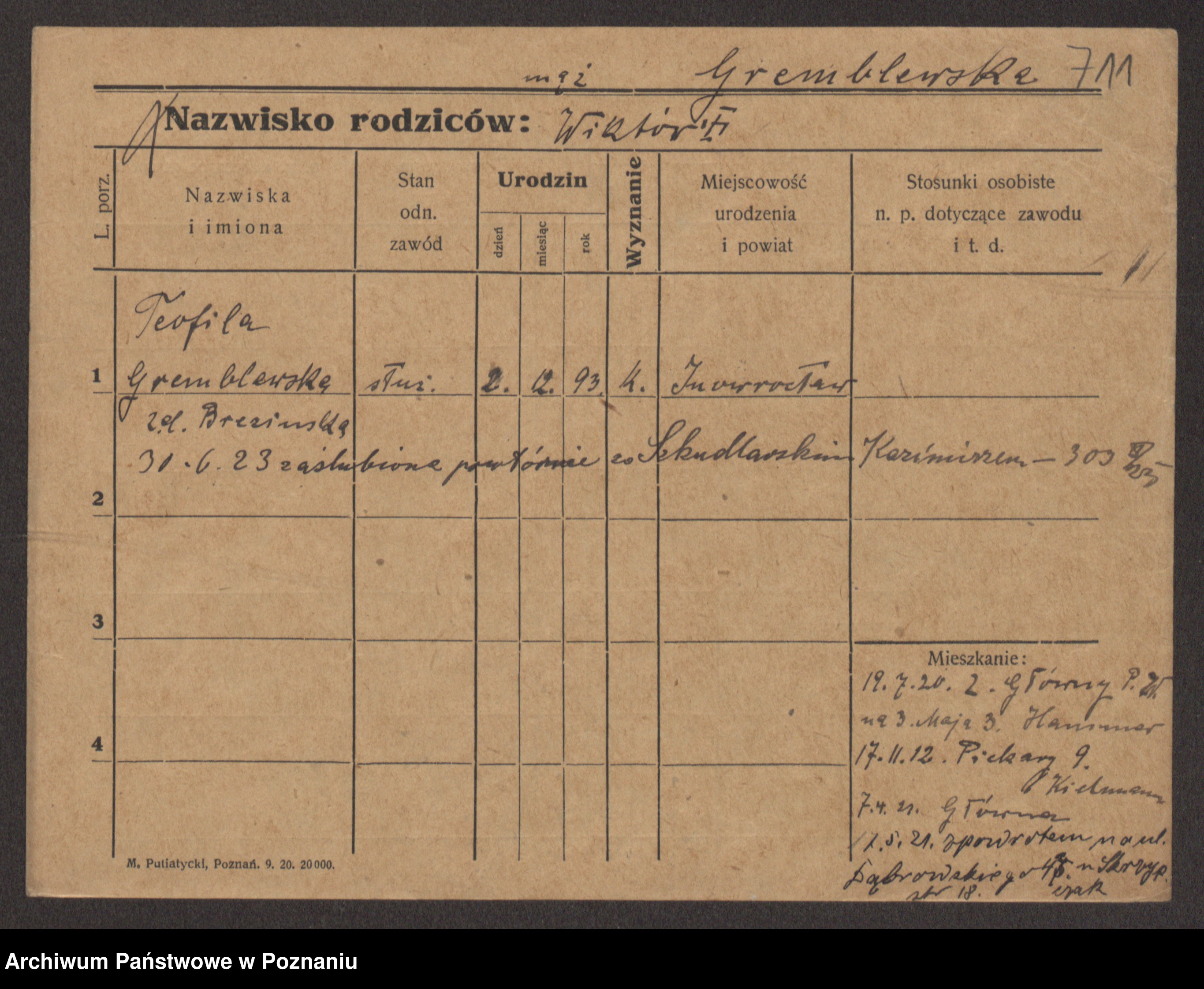 Podgląd karty osobowej dostępny jest po kliknięciu na nazwisko lub ikonkę karty. Można dokonywać powiększenia (ikony na górze) lub przechodzić między kolejnymi skanami (strzałki po bokach).