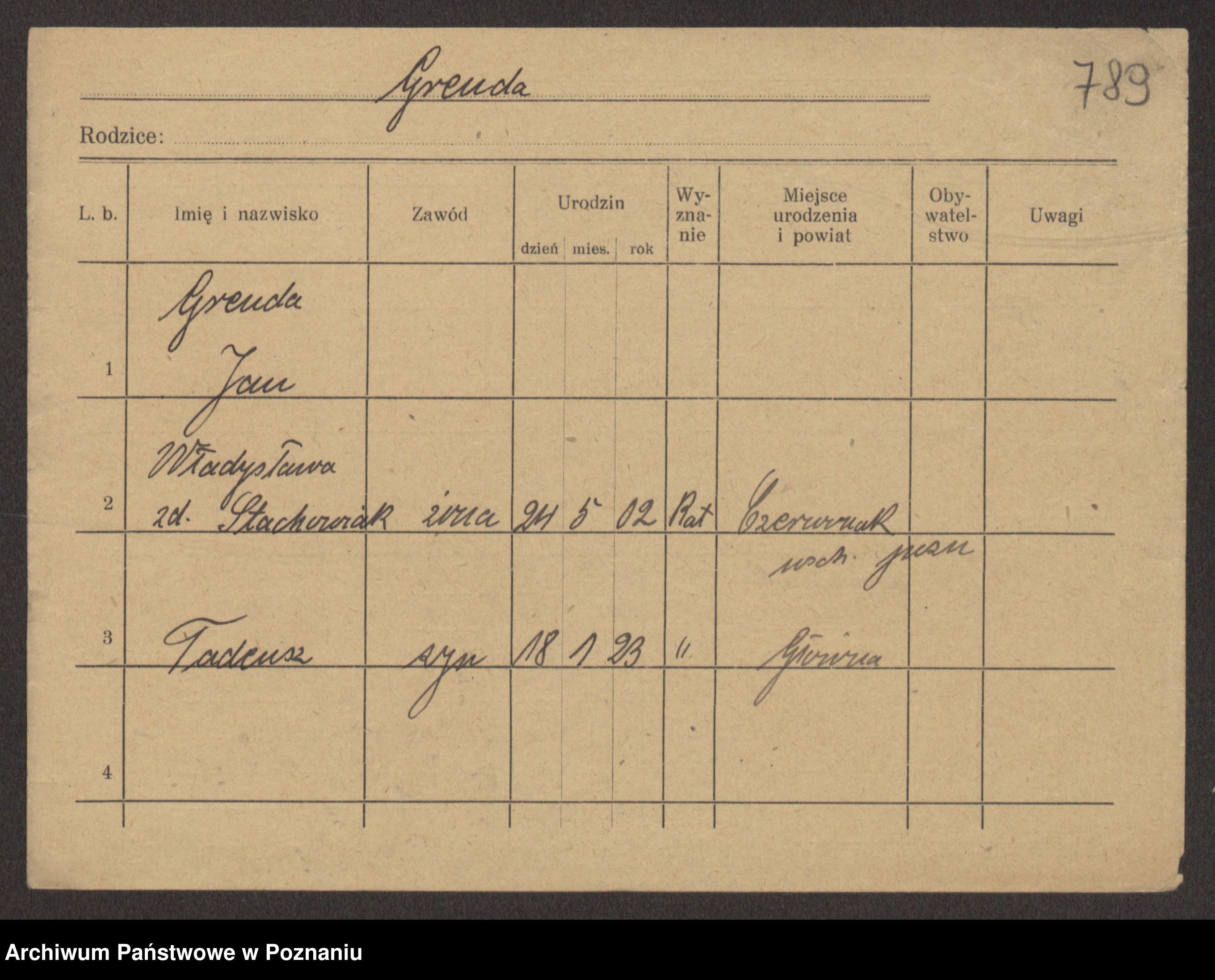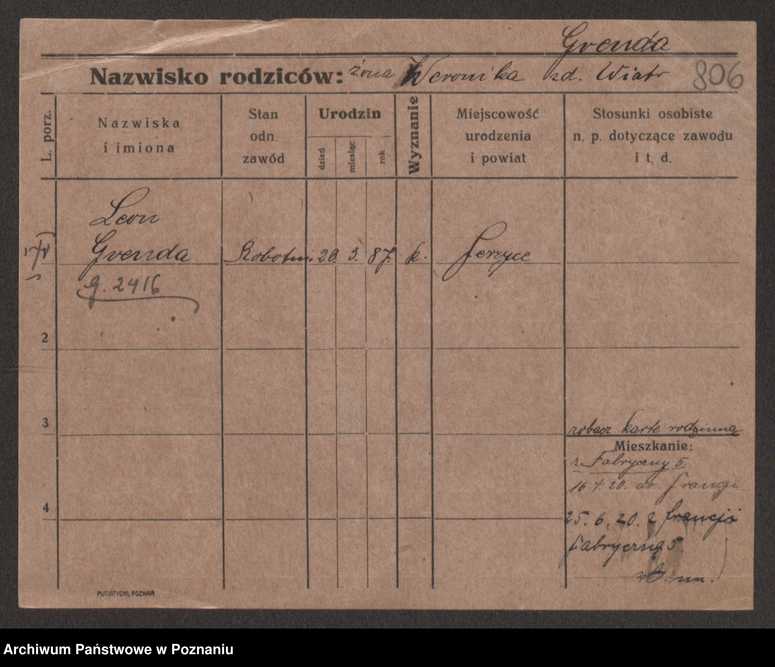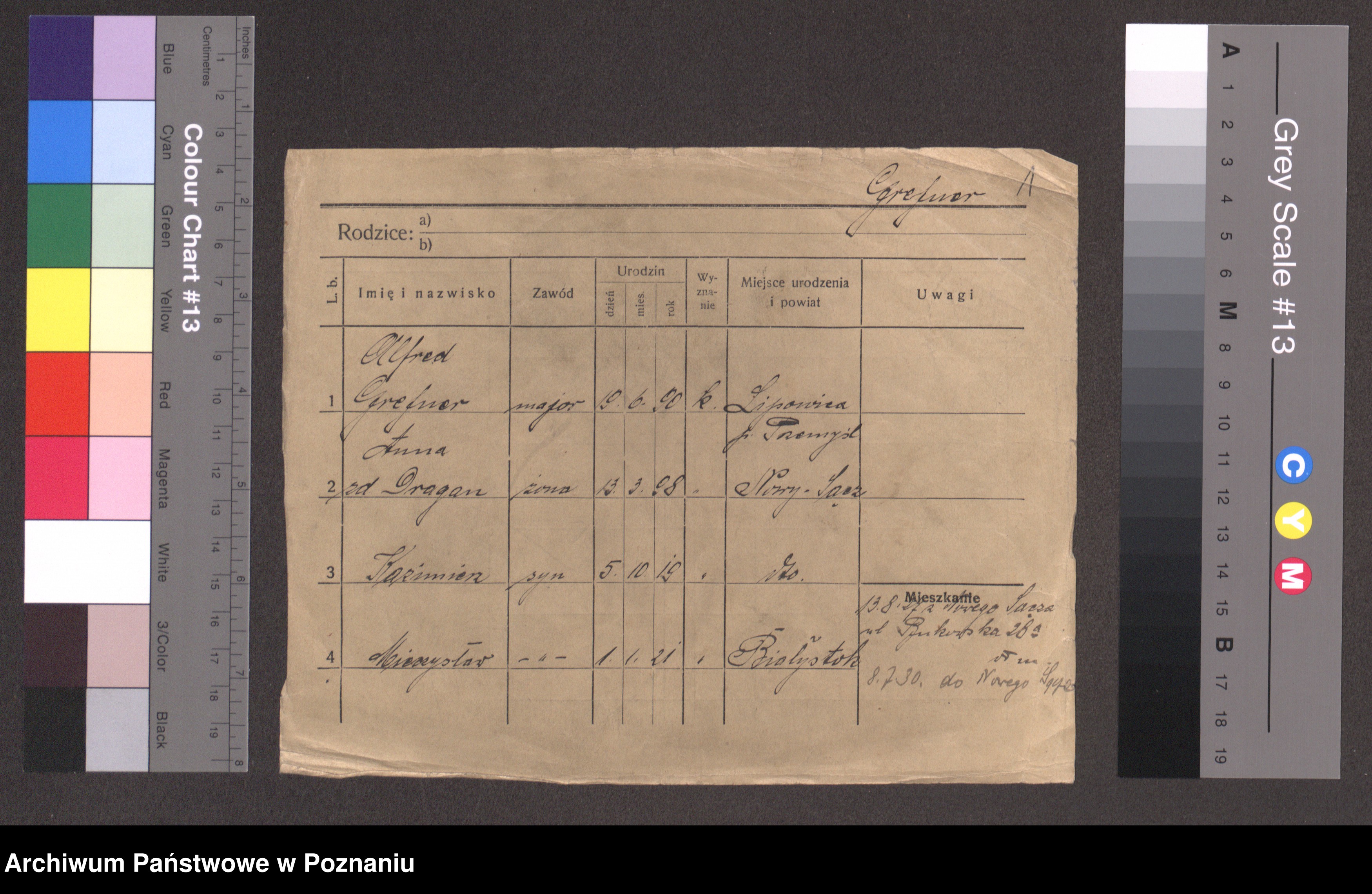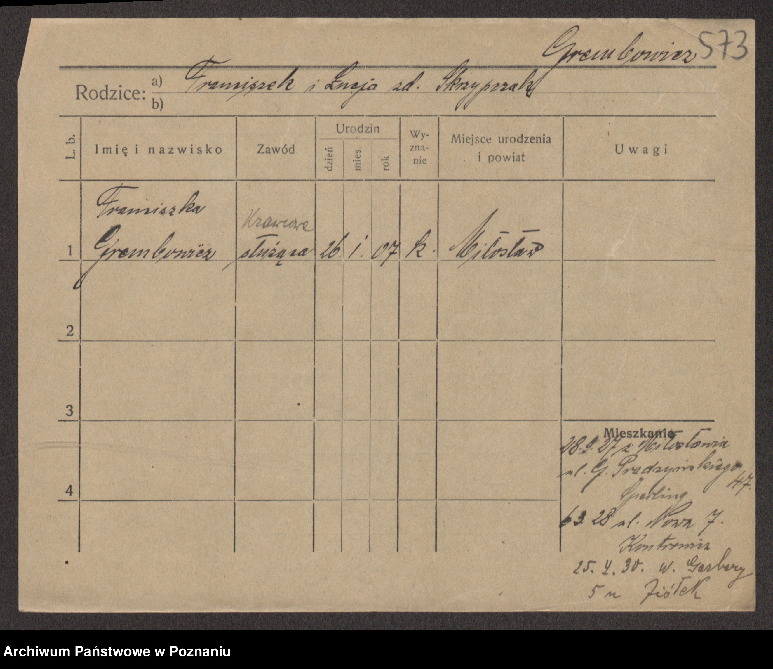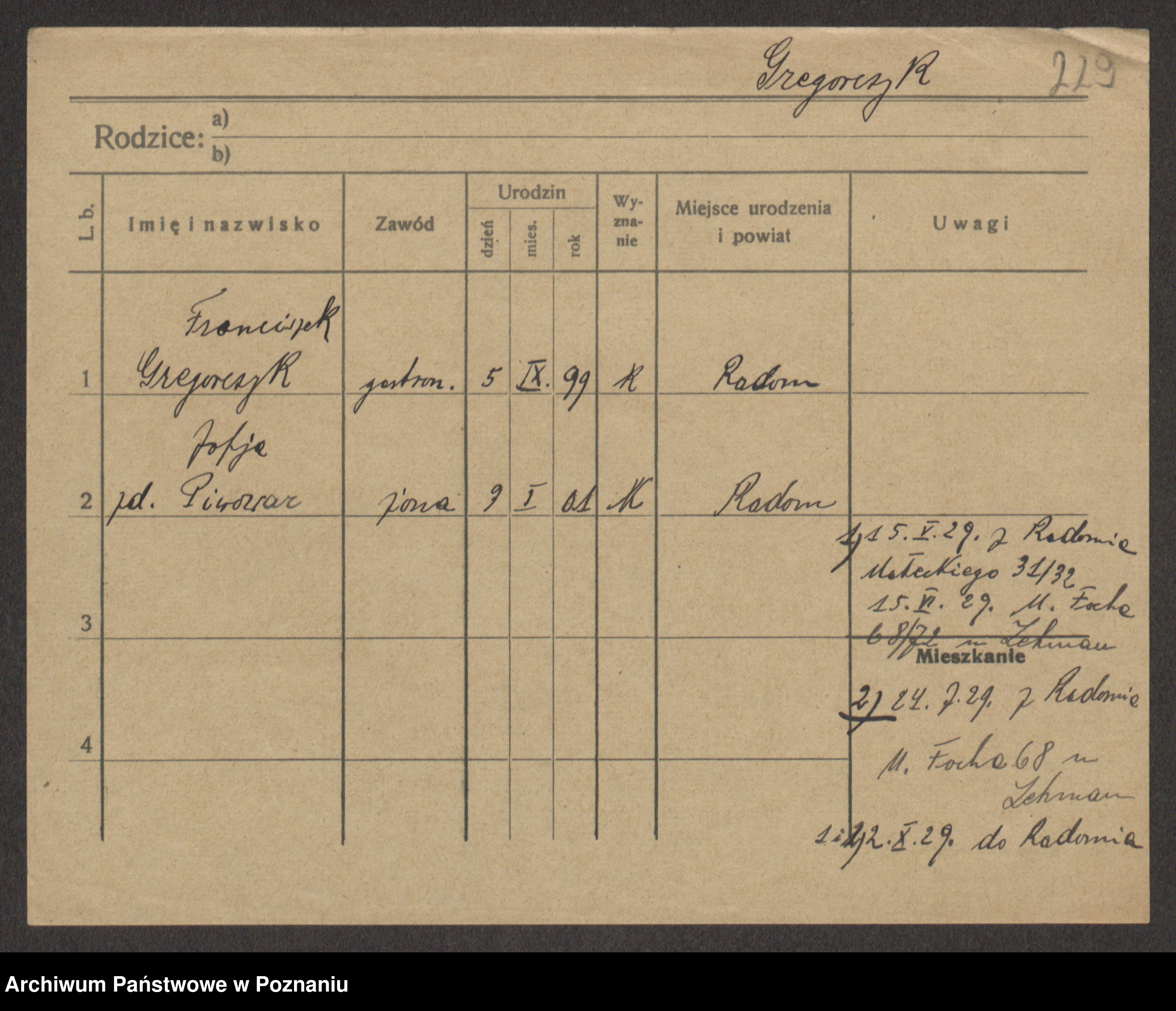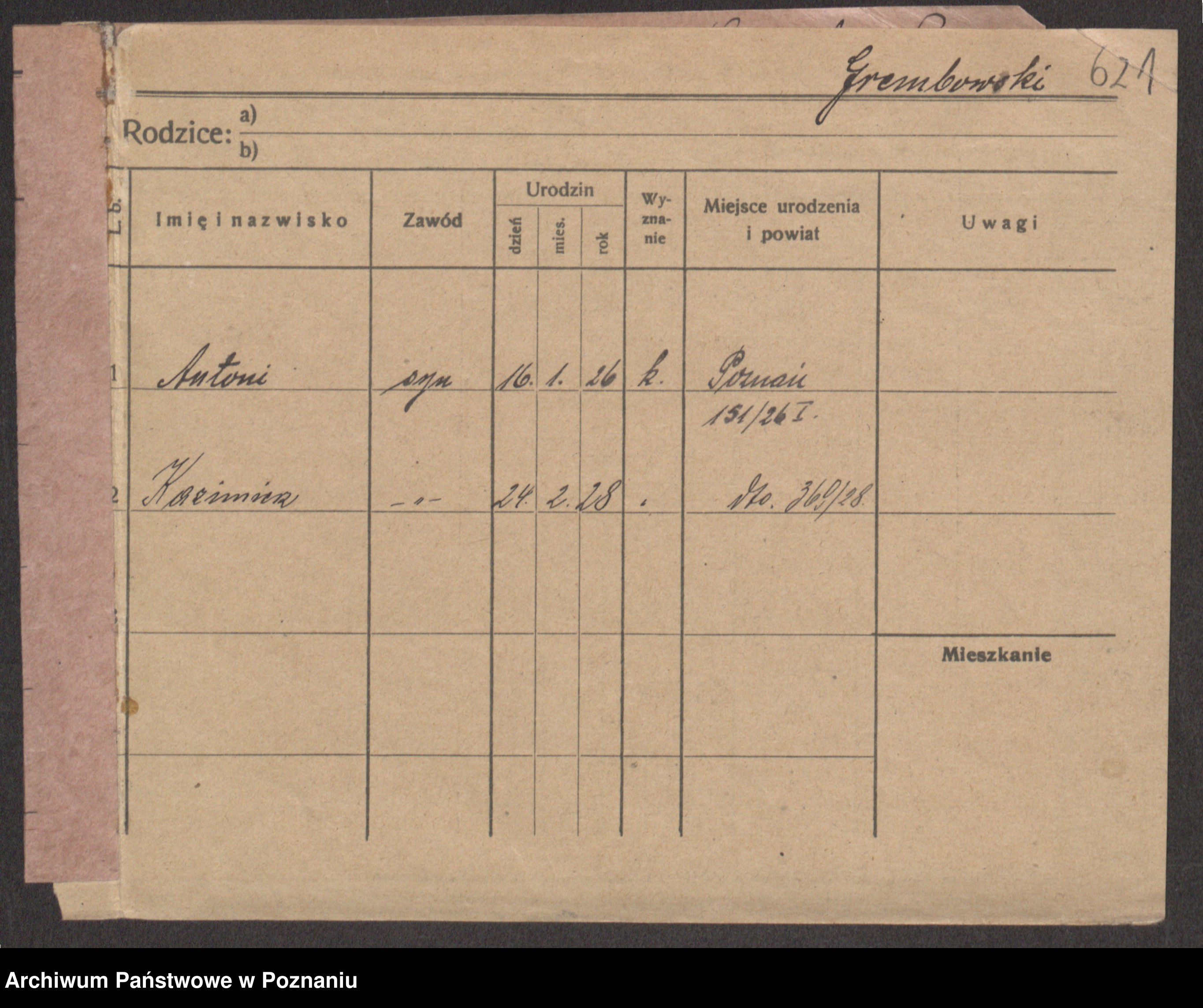 Podgląd karty osobowej dostępny jest po kliknięciu na nazwisko lub ikonkę karty. Można dokonywać powiększenia (ikony na górze) lub przechodzić między kolejnymi skanami (strzałki po bokach).