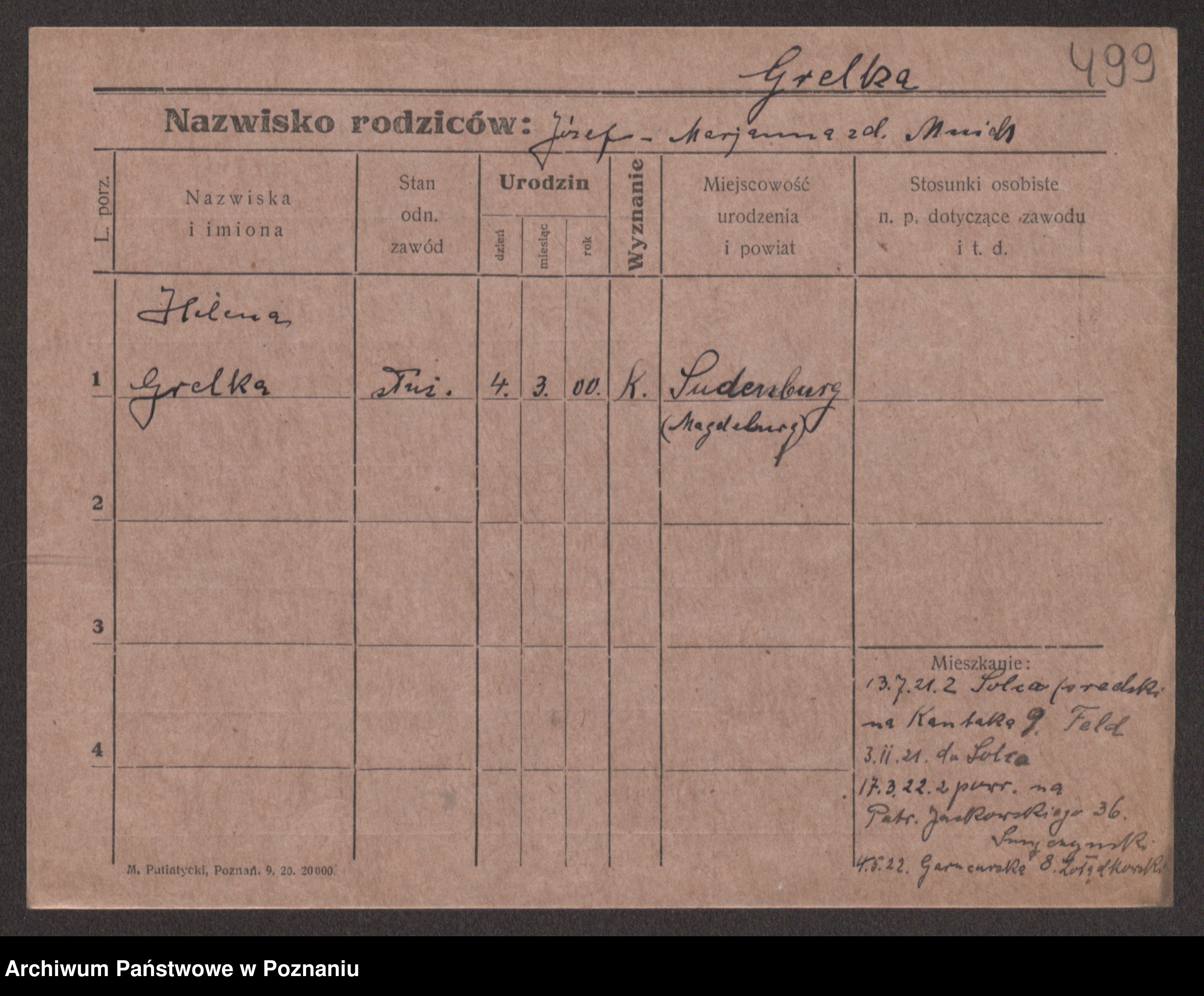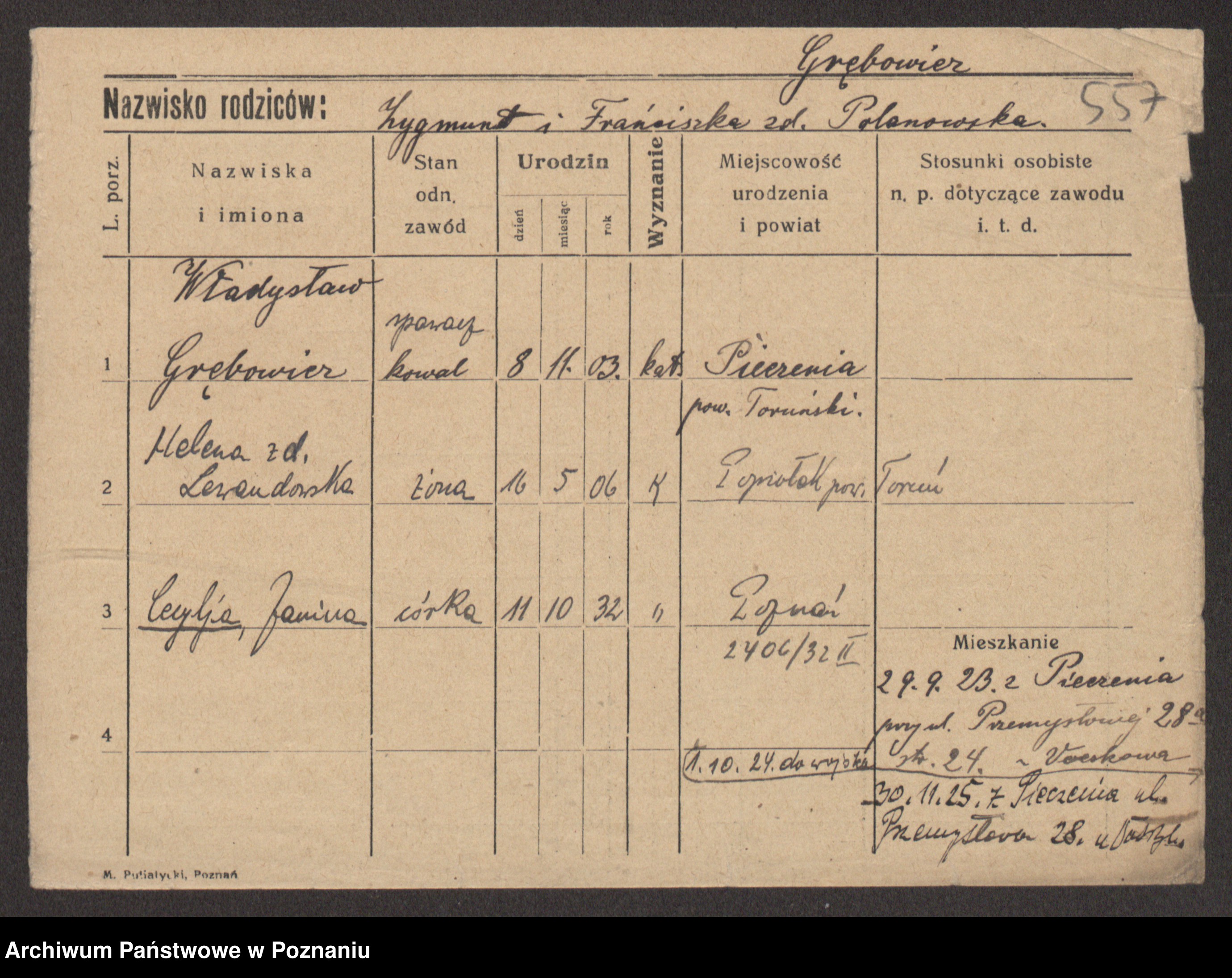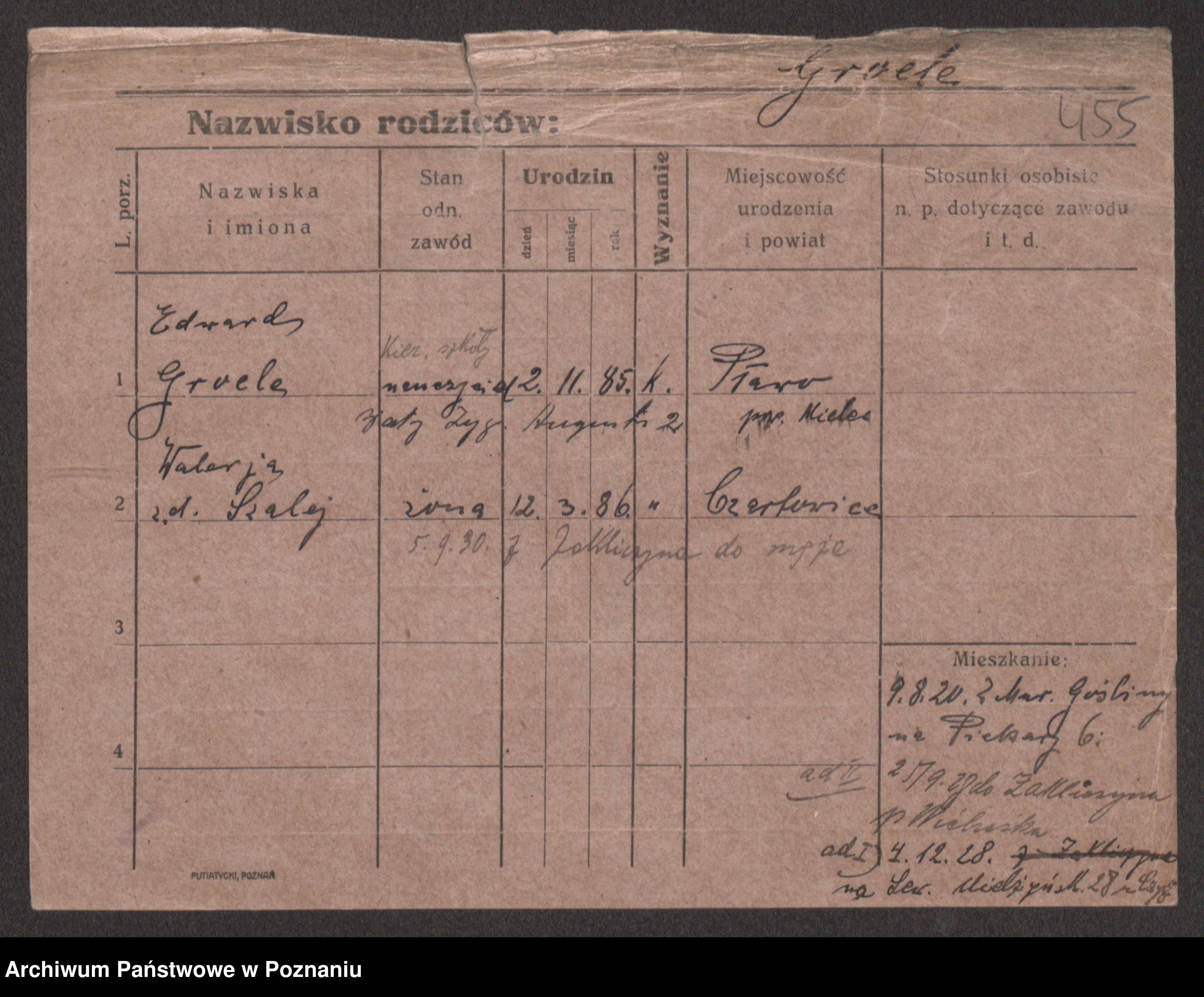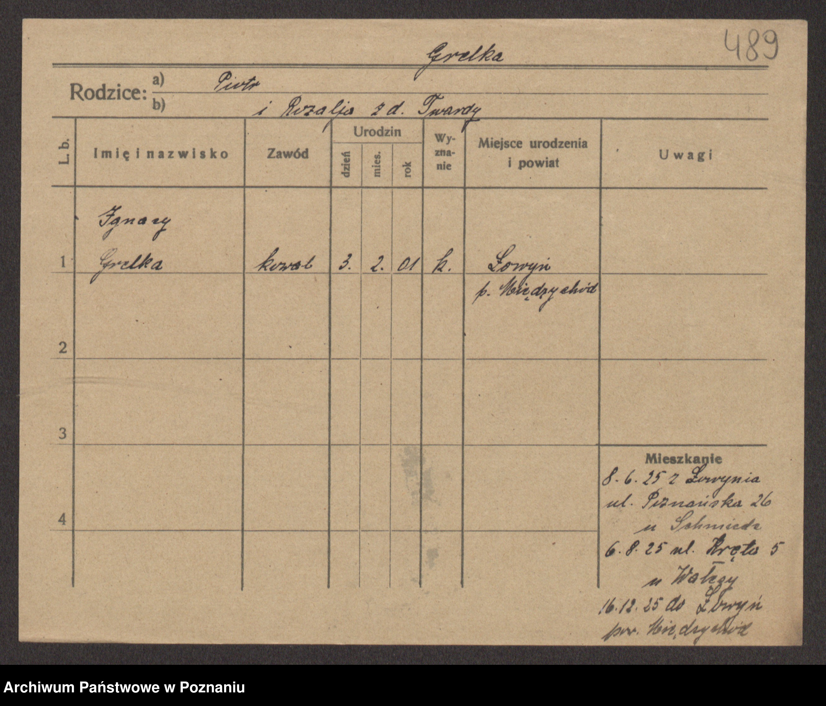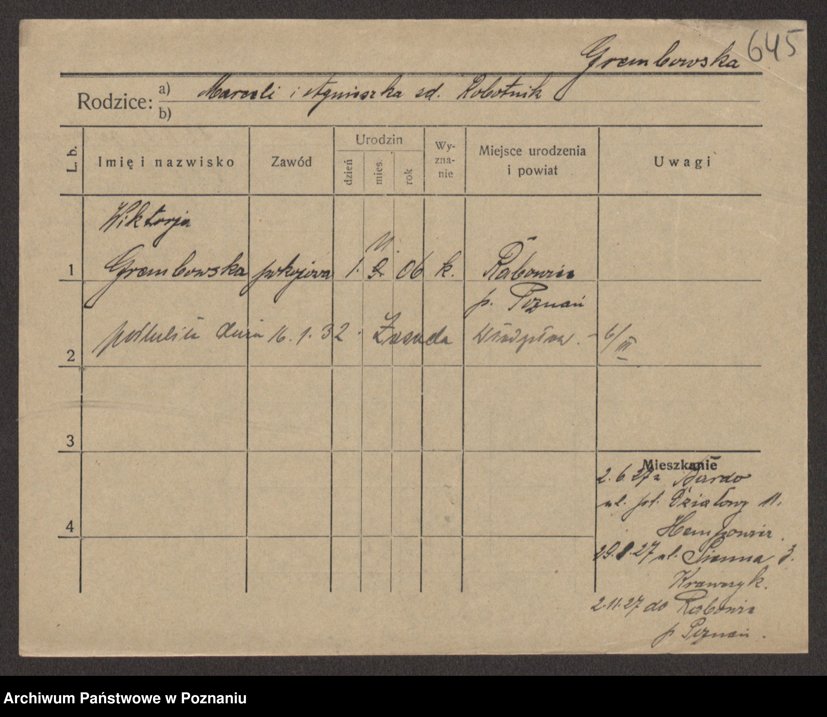 Podgląd karty osobowej dostępny jest po kliknięciu na nazwisko lub ikonkę karty. Można dokonywać powiększenia (ikony na górze) lub przechodzić między kolejnymi skanami (strzałki po bokach).