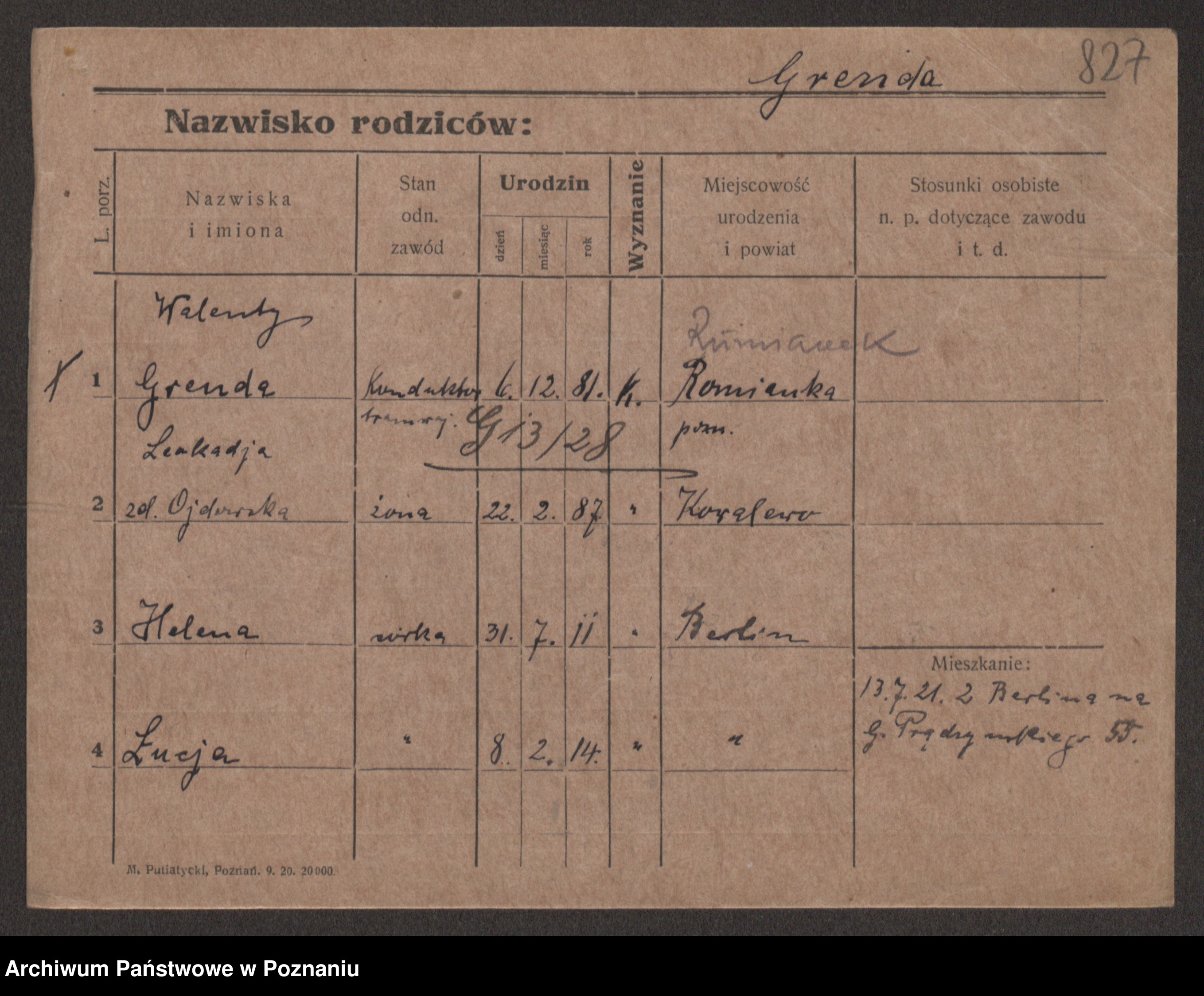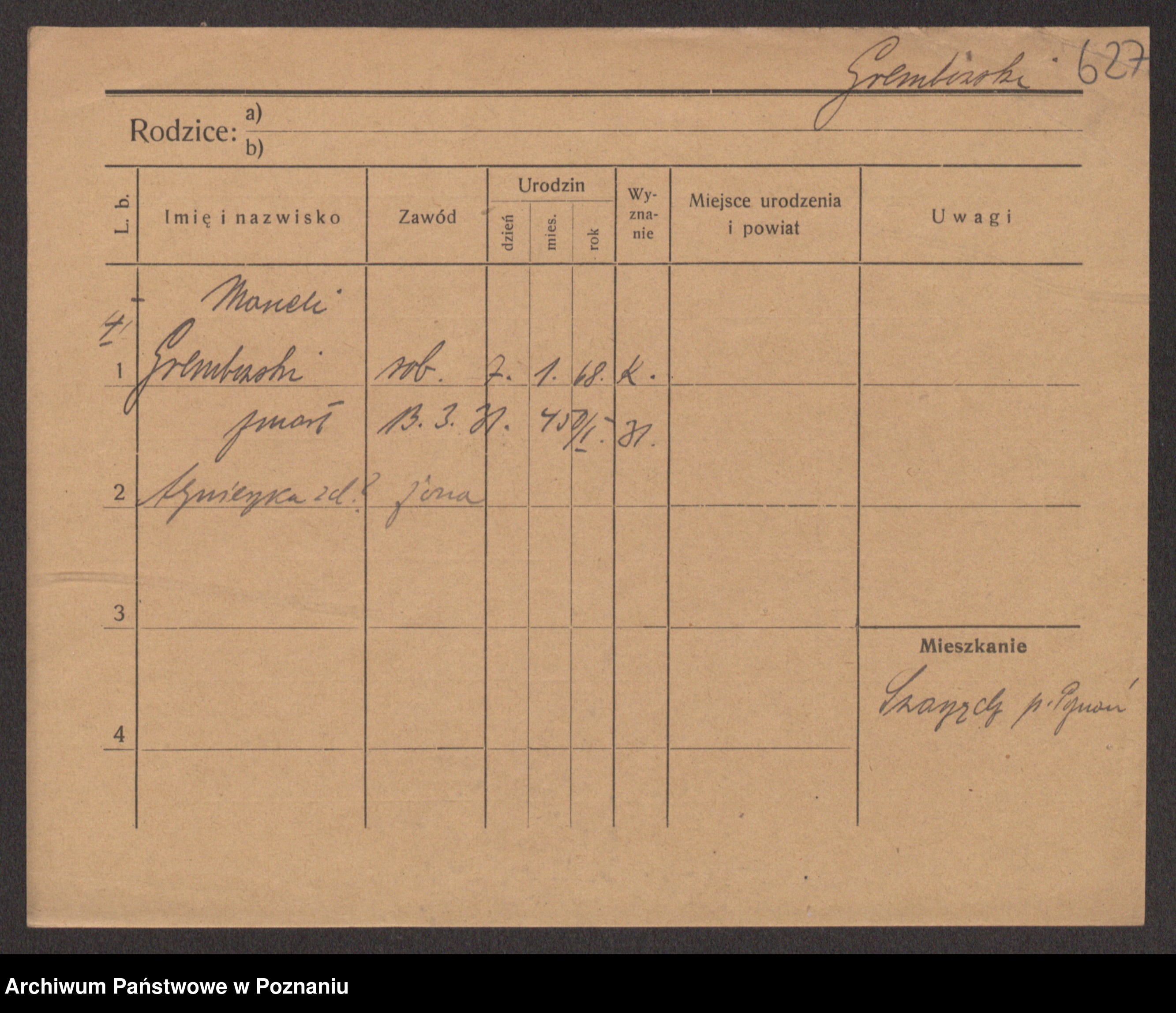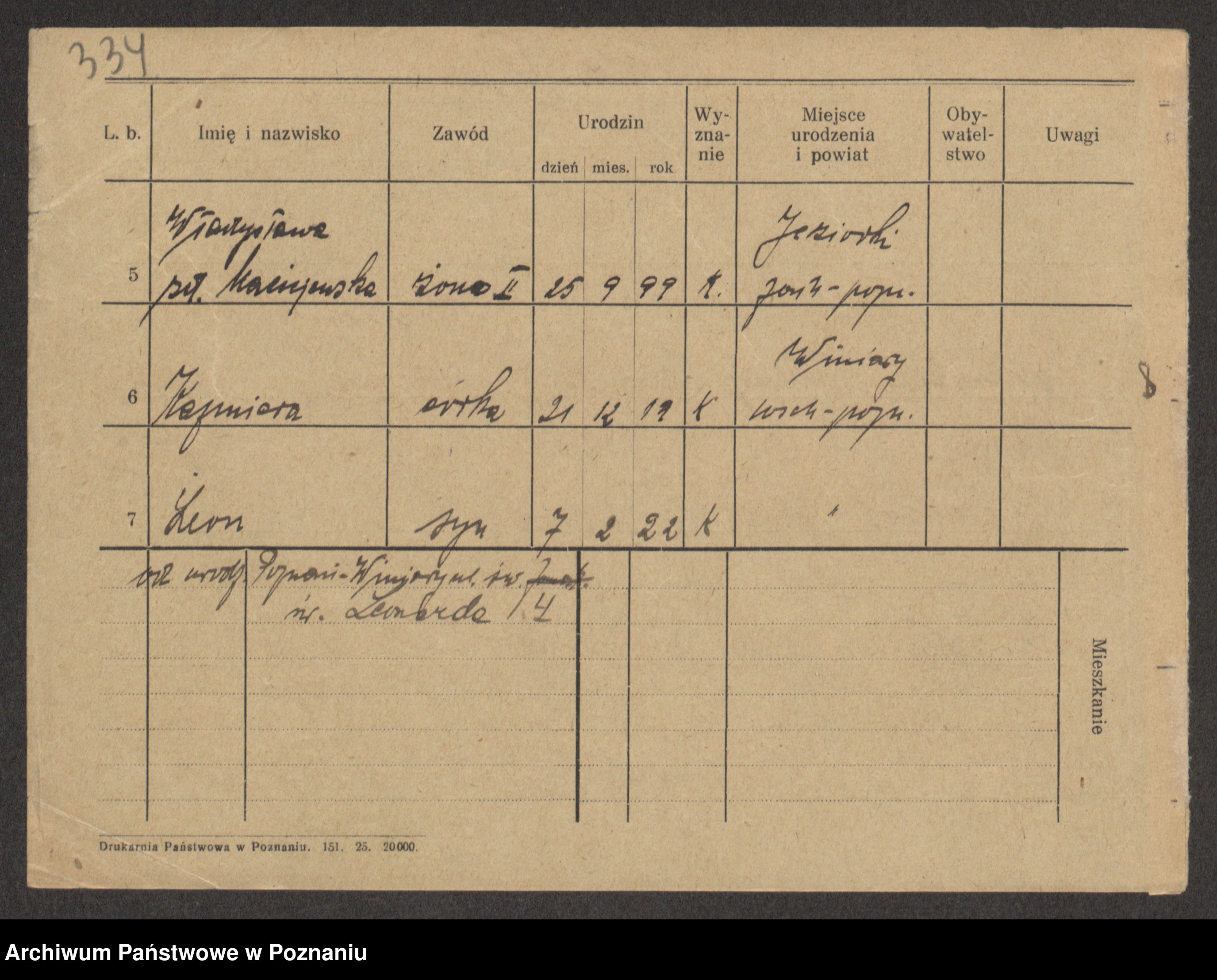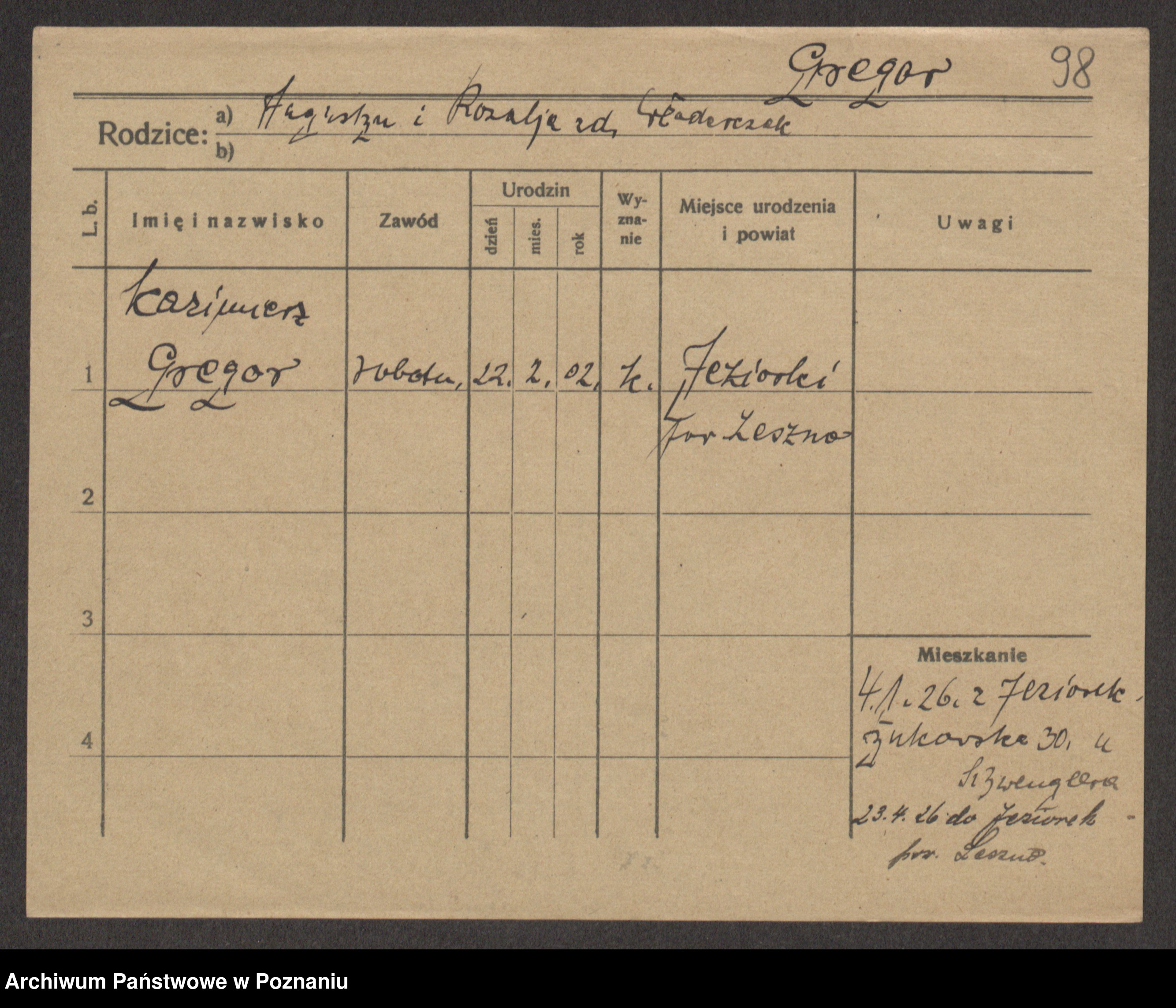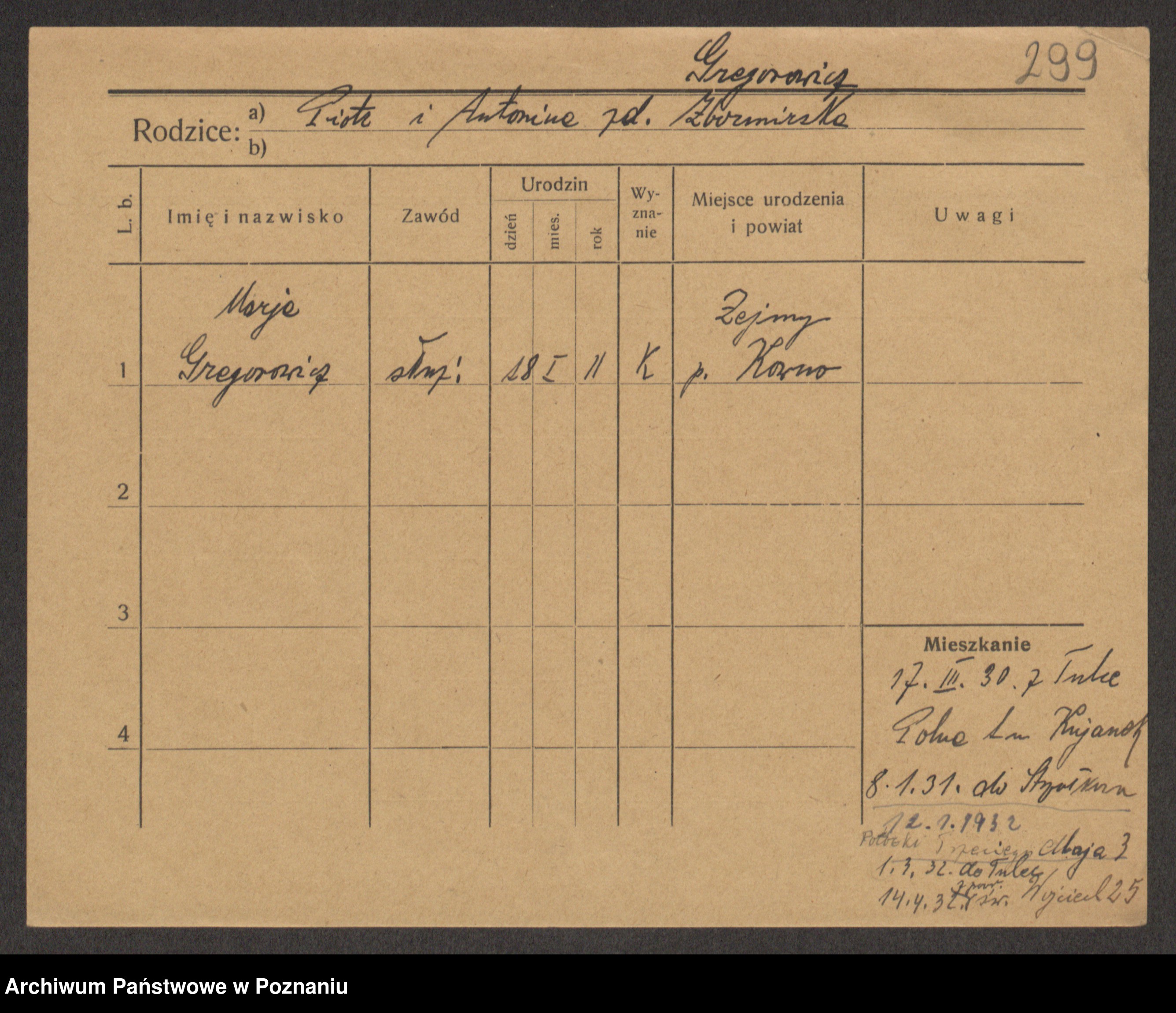 Podgląd karty osobowej dostępny jest po kliknięciu na nazwisko lub ikonkę karty. Można dokonywać powiększenia (ikony na górze) lub przechodzić między kolejnymi skanami (strzałki po bokach).