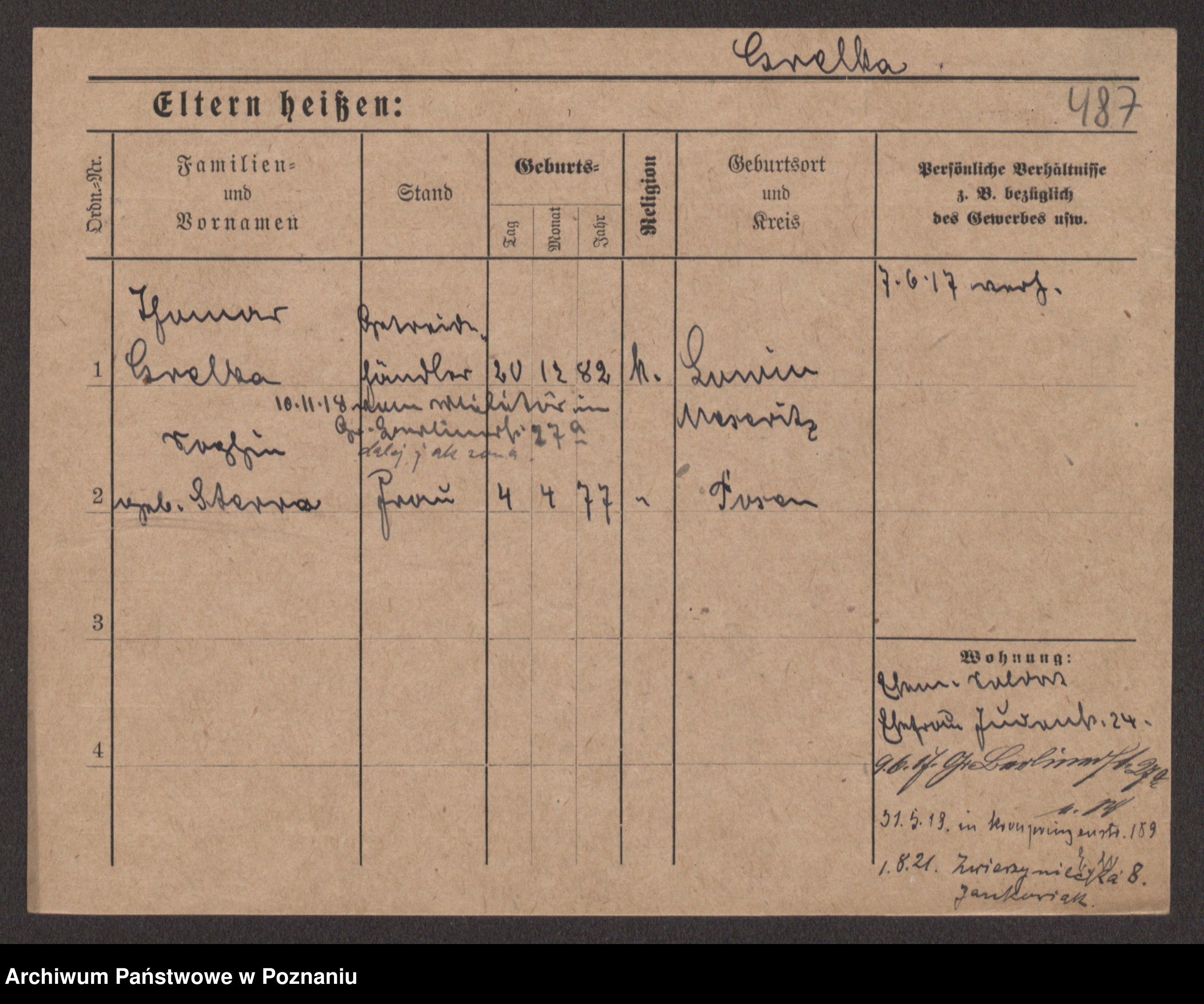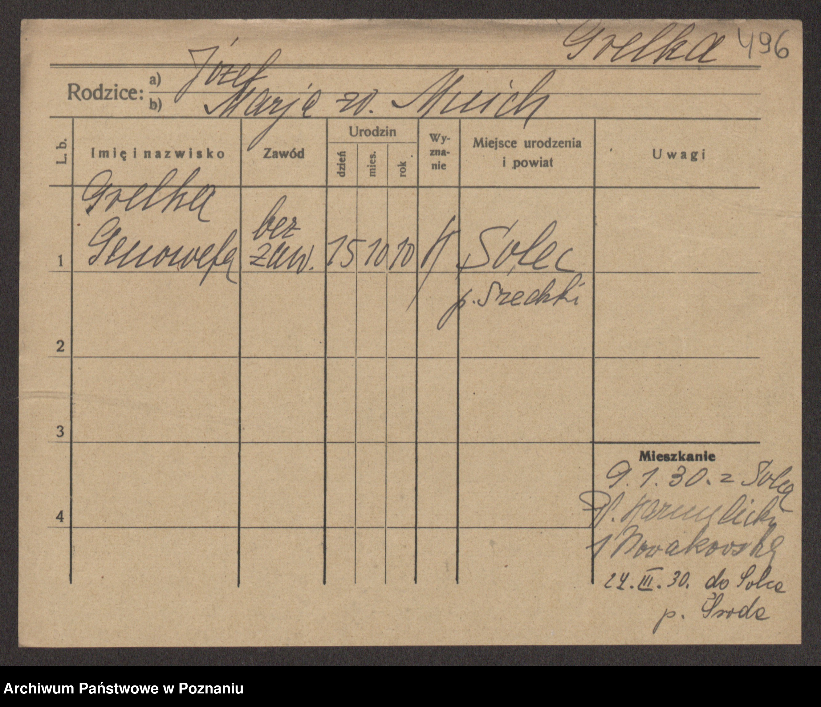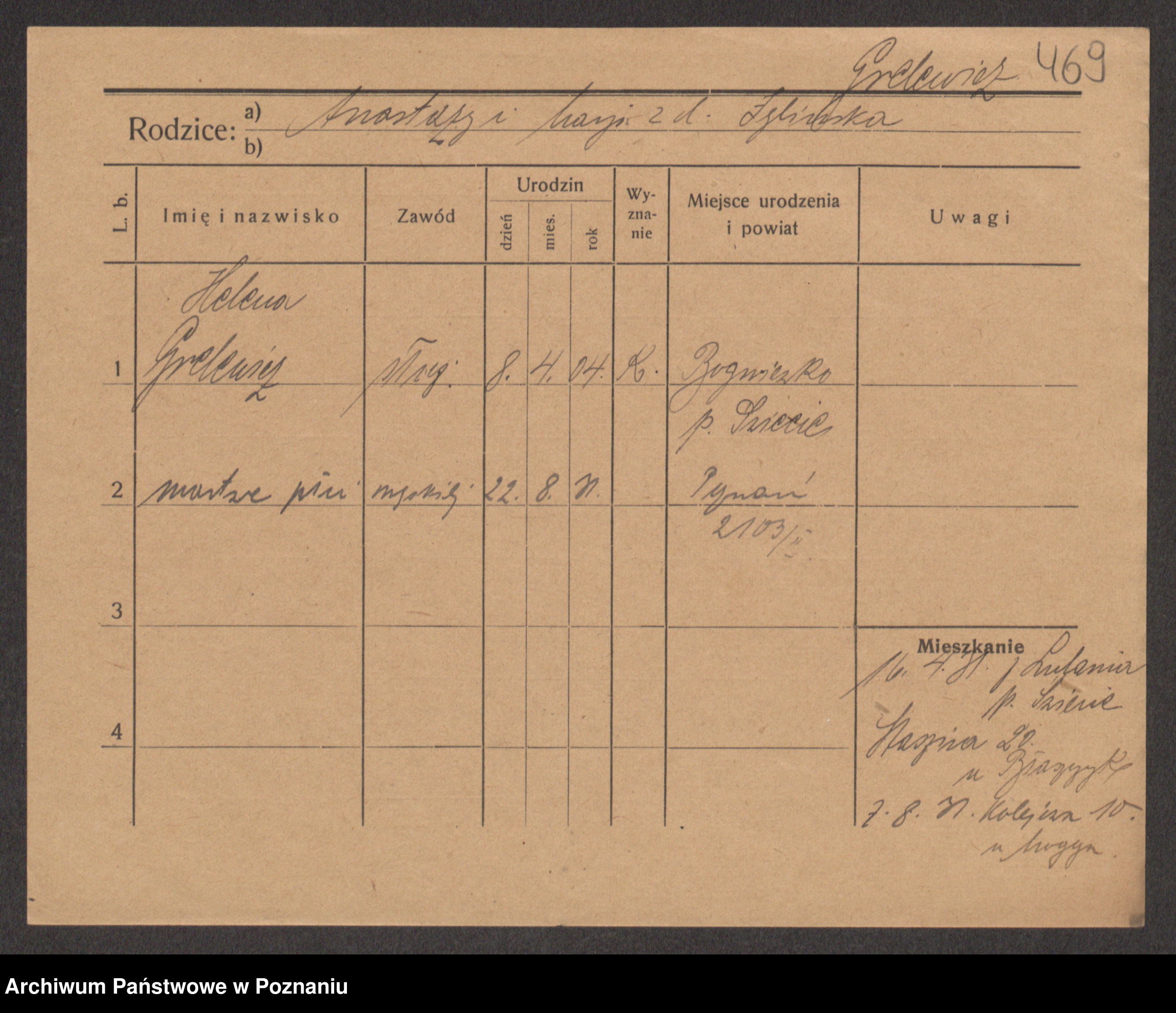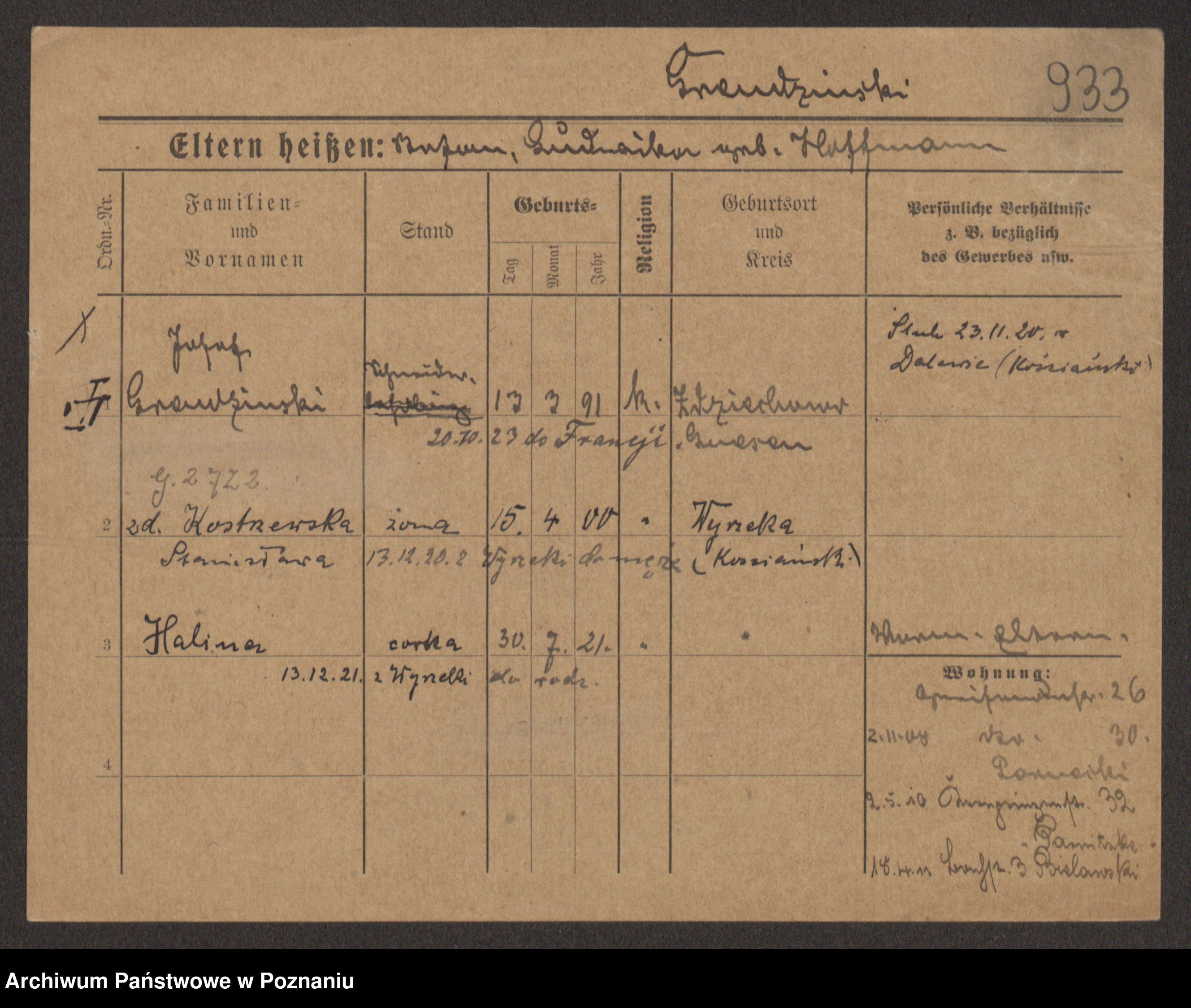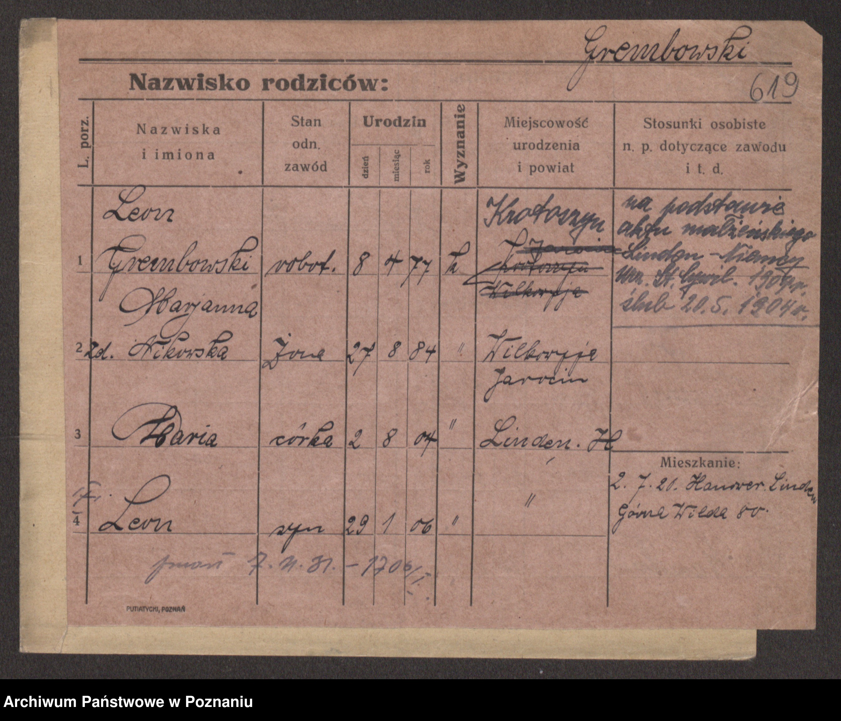 Podgląd karty osobowej dostępny jest po kliknięciu na nazwisko lub ikonkę karty. Można dokonywać powiększenia (ikony na górze) lub przechodzić między kolejnymi skanami (strzałki po bokach).