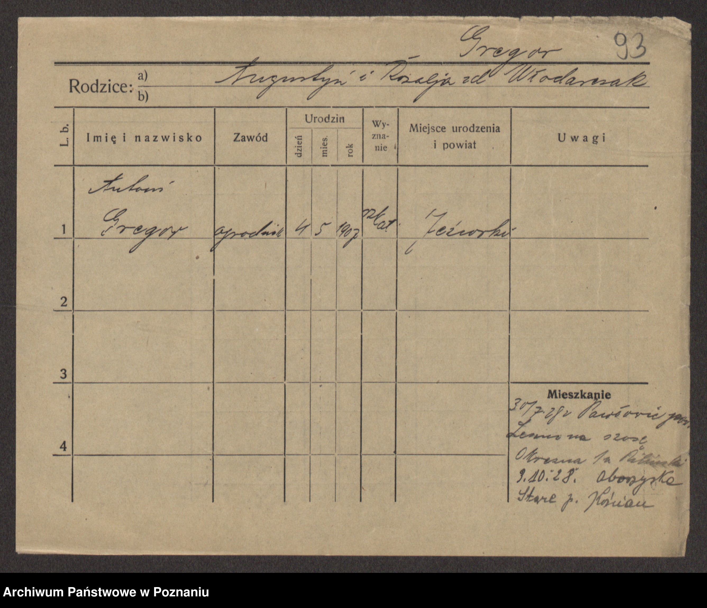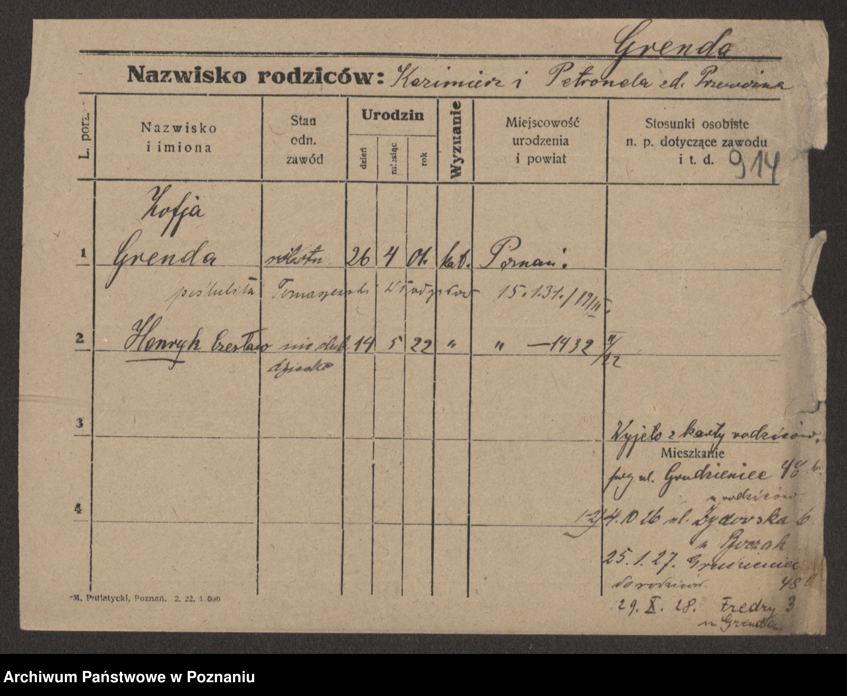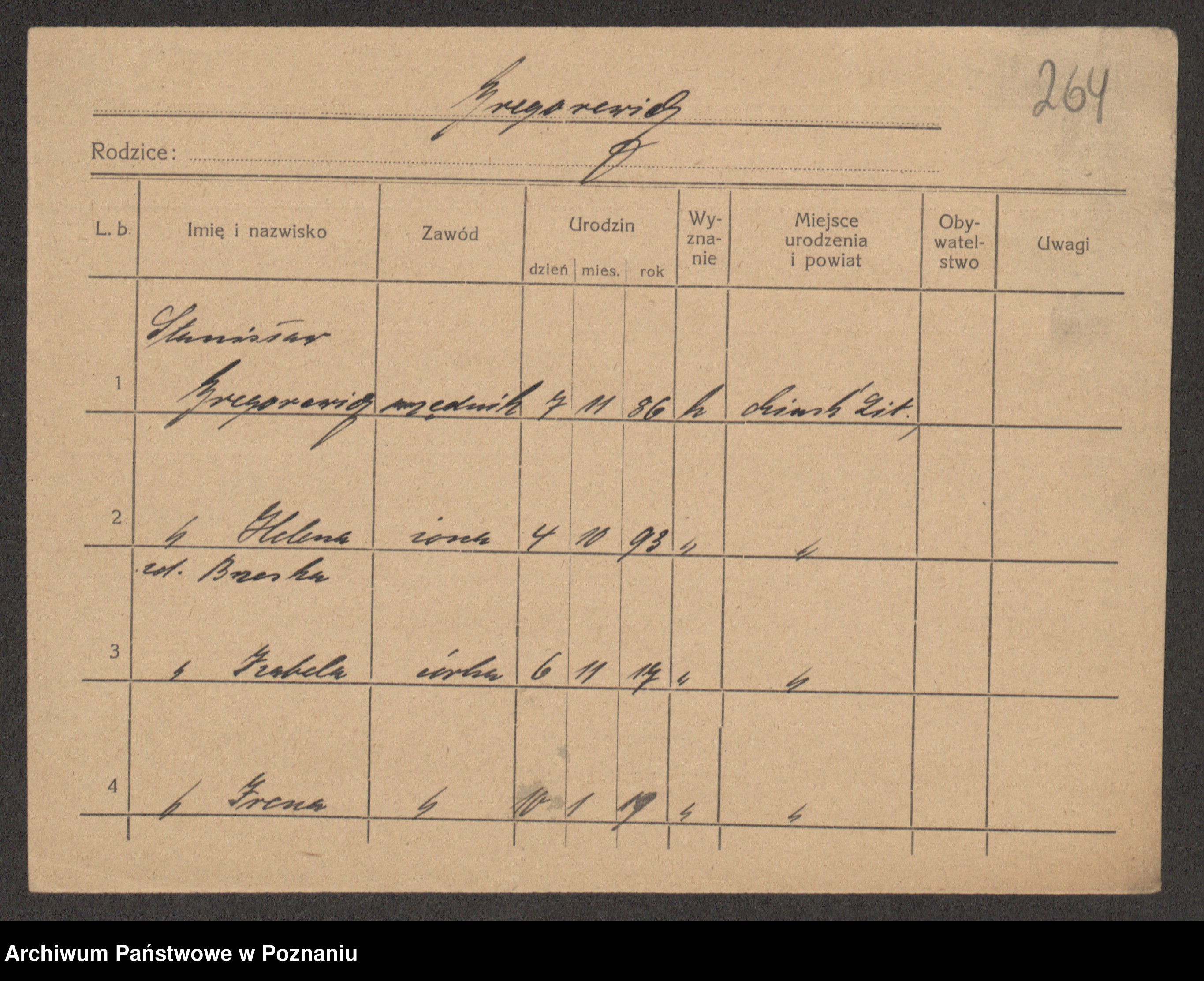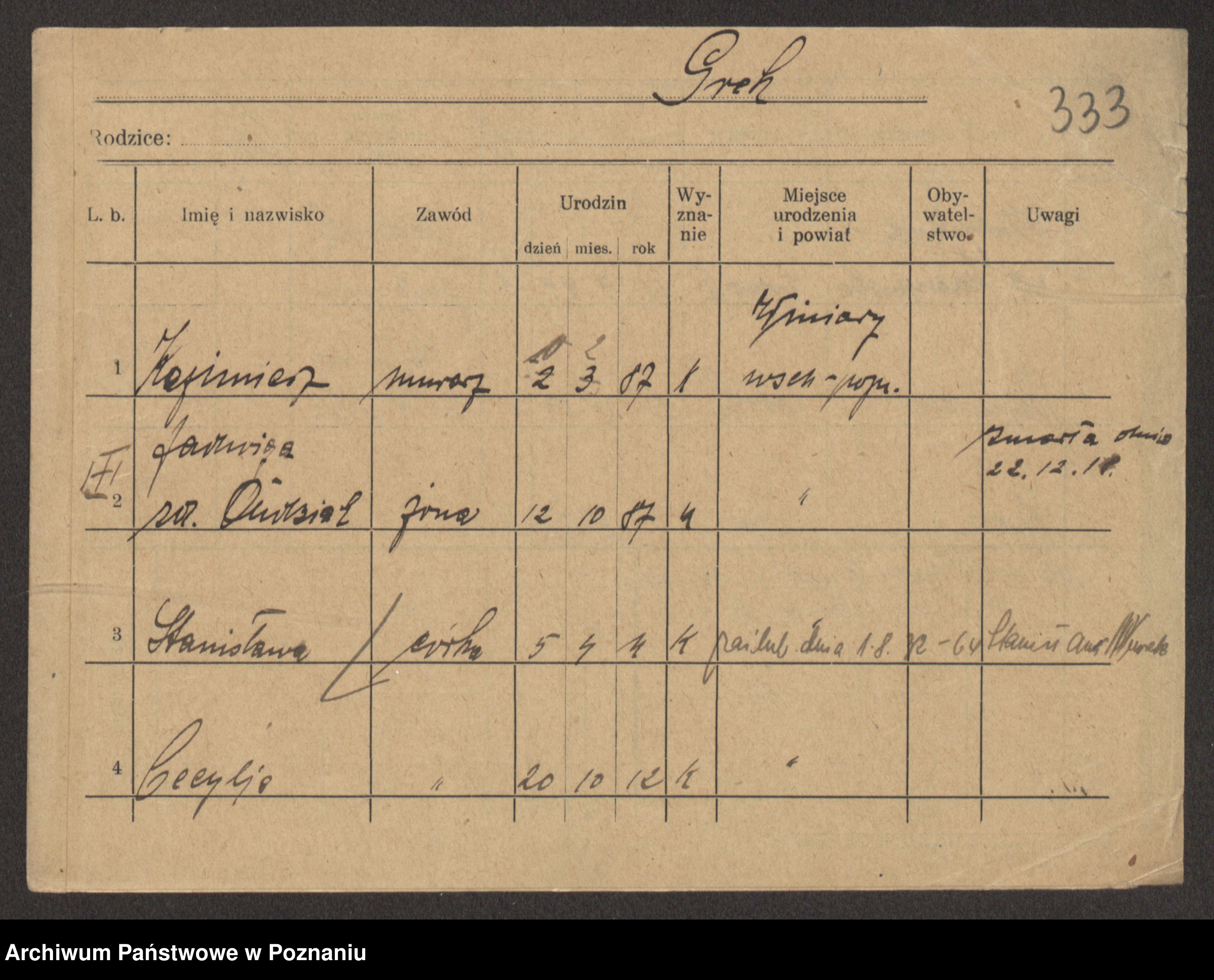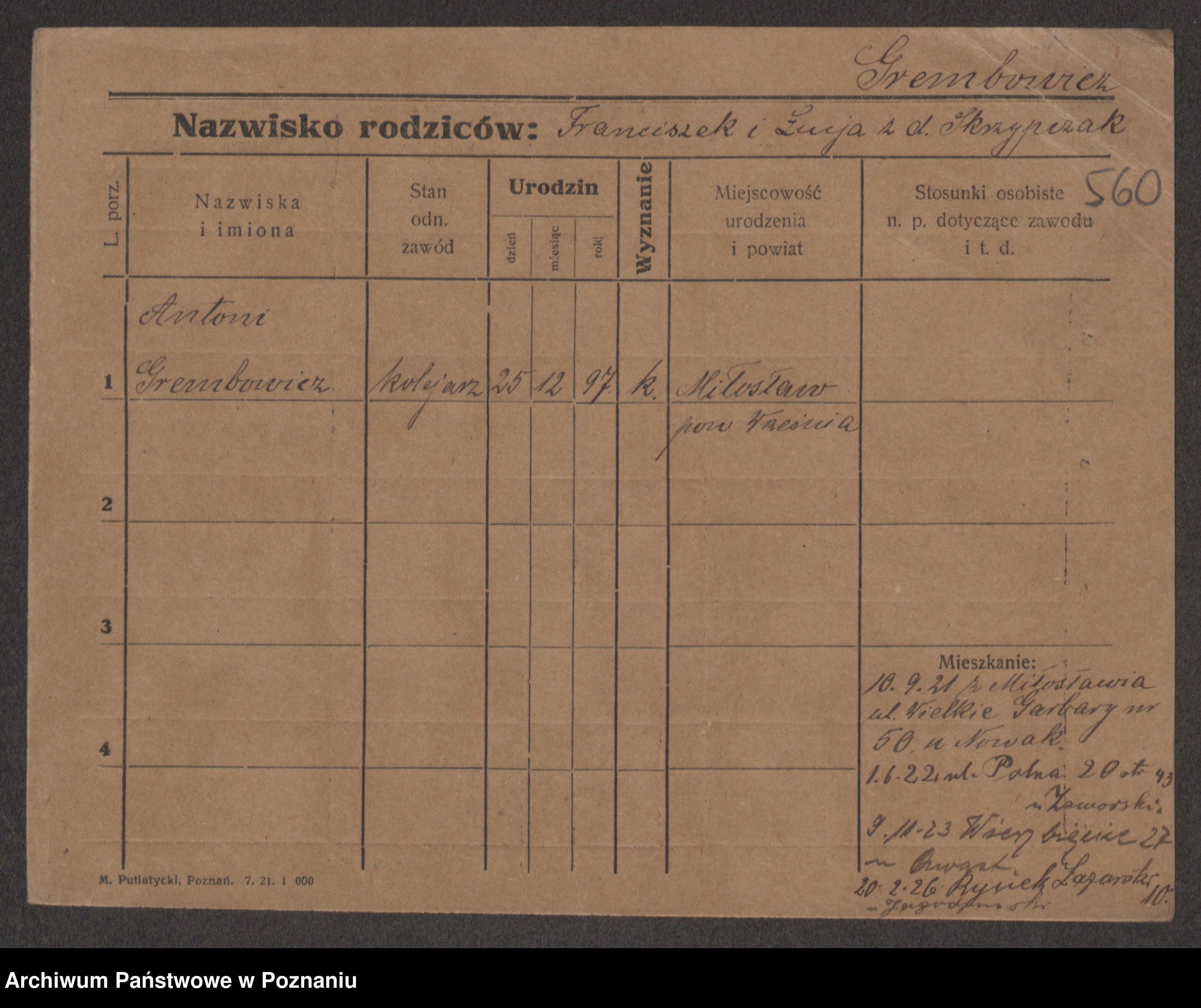 Podgląd karty osobowej dostępny jest po kliknięciu na nazwisko lub ikonkę karty. Można dokonywać powiększenia (ikony na górze) lub przechodzić między kolejnymi skanami (strzałki po bokach).
