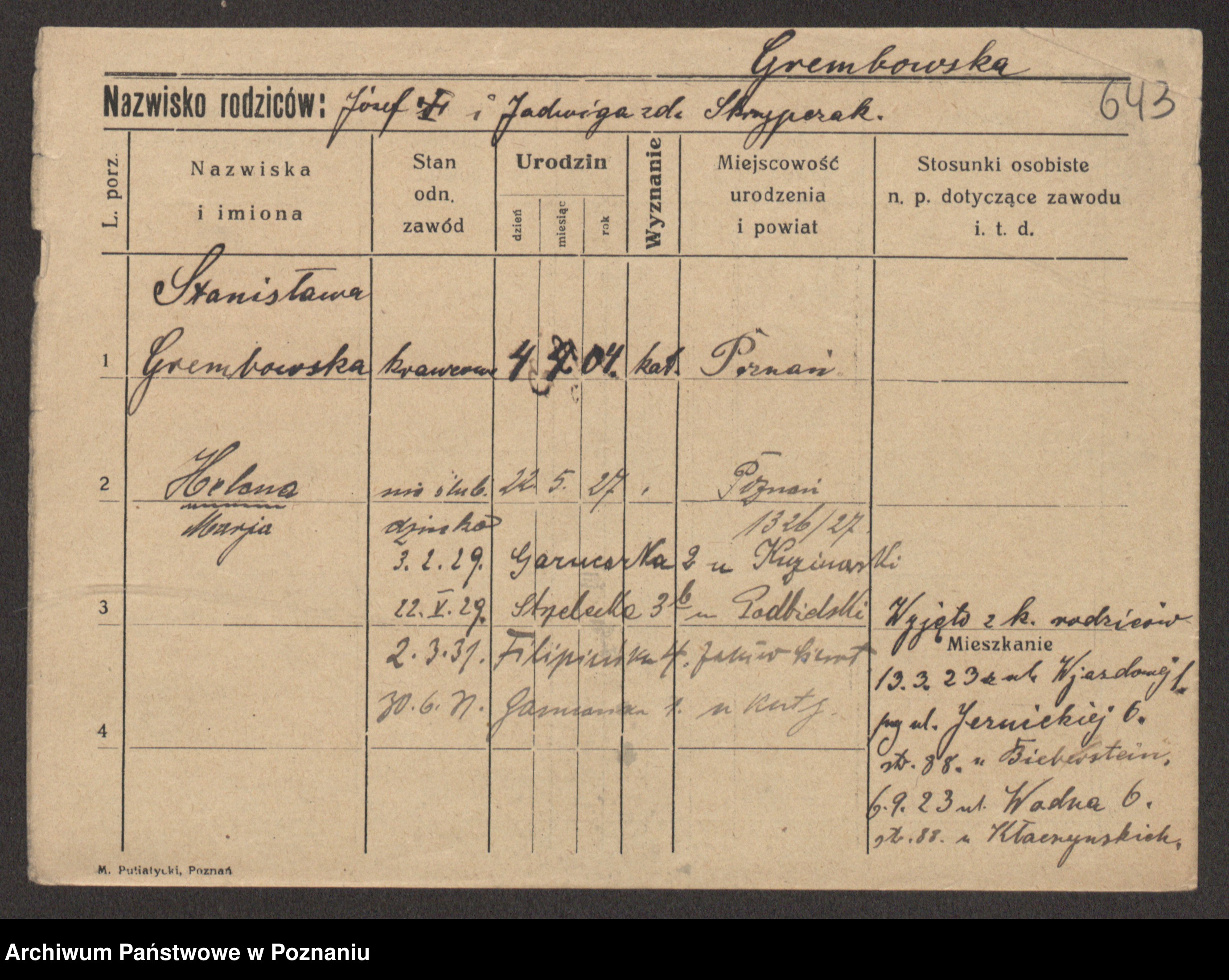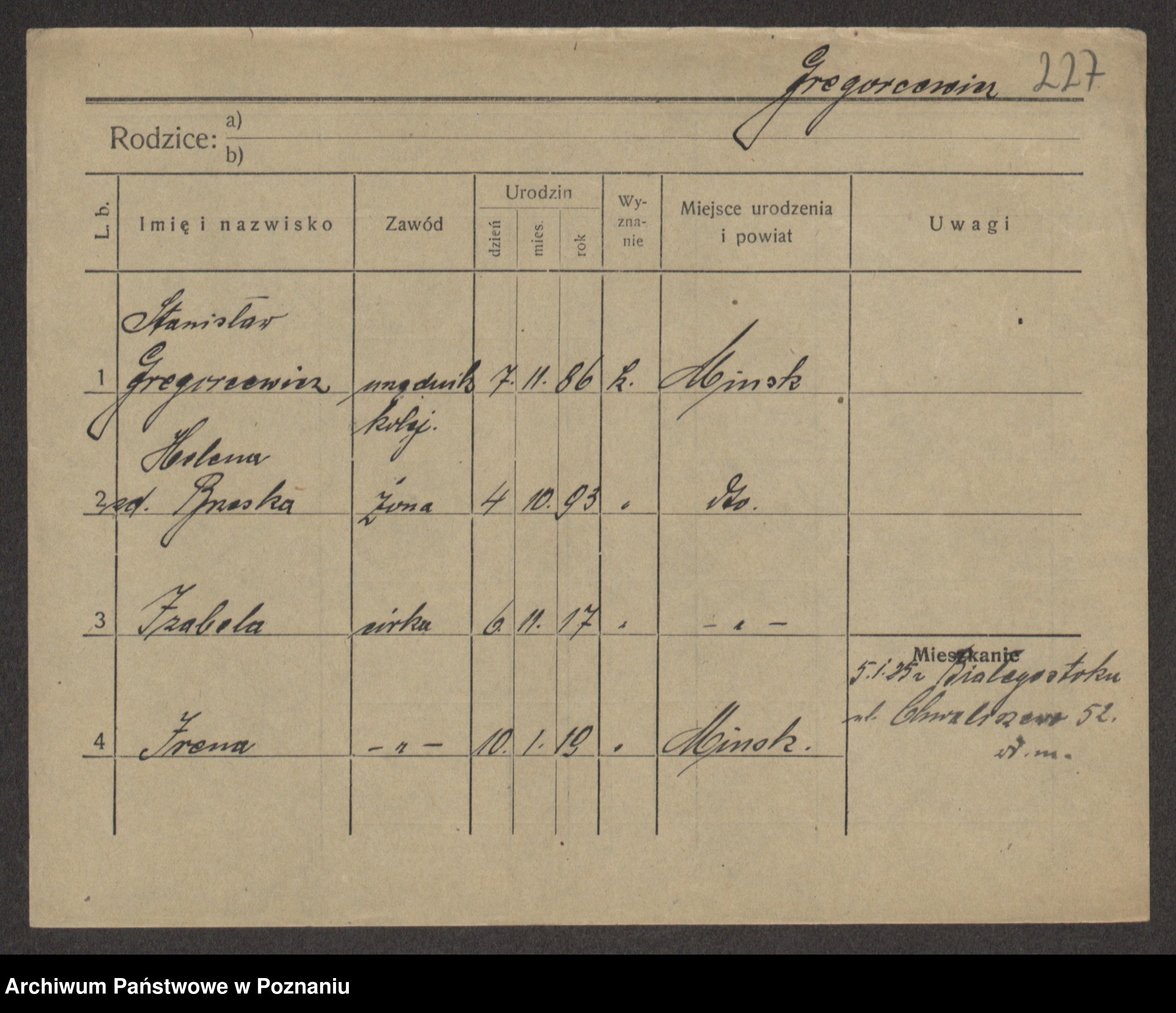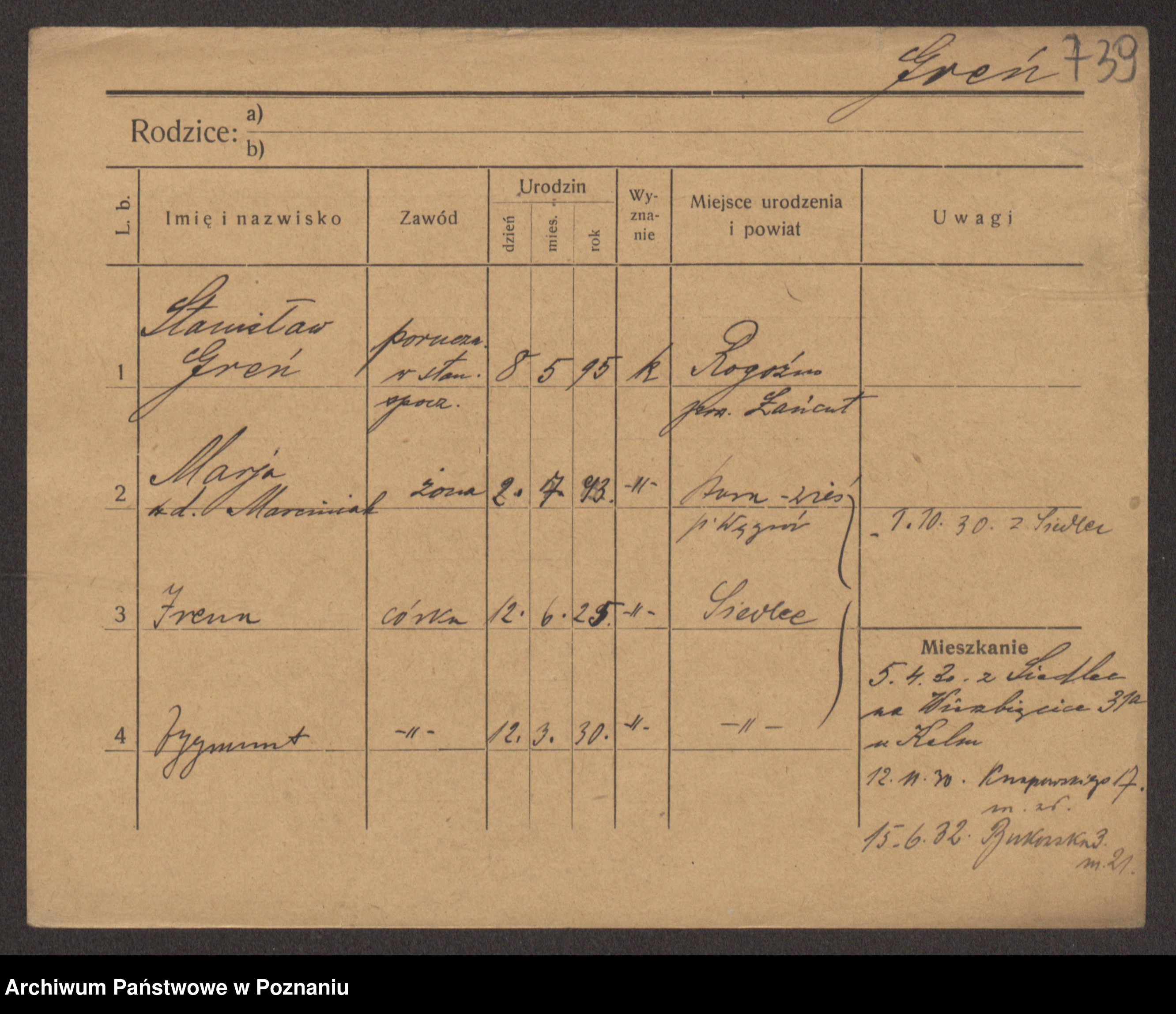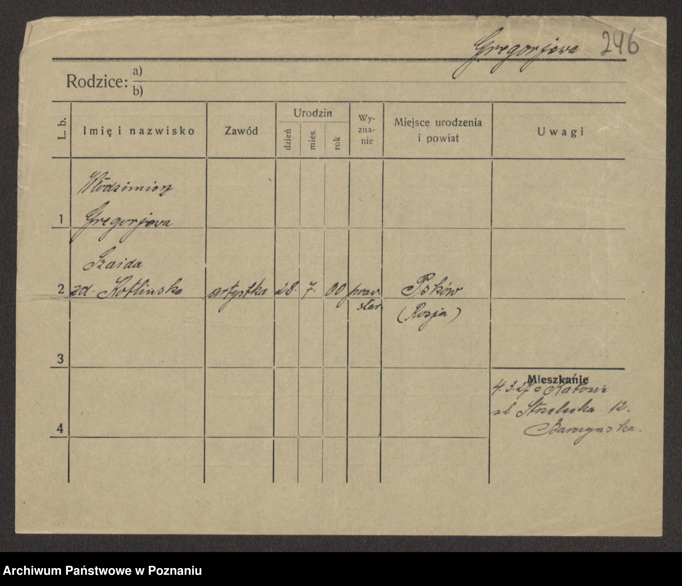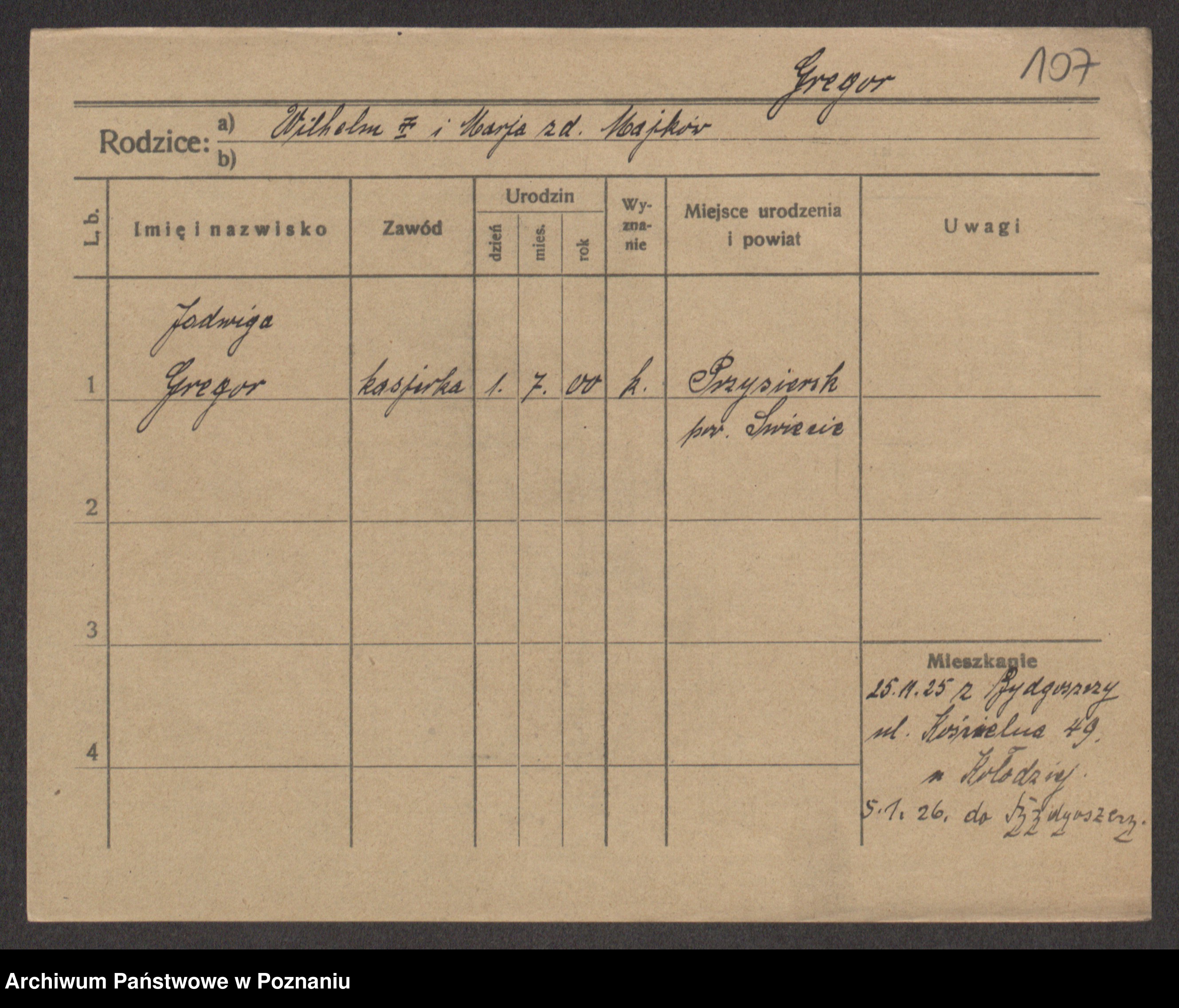 Podgląd karty osobowej dostępny jest po kliknięciu na nazwisko lub ikonkę karty. Można dokonywać powiększenia (ikony na górze) lub przechodzić między kolejnymi skanami (strzałki po bokach).