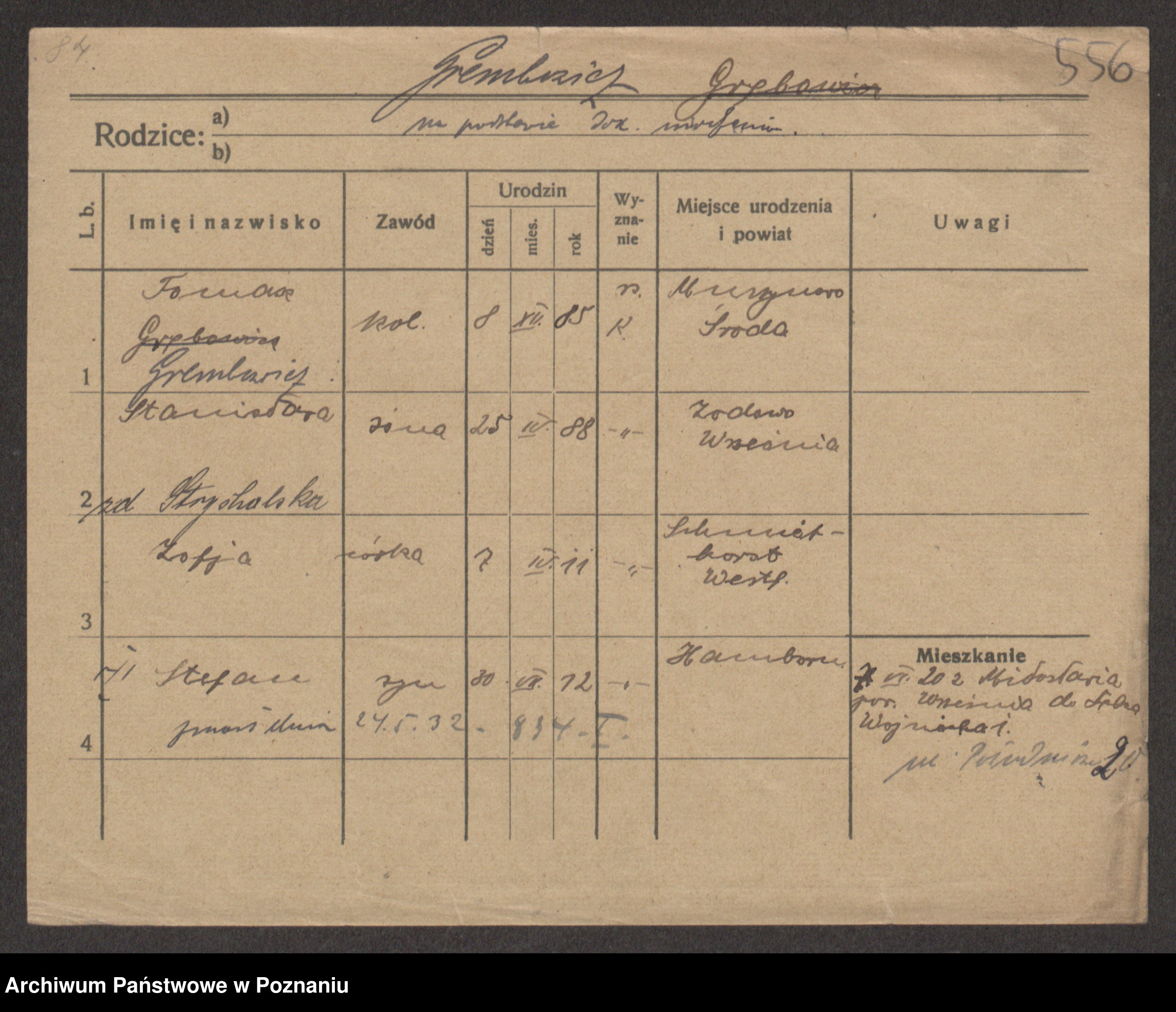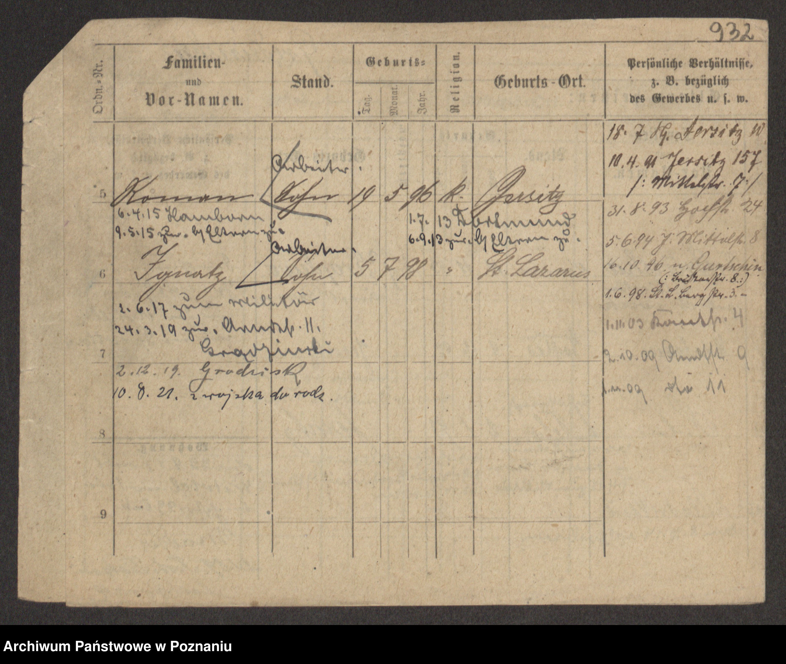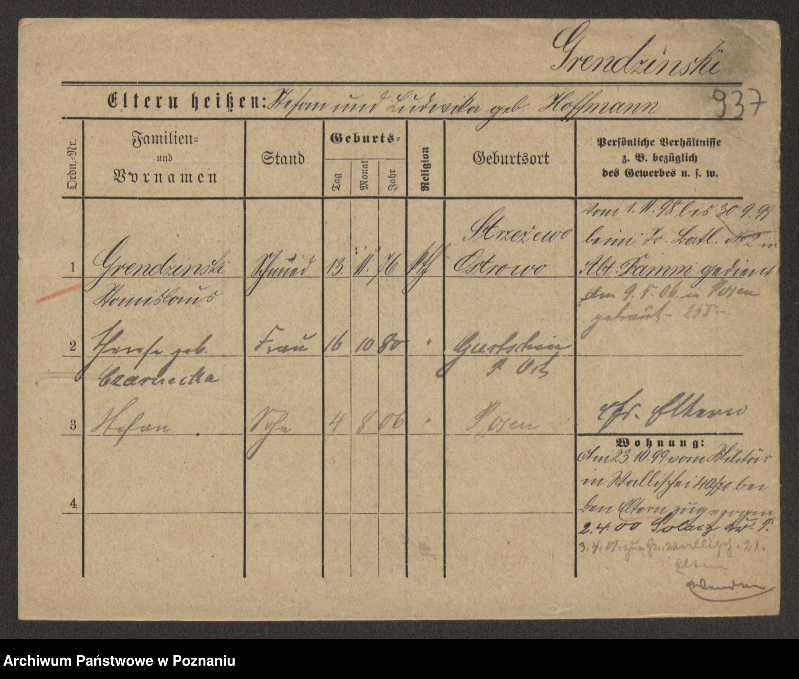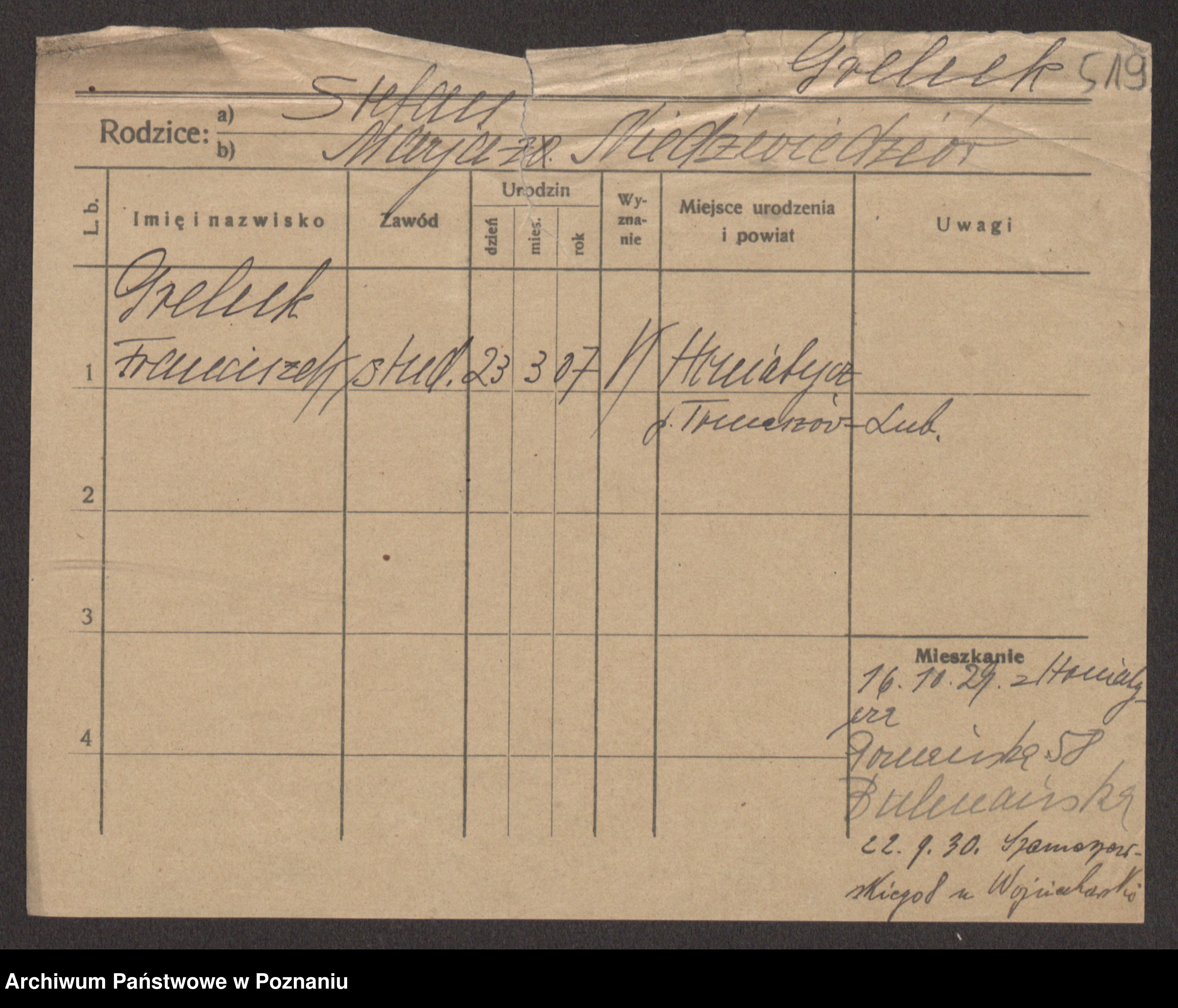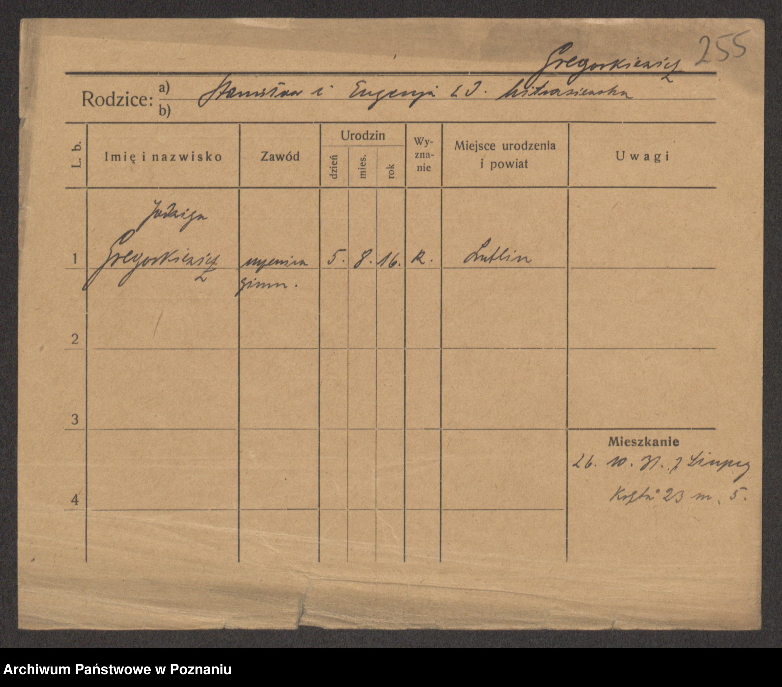Podgląd karty osobowej dostępny jest po kliknięciu na nazwisko lub ikonkę karty. Można dokonywać powiększenia (ikony na górze) lub przechodzić między kolejnymi skanami (strzałki po bokach).