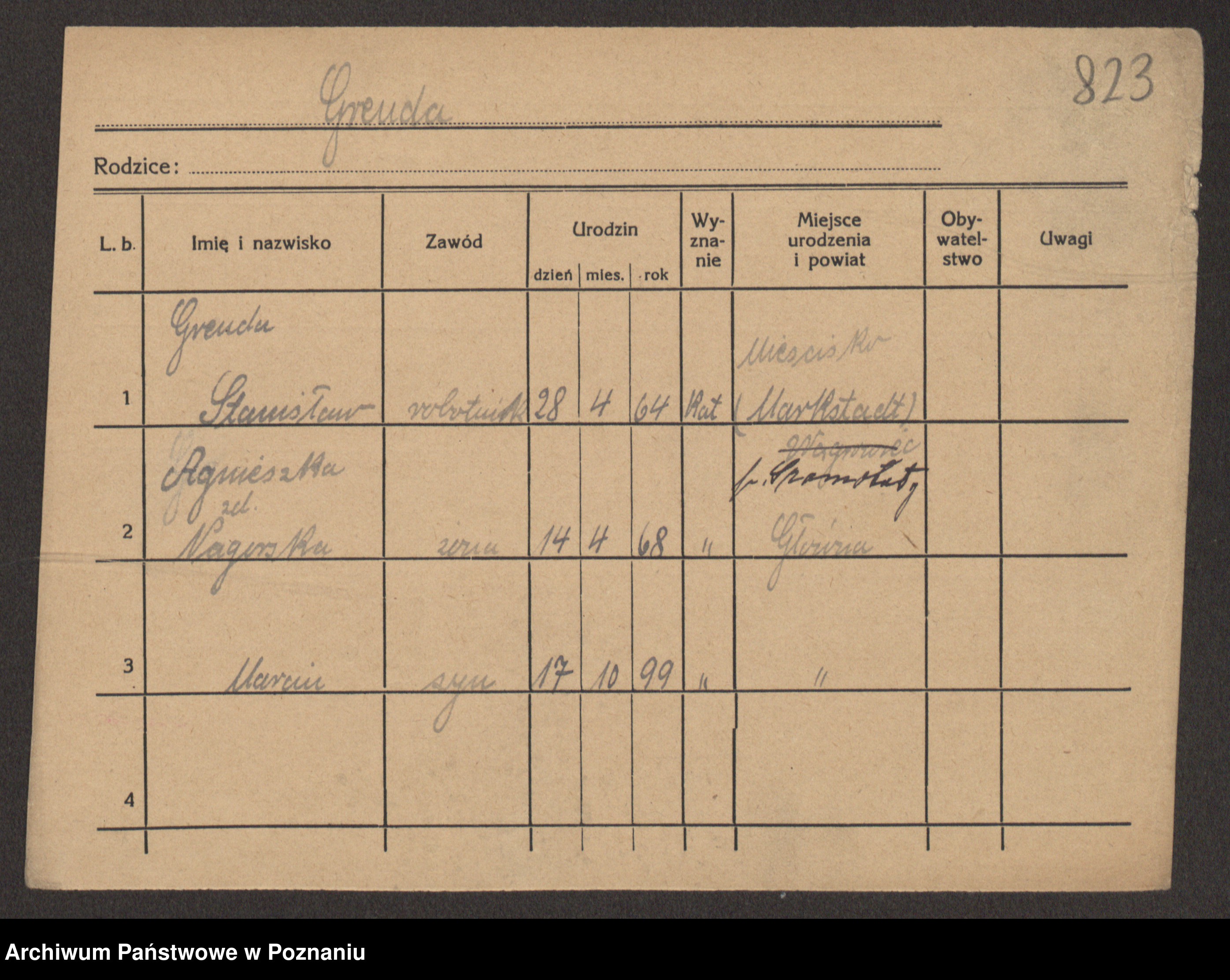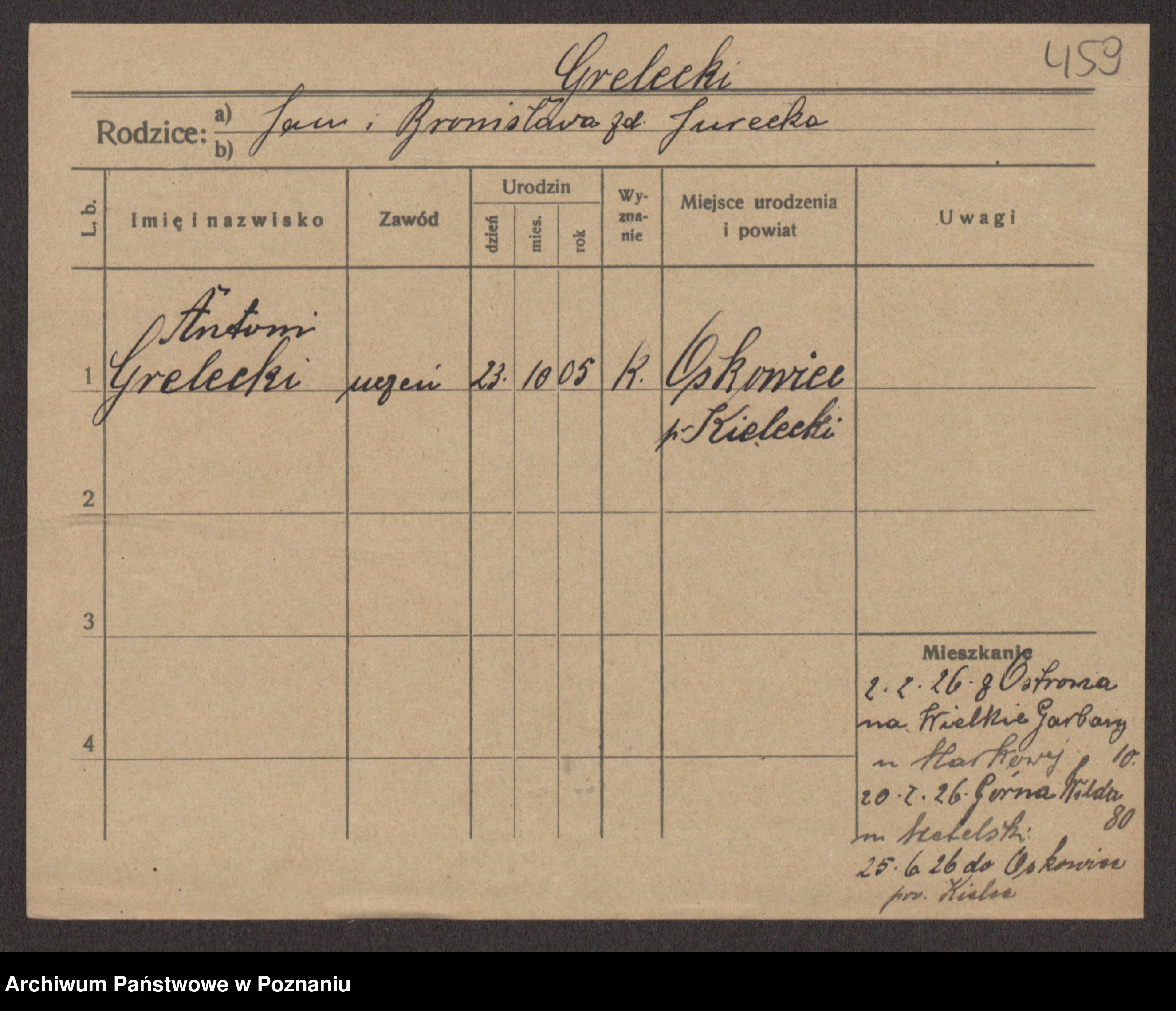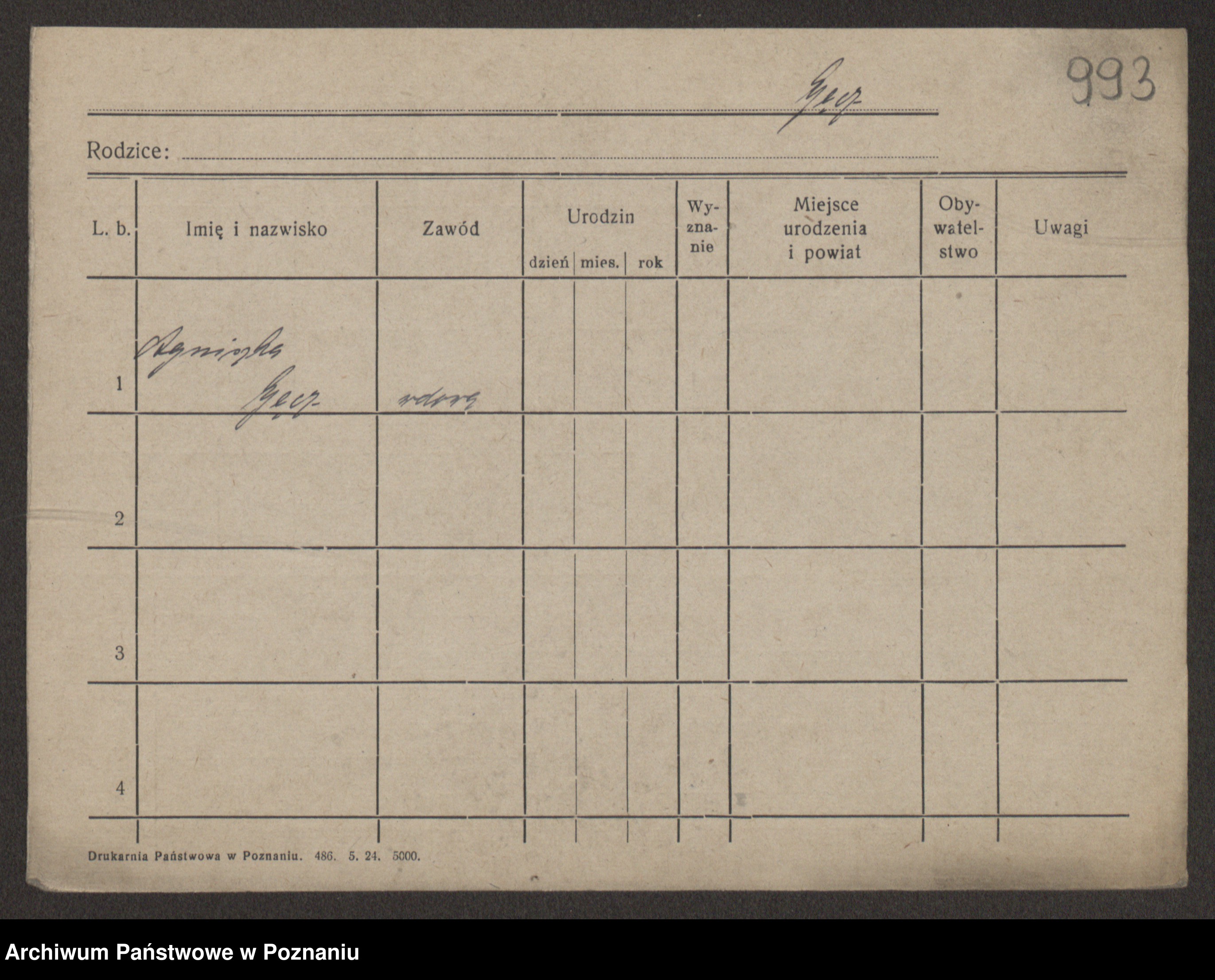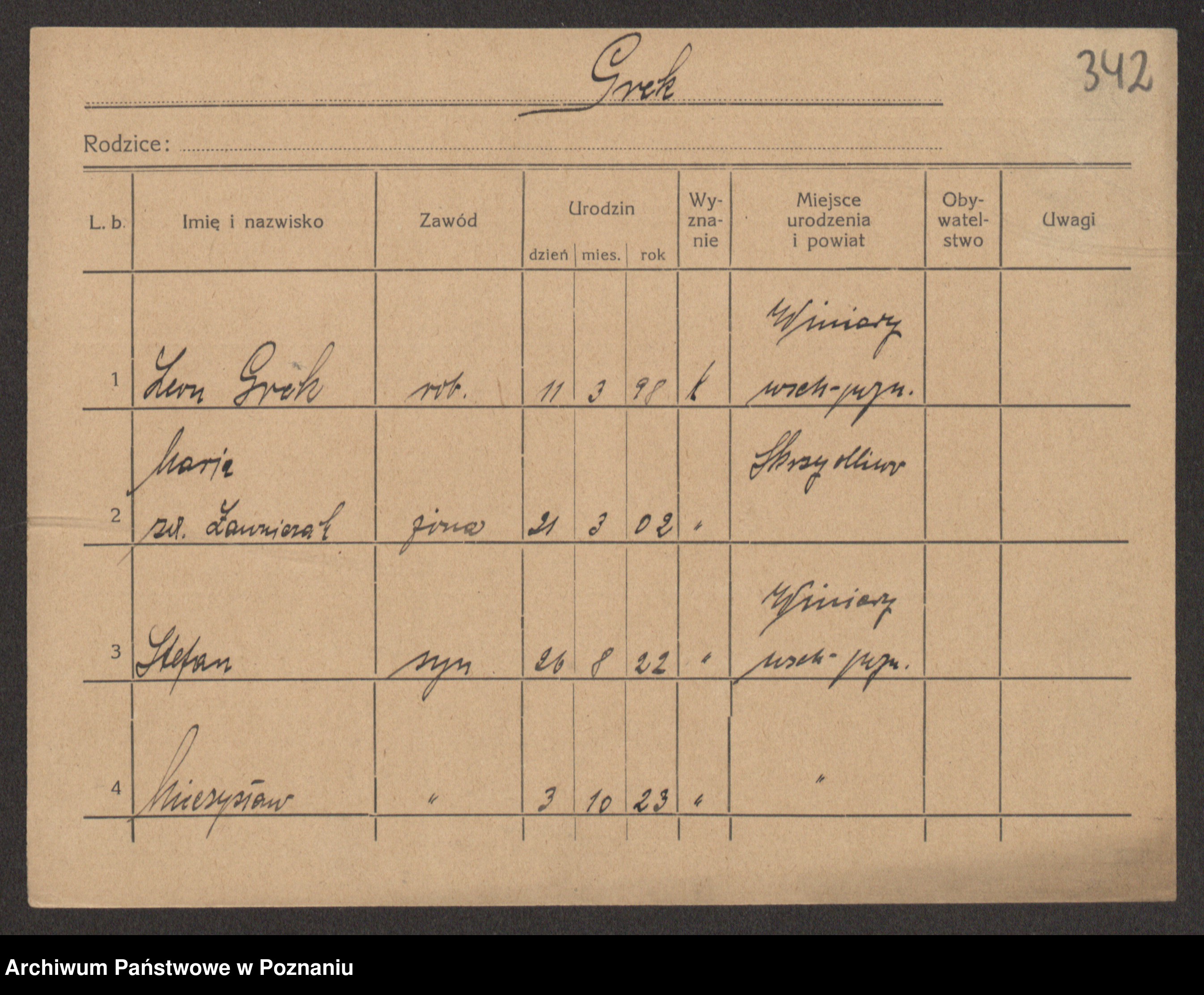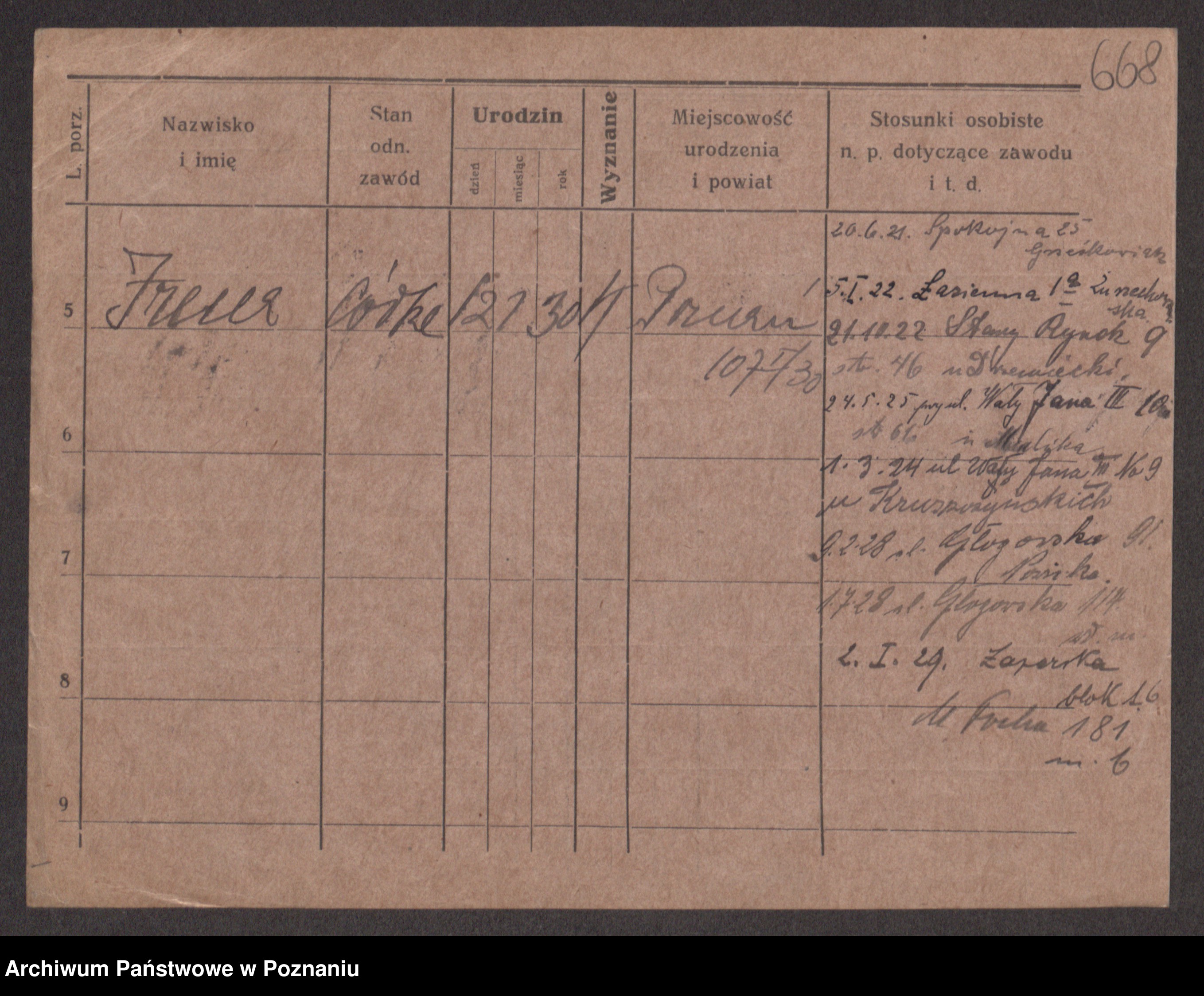 Podgląd karty osobowej dostępny jest po kliknięciu na nazwisko lub ikonkę karty. Można dokonywać powiększenia (ikony na górze) lub przechodzić między kolejnymi skanami (strzałki po bokach).