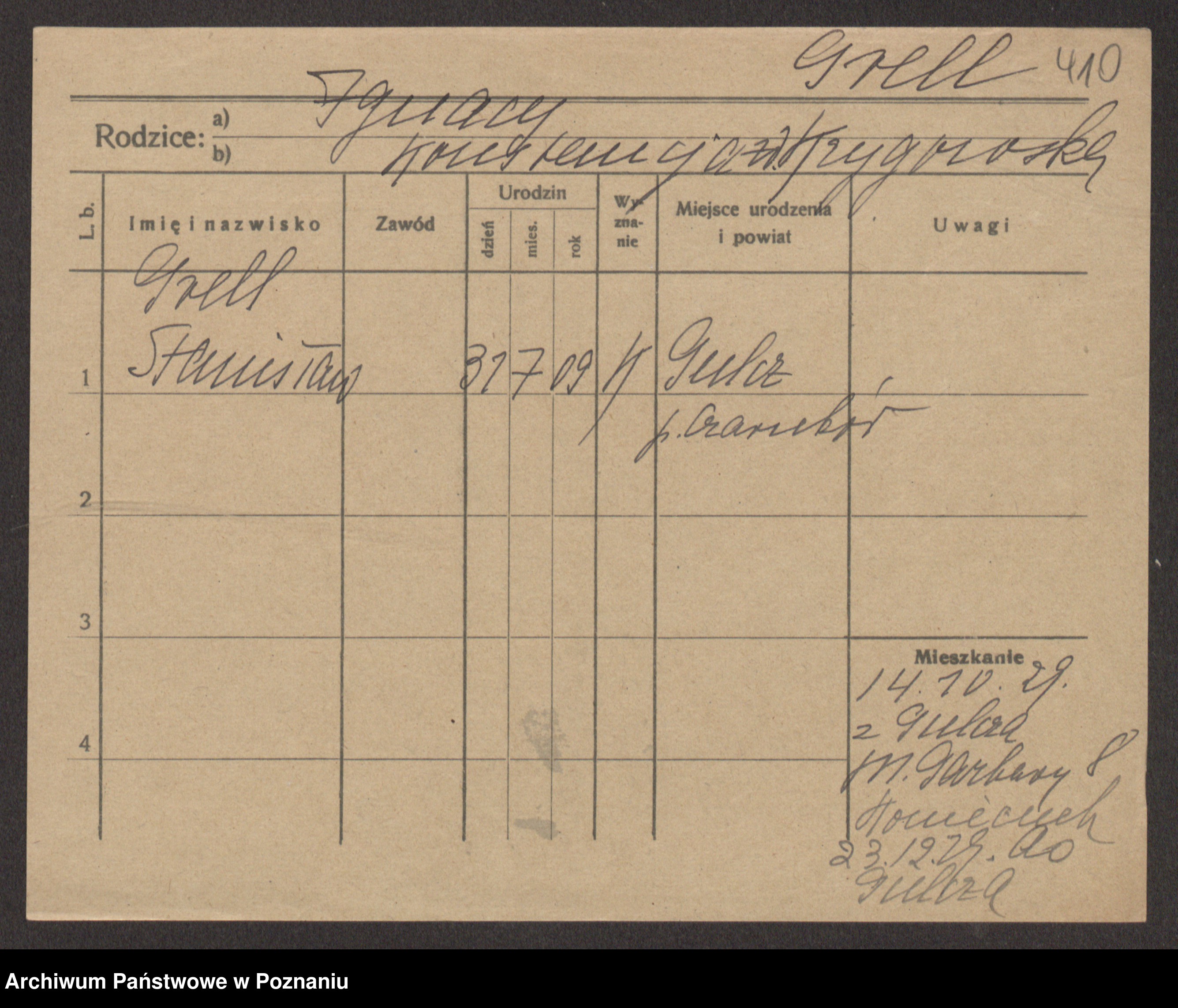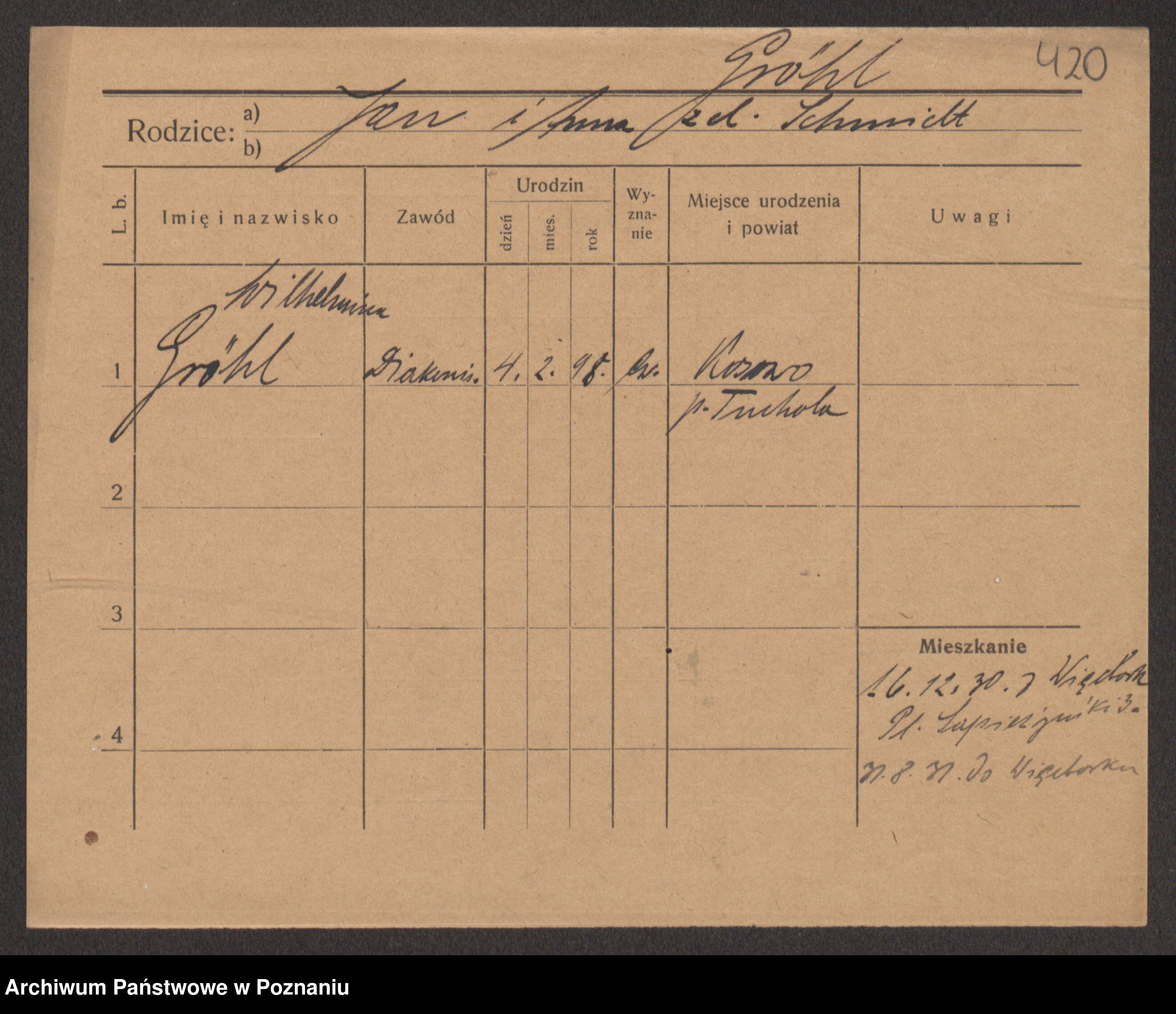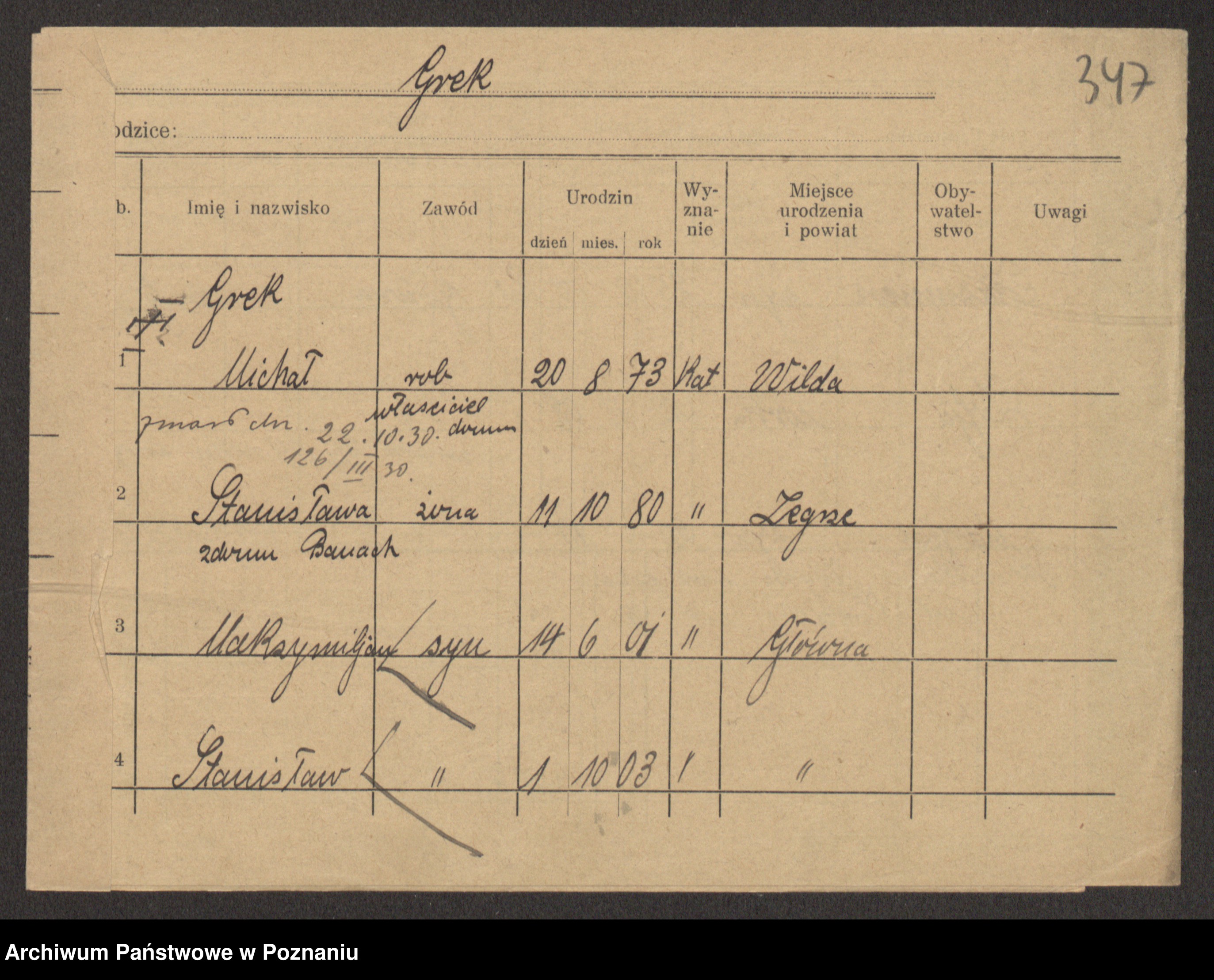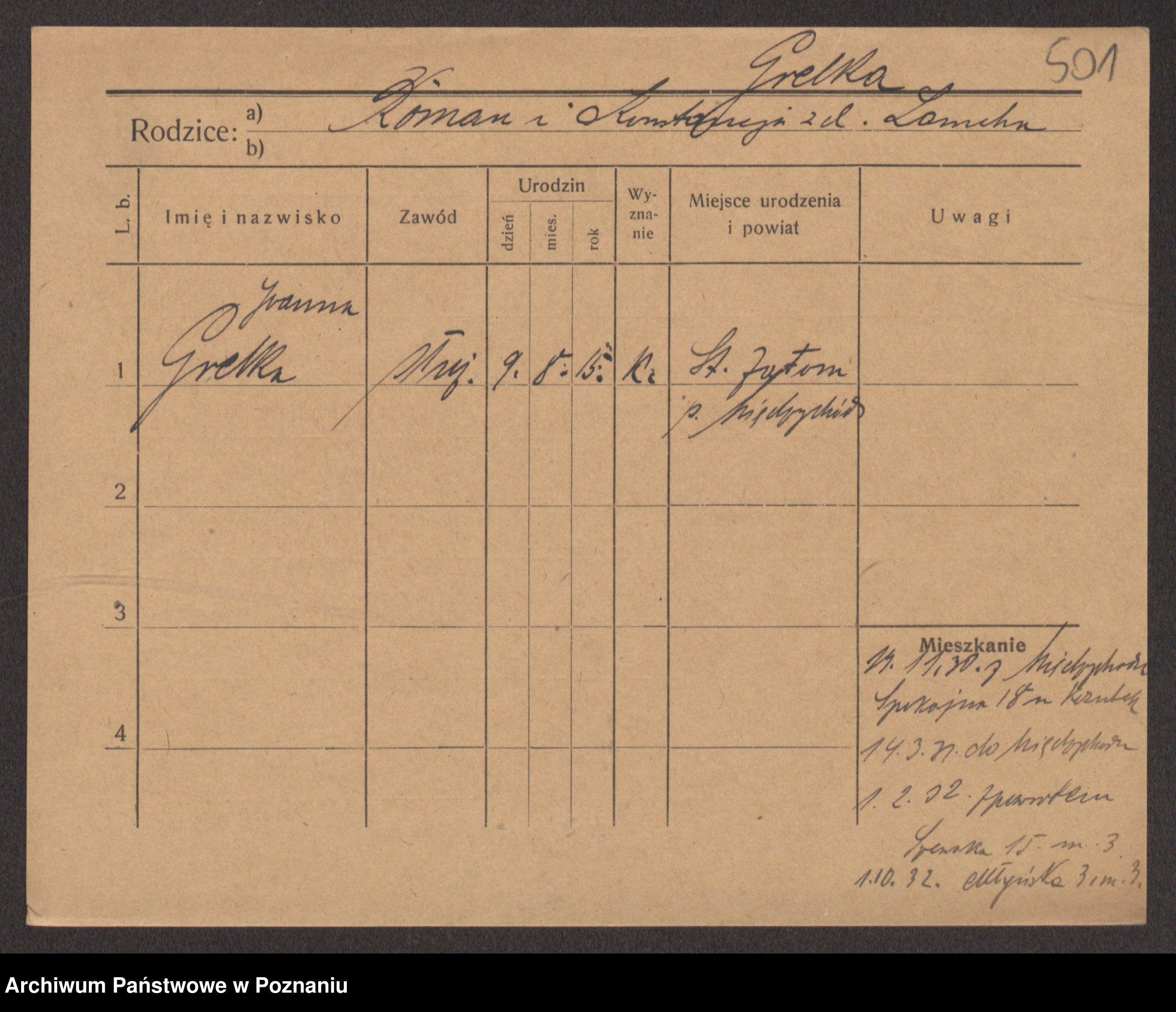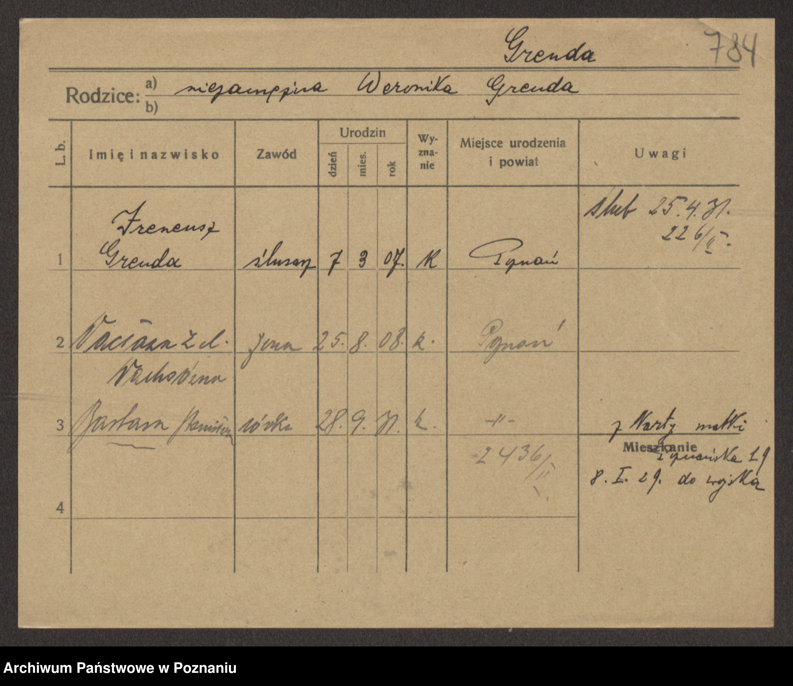 Podgląd karty osobowej dostępny jest po kliknięciu na nazwisko lub ikonkę karty. Można dokonywać powiększenia (ikony na górze) lub przechodzić między kolejnymi skanami (strzałki po bokach).