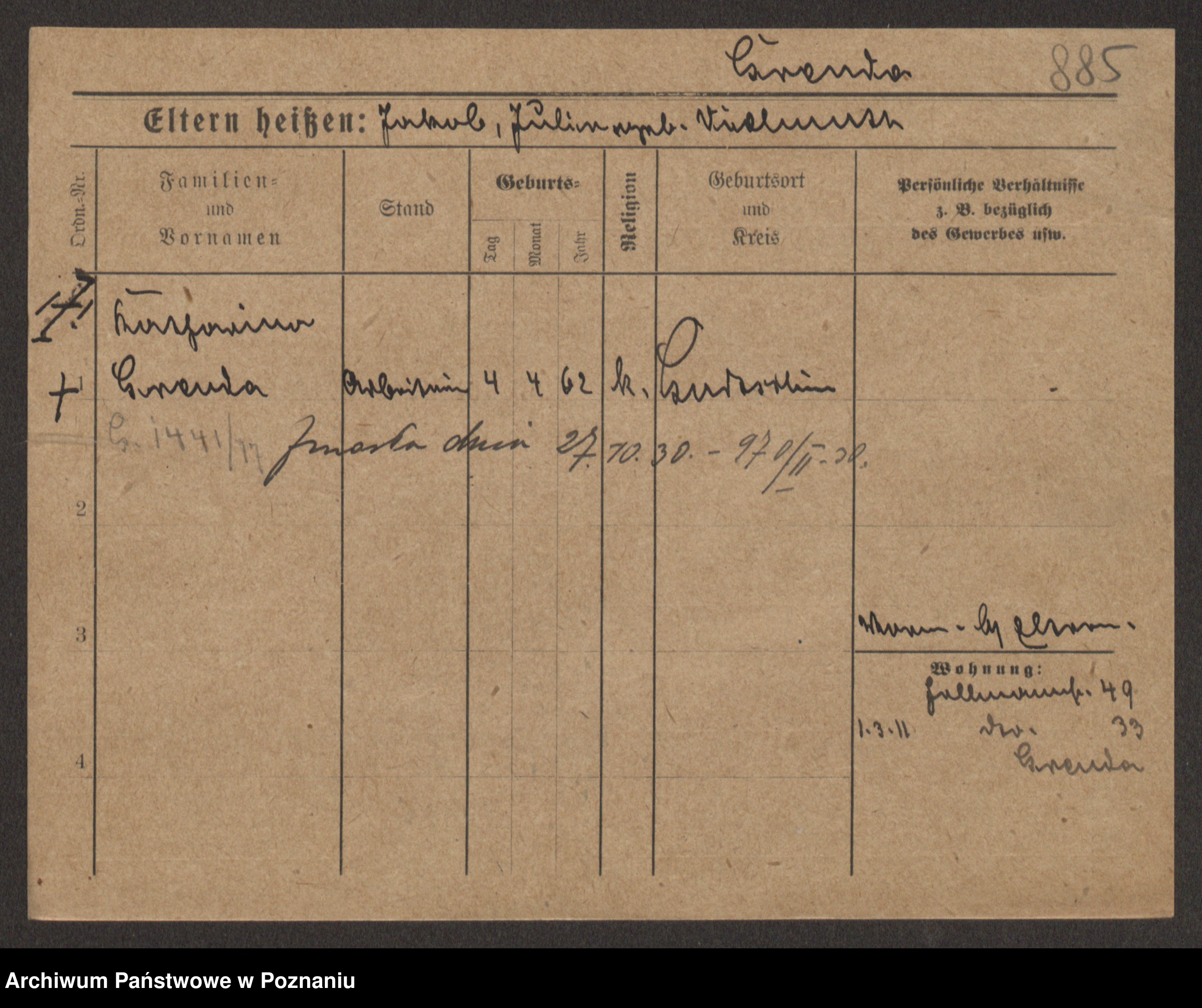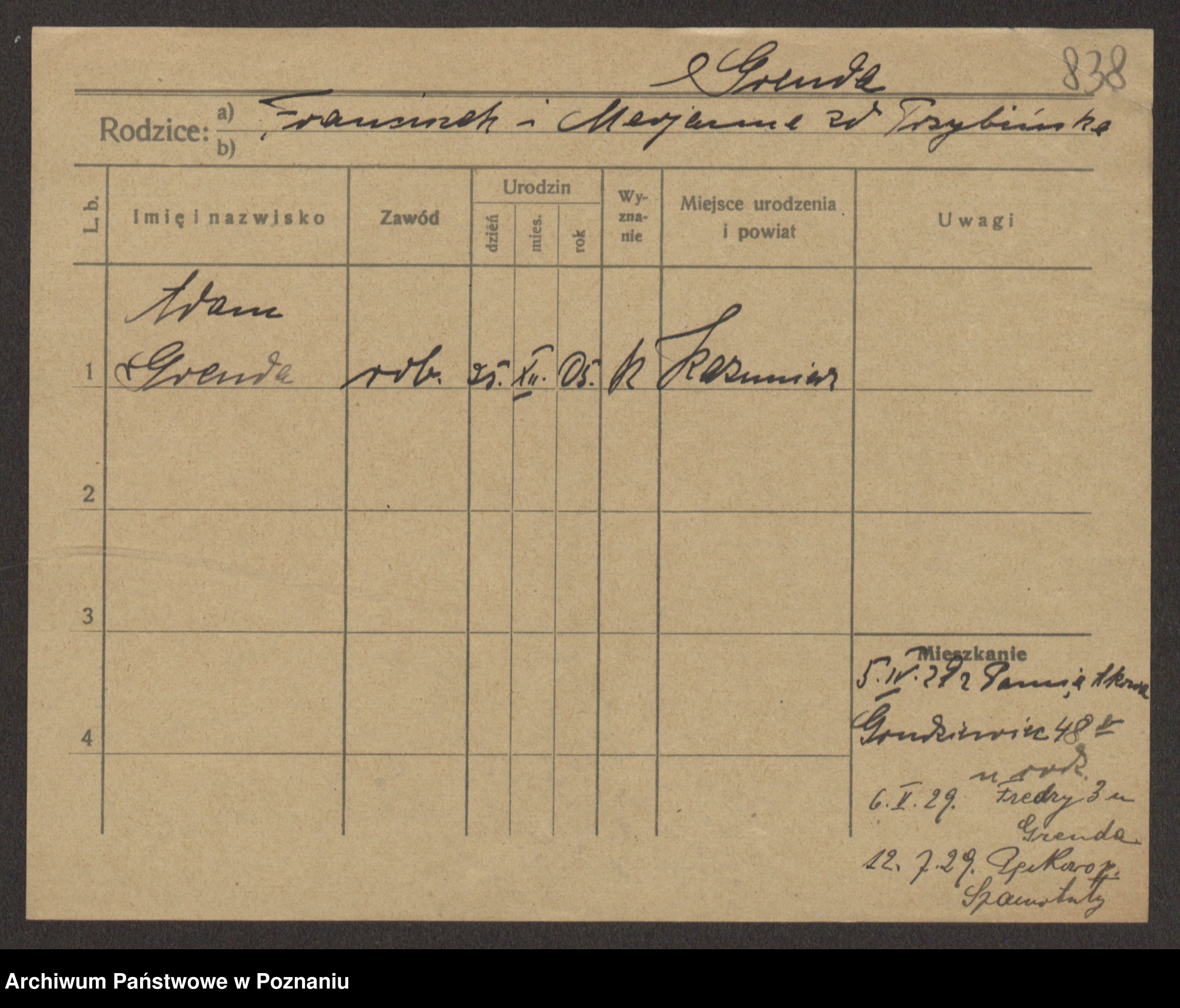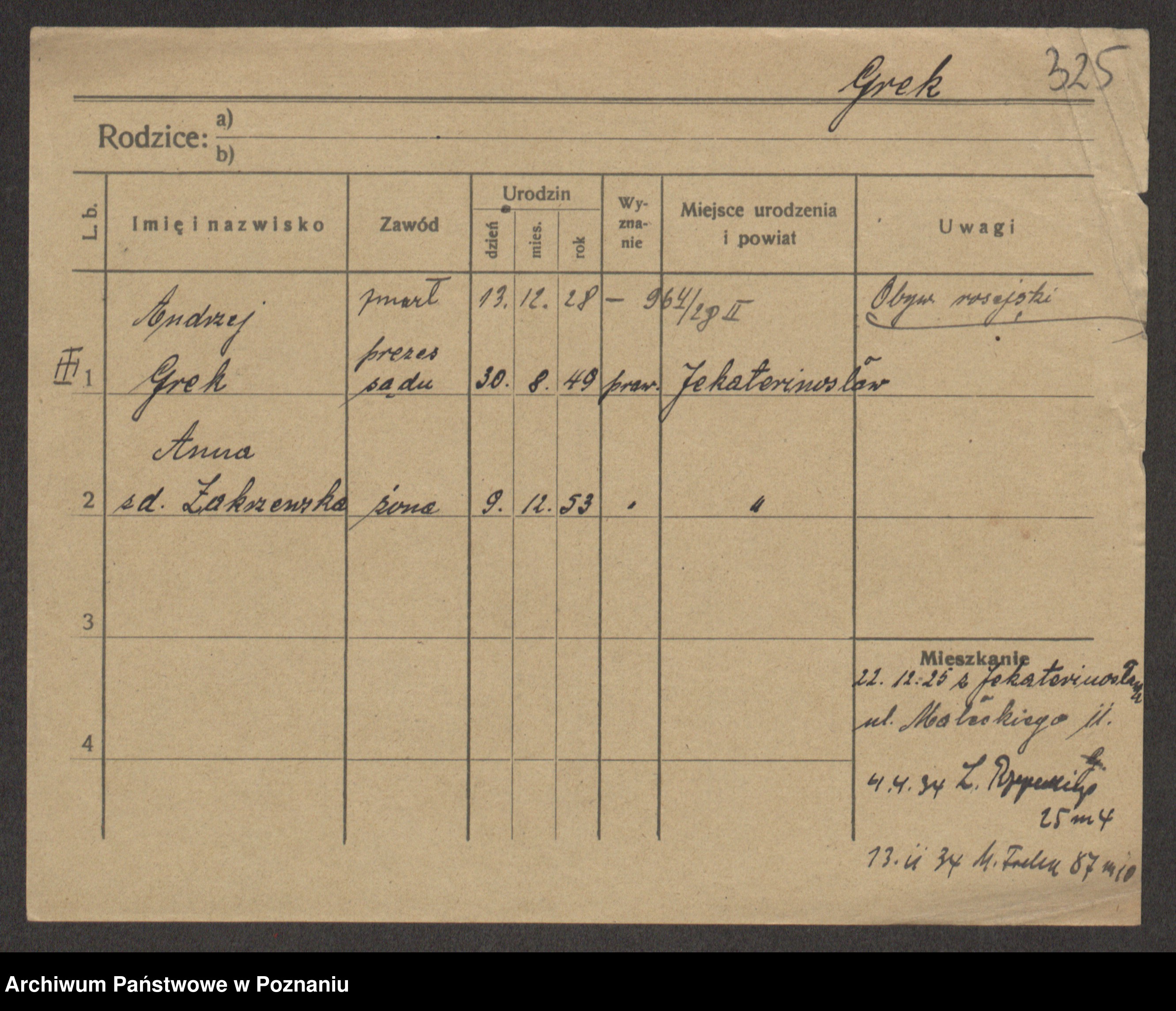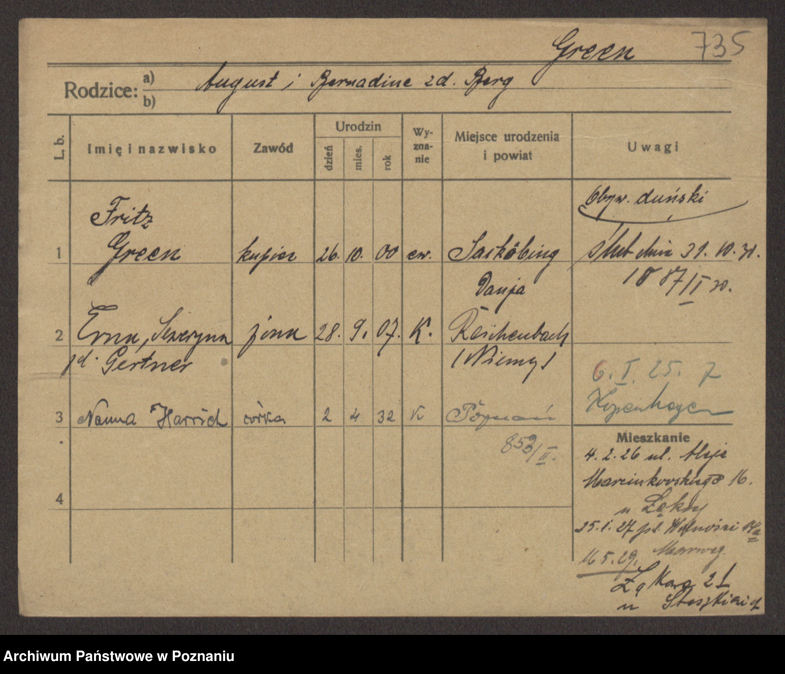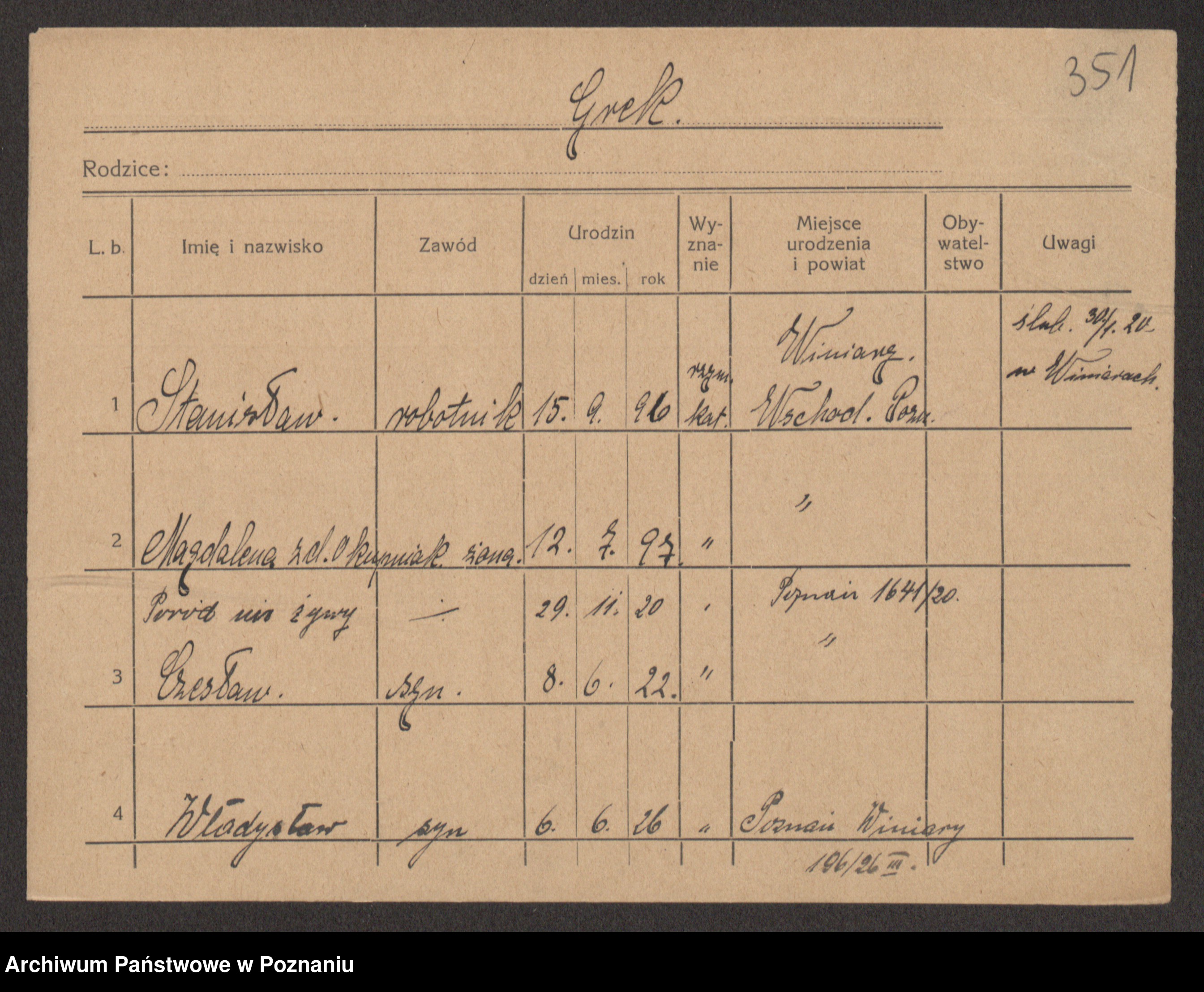 Podgląd karty osobowej dostępny jest po kliknięciu na nazwisko lub ikonkę karty. Można dokonywać powiększenia (ikony na górze) lub przechodzić między kolejnymi skanami (strzałki po bokach).