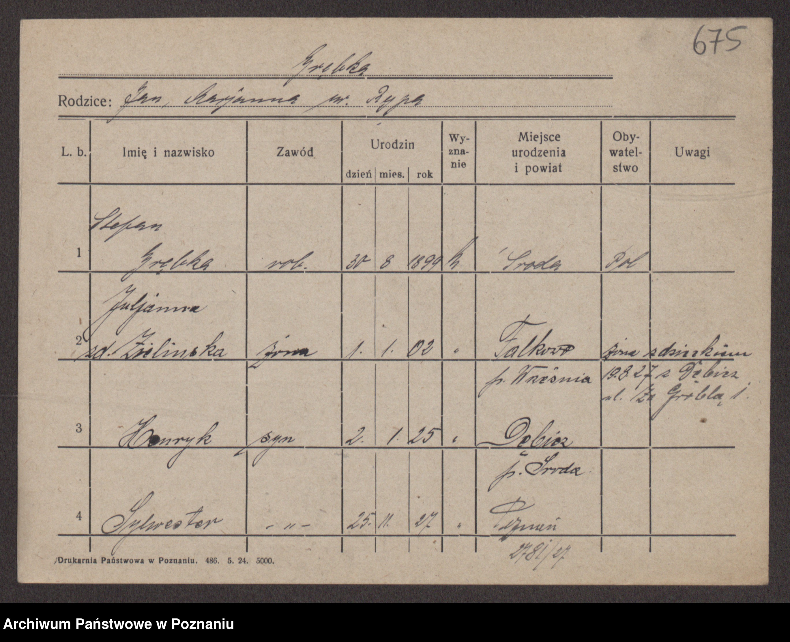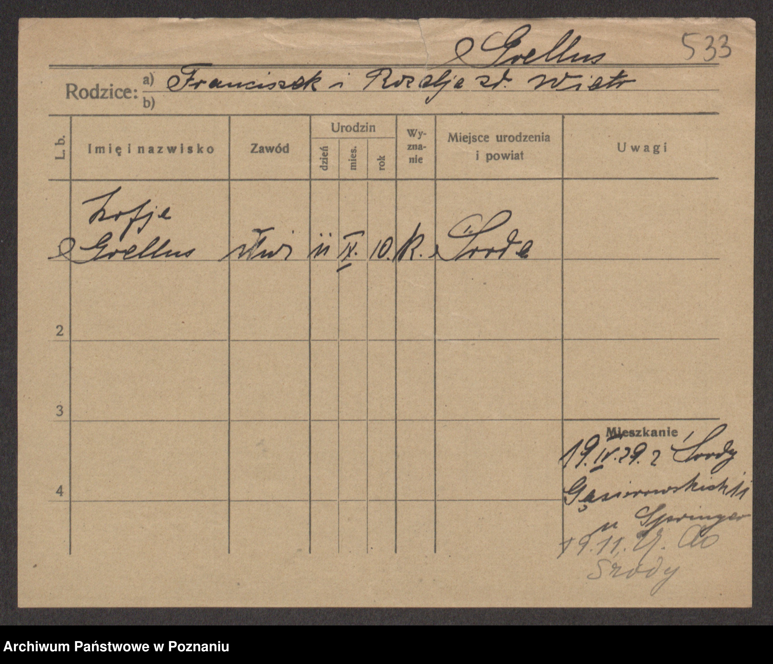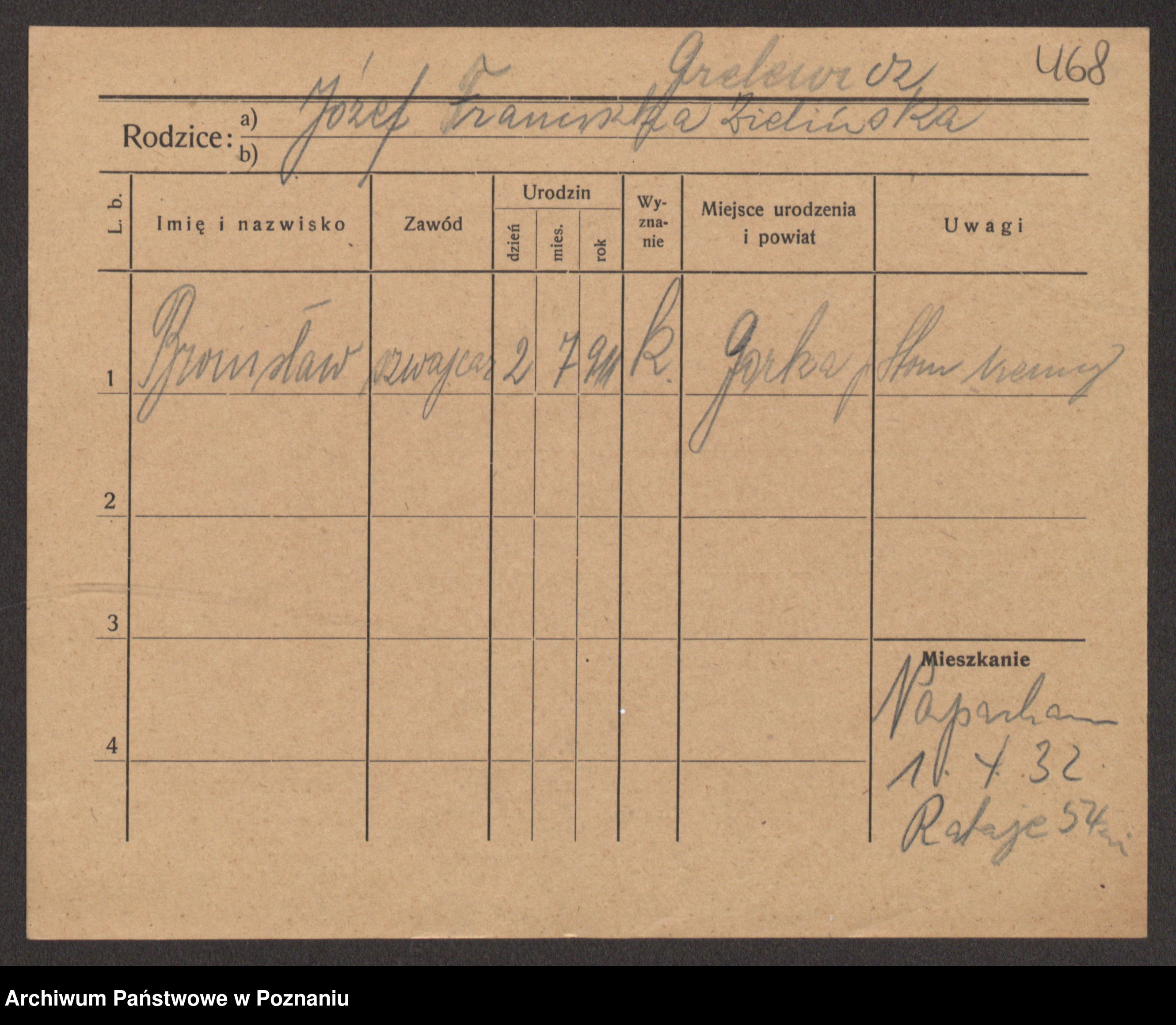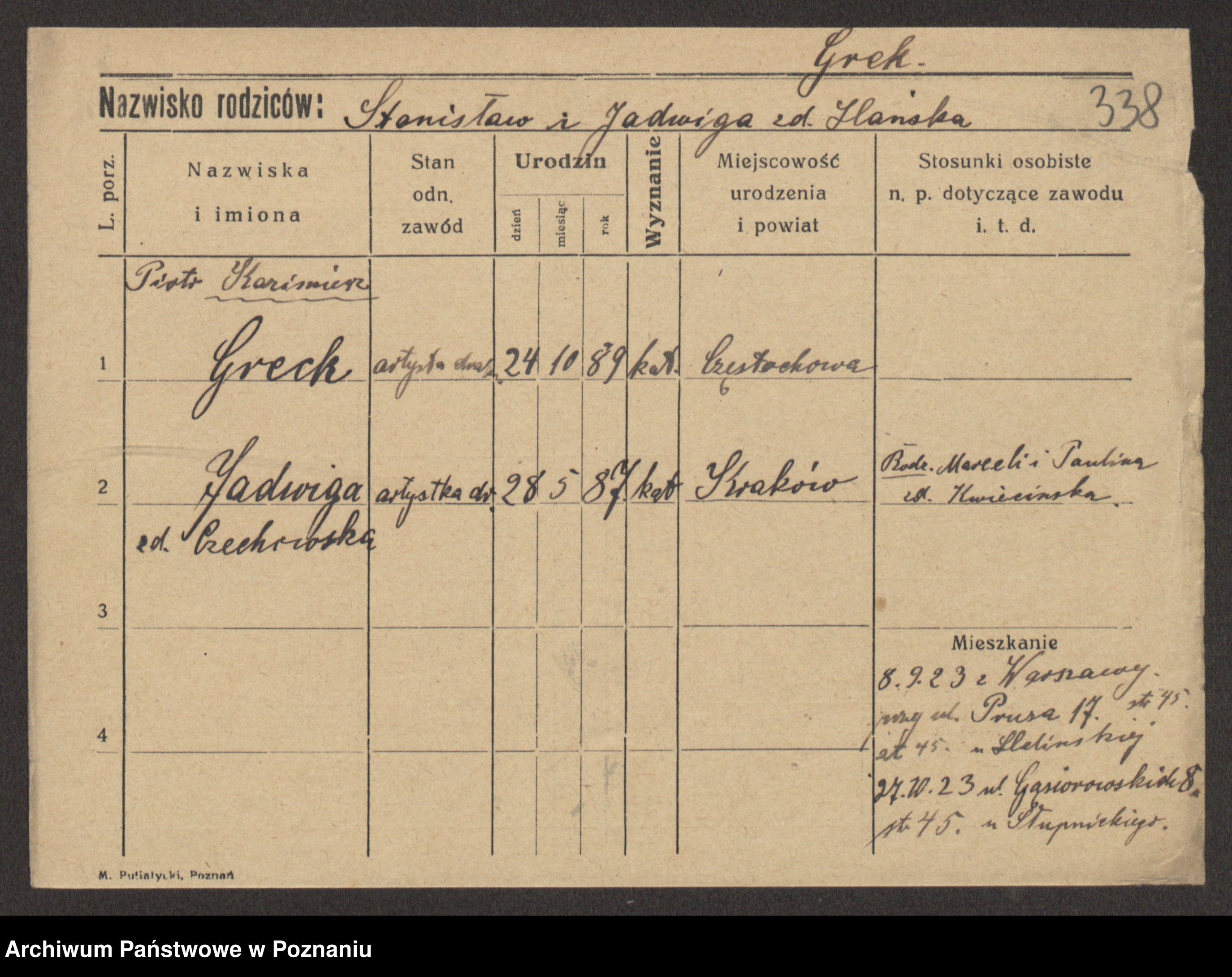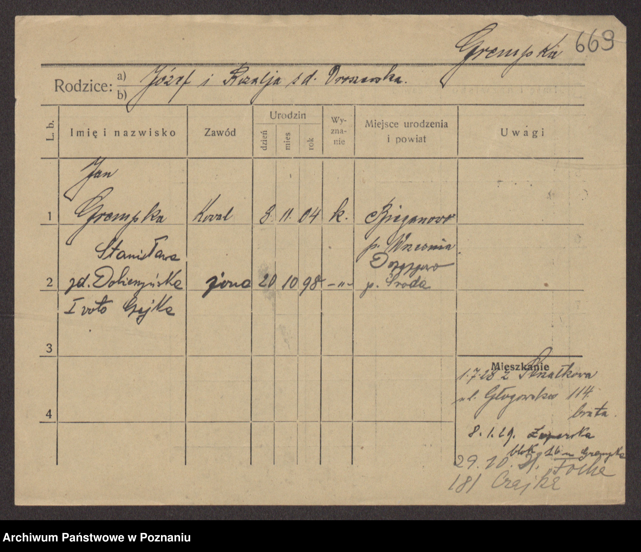 Podgląd karty osobowej dostępny jest po kliknięciu na nazwisko lub ikonkę karty. Można dokonywać powiększenia (ikony na górze) lub przechodzić między kolejnymi skanami (strzałki po bokach).