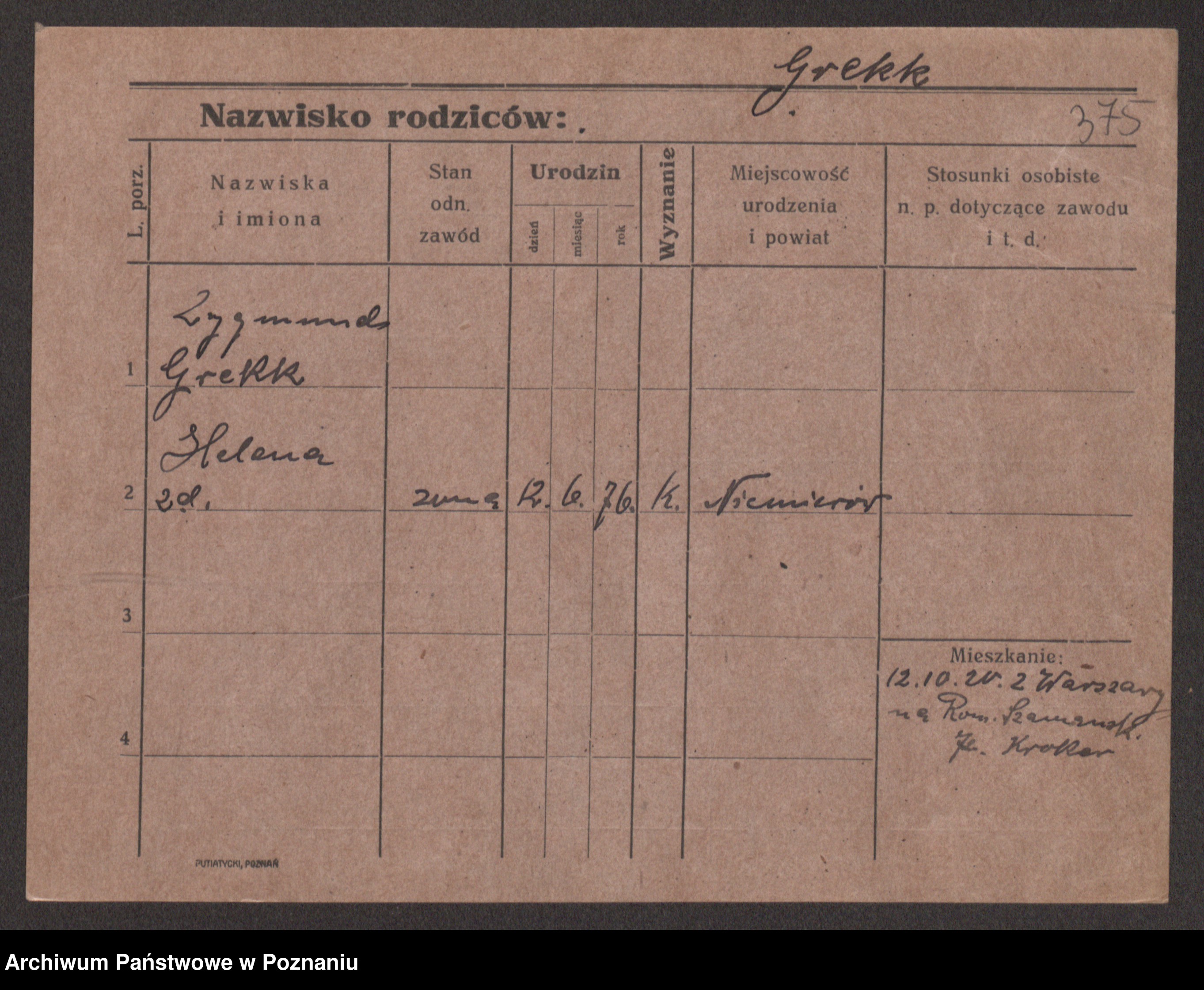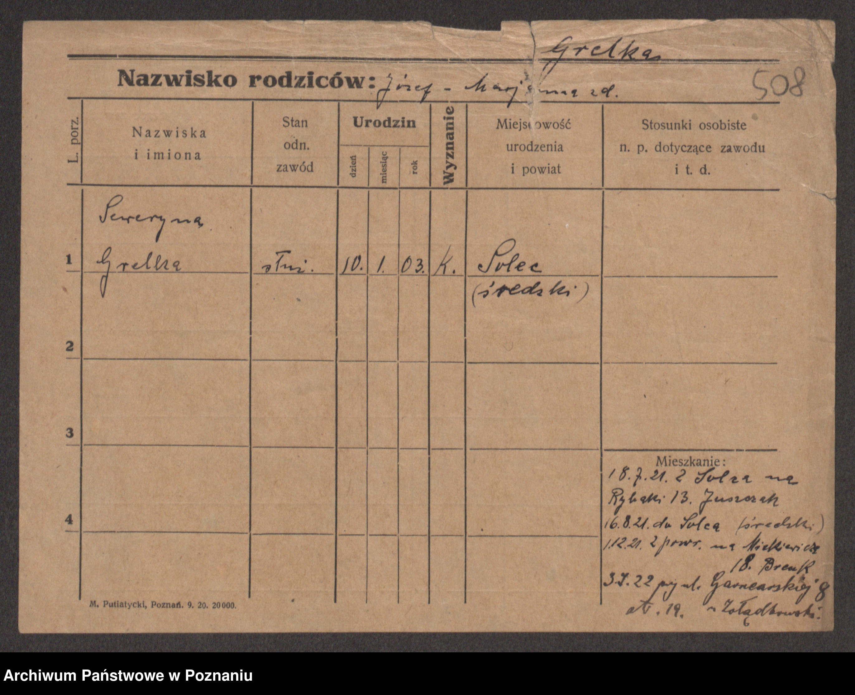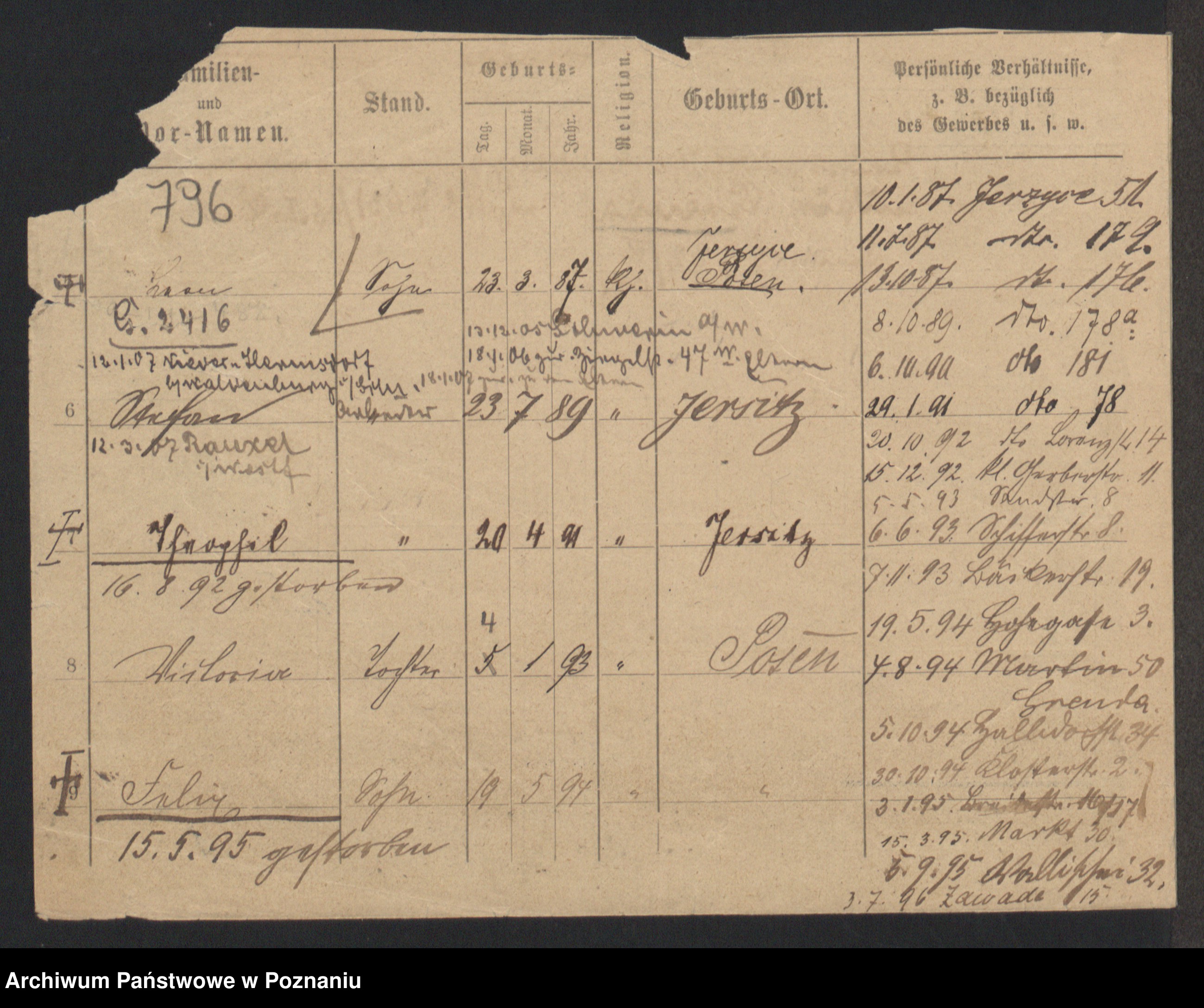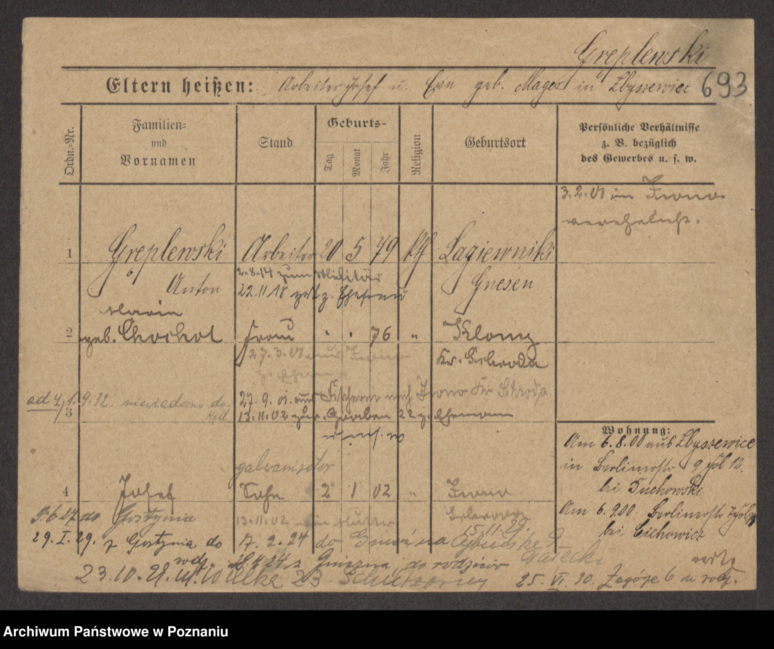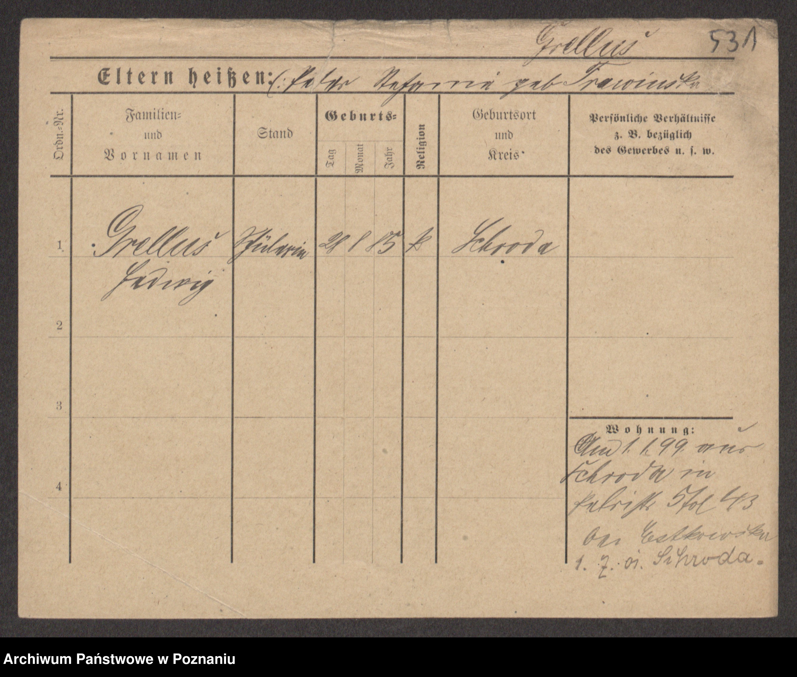 Podgląd karty osobowej dostępny jest po kliknięciu na nazwisko lub ikonkę karty. Można dokonywać powiększenia (ikony na górze) lub przechodzić między kolejnymi skanami (strzałki po bokach).