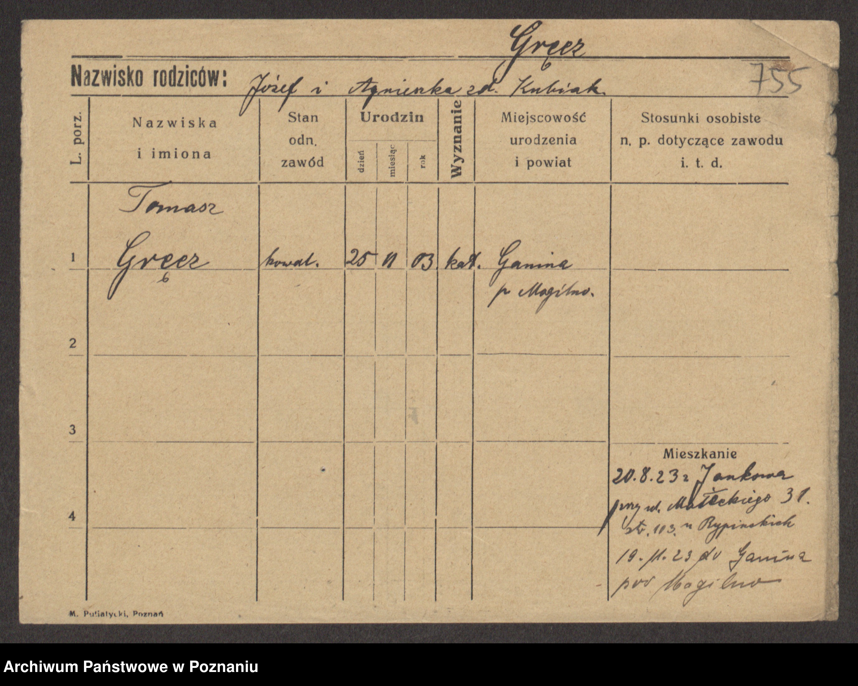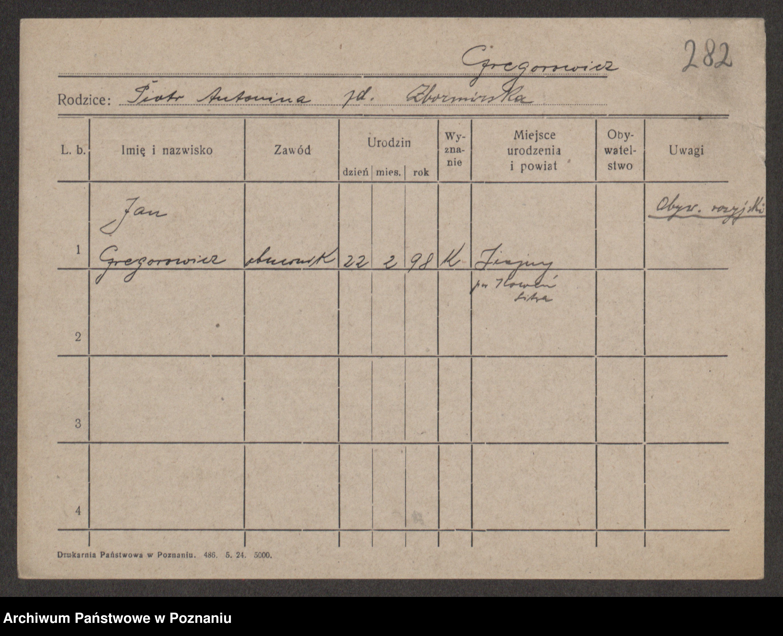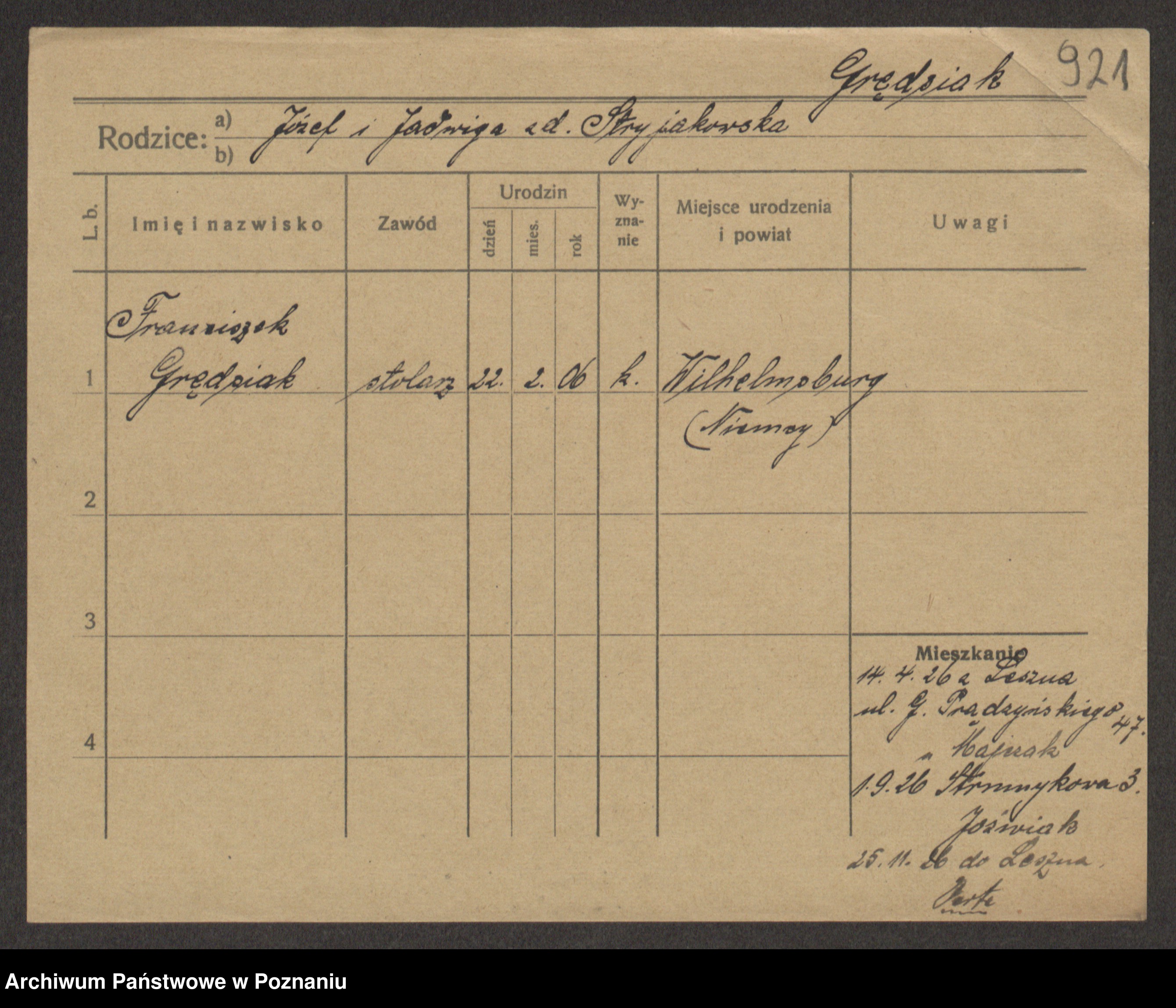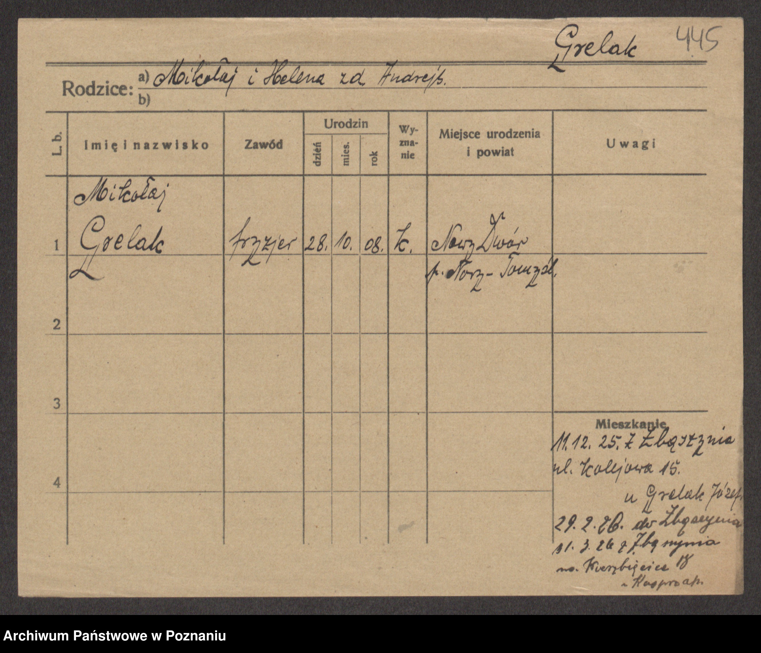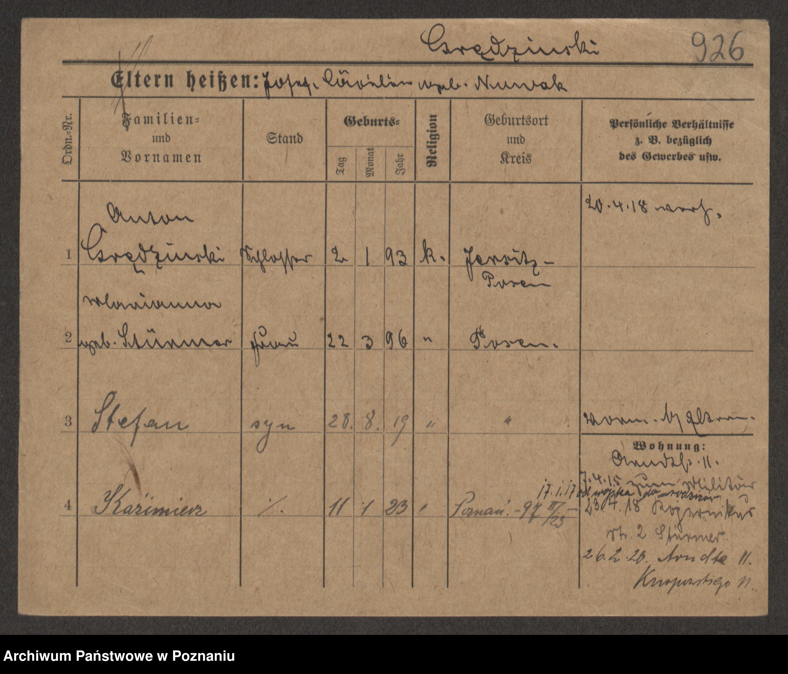 Podgląd karty osobowej dostępny jest po kliknięciu na nazwisko lub ikonkę karty. Można dokonywać powiększenia (ikony na górze) lub przechodzić między kolejnymi skanami (strzałki po bokach).