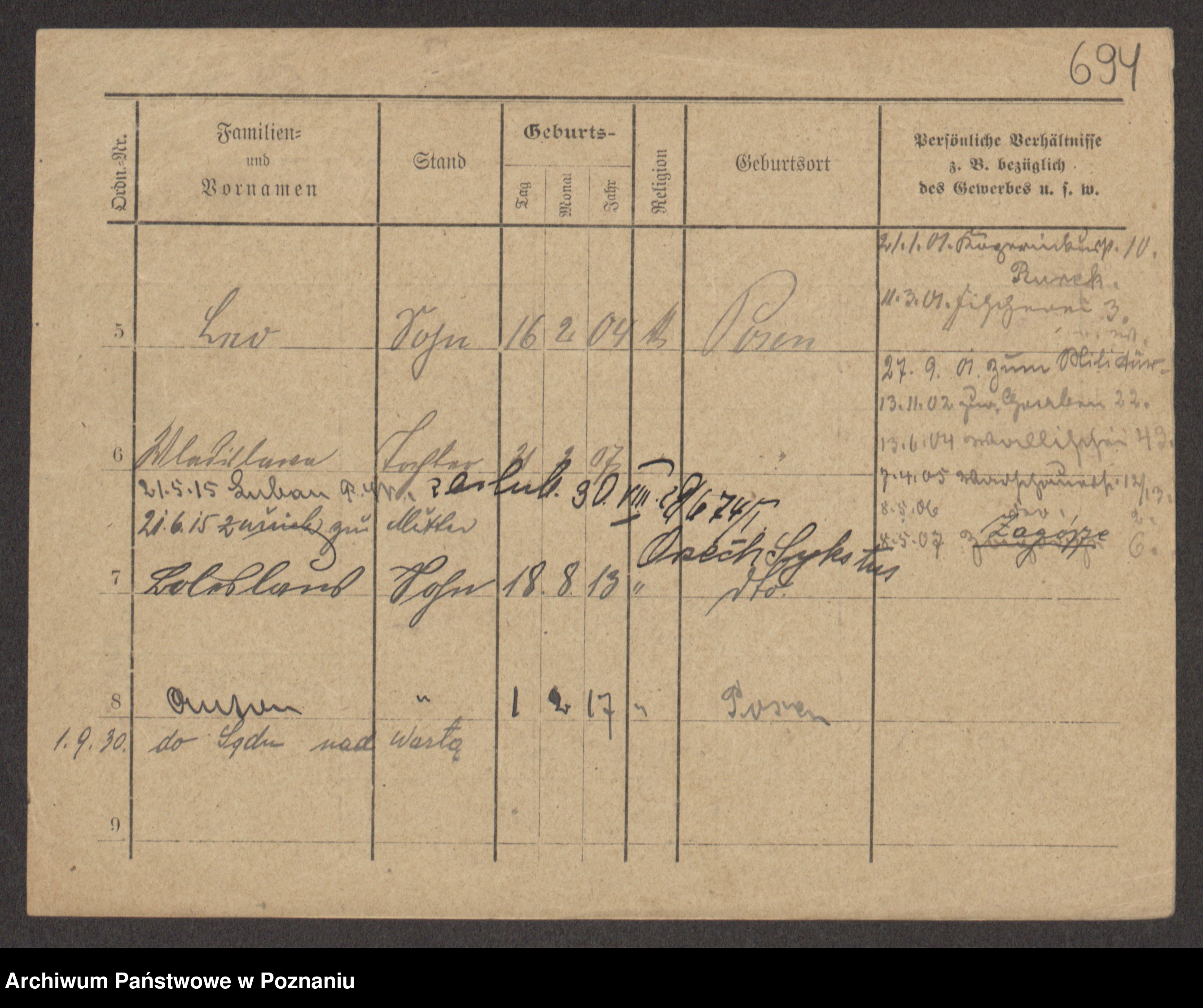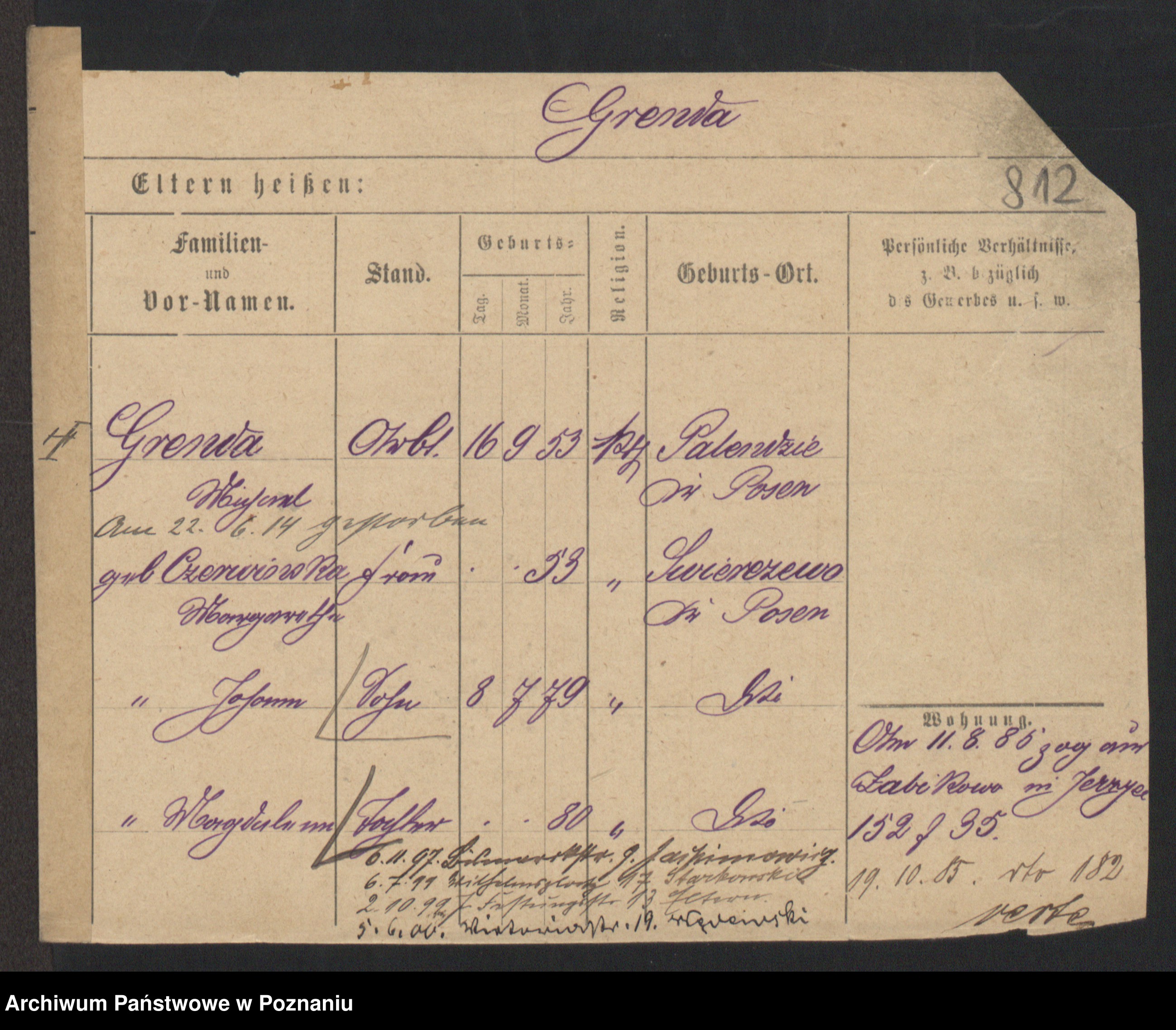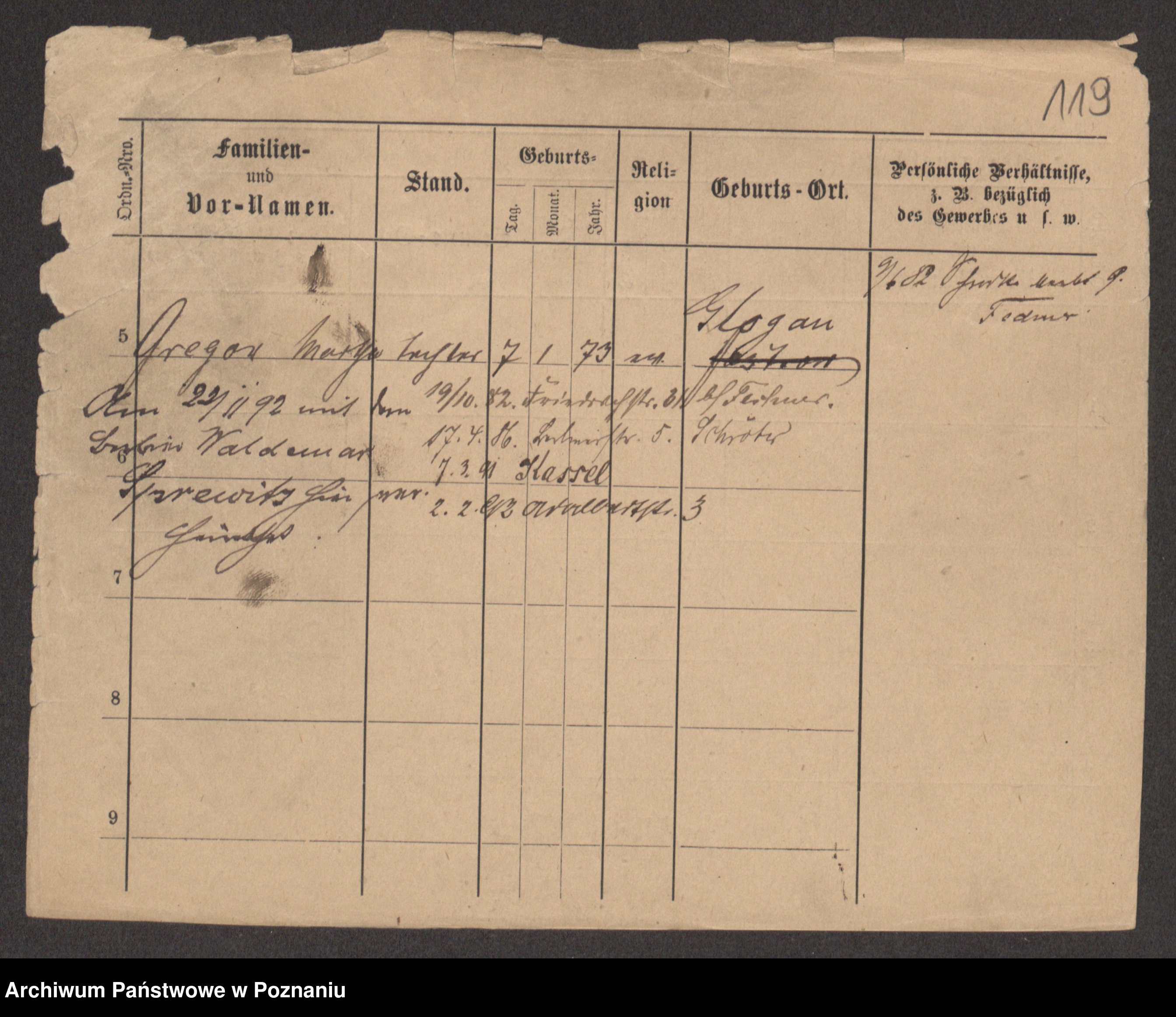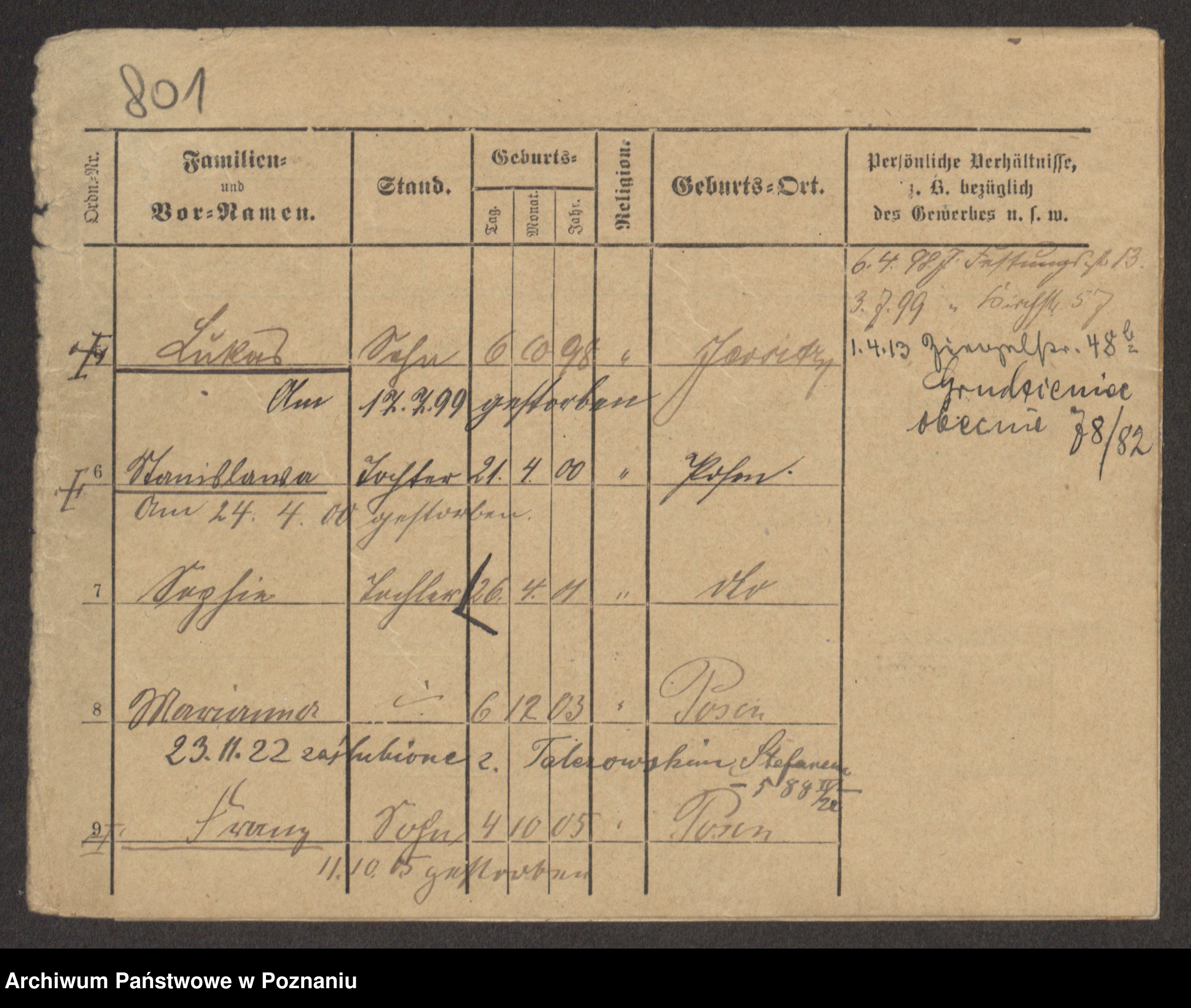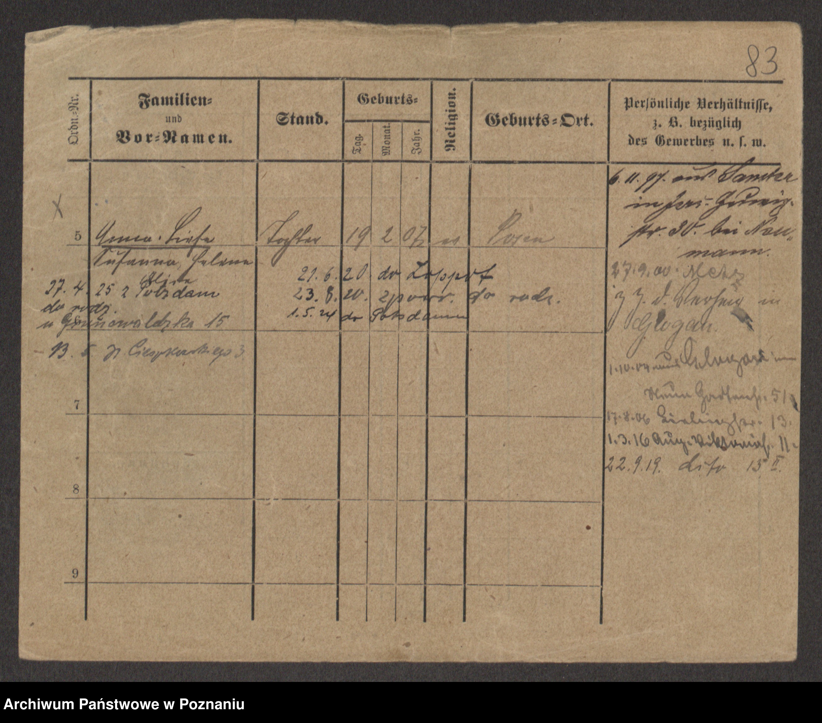 Podgląd karty osobowej dostępny jest po kliknięciu na nazwisko lub ikonkę karty. Można dokonywać powiększenia (ikony na górze) lub przechodzić między kolejnymi skanami (strzałki po bokach).