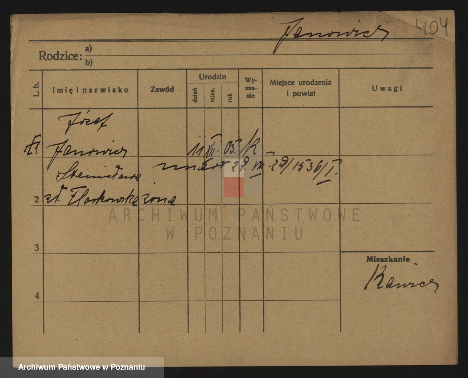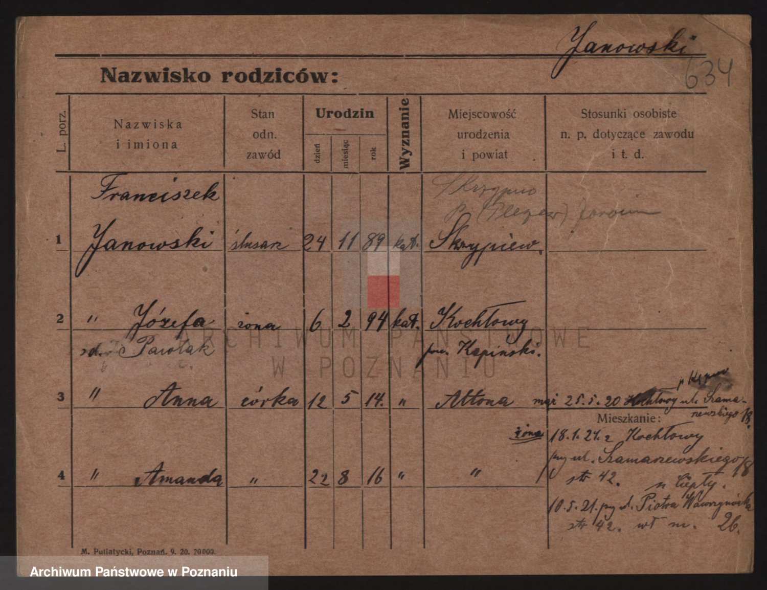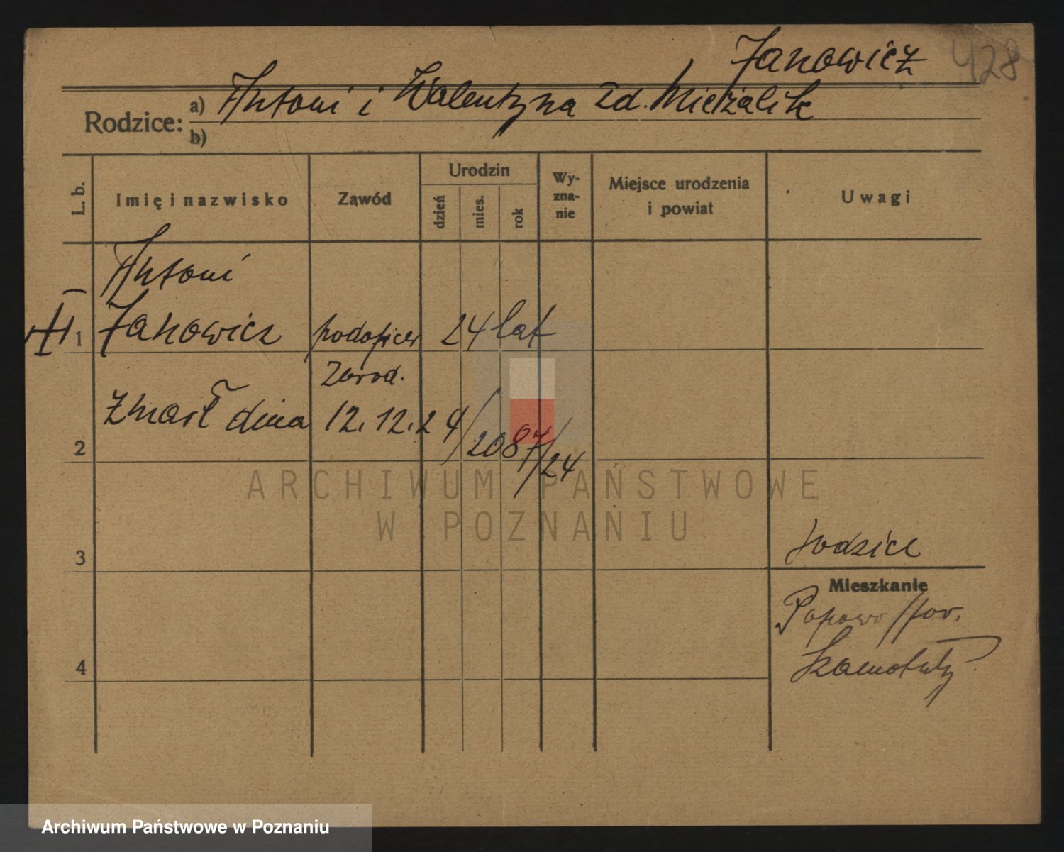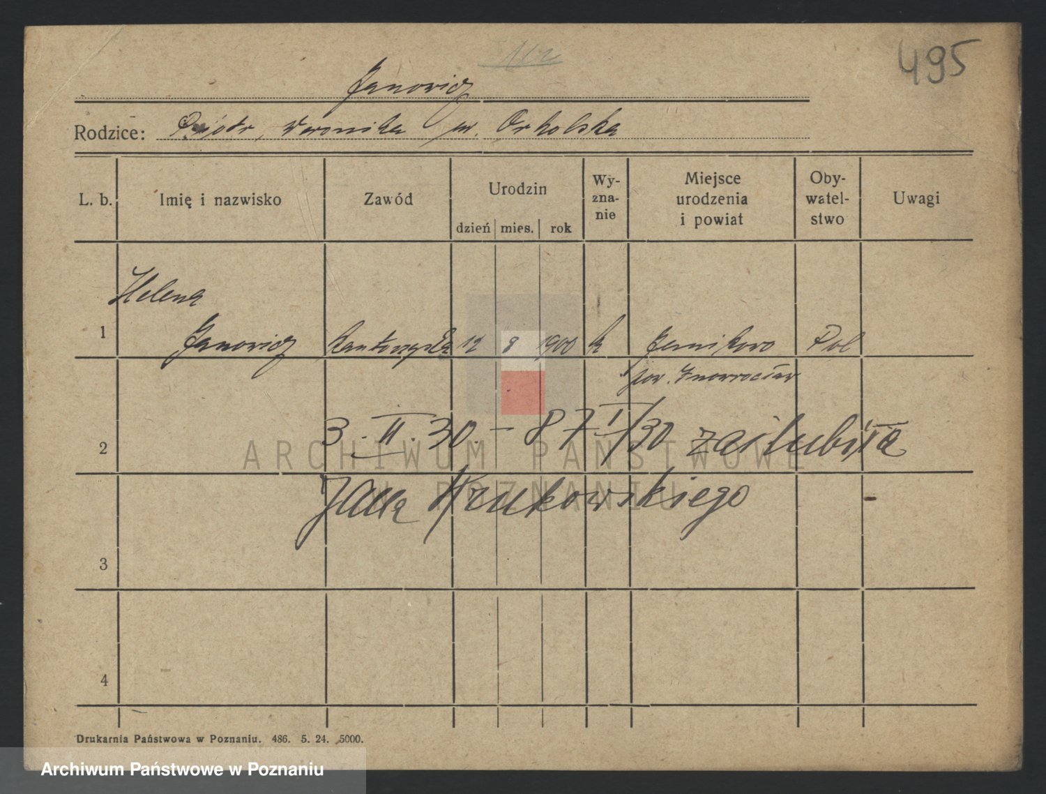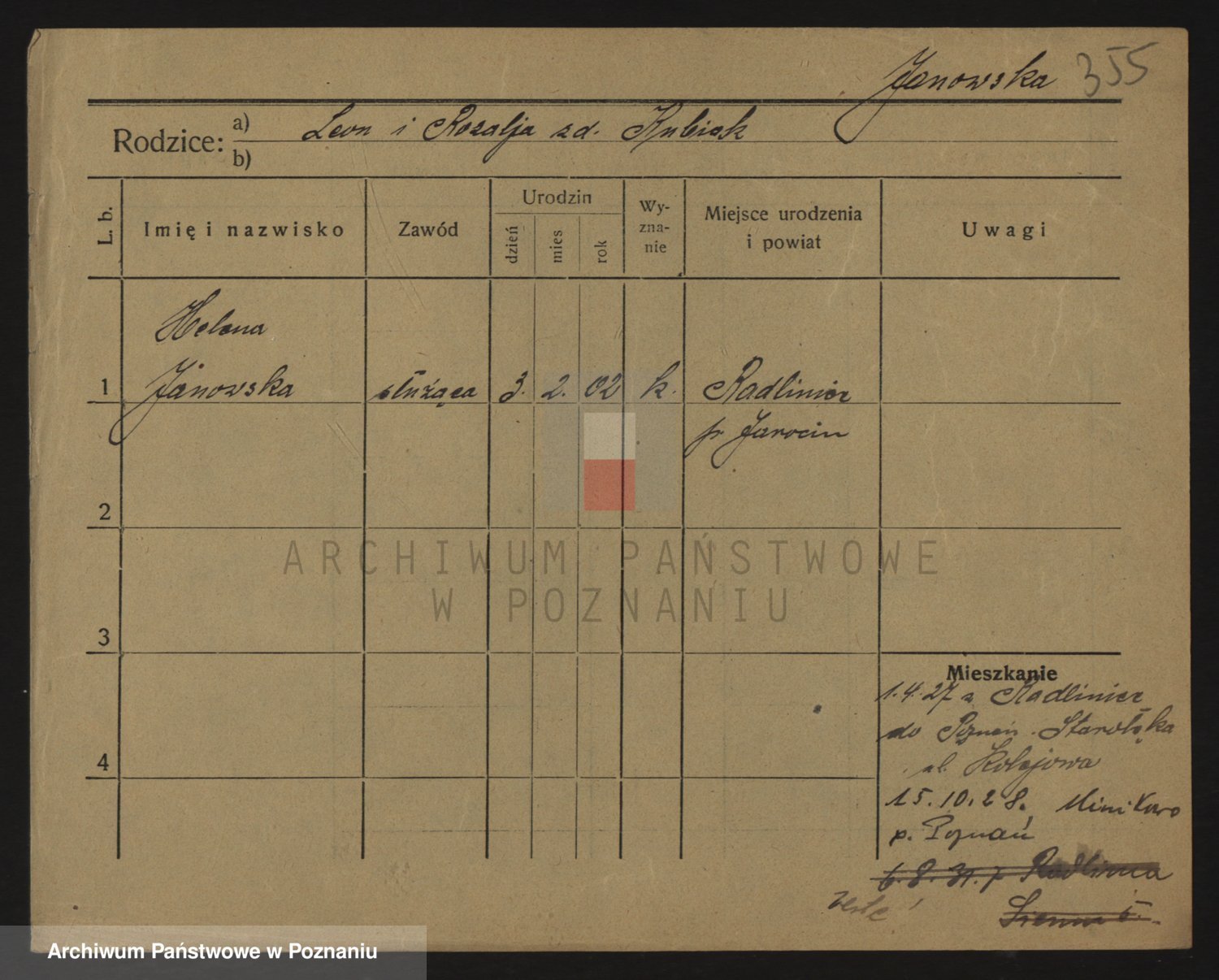 Podgląd karty osobowej dostępny jest po kliknięciu na nazwisko lub ikonkę karty. Można dokonywać powiększenia (ikony na górze) lub przechodzić między kolejnymi skanami (strzałki po bokach).