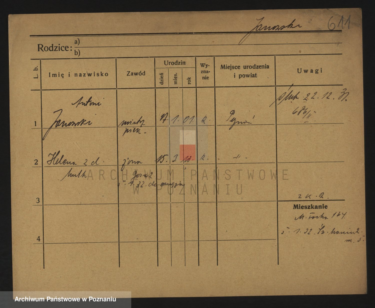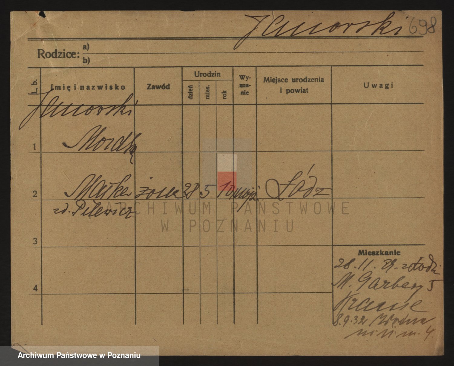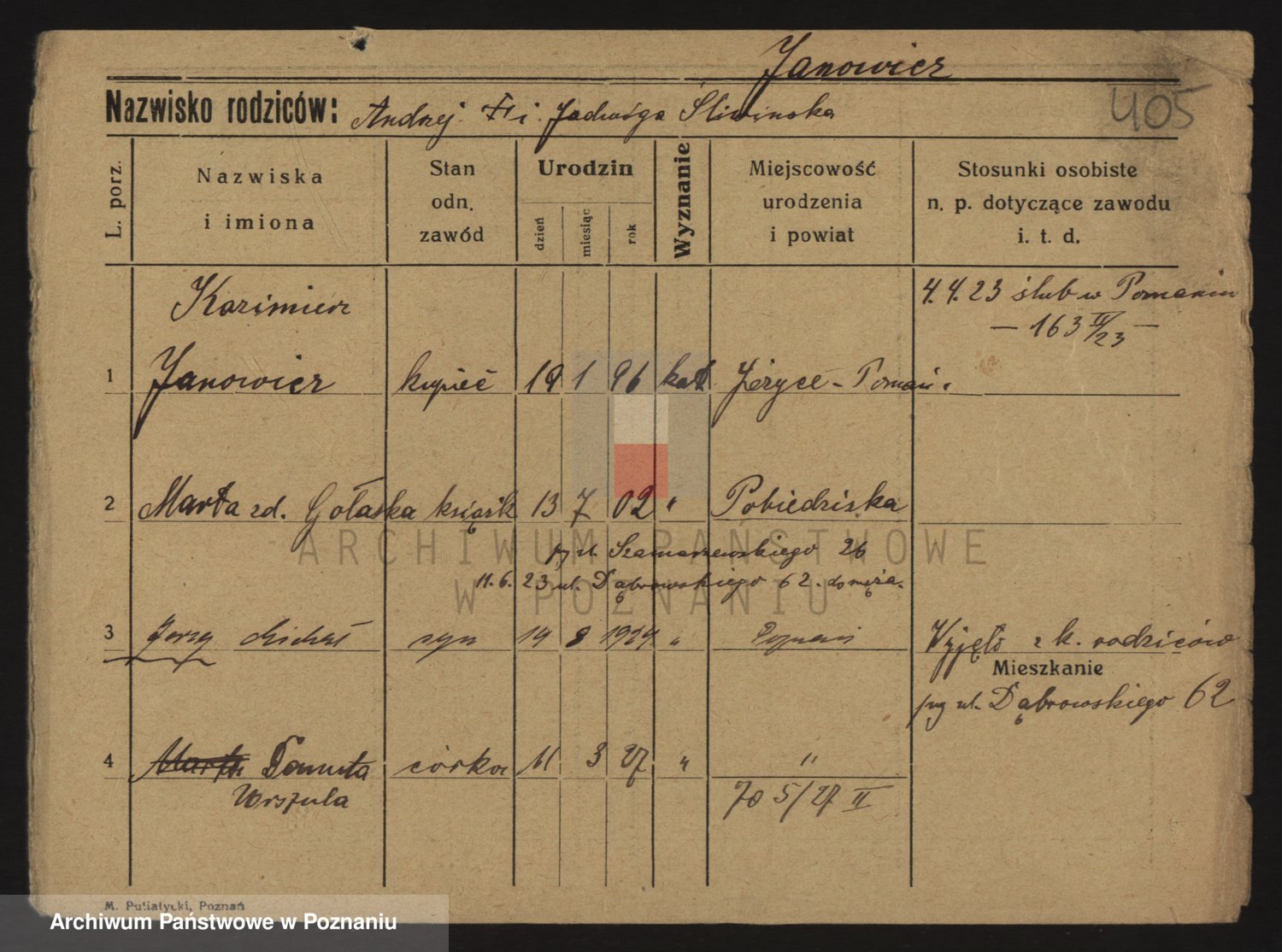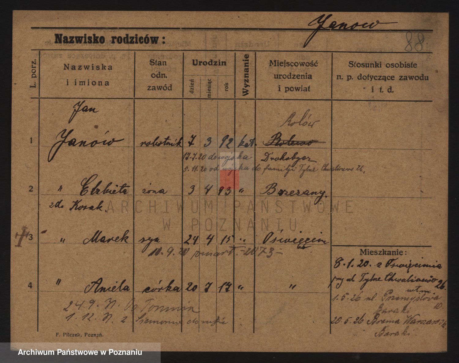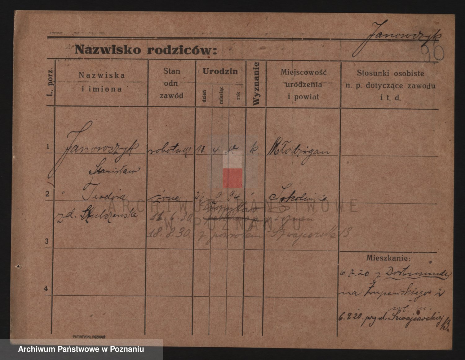 Podgląd karty osobowej dostępny jest po kliknięciu na nazwisko lub ikonkę karty. Można dokonywać powiększenia (ikony na górze) lub przechodzić między kolejnymi skanami (strzałki po bokach).