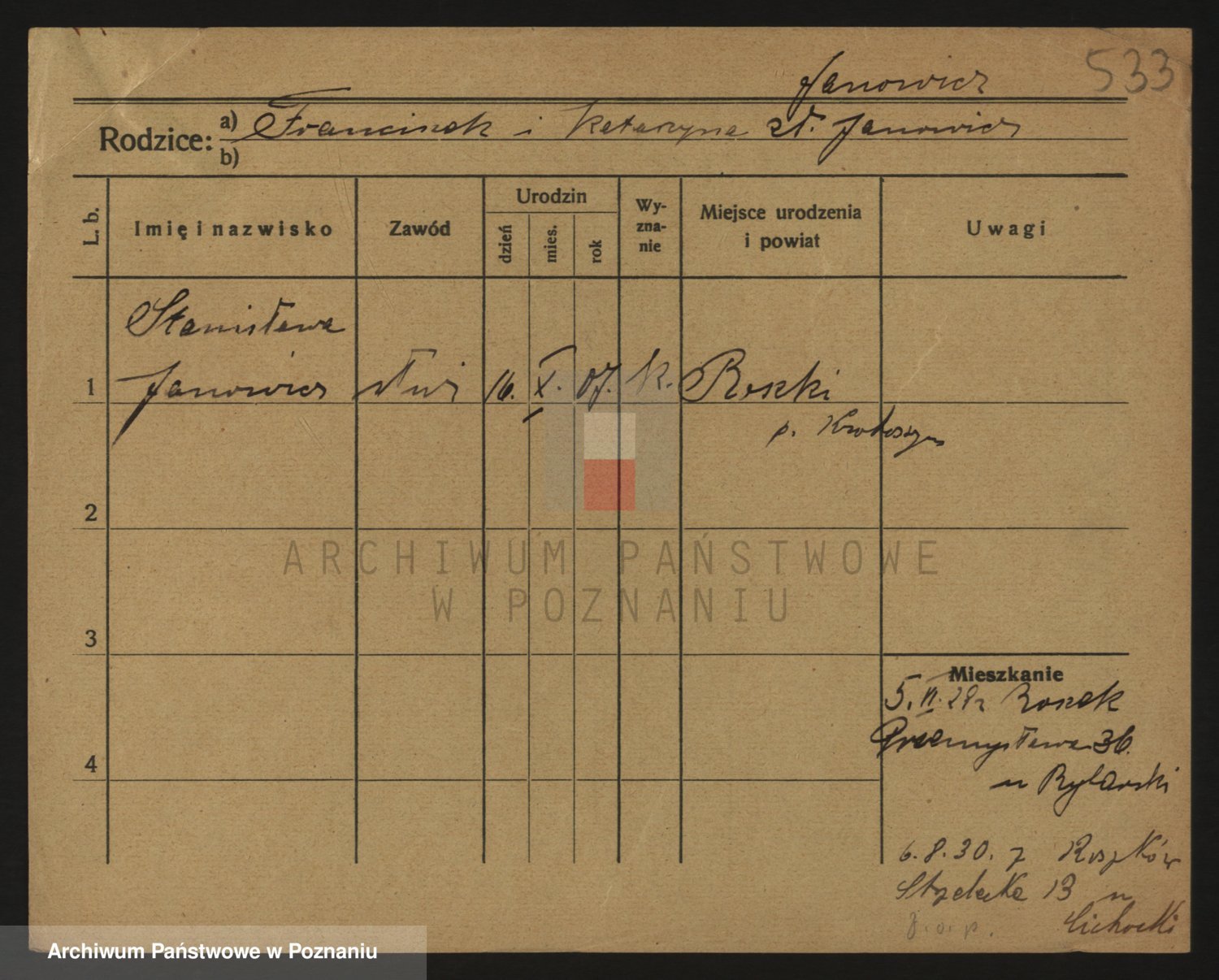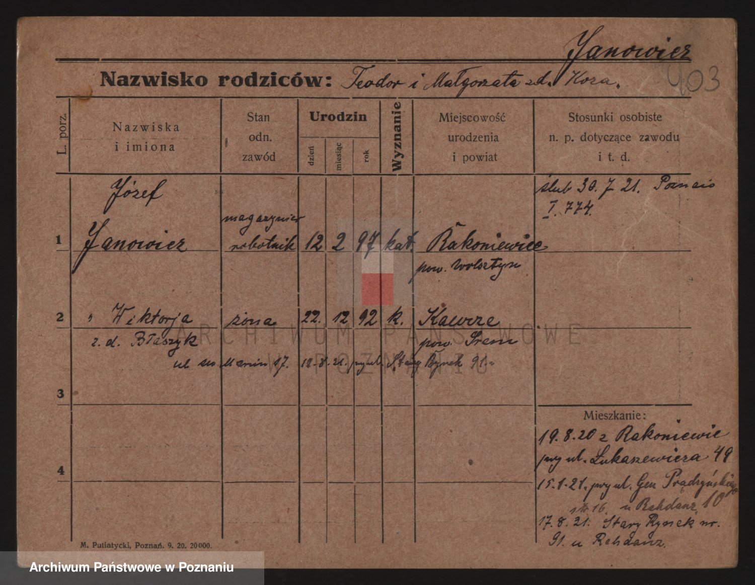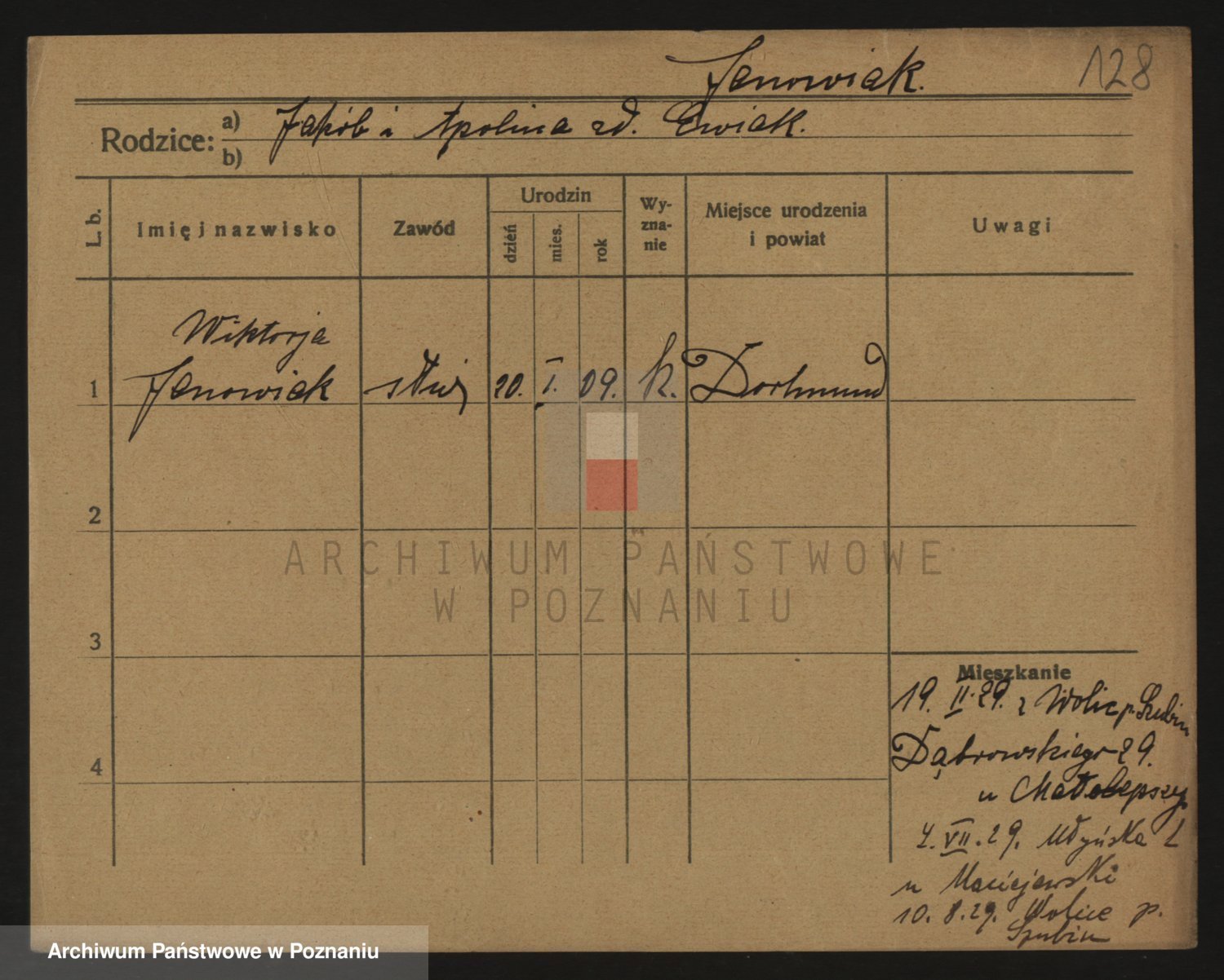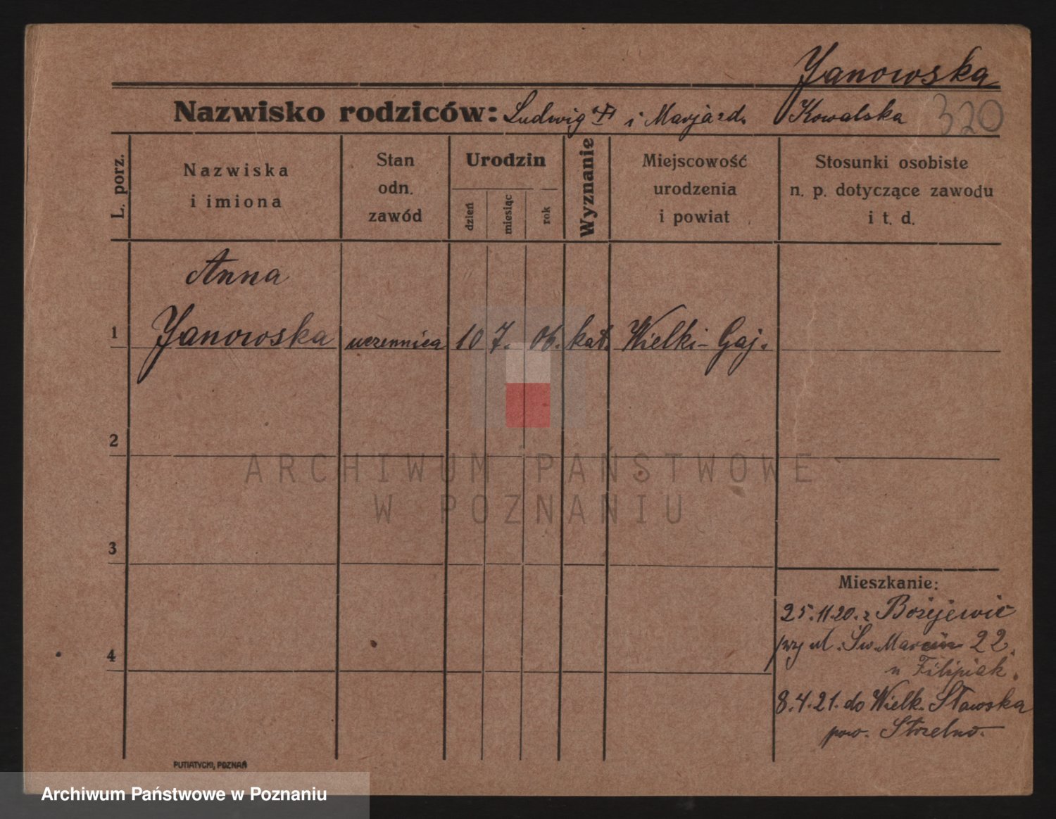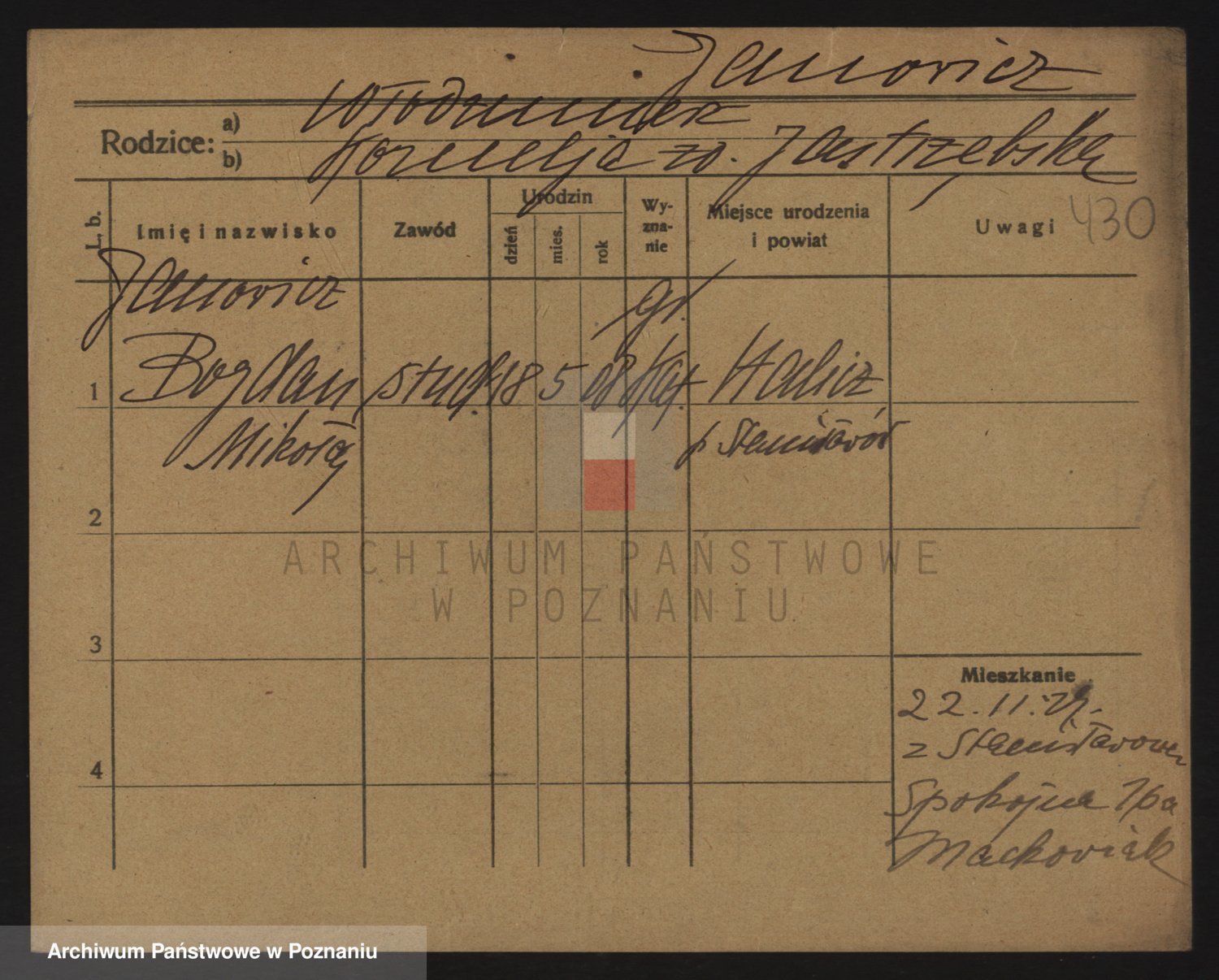 Podgląd karty osobowej dostępny jest po kliknięciu na nazwisko lub ikonkę karty. Można dokonywać powiększenia (ikony na górze) lub przechodzić między kolejnymi skanami (strzałki po bokach).