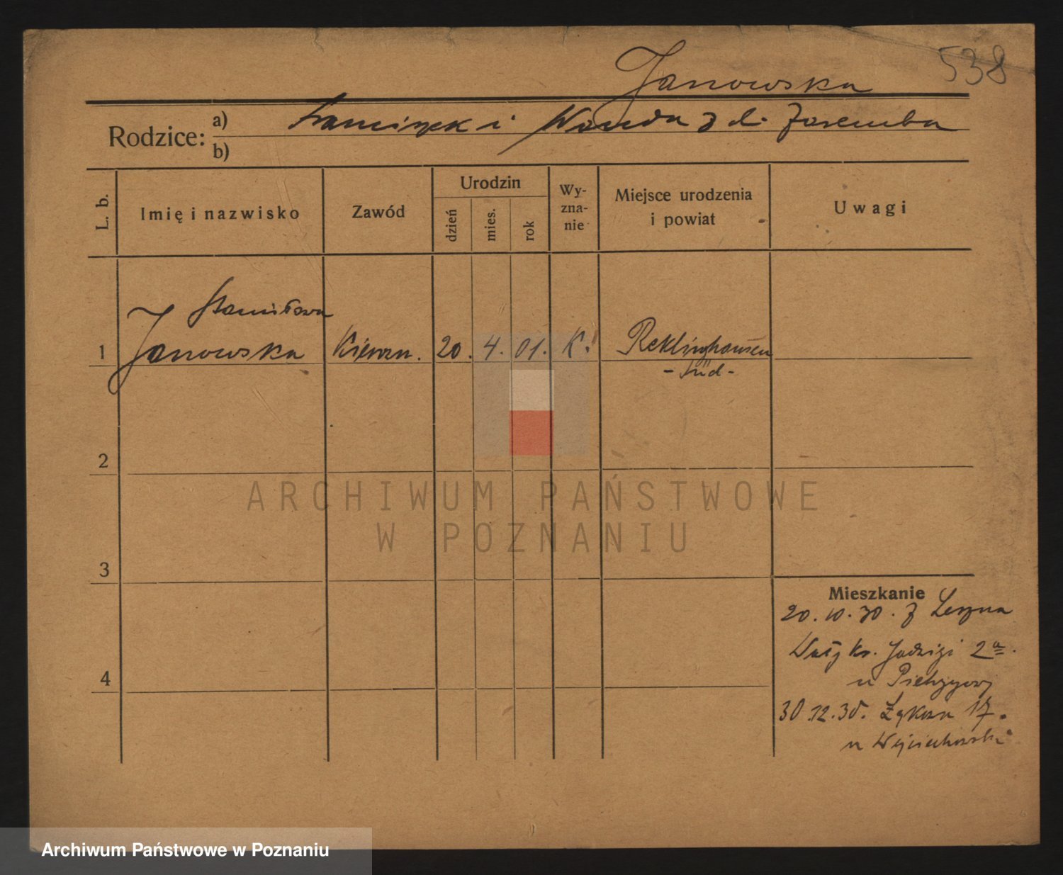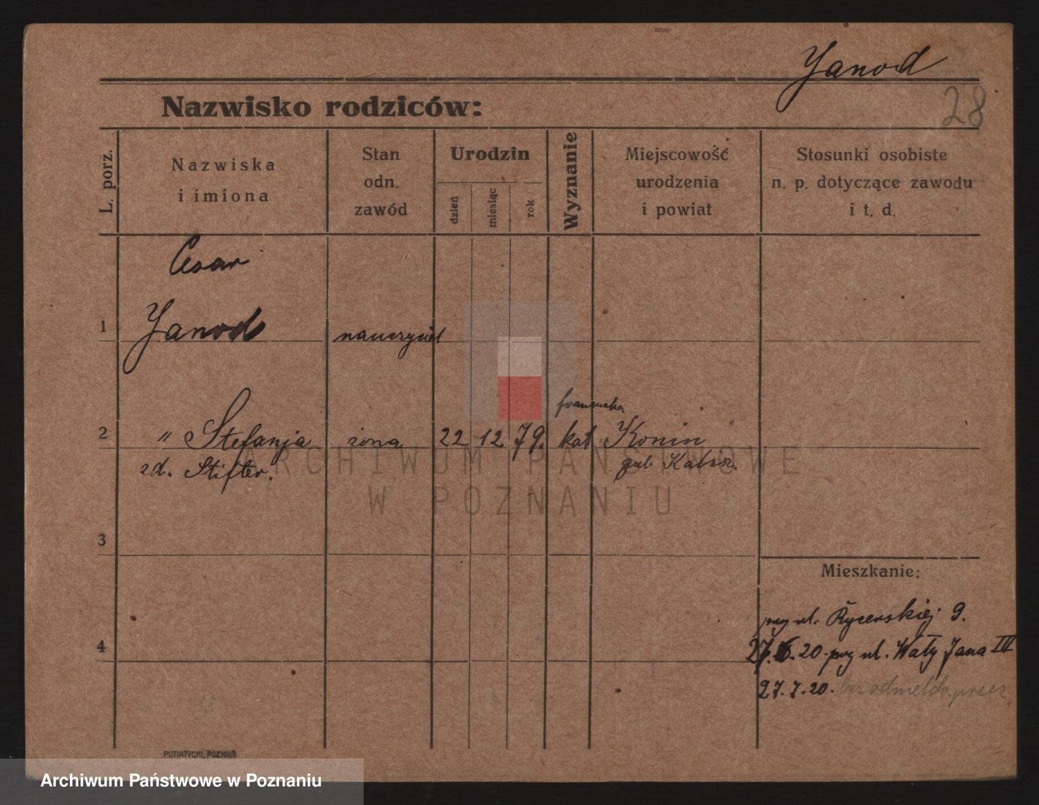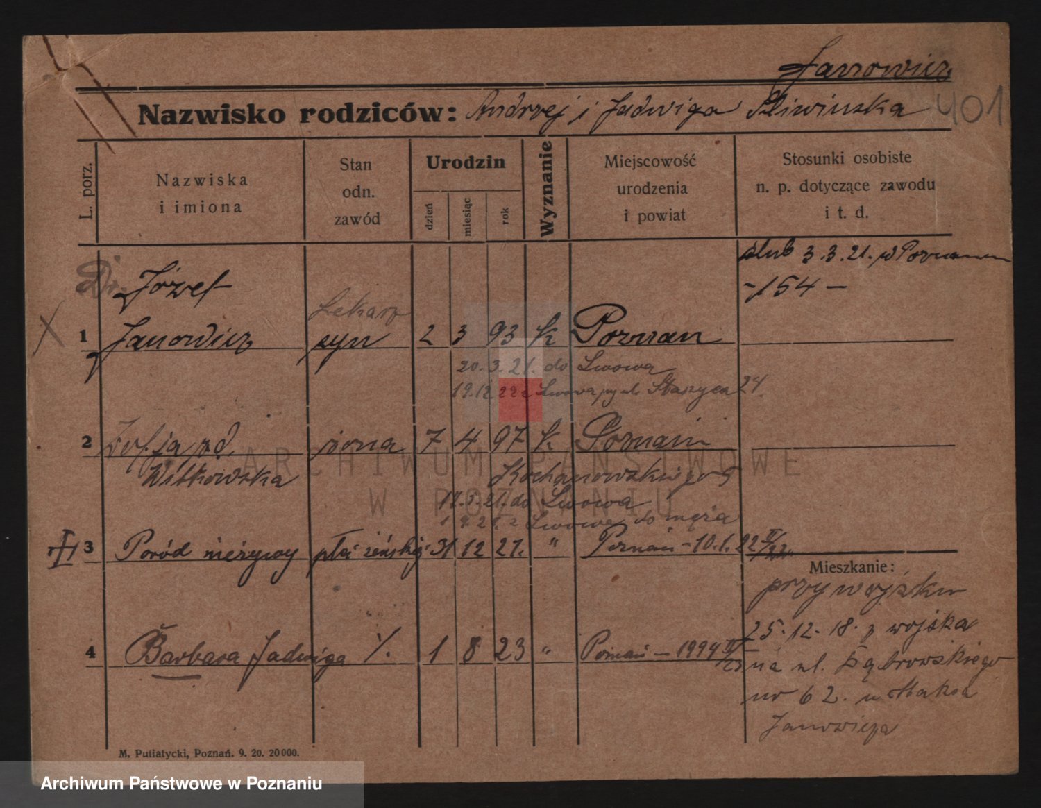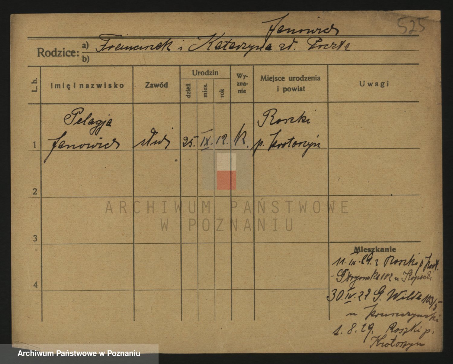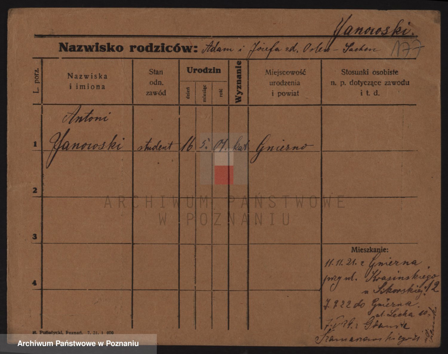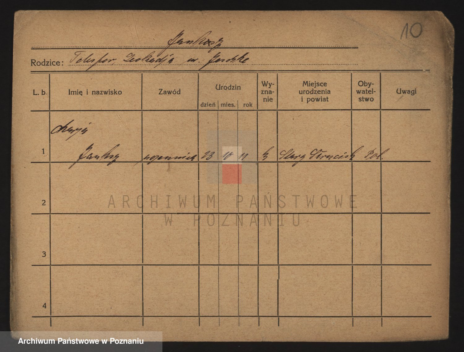 Podgląd karty osobowej dostępny jest po kliknięciu na nazwisko lub ikonkę karty. Można dokonywać powiększenia (ikony na górze) lub przechodzić między kolejnymi skanami (strzałki po bokach).