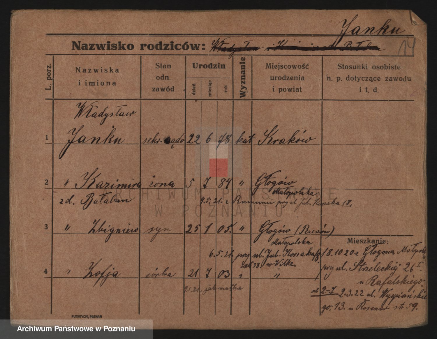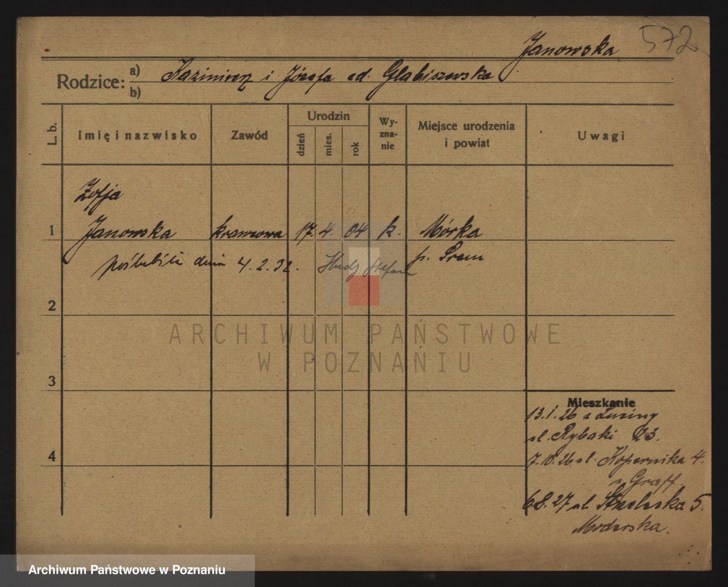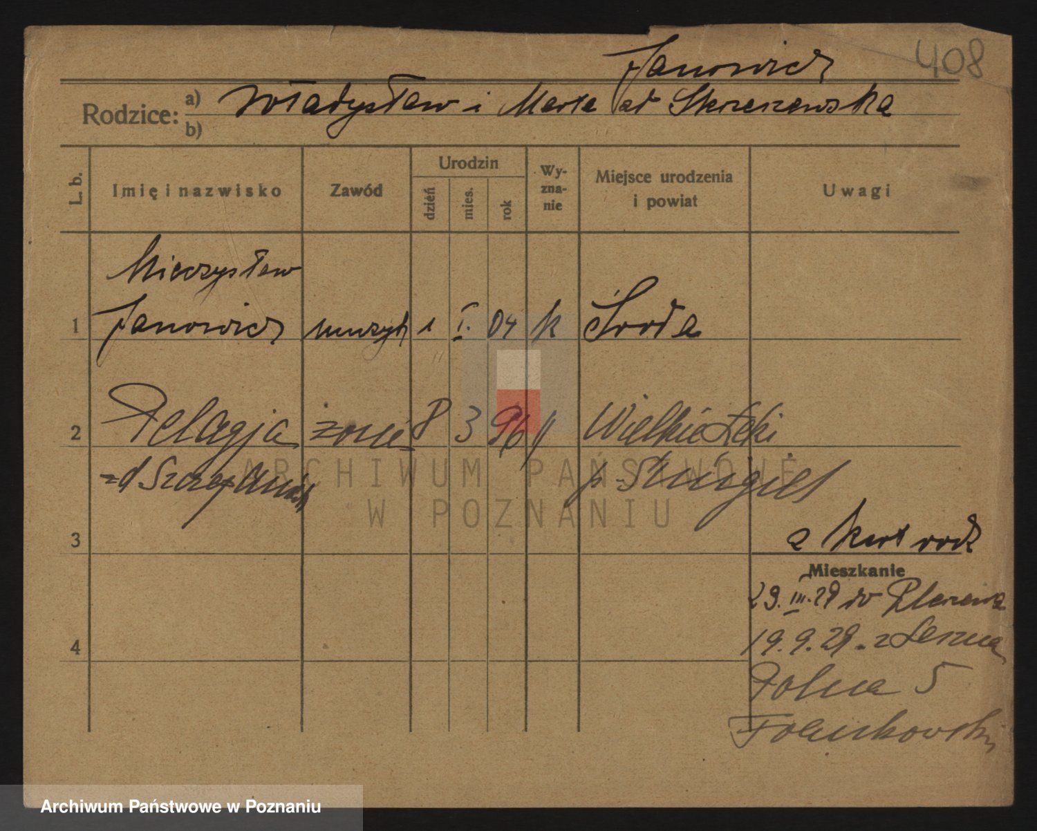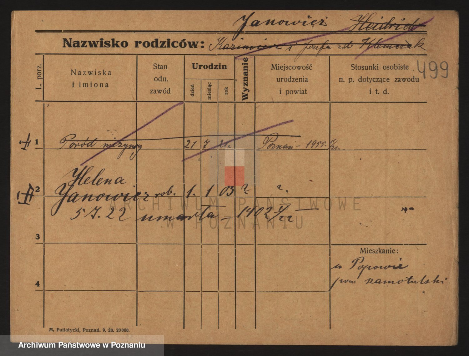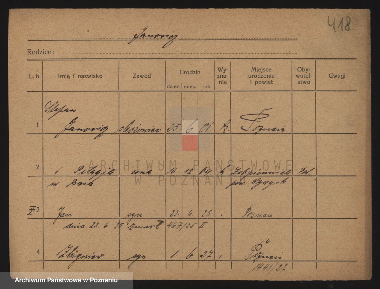 Podgląd karty osobowej dostępny jest po kliknięciu na nazwisko lub ikonkę karty. Można dokonywać powiększenia (ikony na górze) lub przechodzić między kolejnymi skanami (strzałki po bokach).