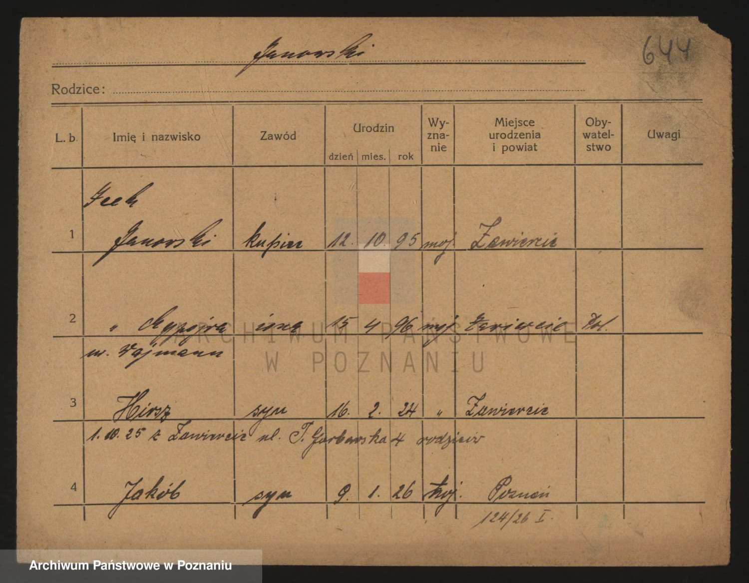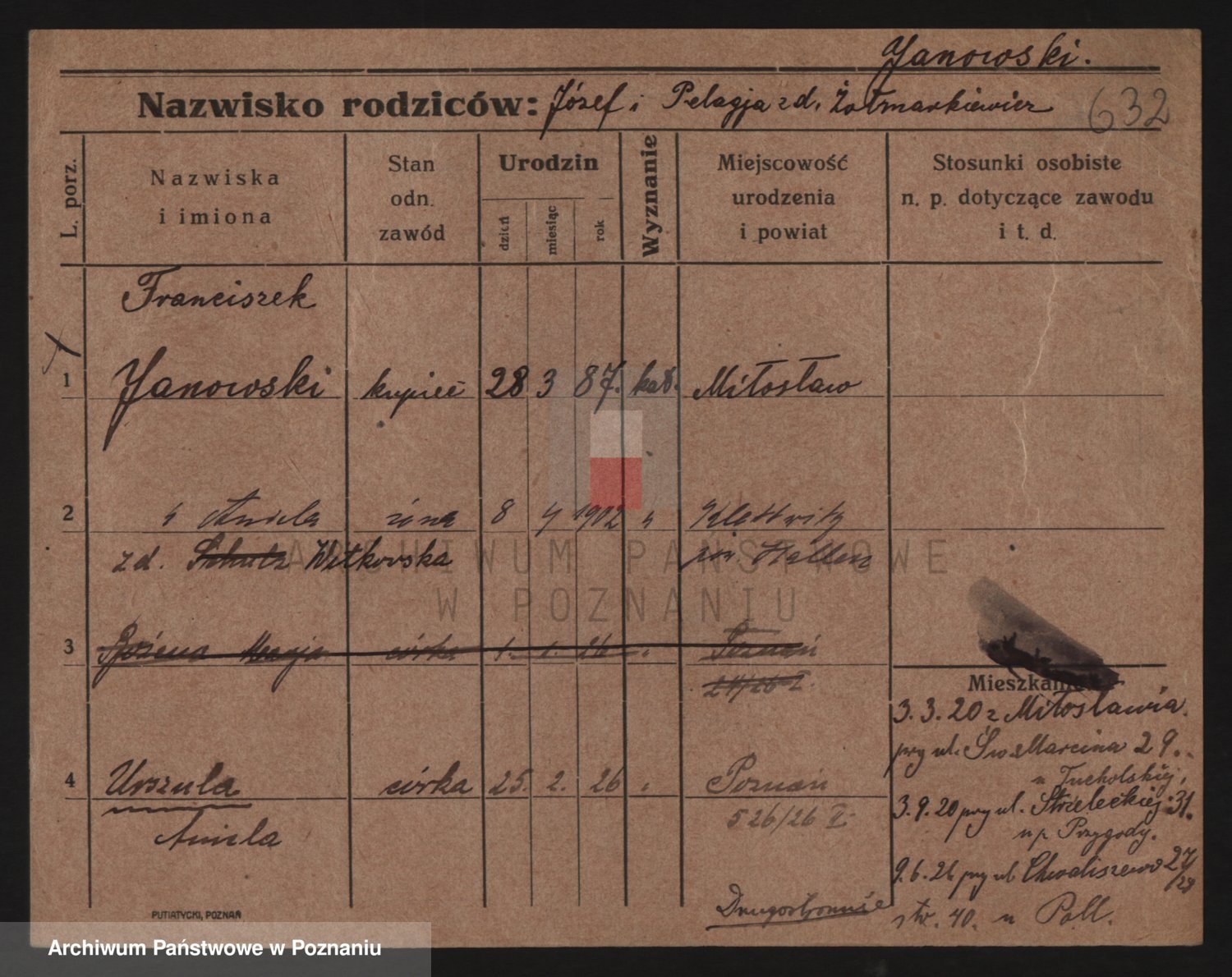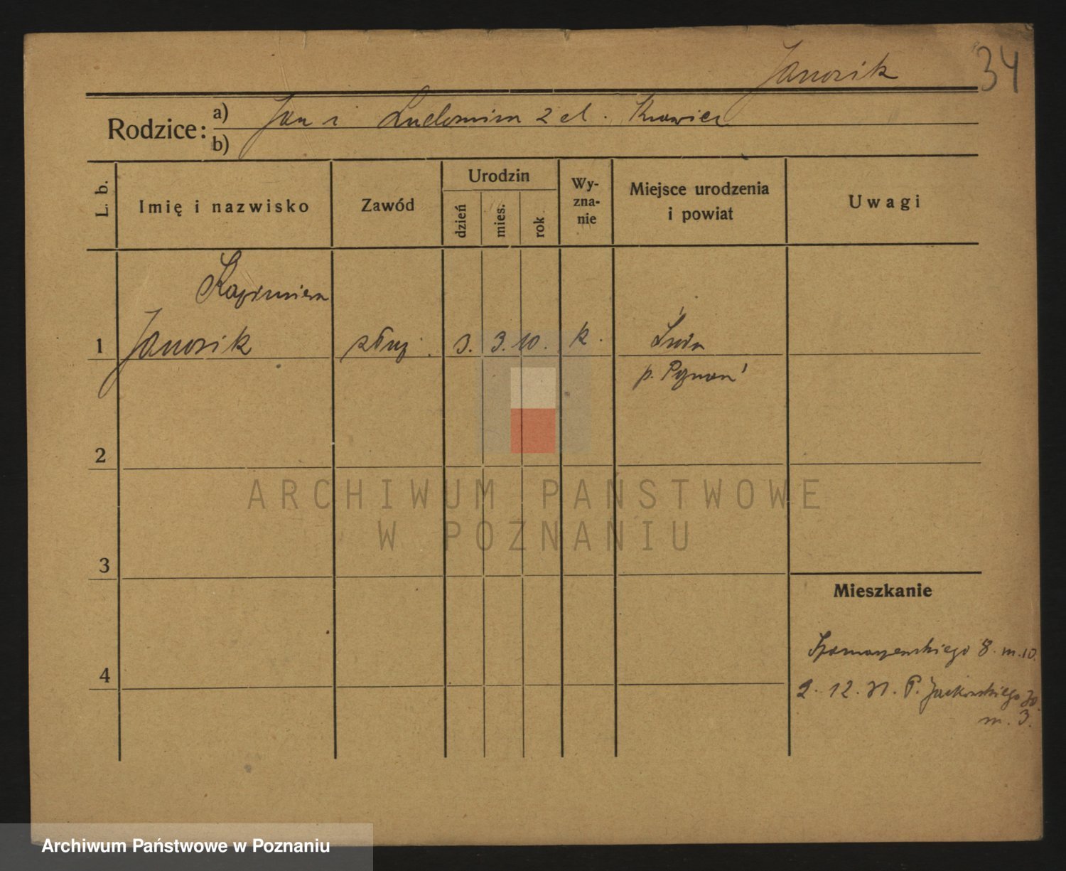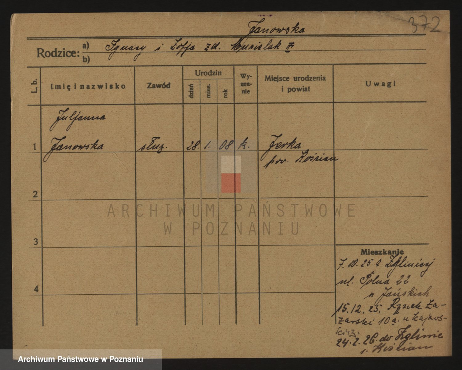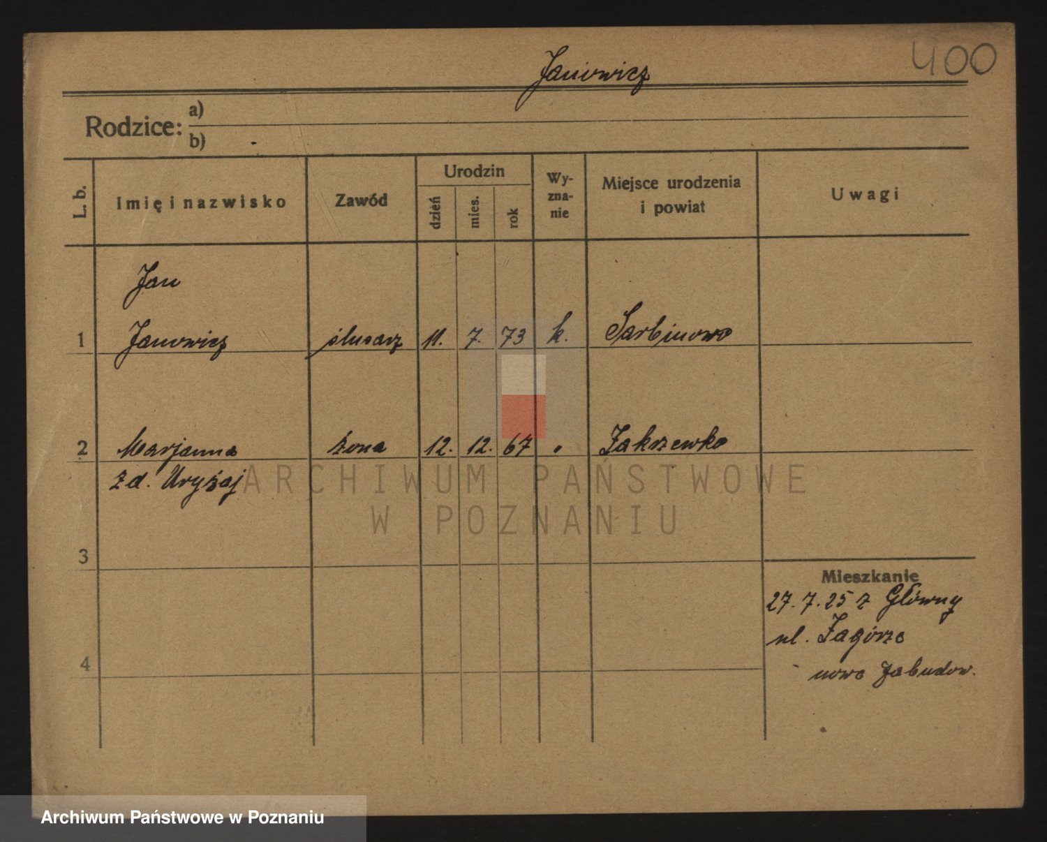 Podgląd karty osobowej dostępny jest po kliknięciu na nazwisko lub ikonkę karty. Można dokonywać powiększenia (ikony na górze) lub przechodzić między kolejnymi skanami (strzałki po bokach).