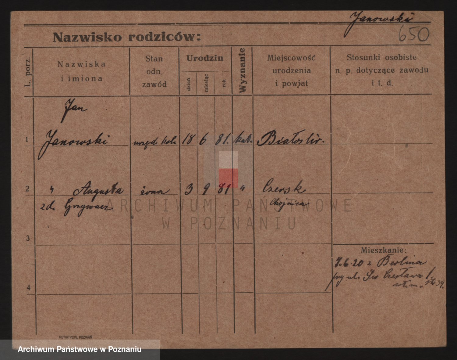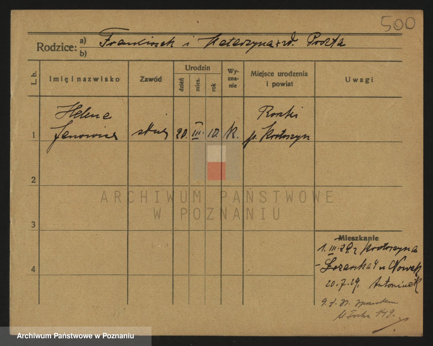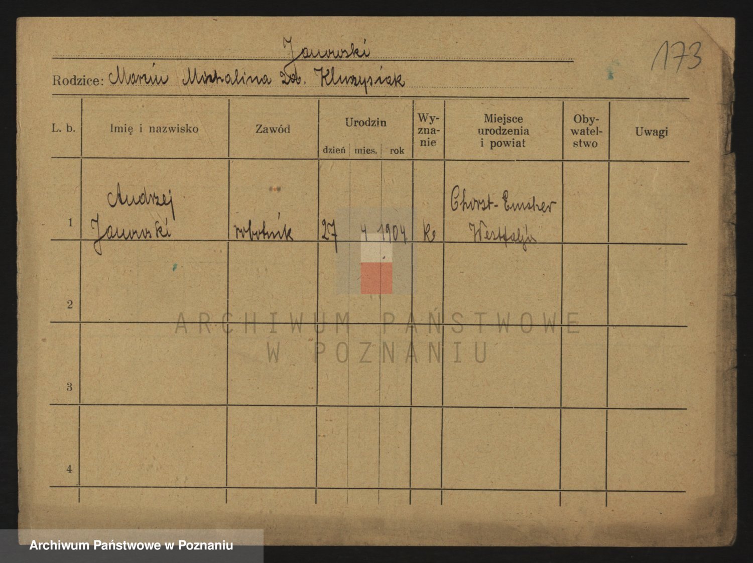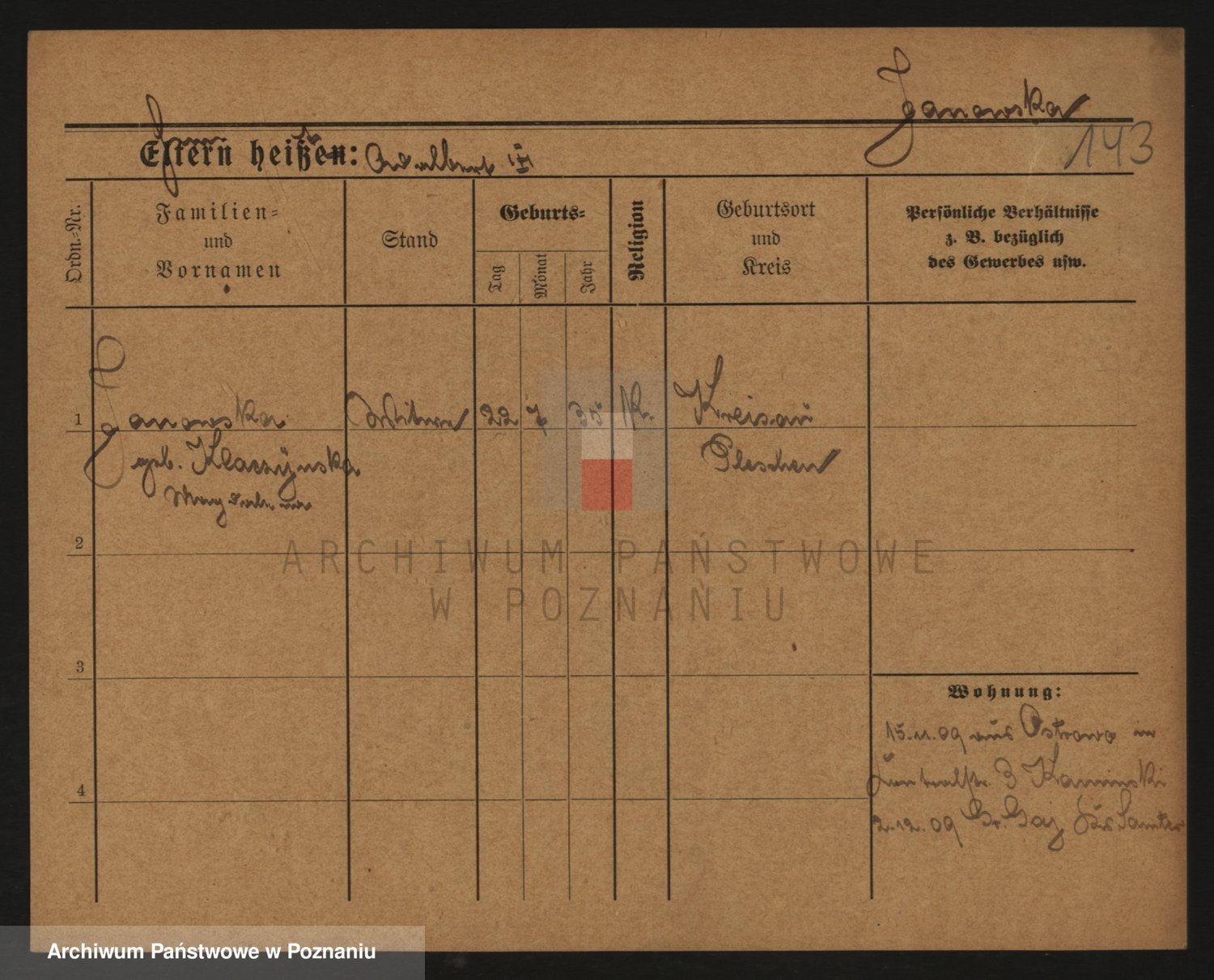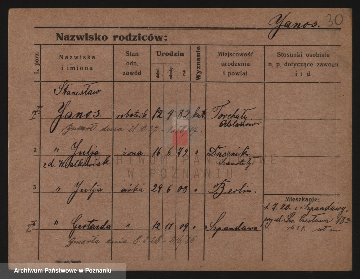 Podgląd karty osobowej dostępny jest po kliknięciu na nazwisko lub ikonkę karty. Można dokonywać powiększenia (ikony na górze) lub przechodzić między kolejnymi skanami (strzałki po bokach).