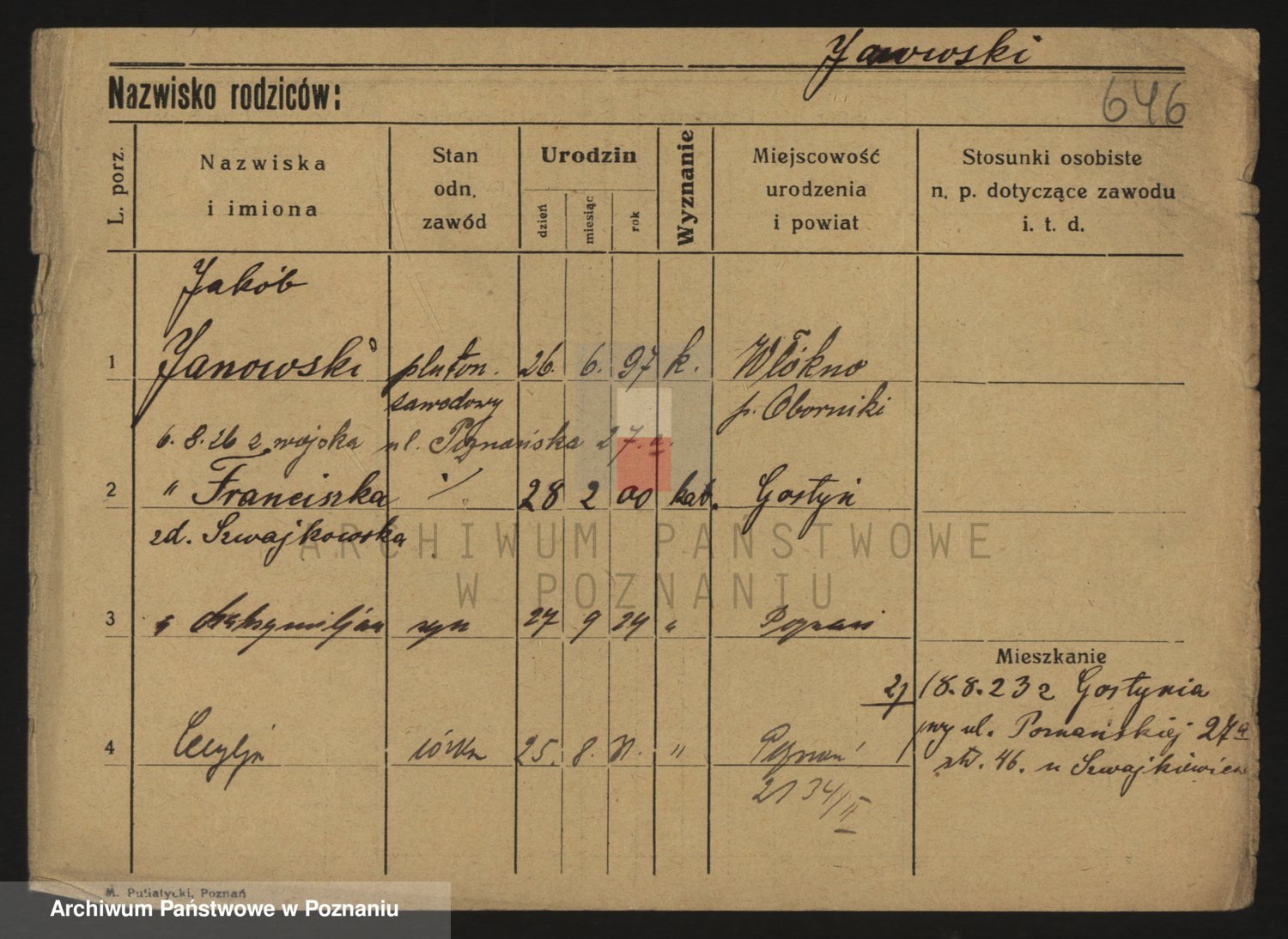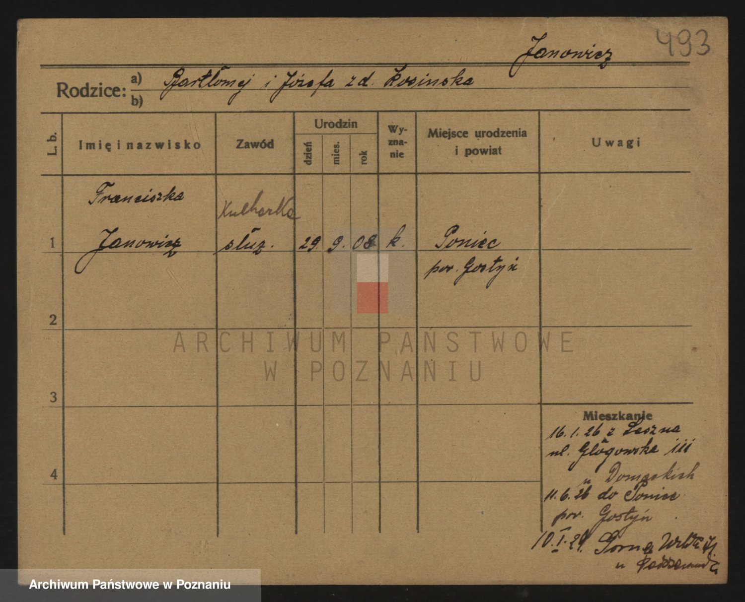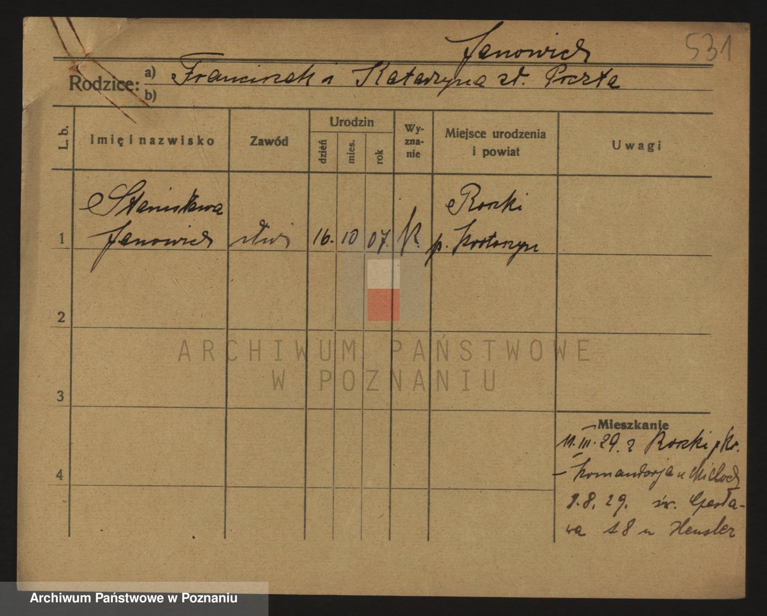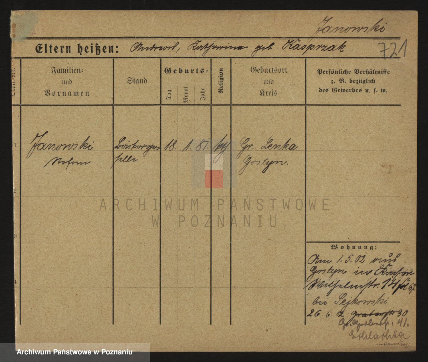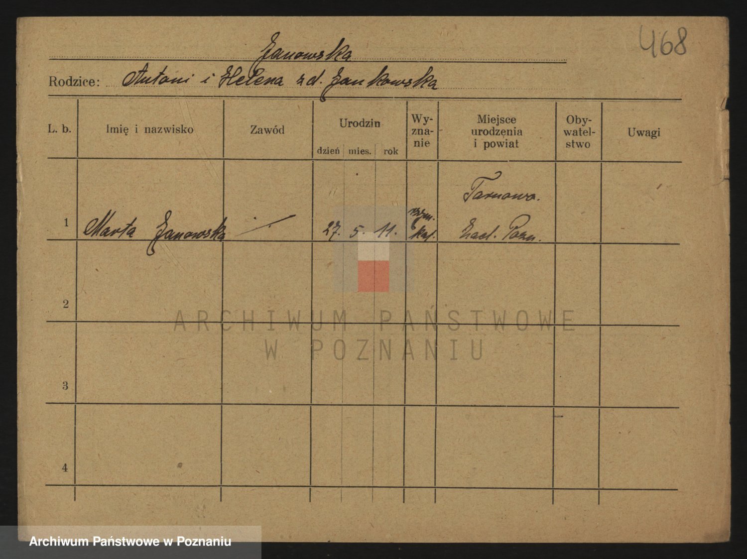 Podgląd karty osobowej dostępny jest po kliknięciu na nazwisko lub ikonkę karty. Można dokonywać powiększenia (ikony na górze) lub przechodzić między kolejnymi skanami (strzałki po bokach).