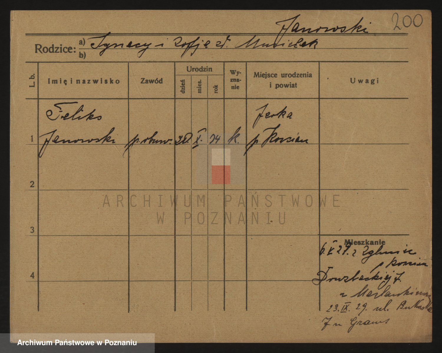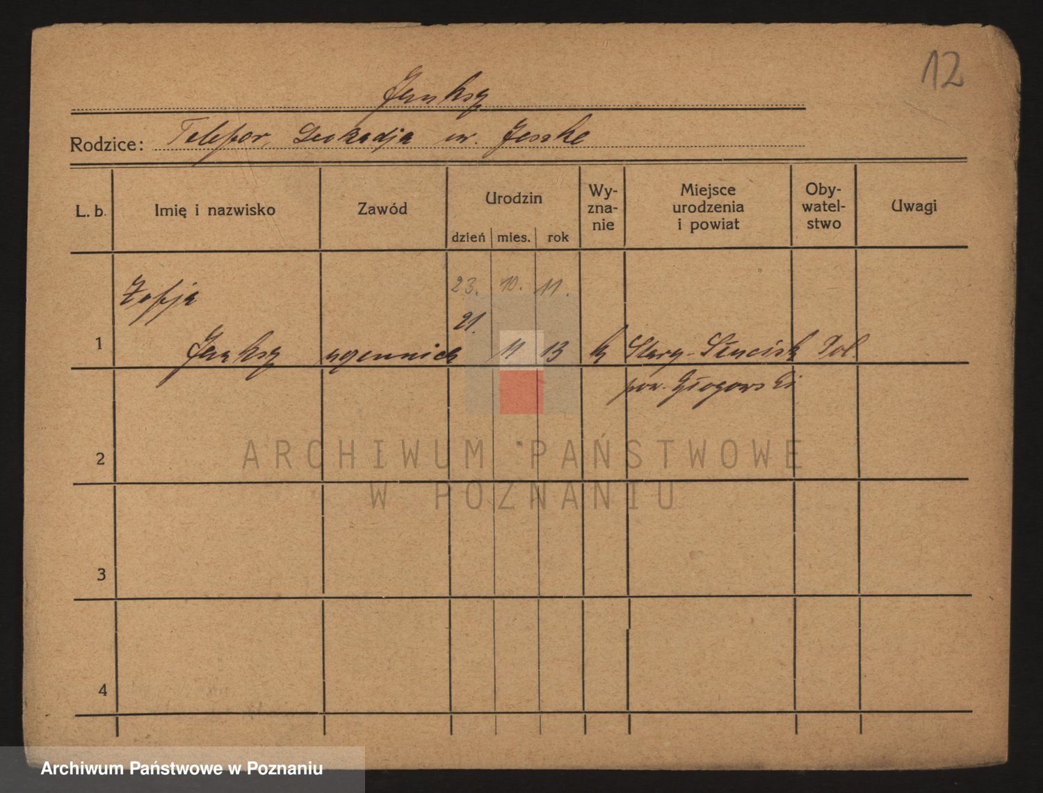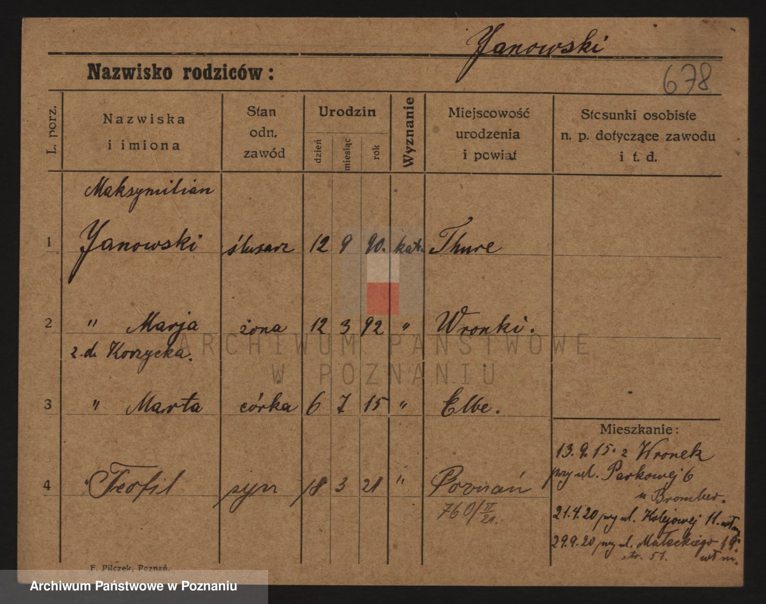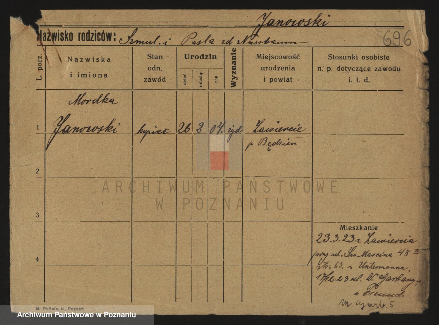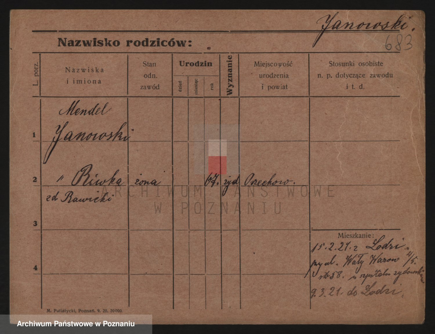 Podgląd karty osobowej dostępny jest po kliknięciu na nazwisko lub ikonkę karty. Można dokonywać powiększenia (ikony na górze) lub przechodzić między kolejnymi skanami (strzałki po bokach).