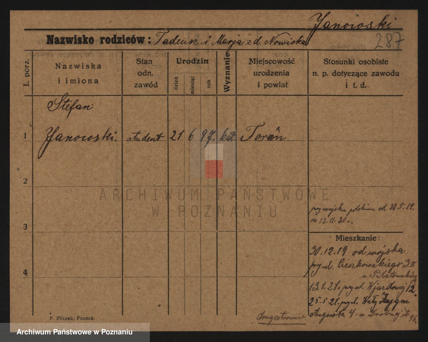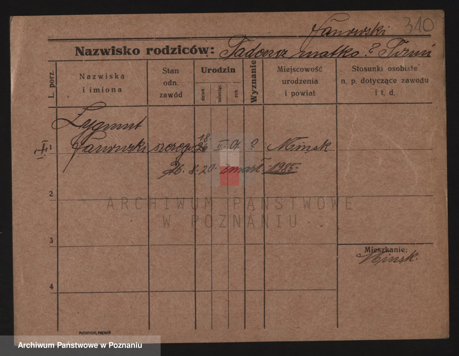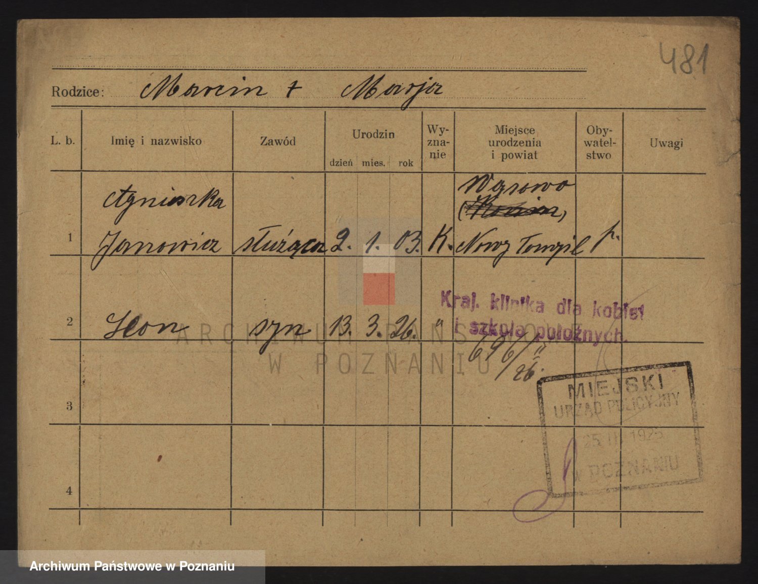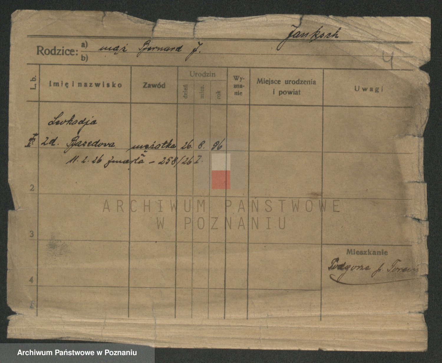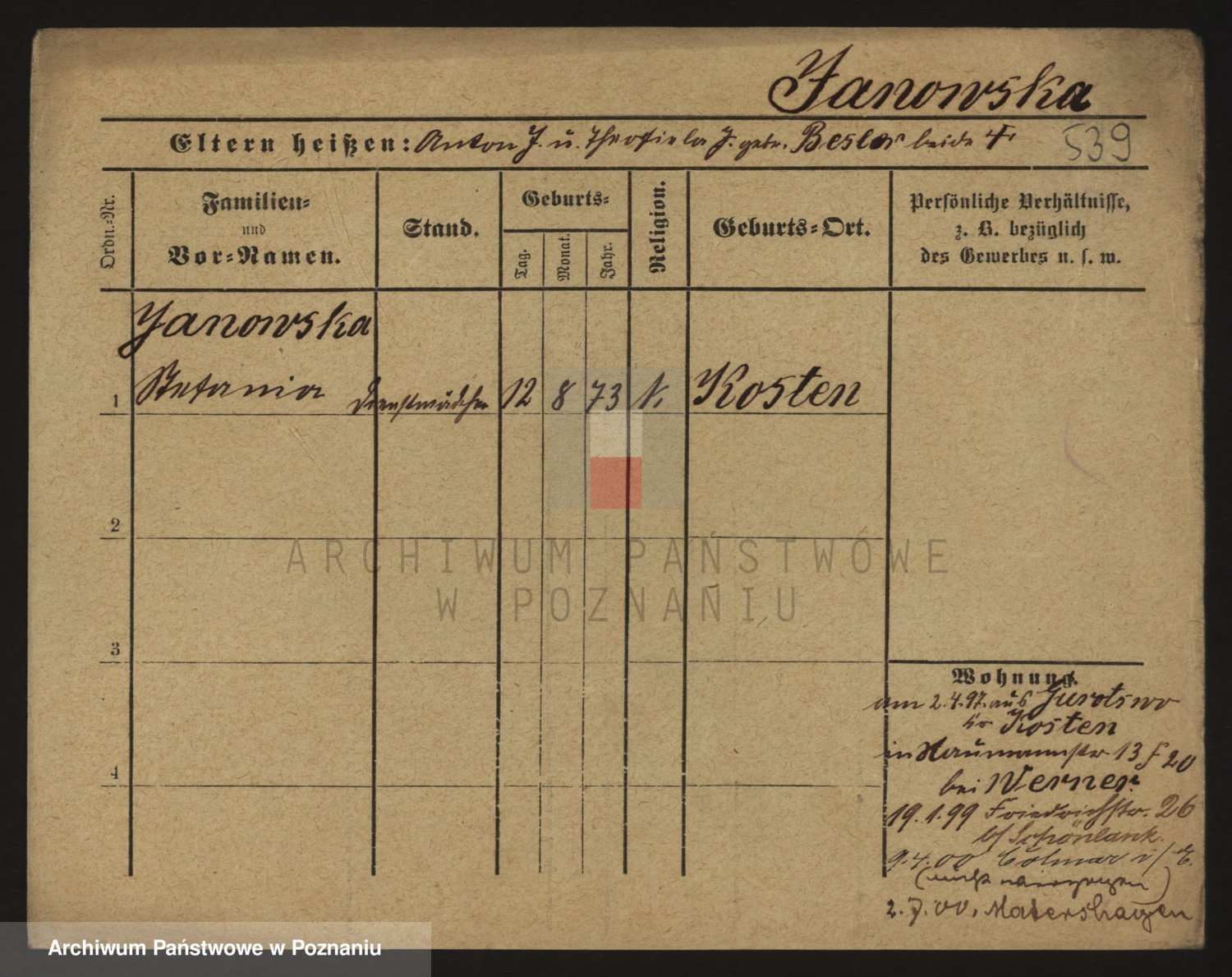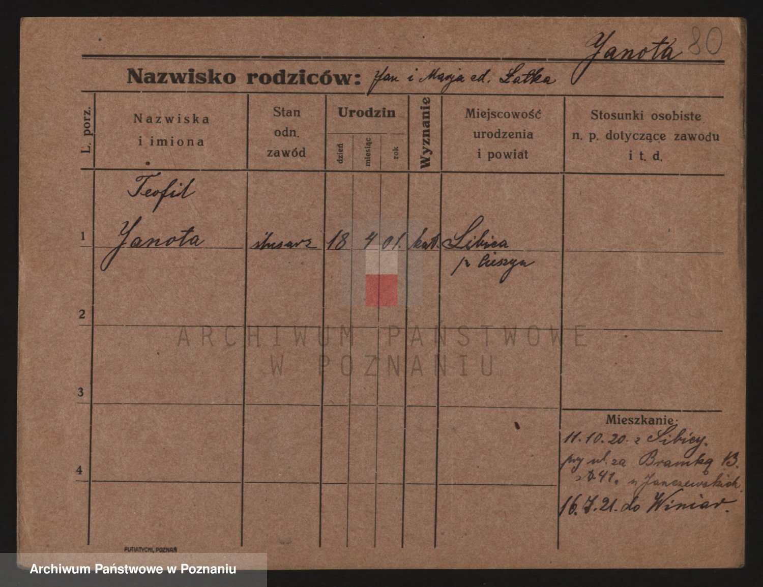 Podgląd karty osobowej dostępny jest po kliknięciu na nazwisko lub ikonkę karty. Można dokonywać powiększenia (ikony na górze) lub przechodzić między kolejnymi skanami (strzałki po bokach).