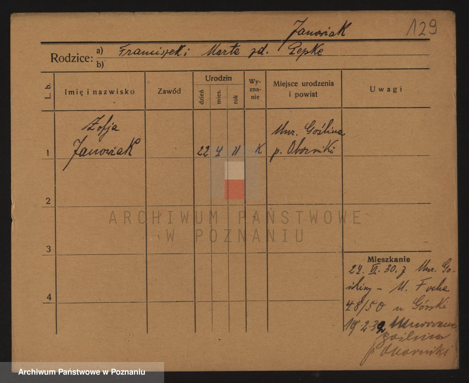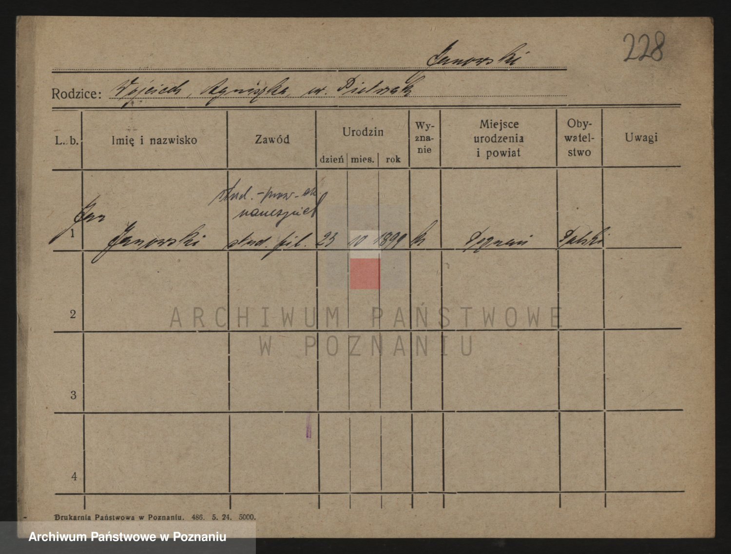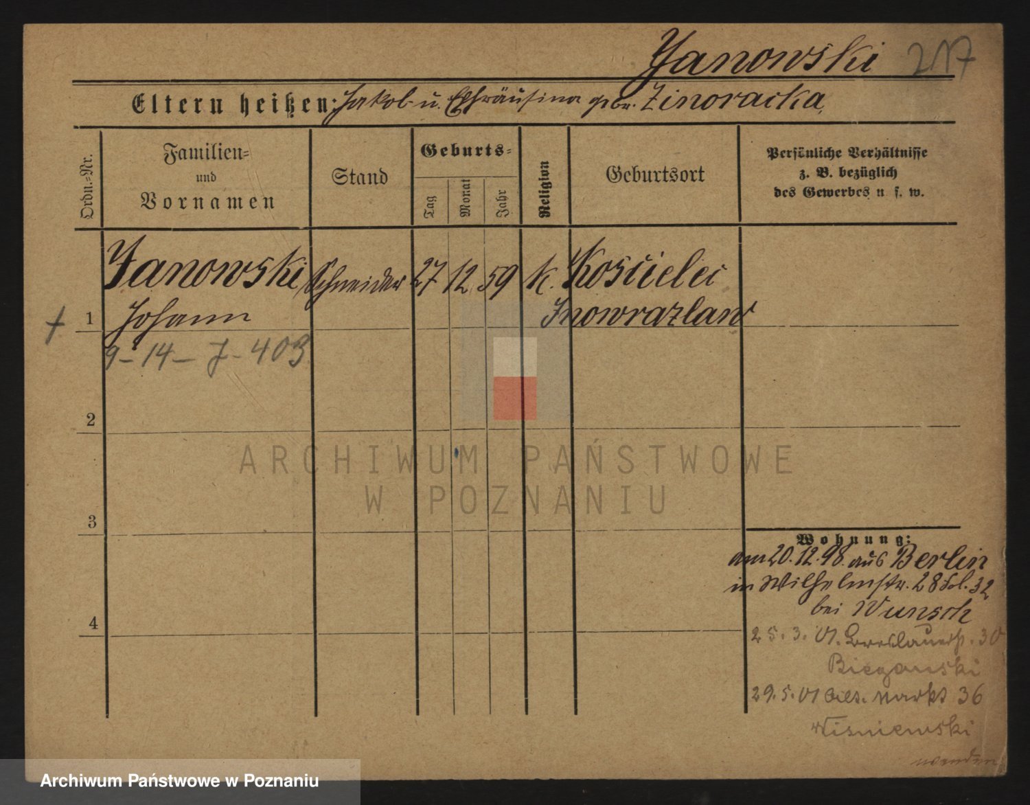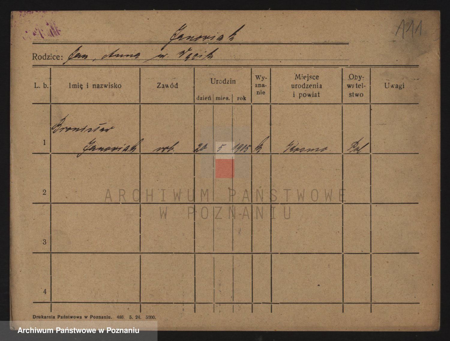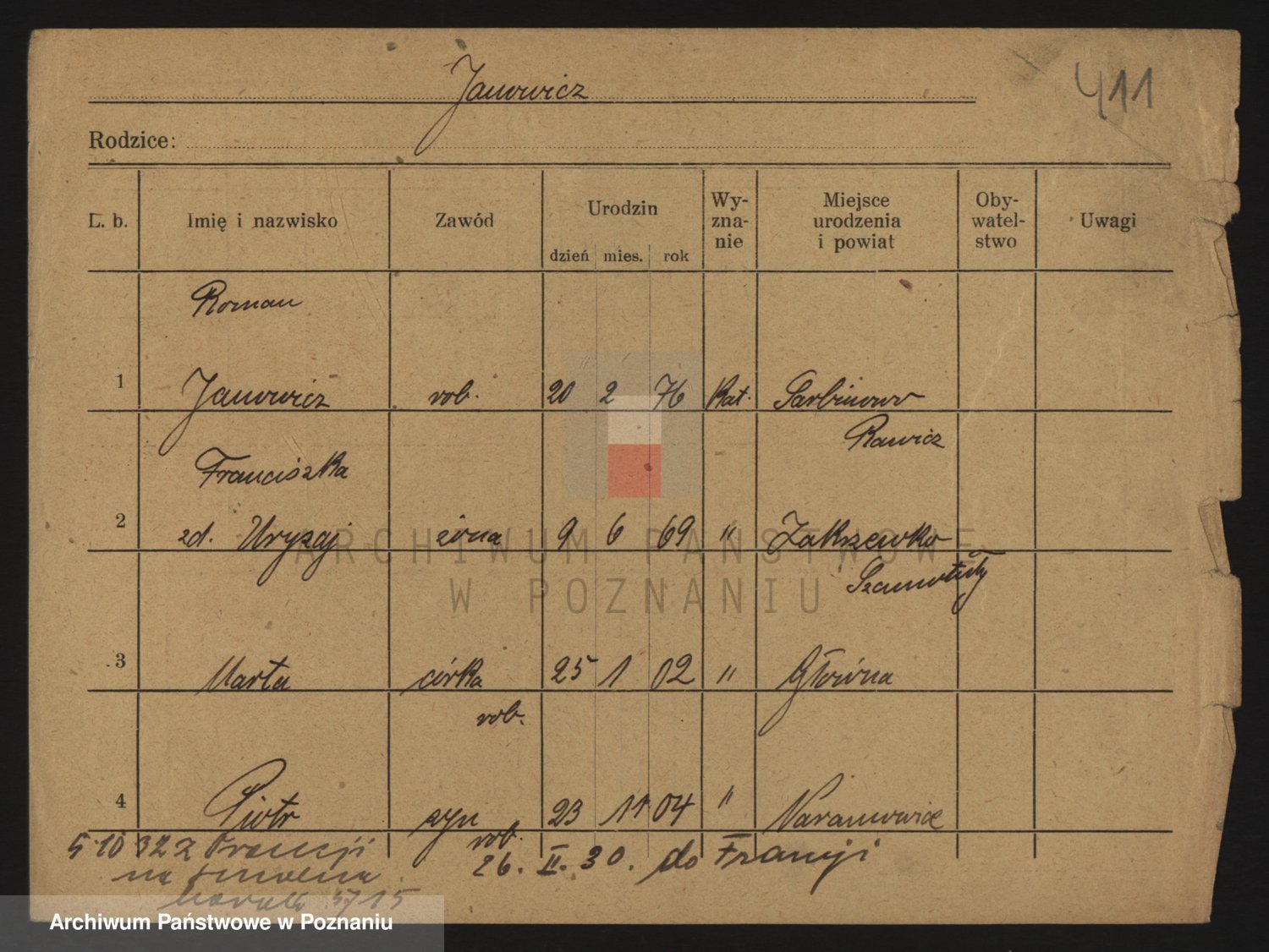 Podgląd karty osobowej dostępny jest po kliknięciu na nazwisko lub ikonkę karty. Można dokonywać powiększenia (ikony na górze) lub przechodzić między kolejnymi skanami (strzałki po bokach).
