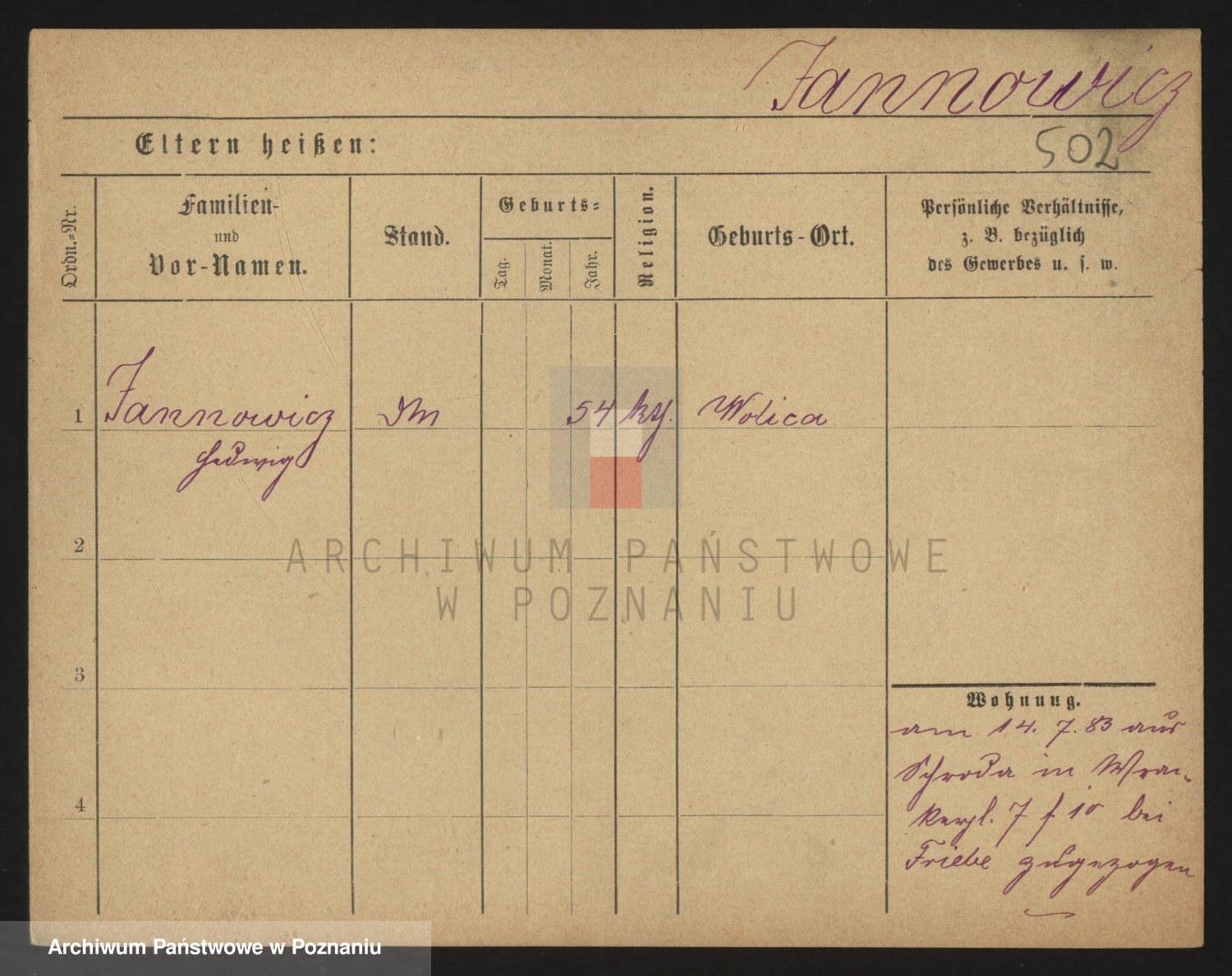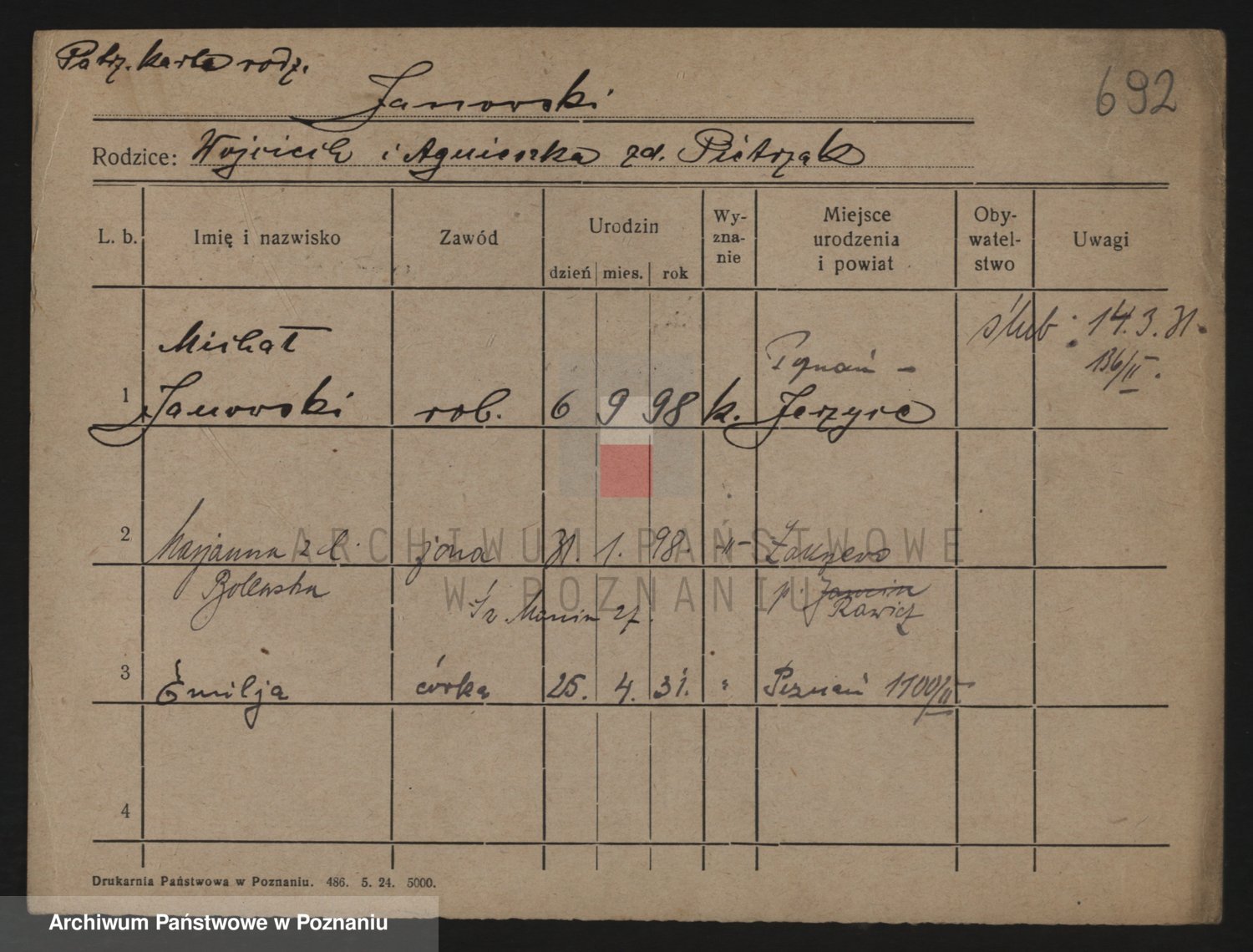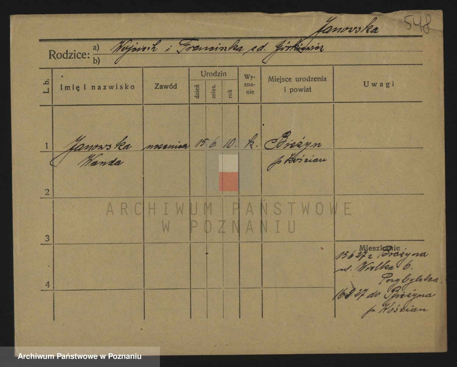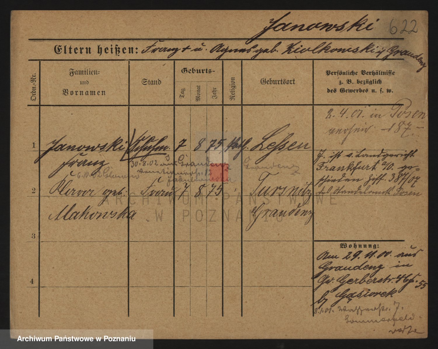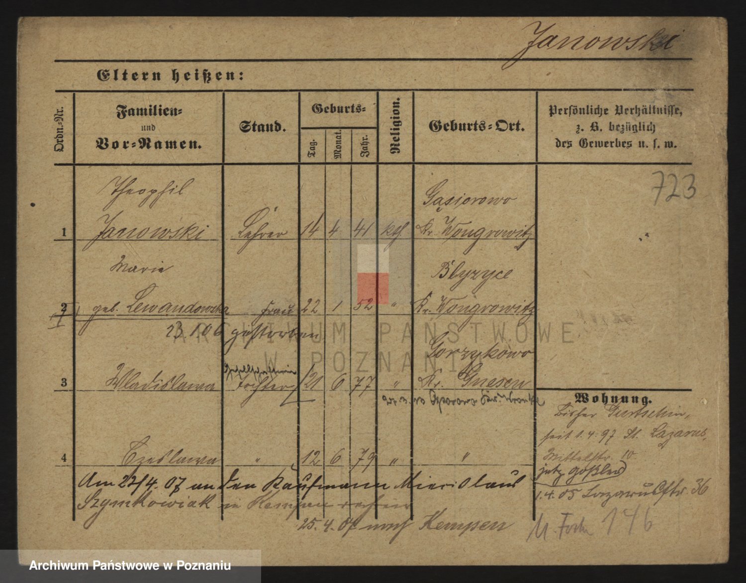 Podgląd karty osobowej dostępny jest po kliknięciu na nazwisko lub ikonkę karty. Można dokonywać powiększenia (ikony na górze) lub przechodzić między kolejnymi skanami (strzałki po bokach).
