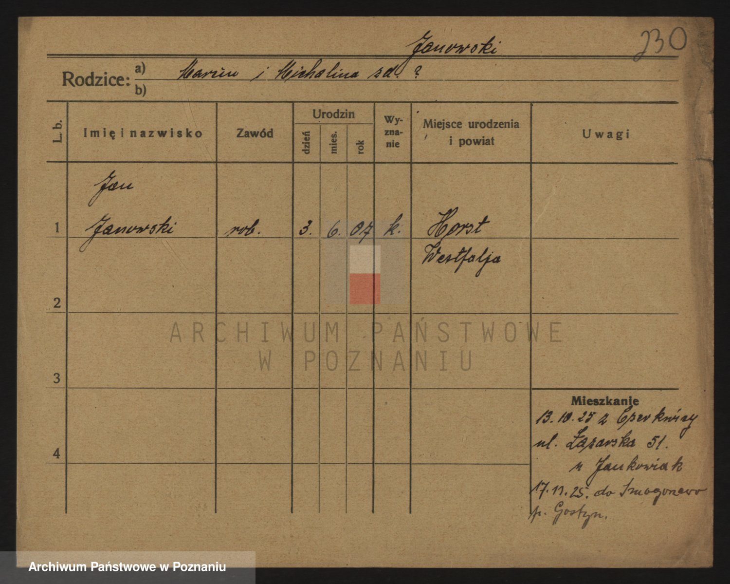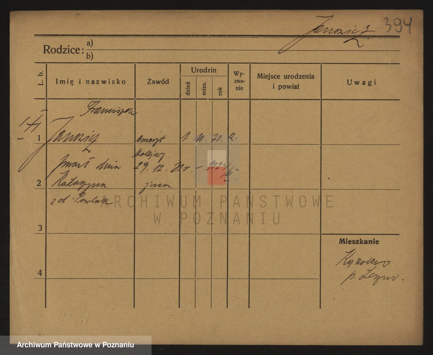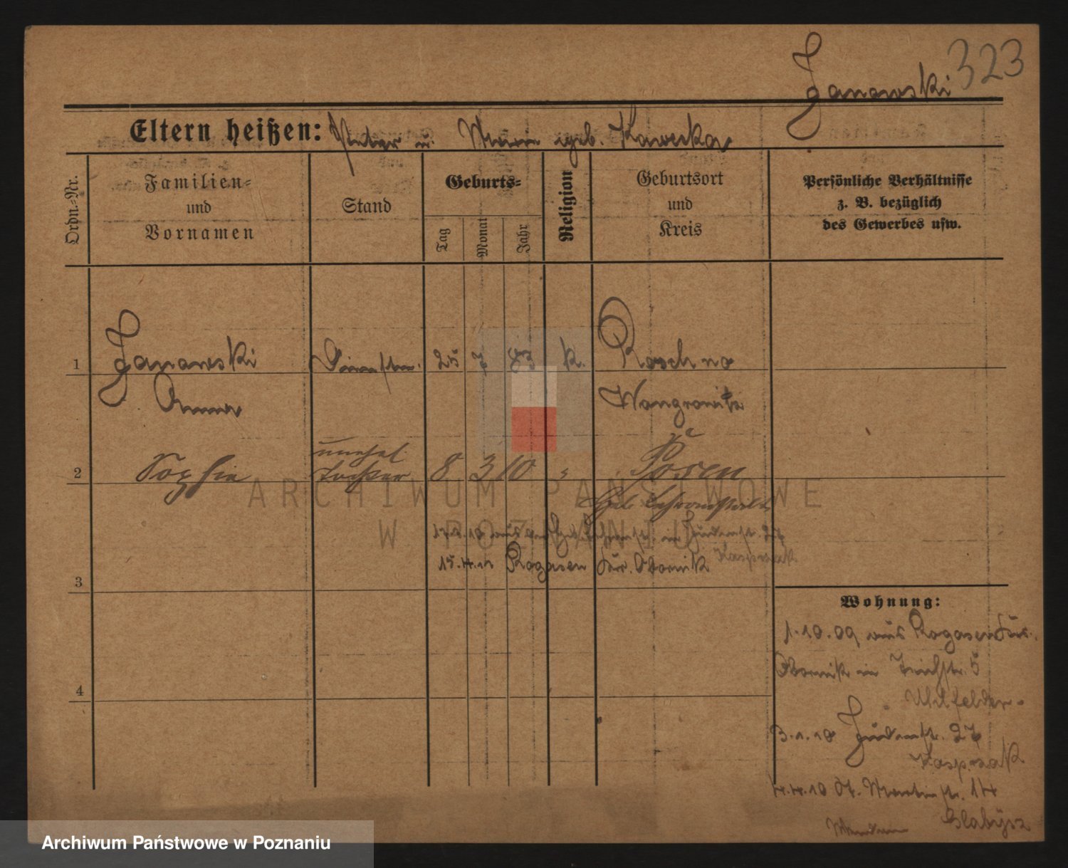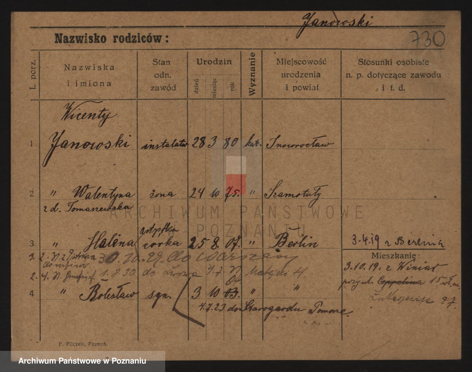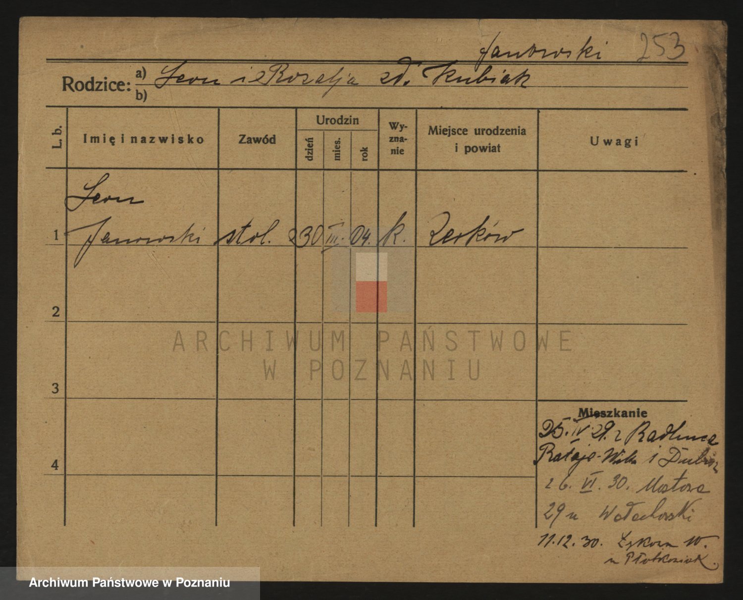 Podgląd karty osobowej dostępny jest po kliknięciu na nazwisko lub ikonkę karty. Można dokonywać powiększenia (ikony na górze) lub przechodzić między kolejnymi skanami (strzałki po bokach).